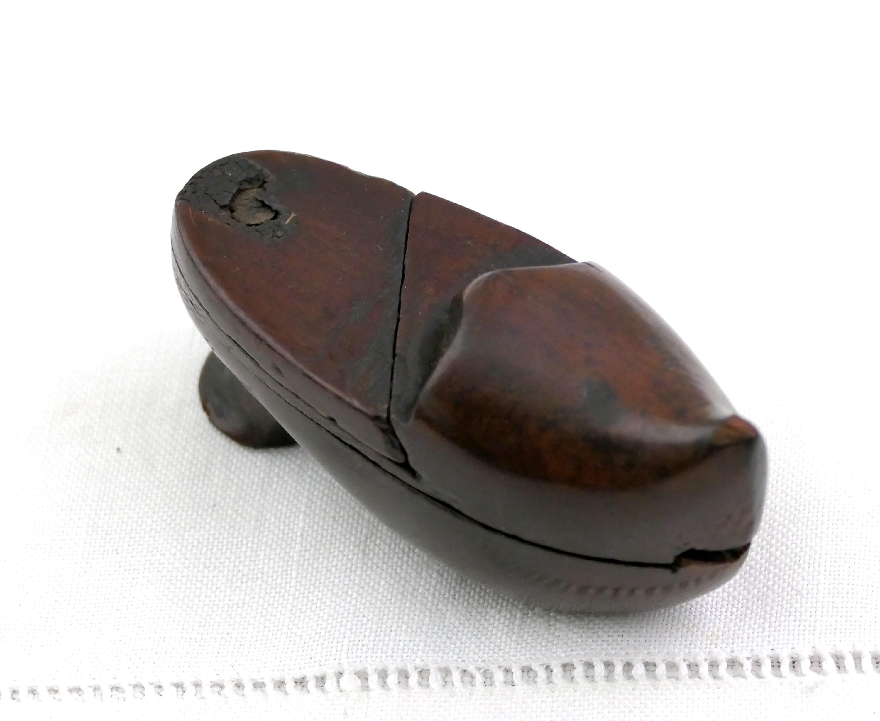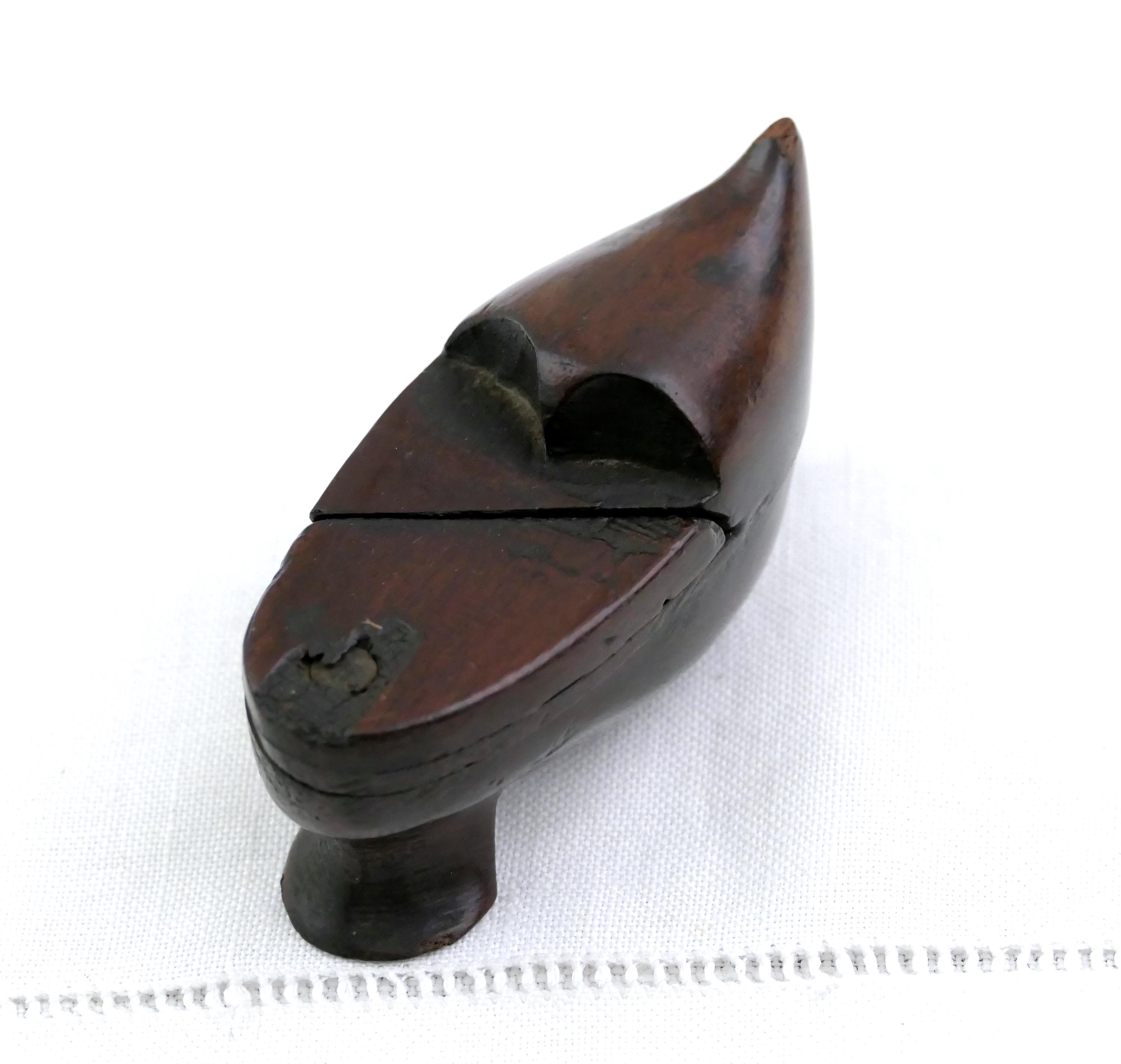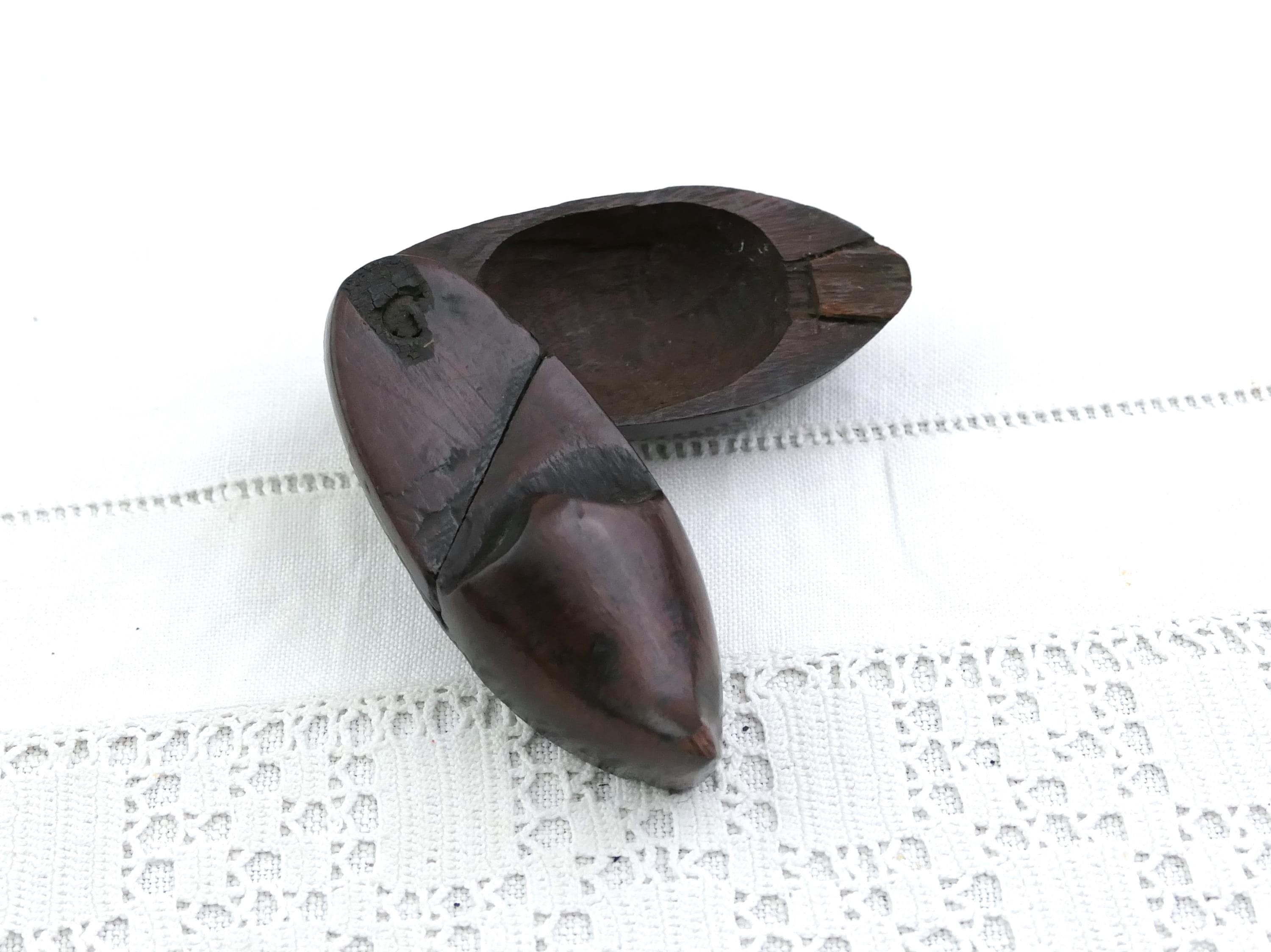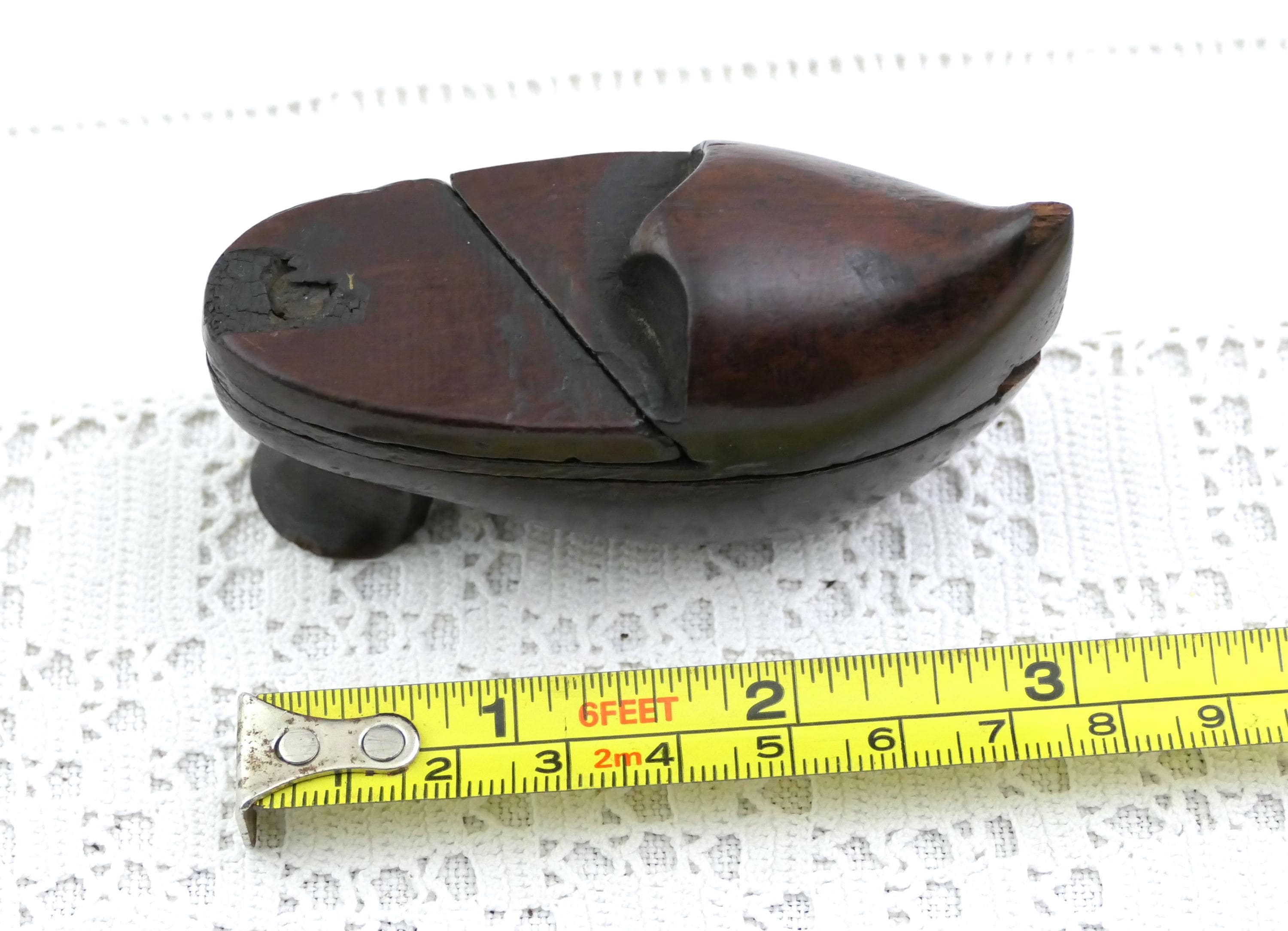 Antique French treen secret box shaped as a wooden clog. The opening of the box is a a puzzle, unfortunately someone has forced and snapped the closure ( at toe end of the clog)