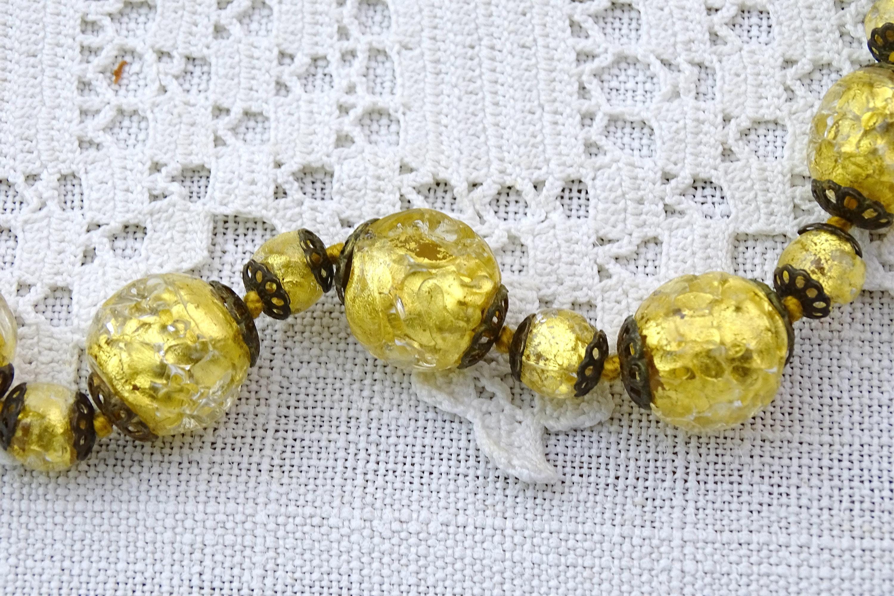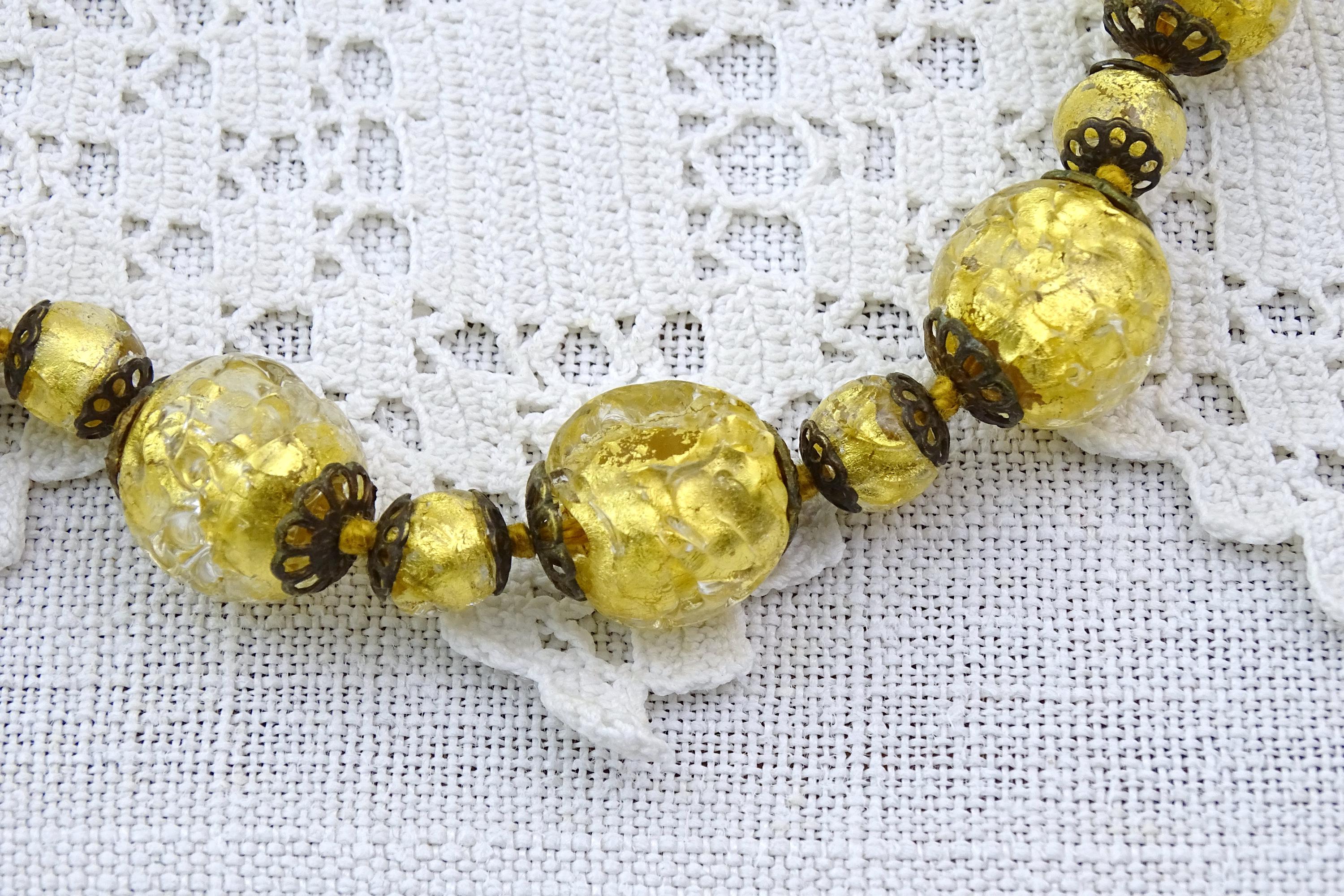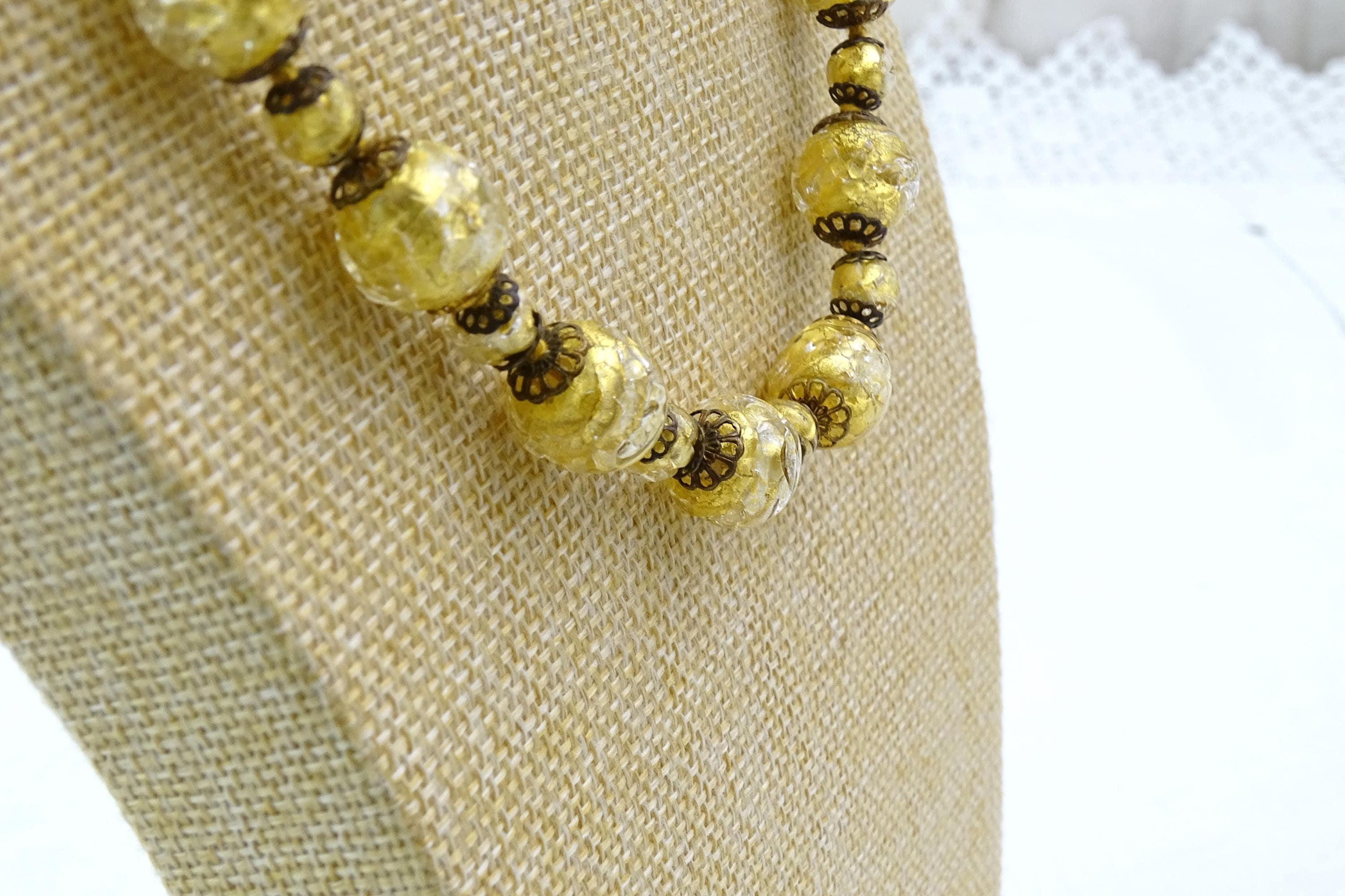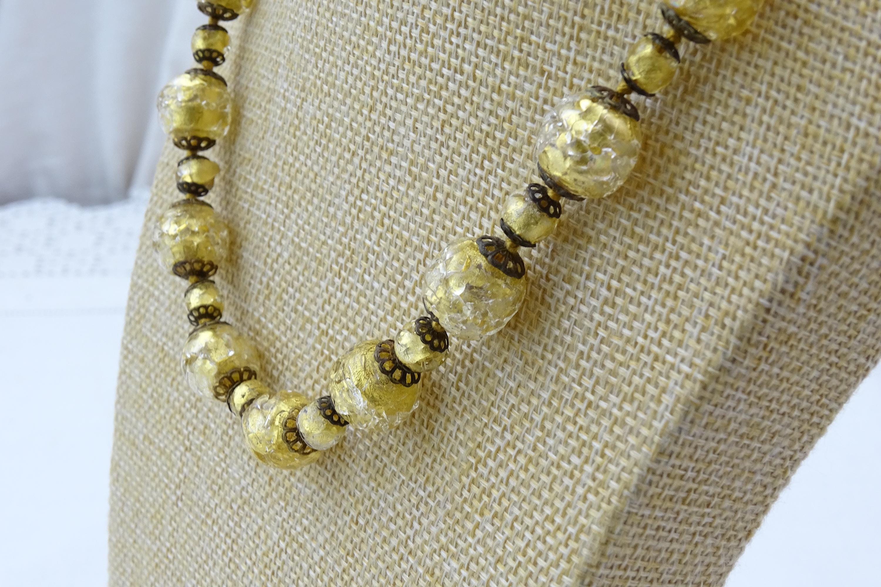 Vintage Venetian gold foil bead necklace. Made of clear and amber glass with gold foil inclusions. Ca mid 1900s.