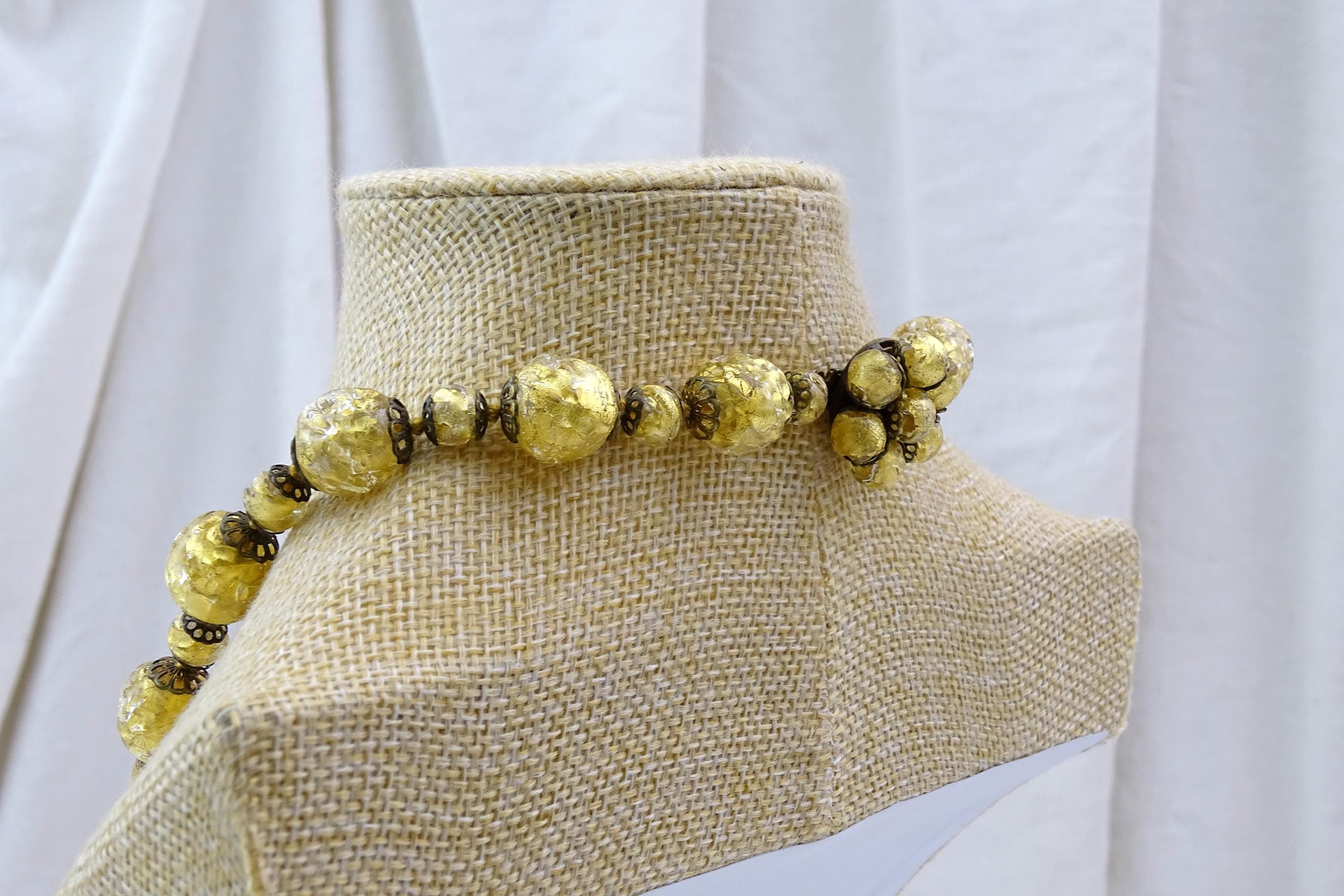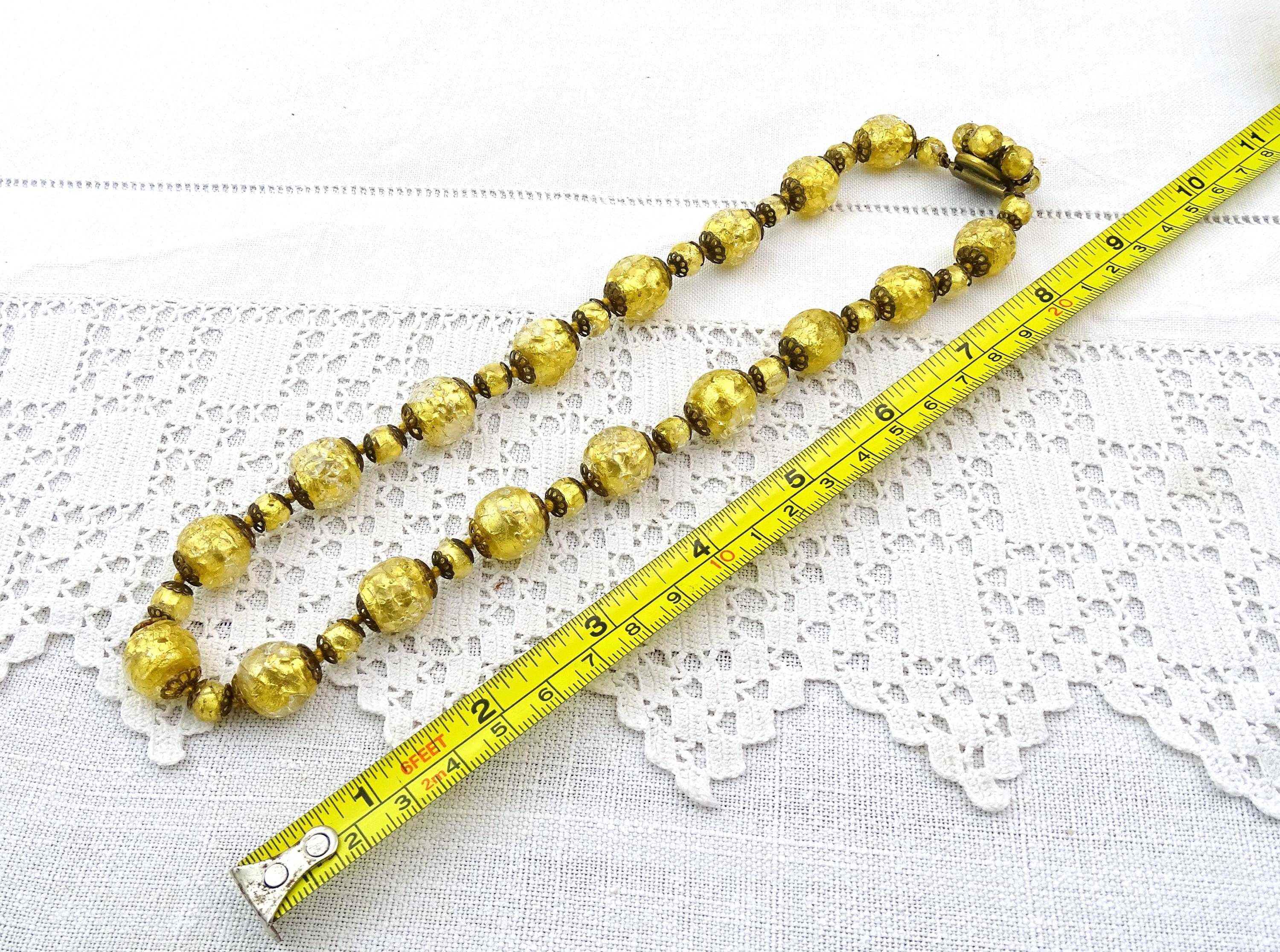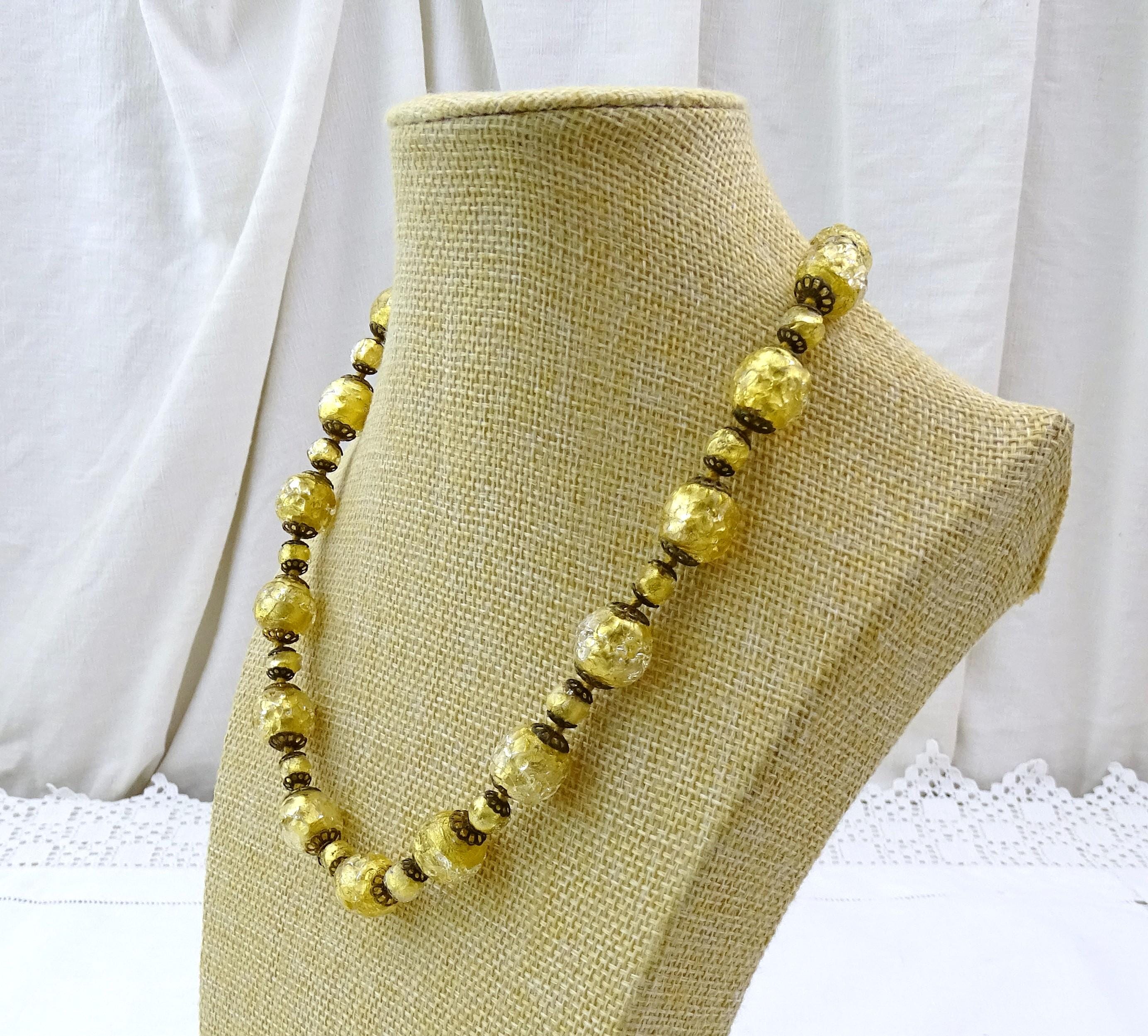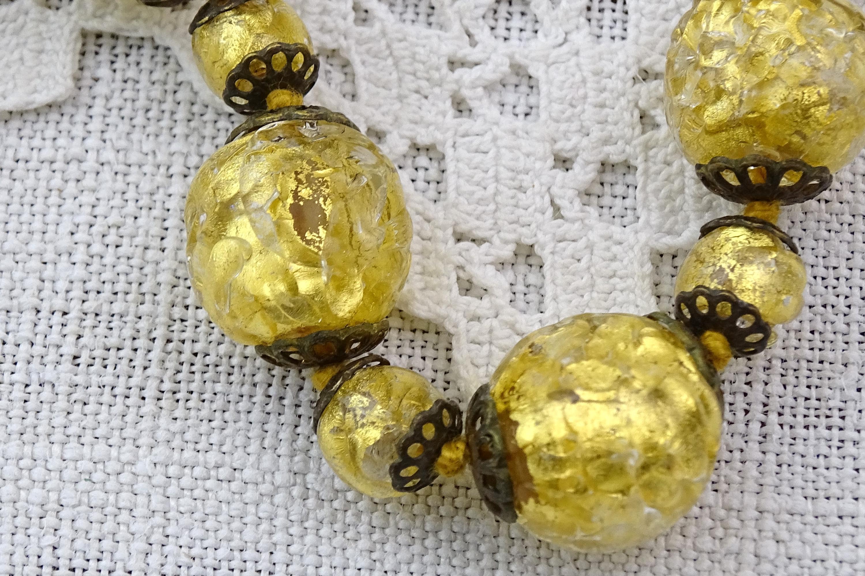 Vintage Venetian gold foil bead necklace. Made of clear and amber glass with gold foil inclusions. Ca mid 1900s.