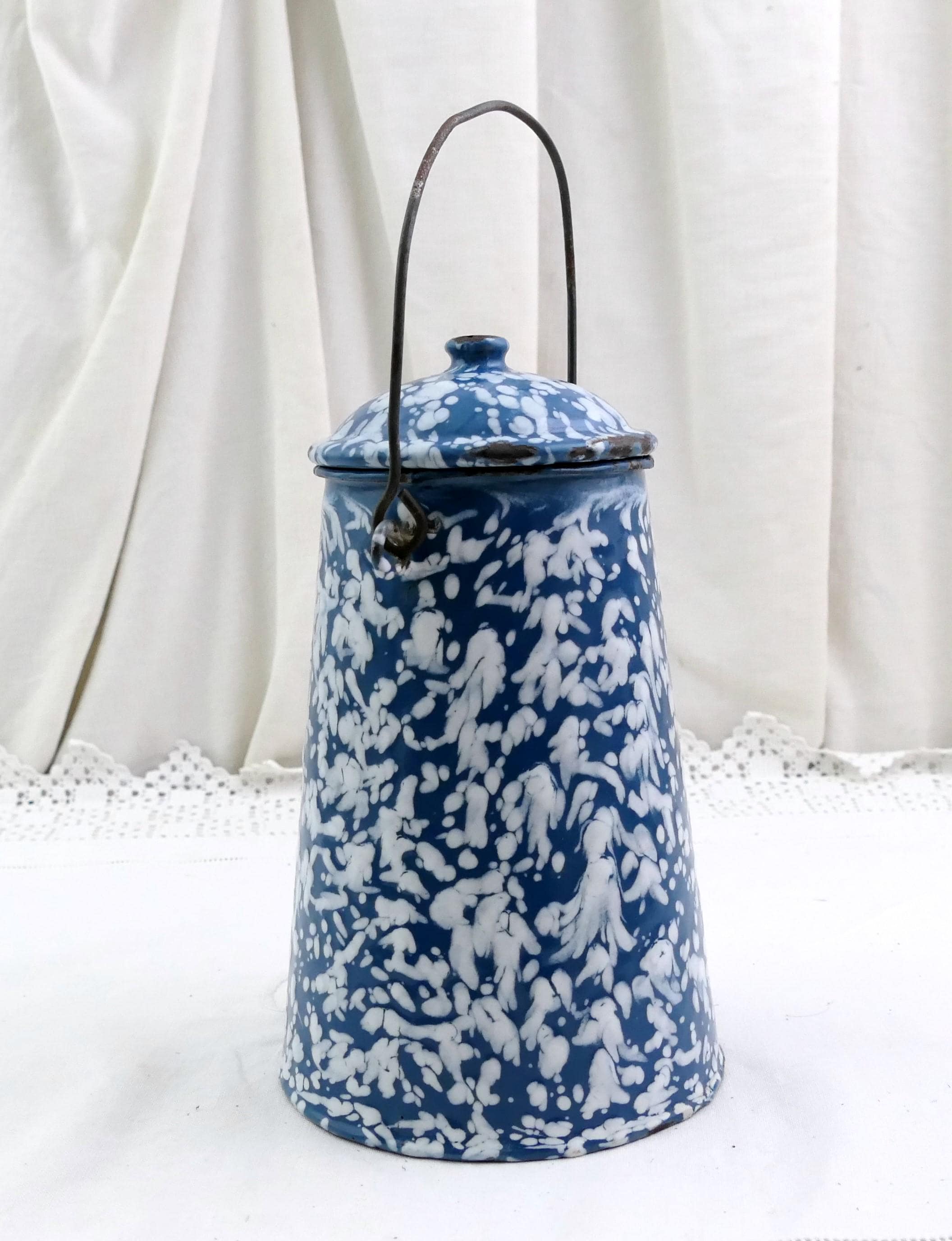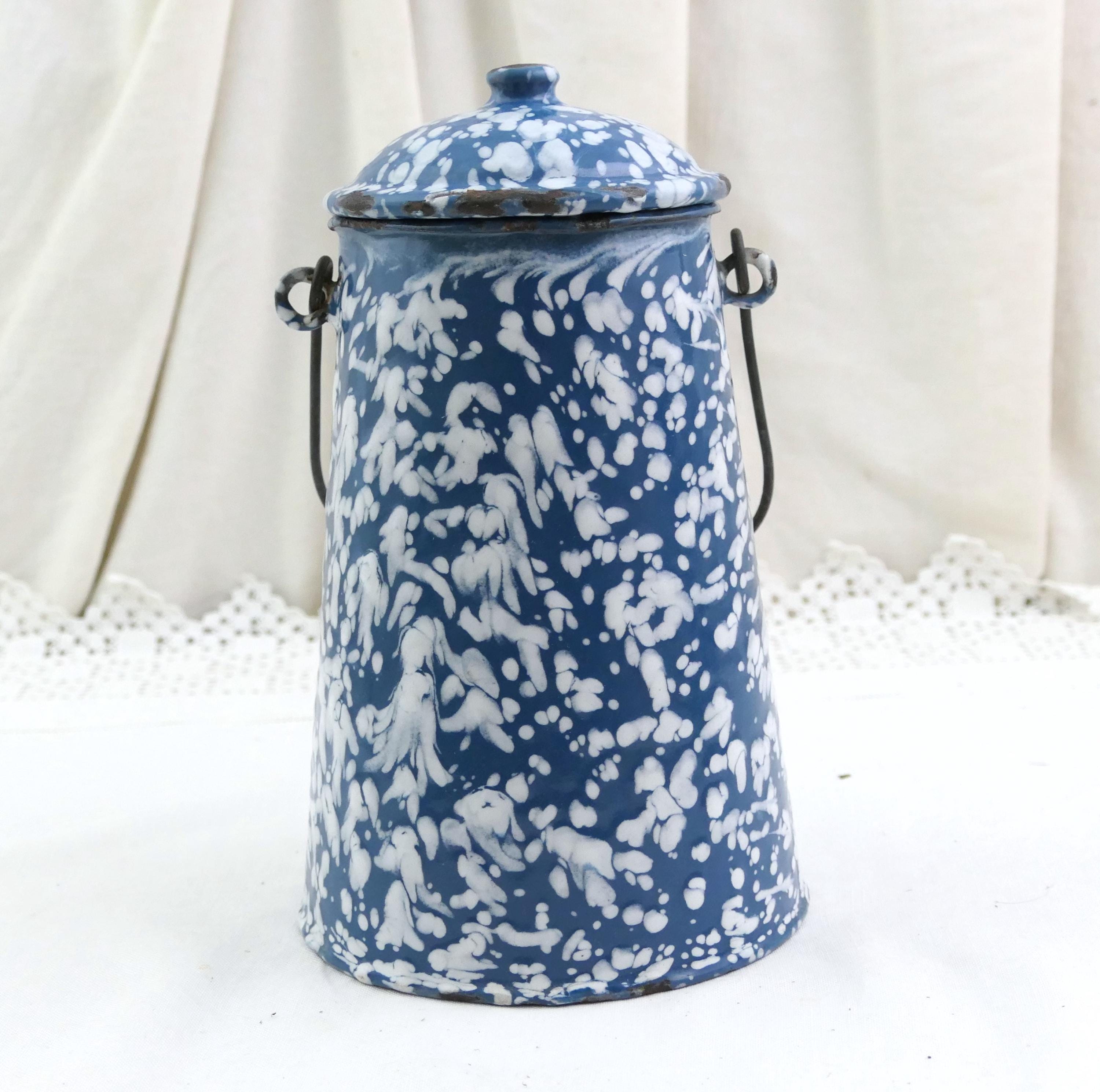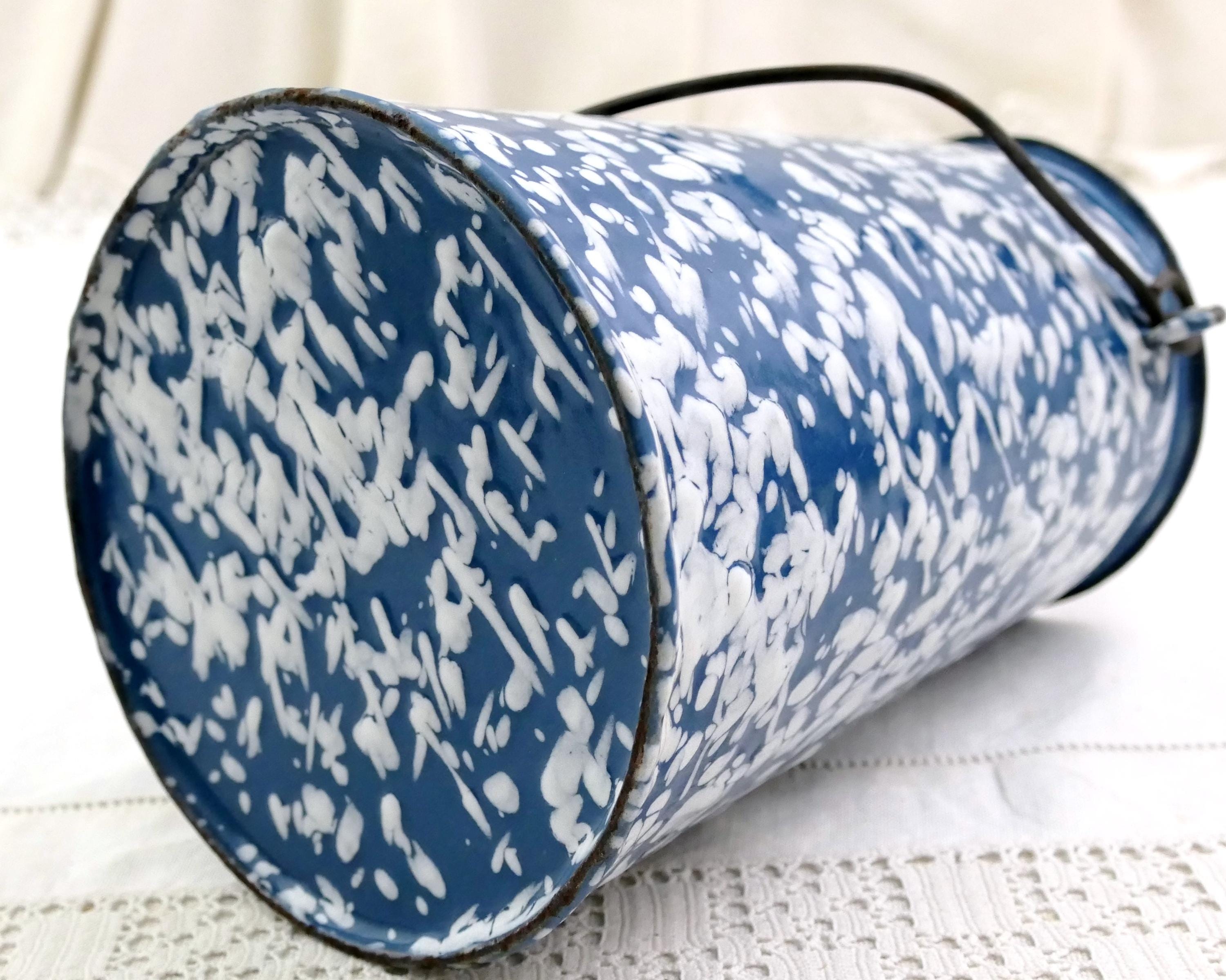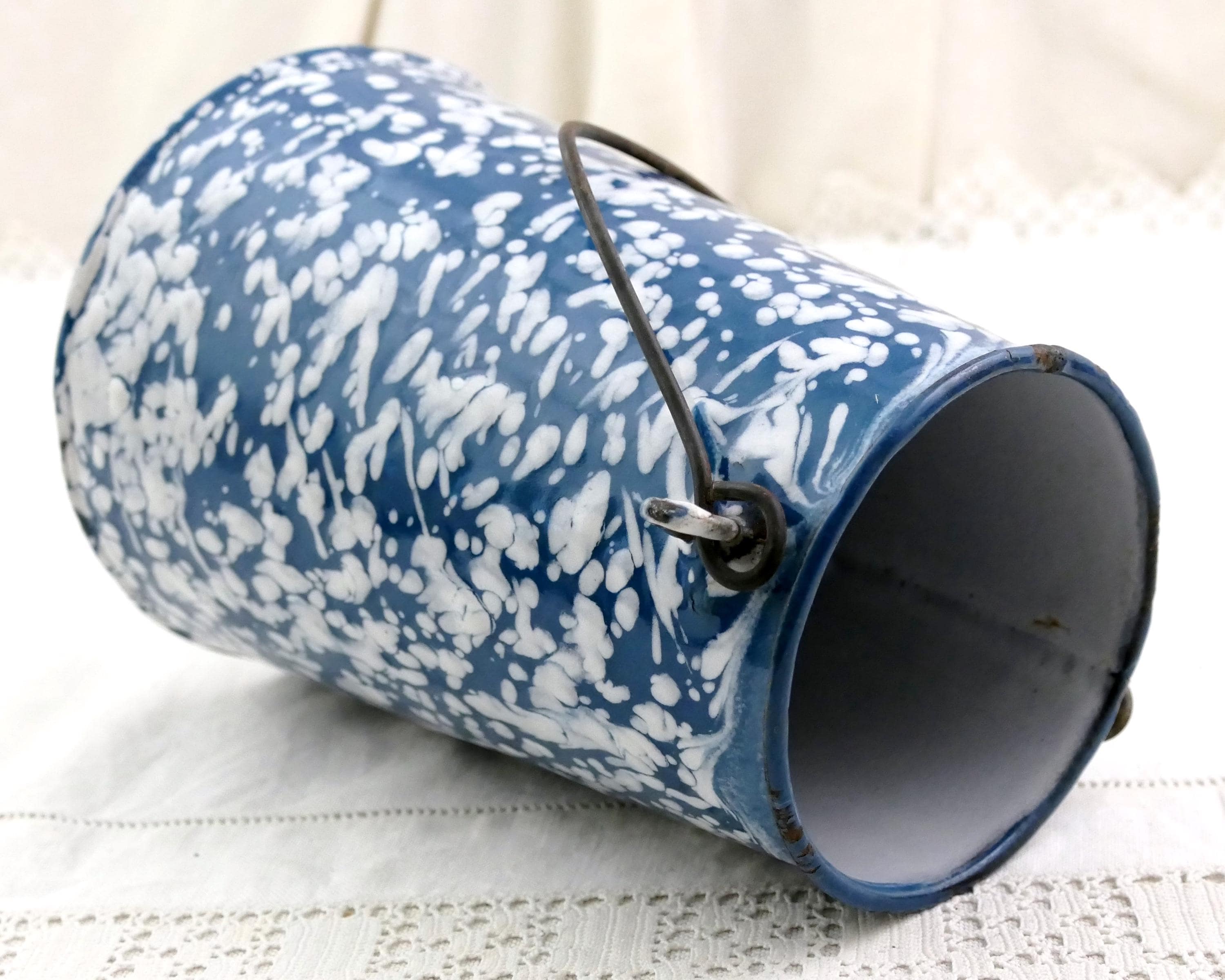 Antique French blue enamel milk pail. Made of enameled metal. Ca early
