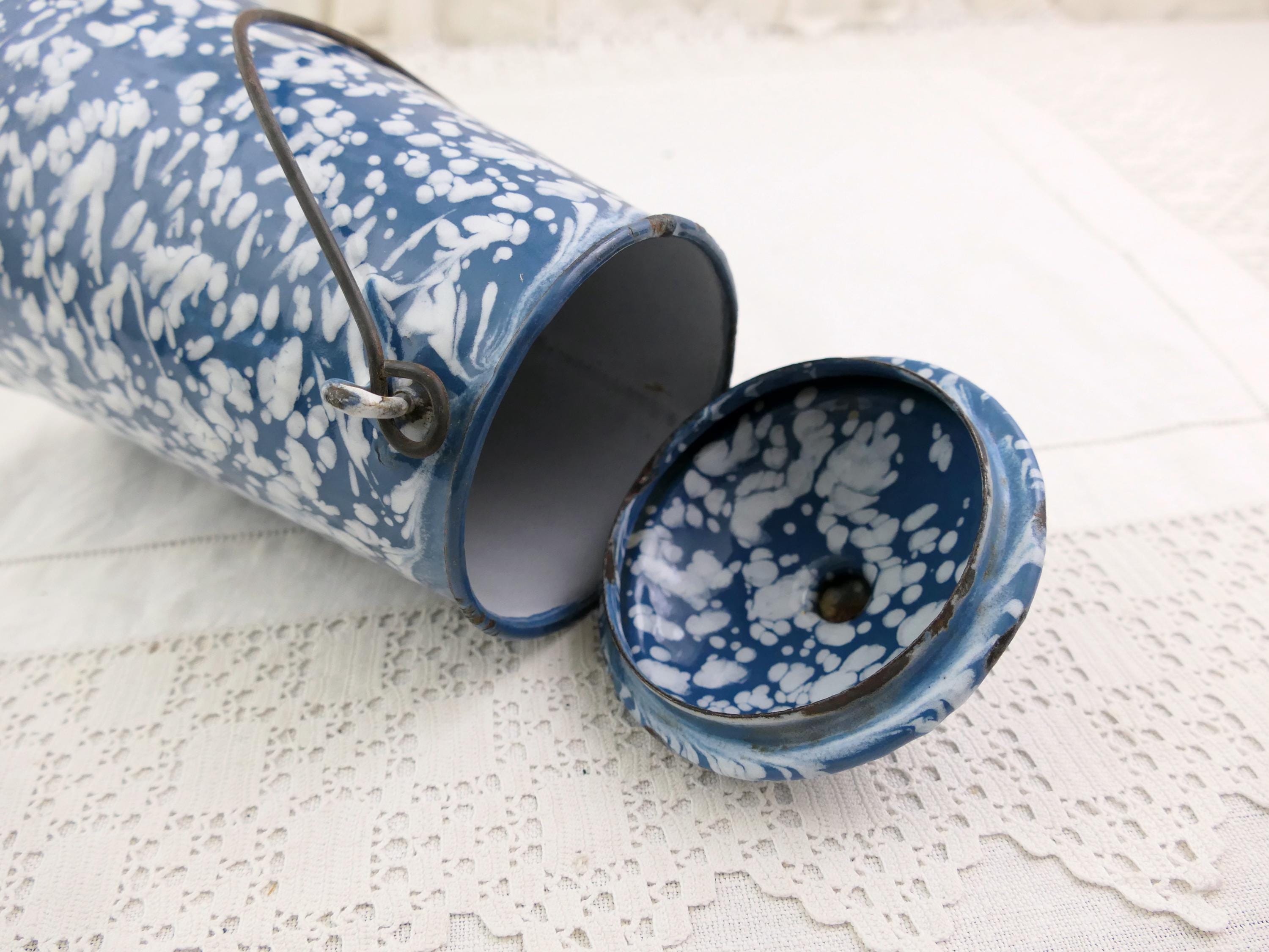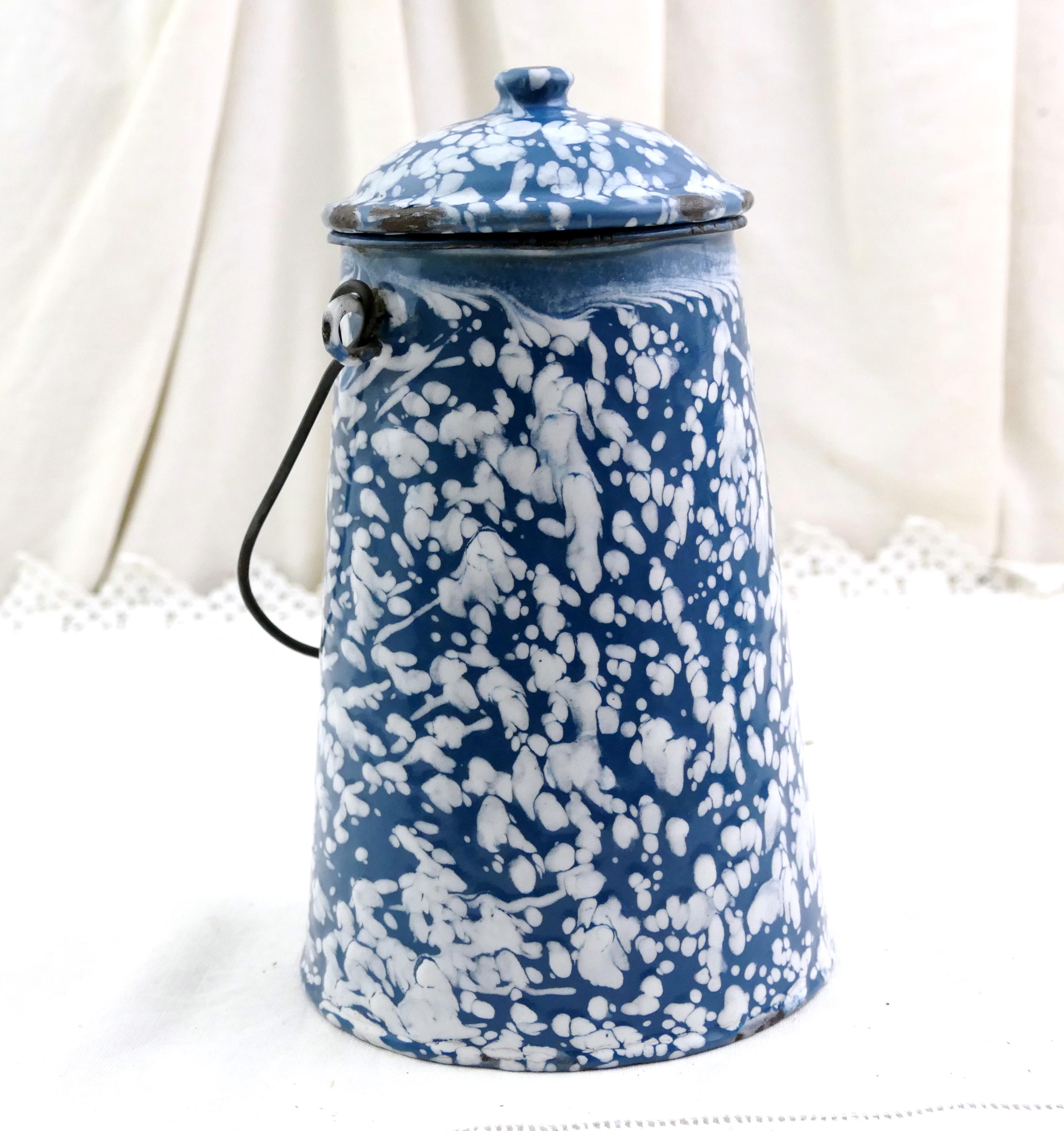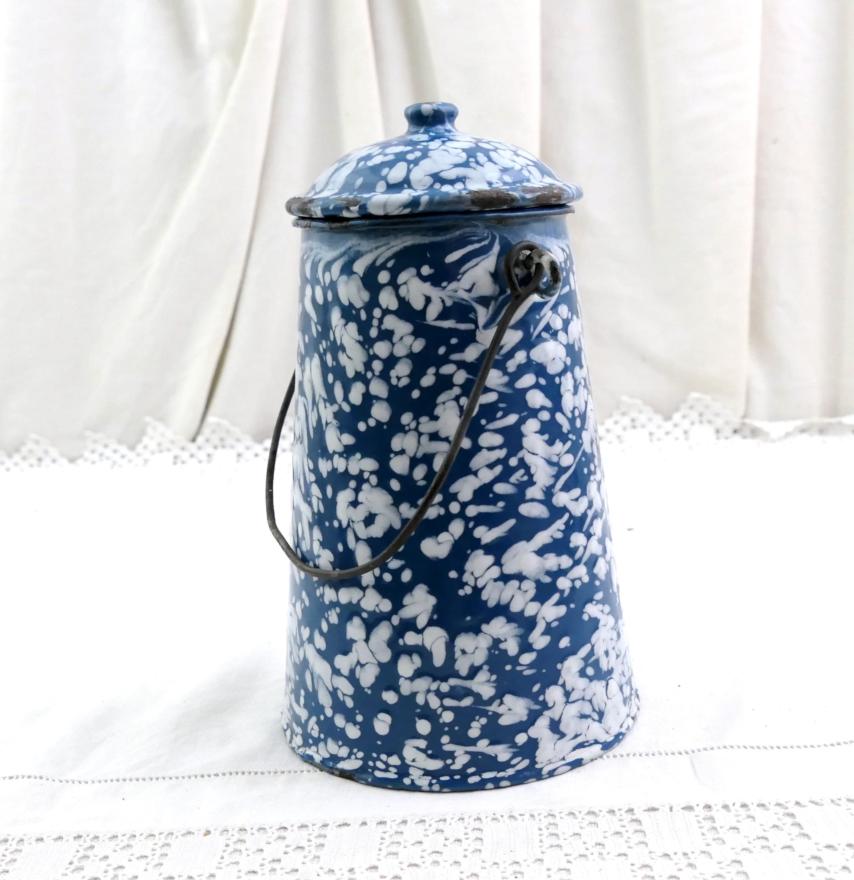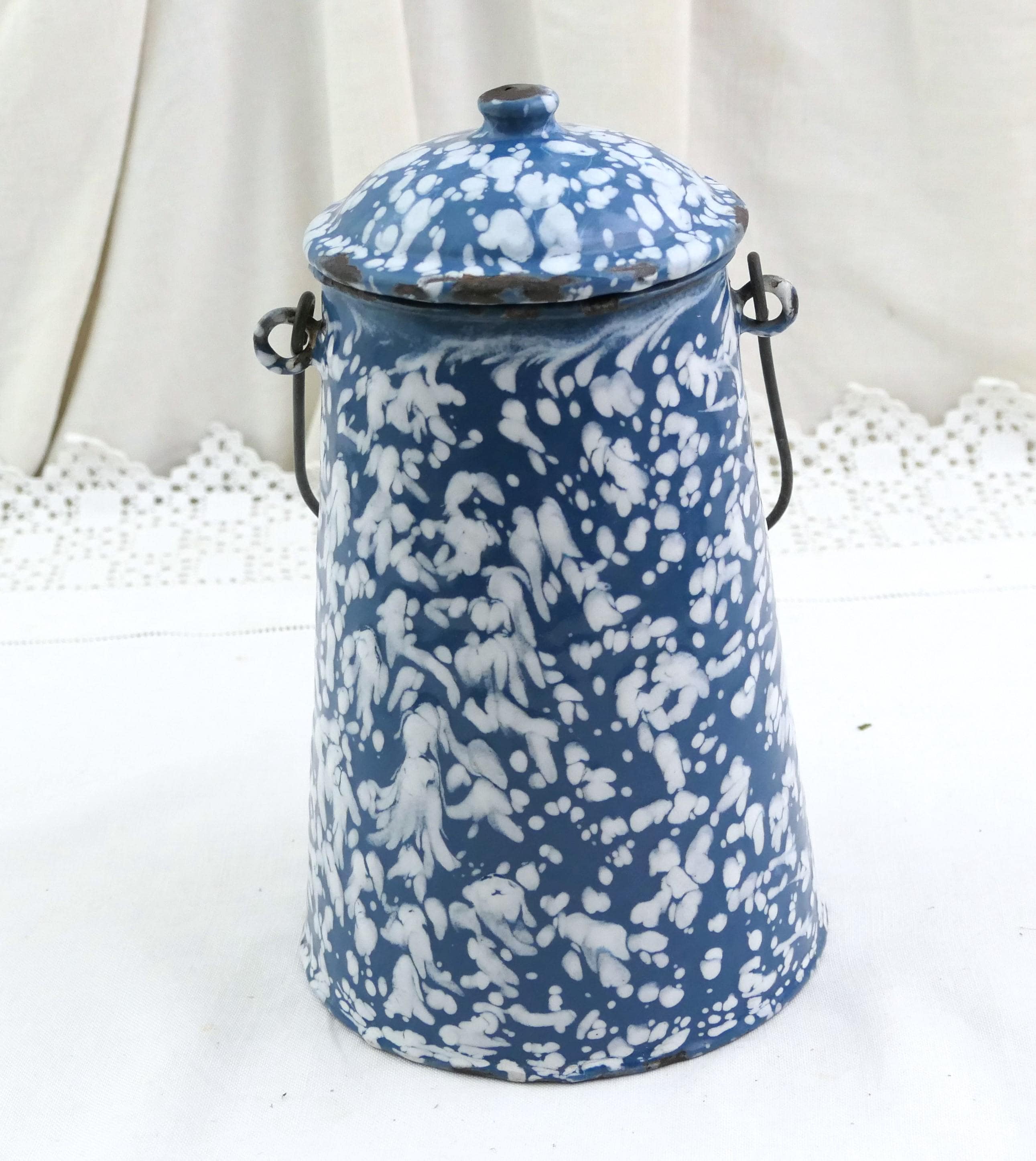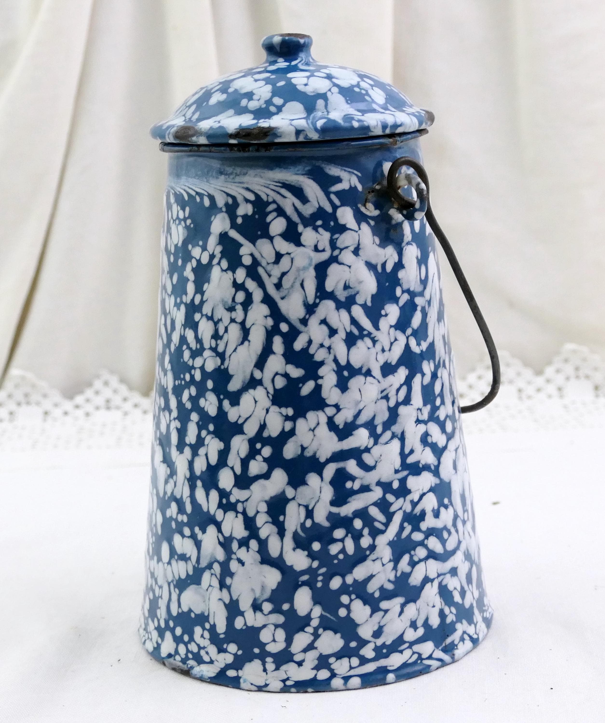 Antique French blue enamel milk pail. Made of enameled metal. Ca early