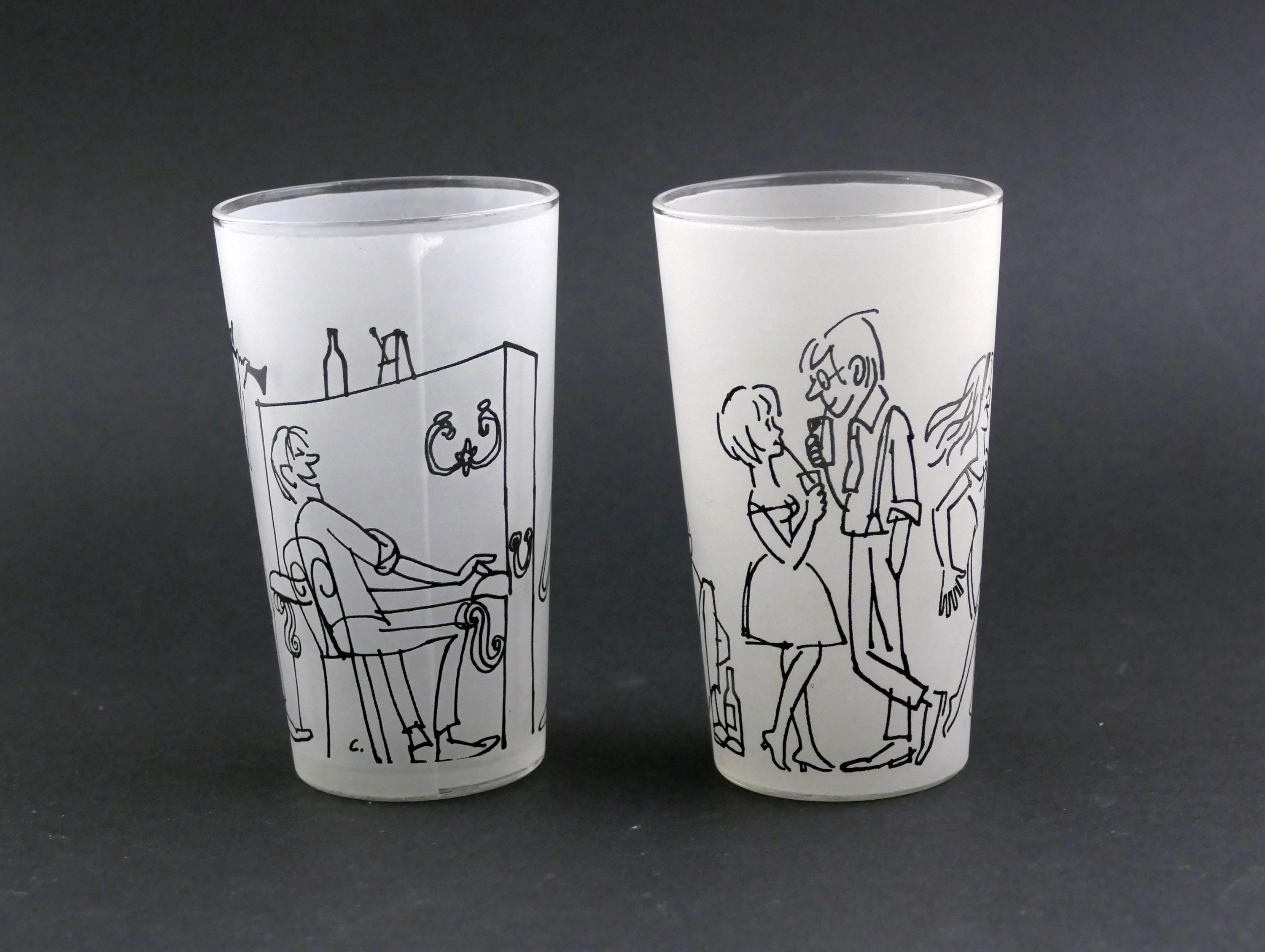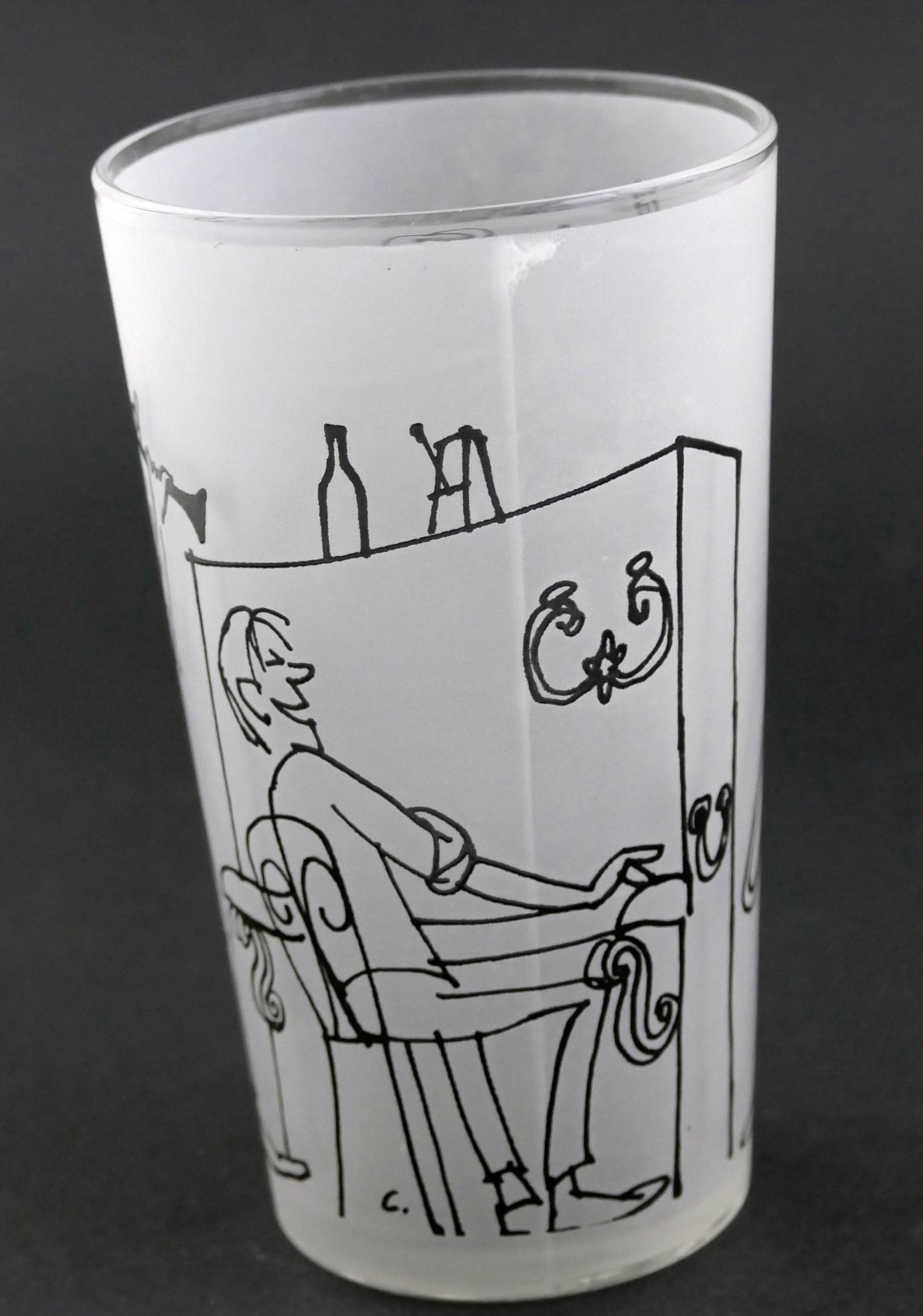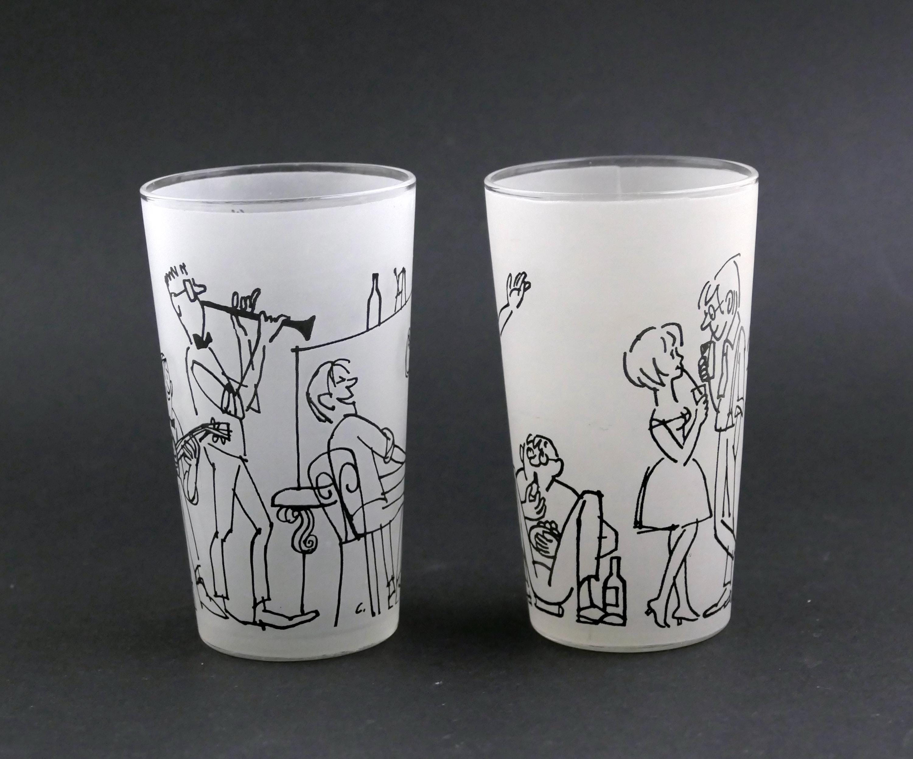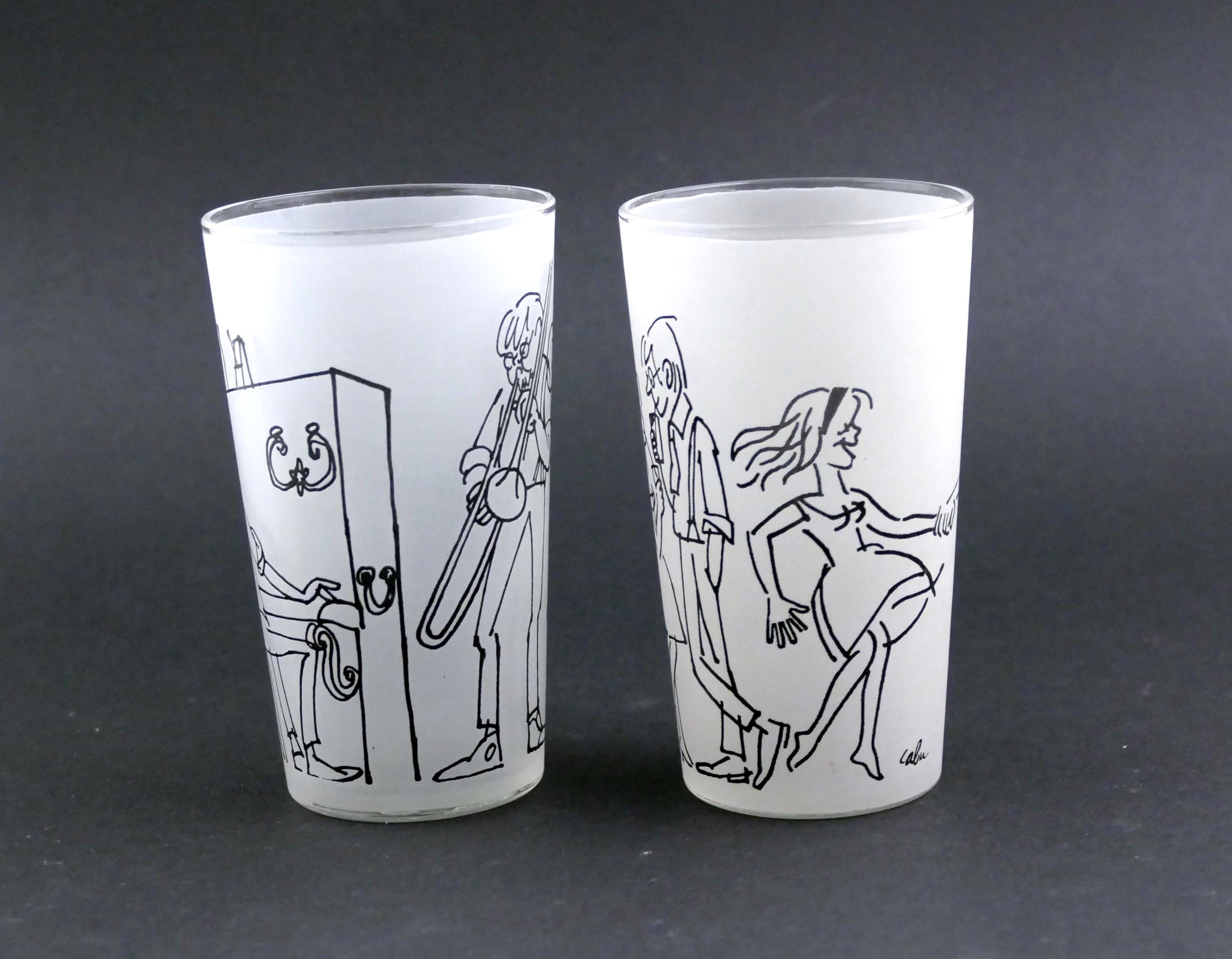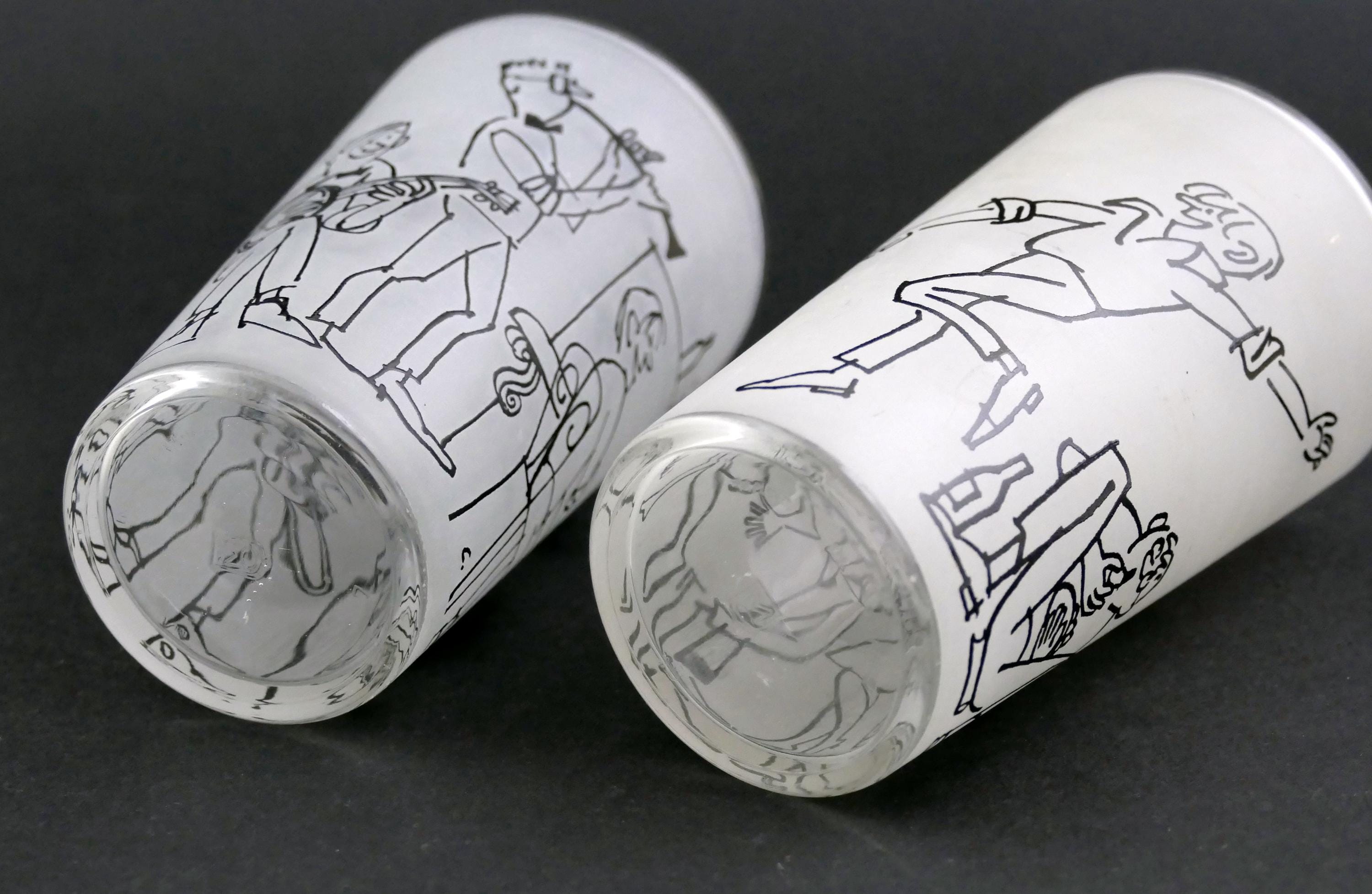 2 Vintage French Mid Century tumblers with illustrations by French cartoonist Cabu. Made of glass. Ca 1960s.