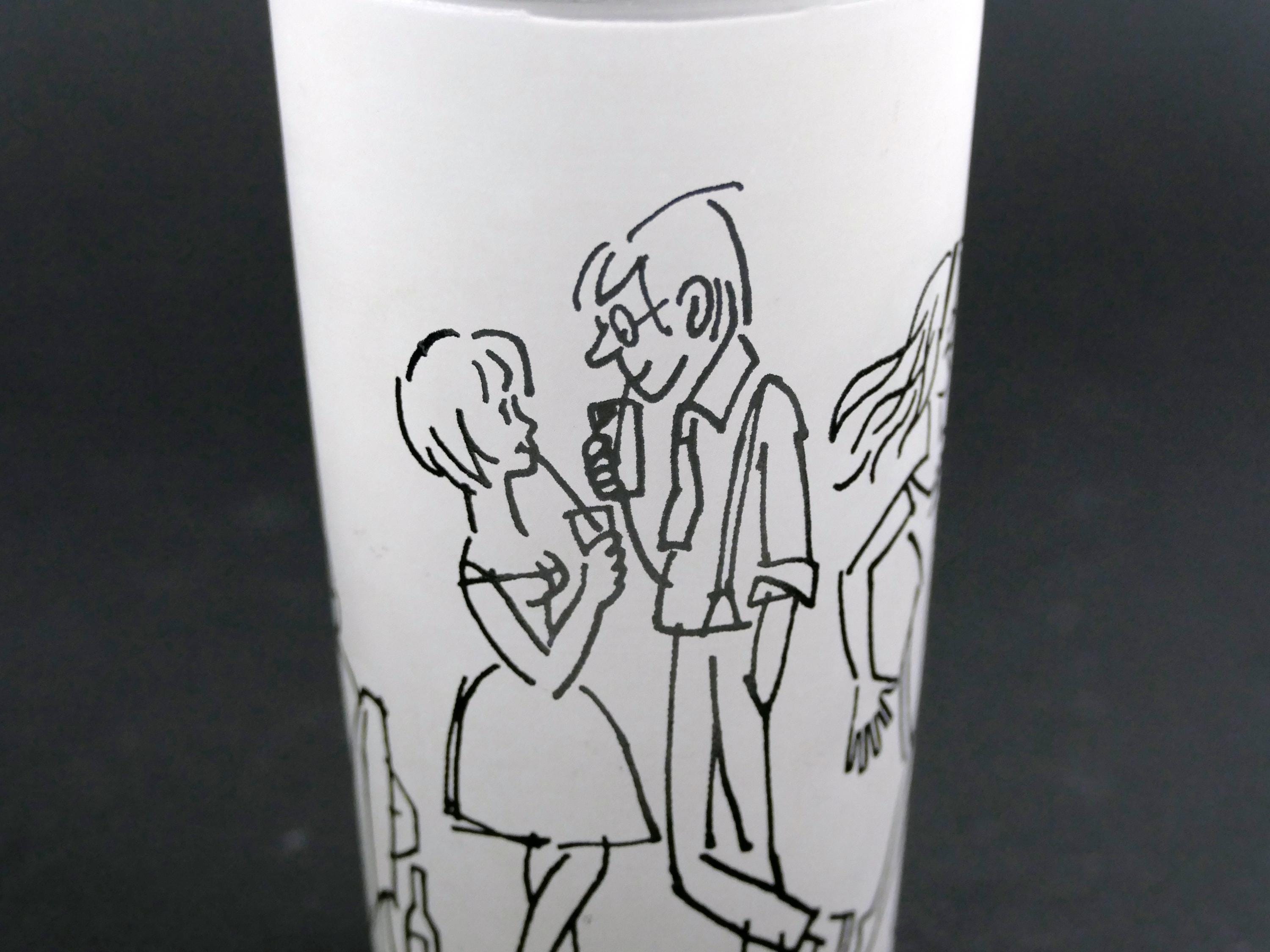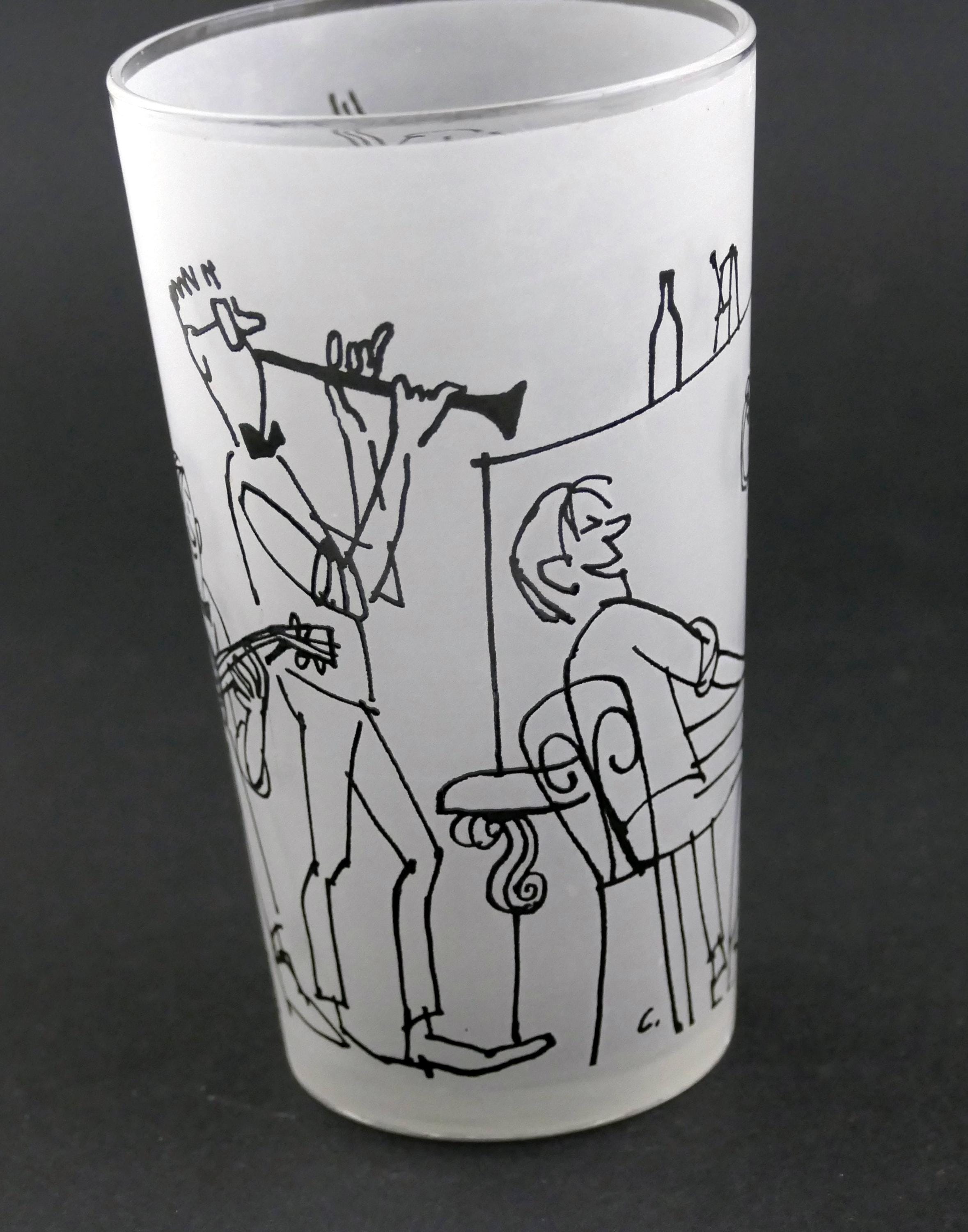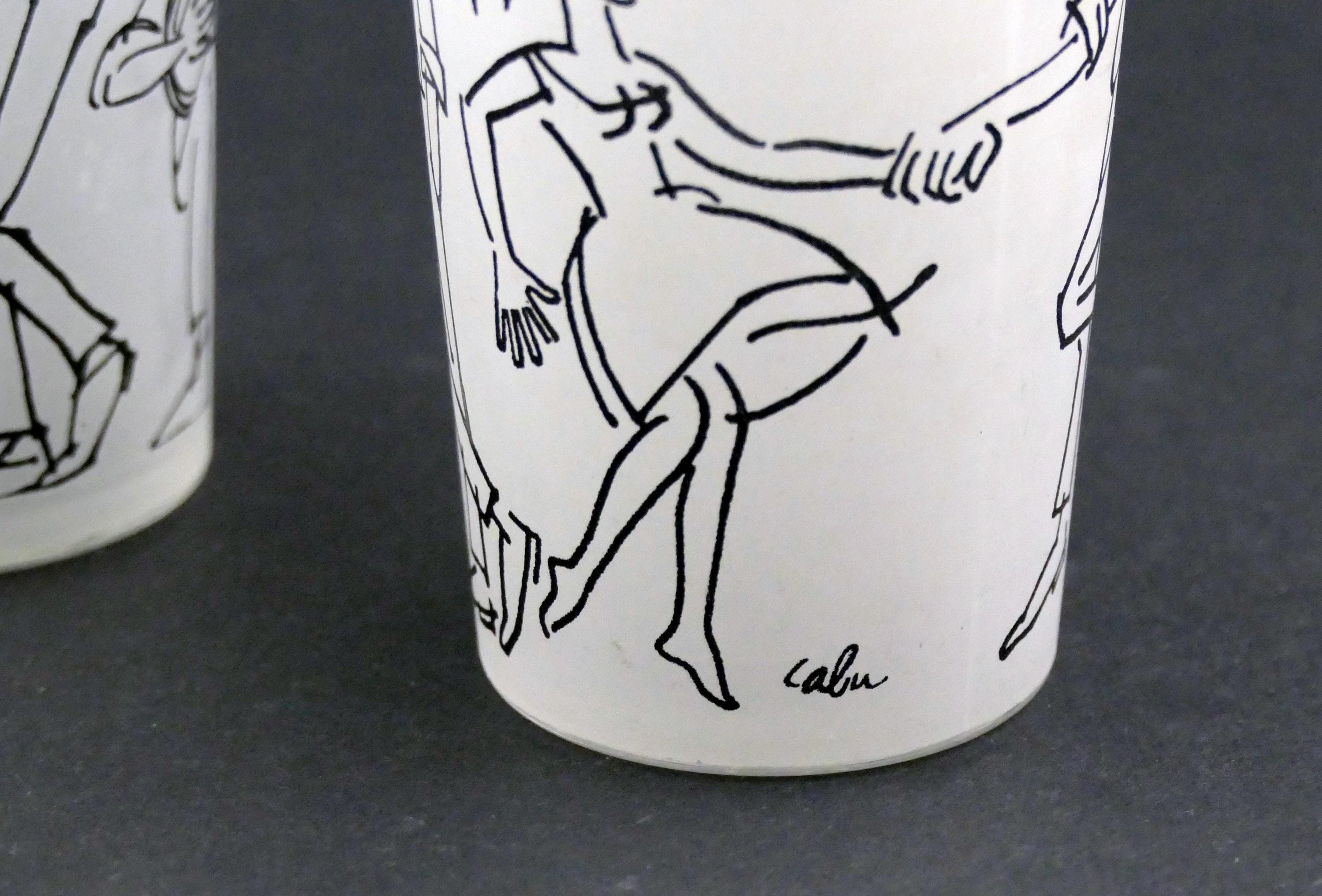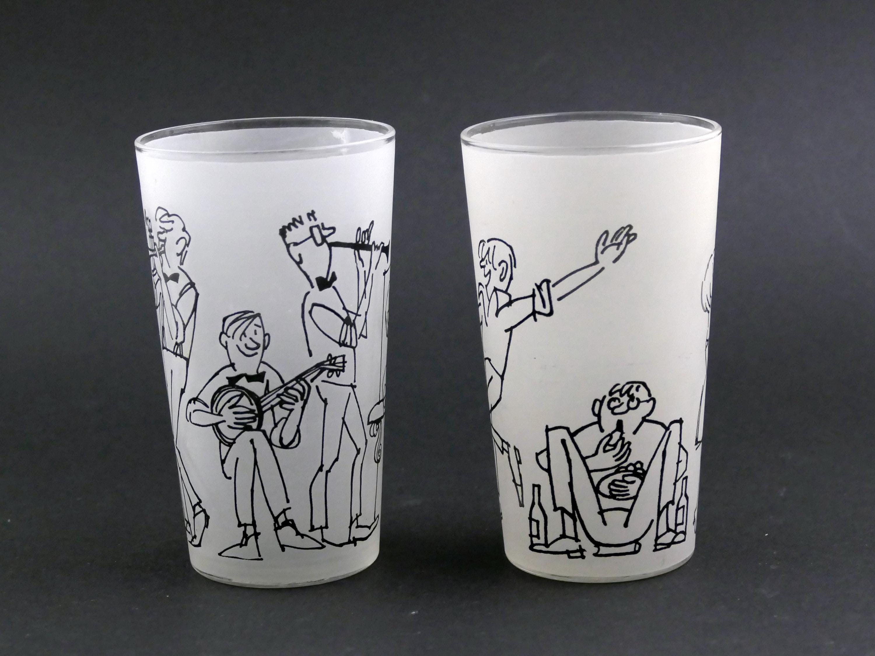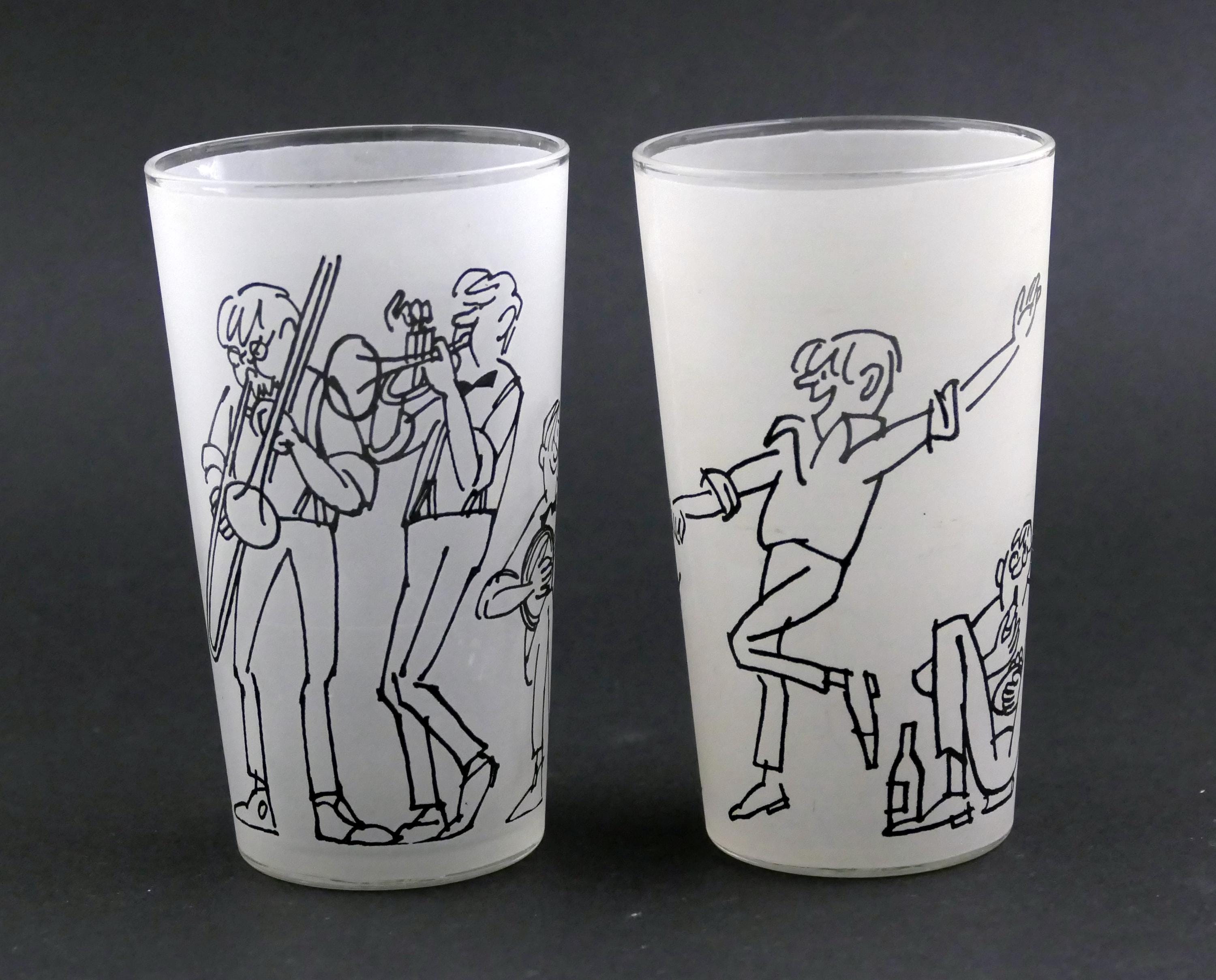 2 Vintage French Mid Century tumblers with illustrations by French cartoonist Cabu. Made of glass. Ca 1960s.