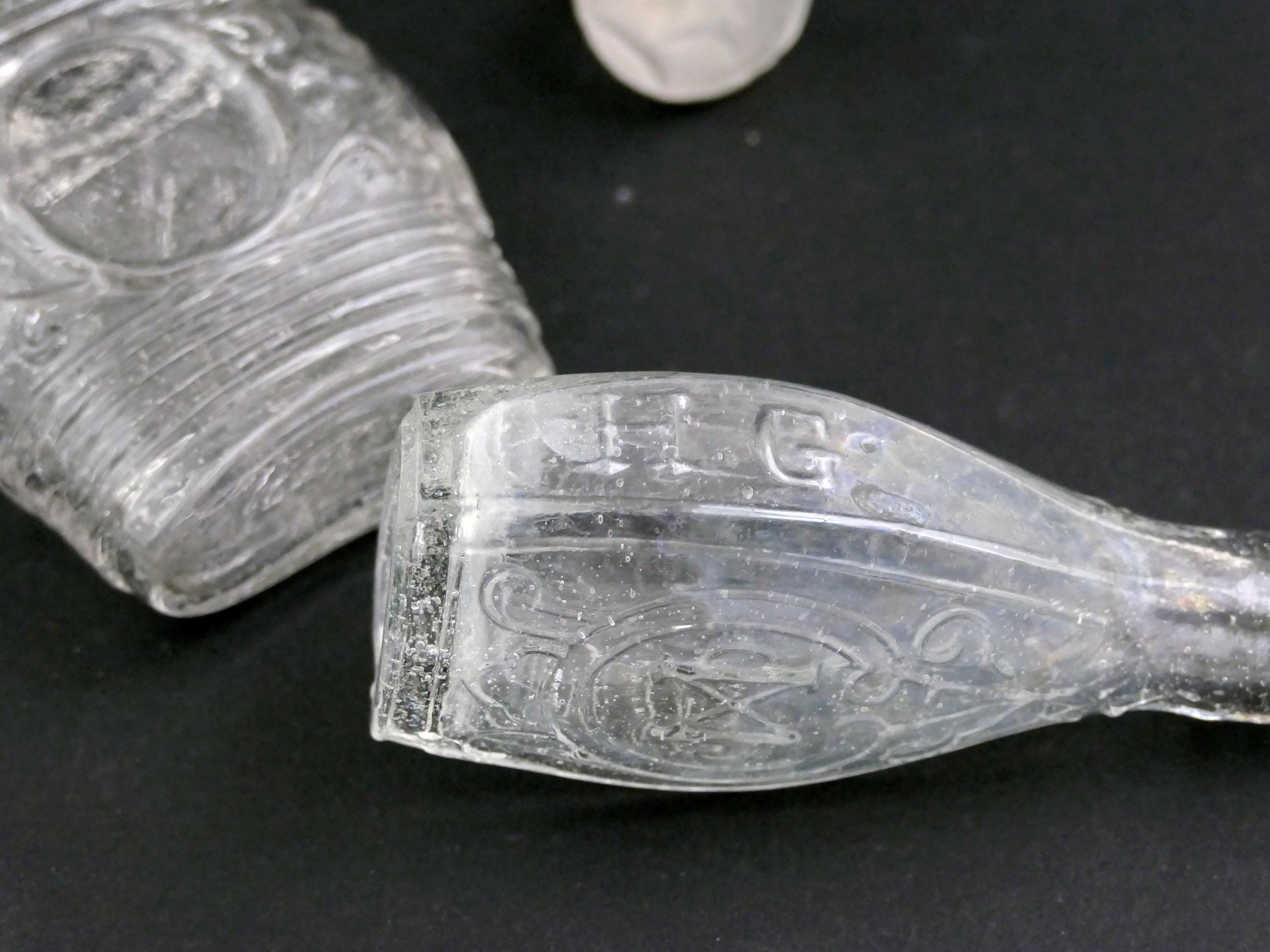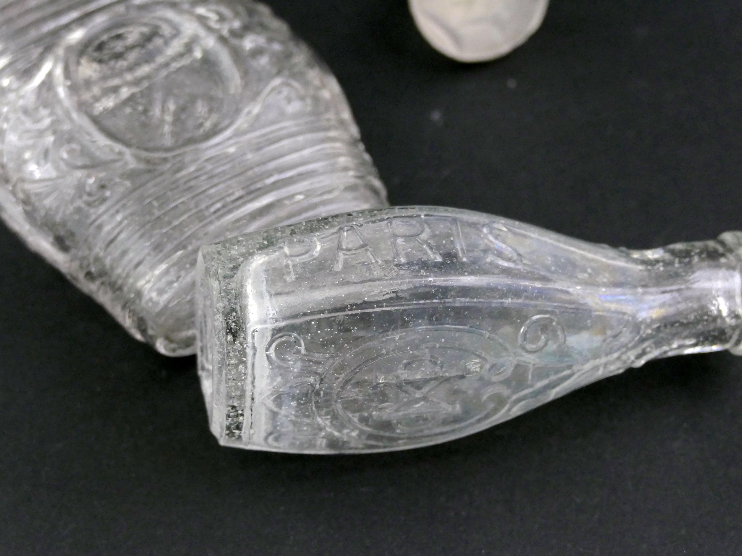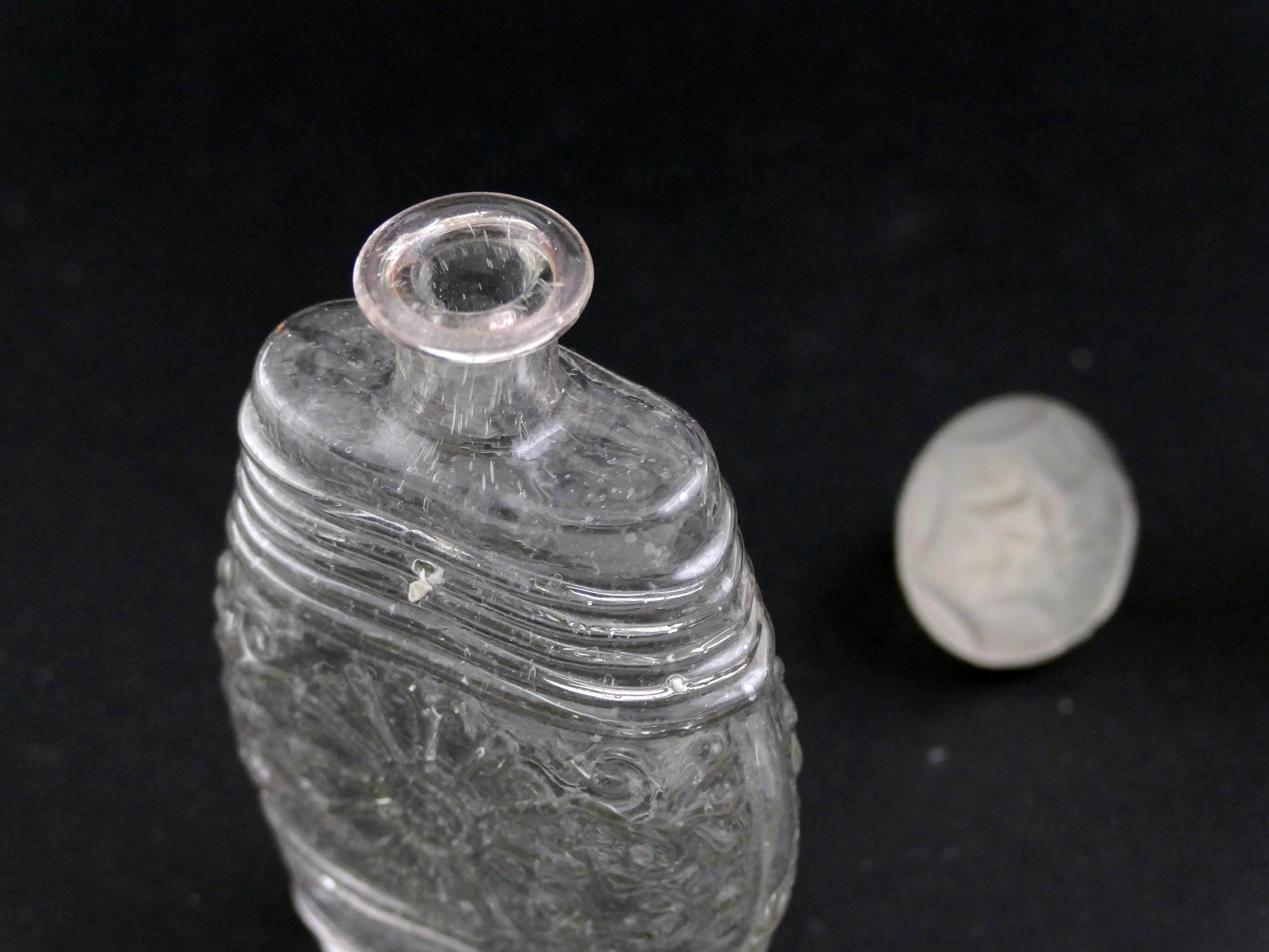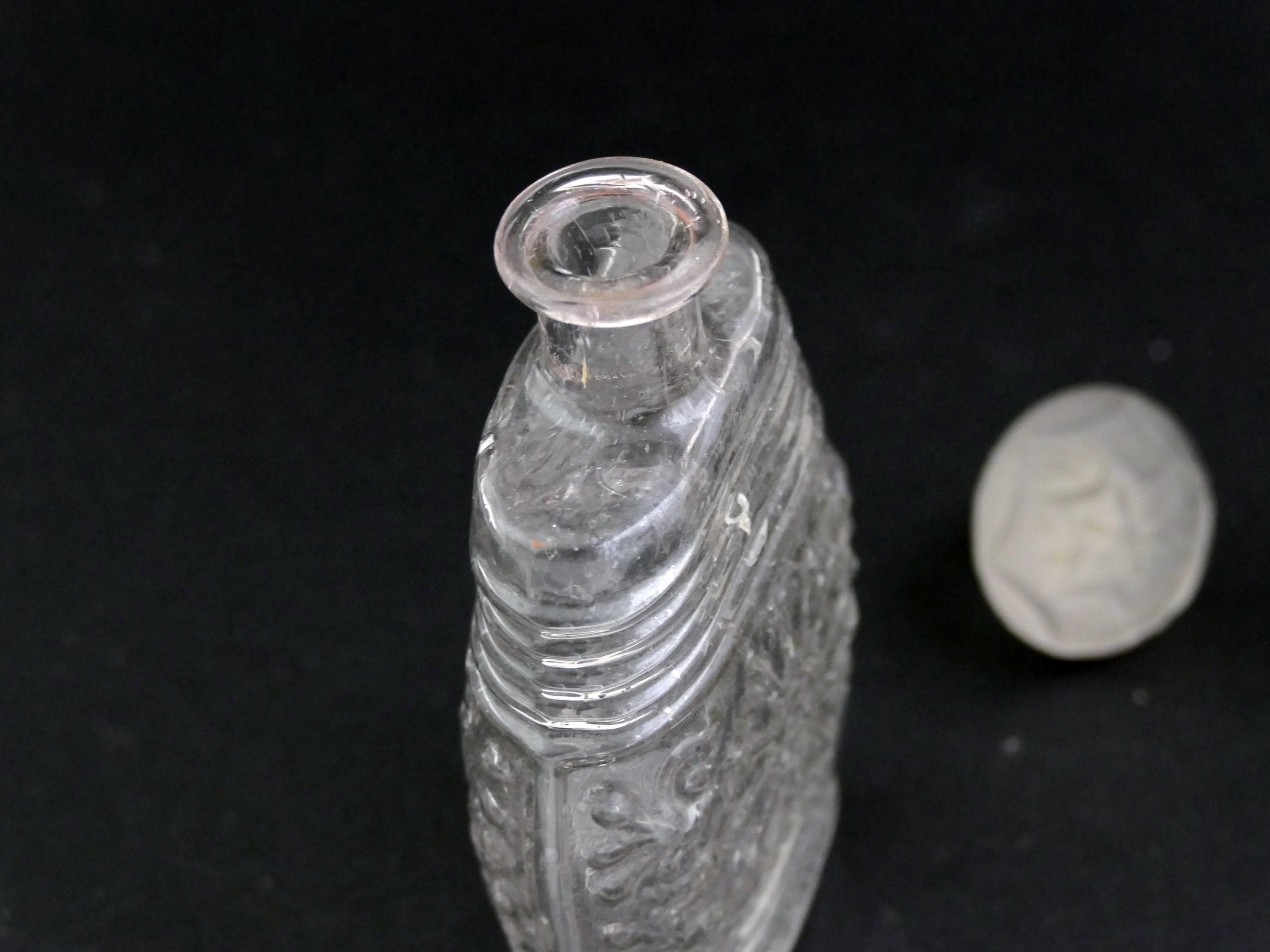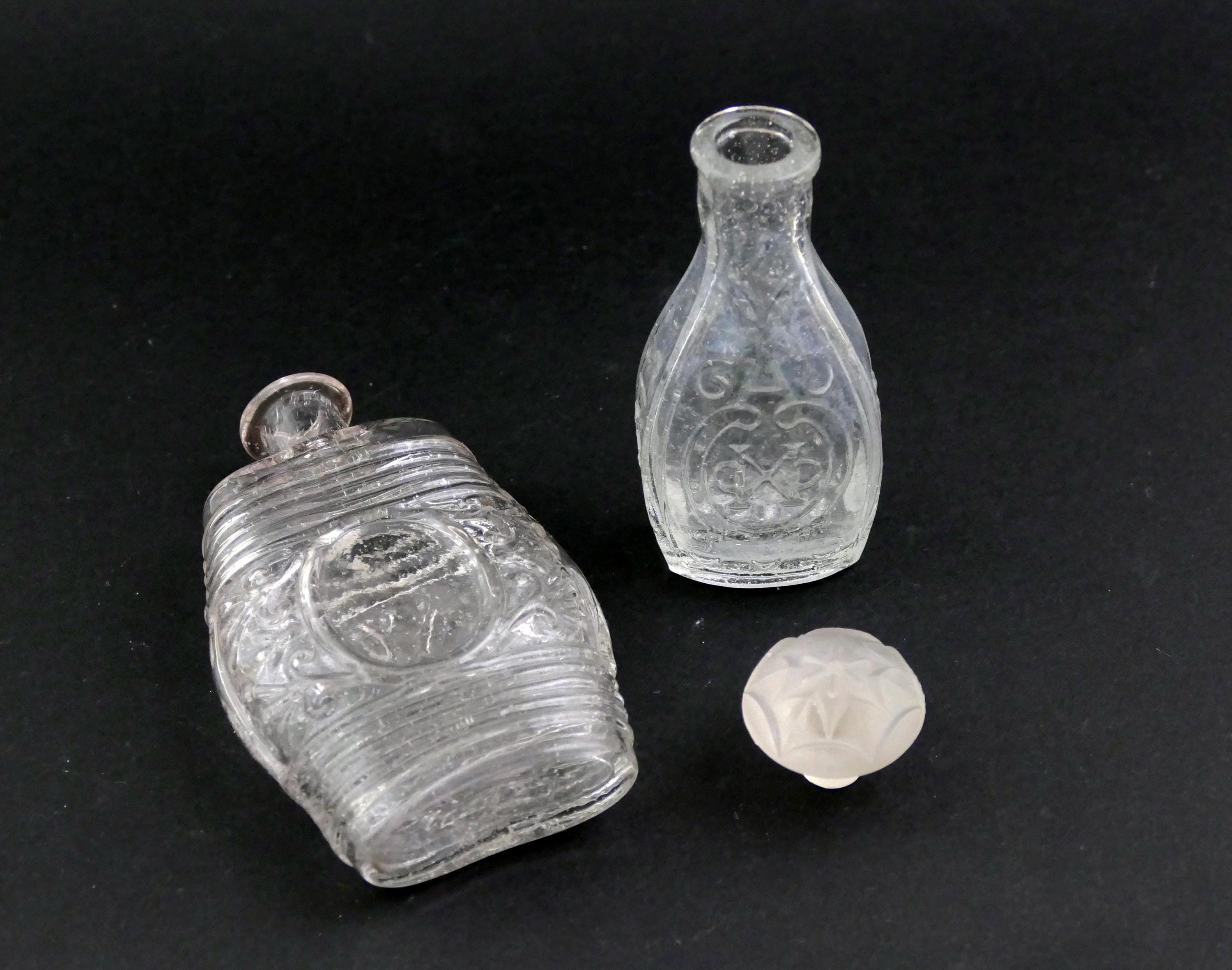 2 antique French embossed perfume bottles. Made of clear glass with embossed pattern and lettering. one bottle has a glass stopper although it is not the original. Ca late 1800s.