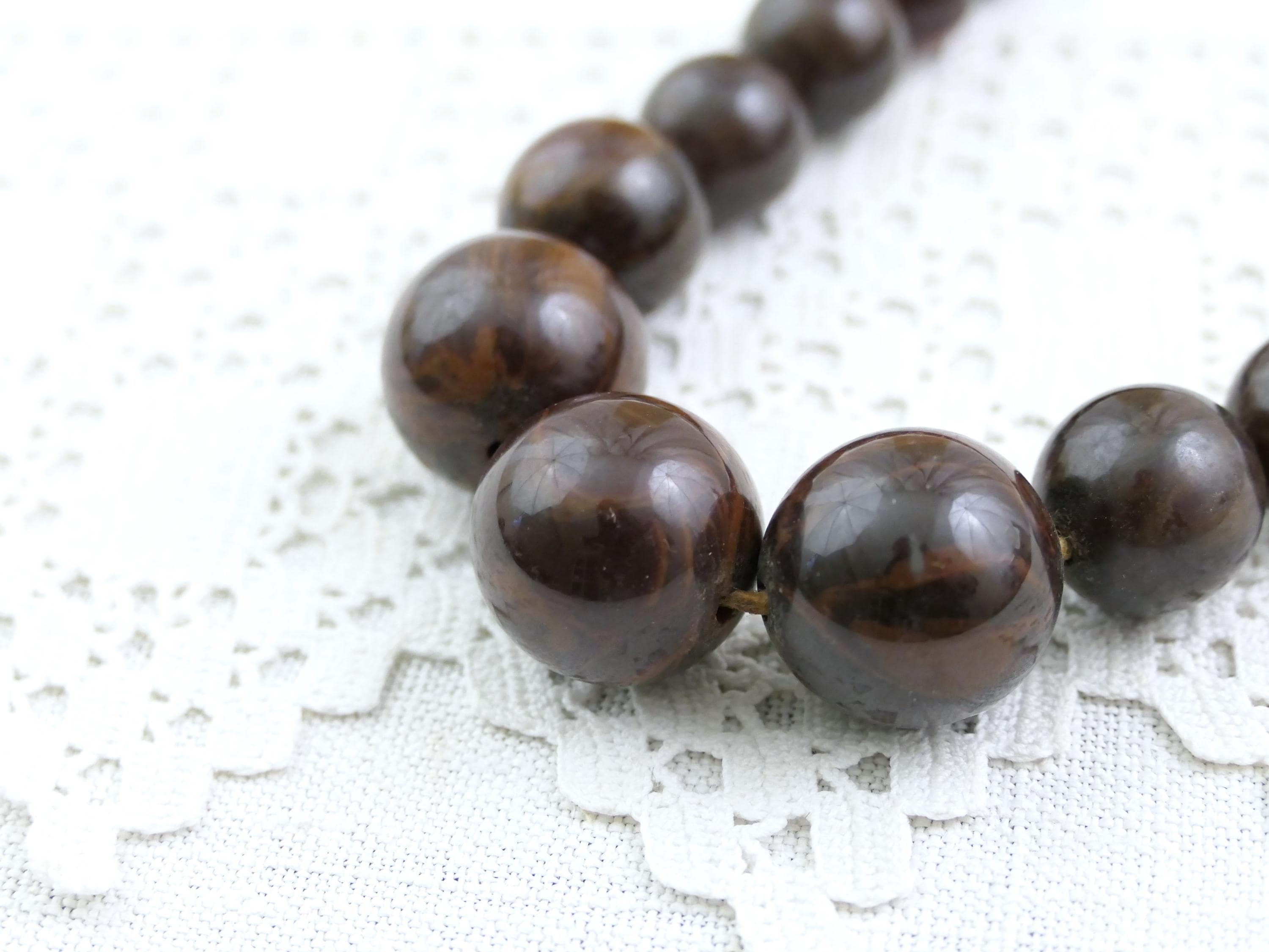 Vintage French long Catalin graduated bead necklace. Made of marbled chocolate colored Bakelite. Tested with Simichrome. Ca mid 1900s.
