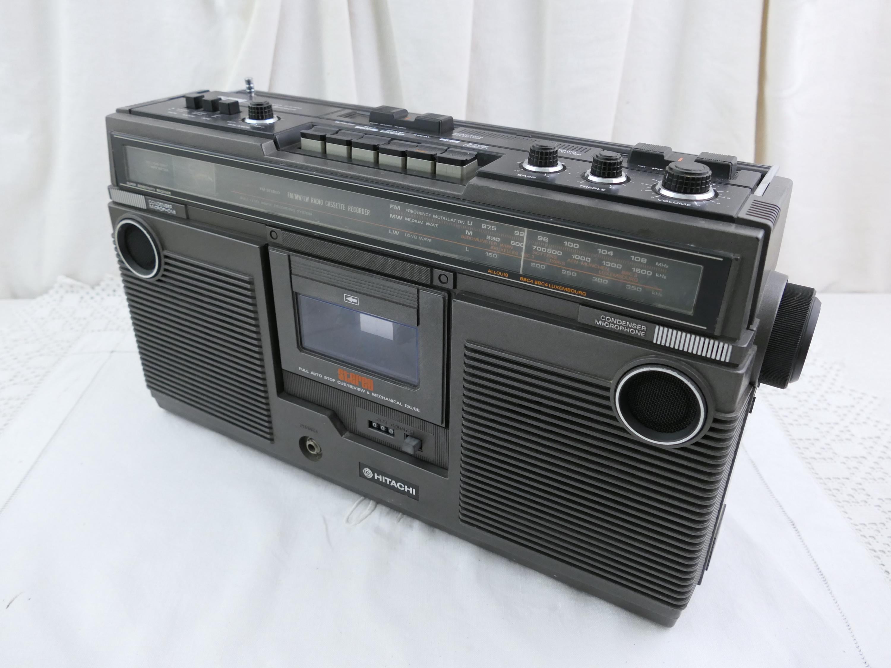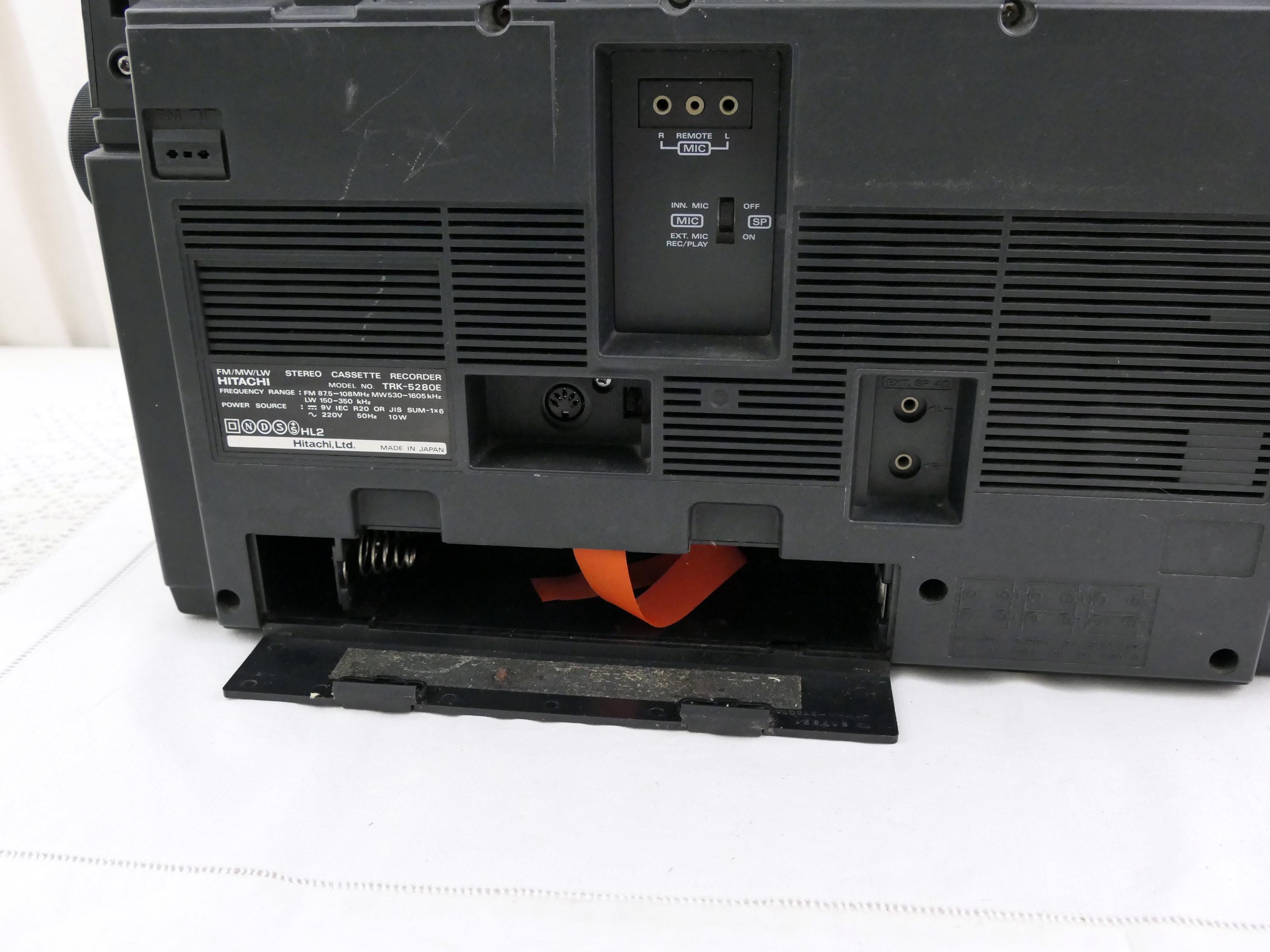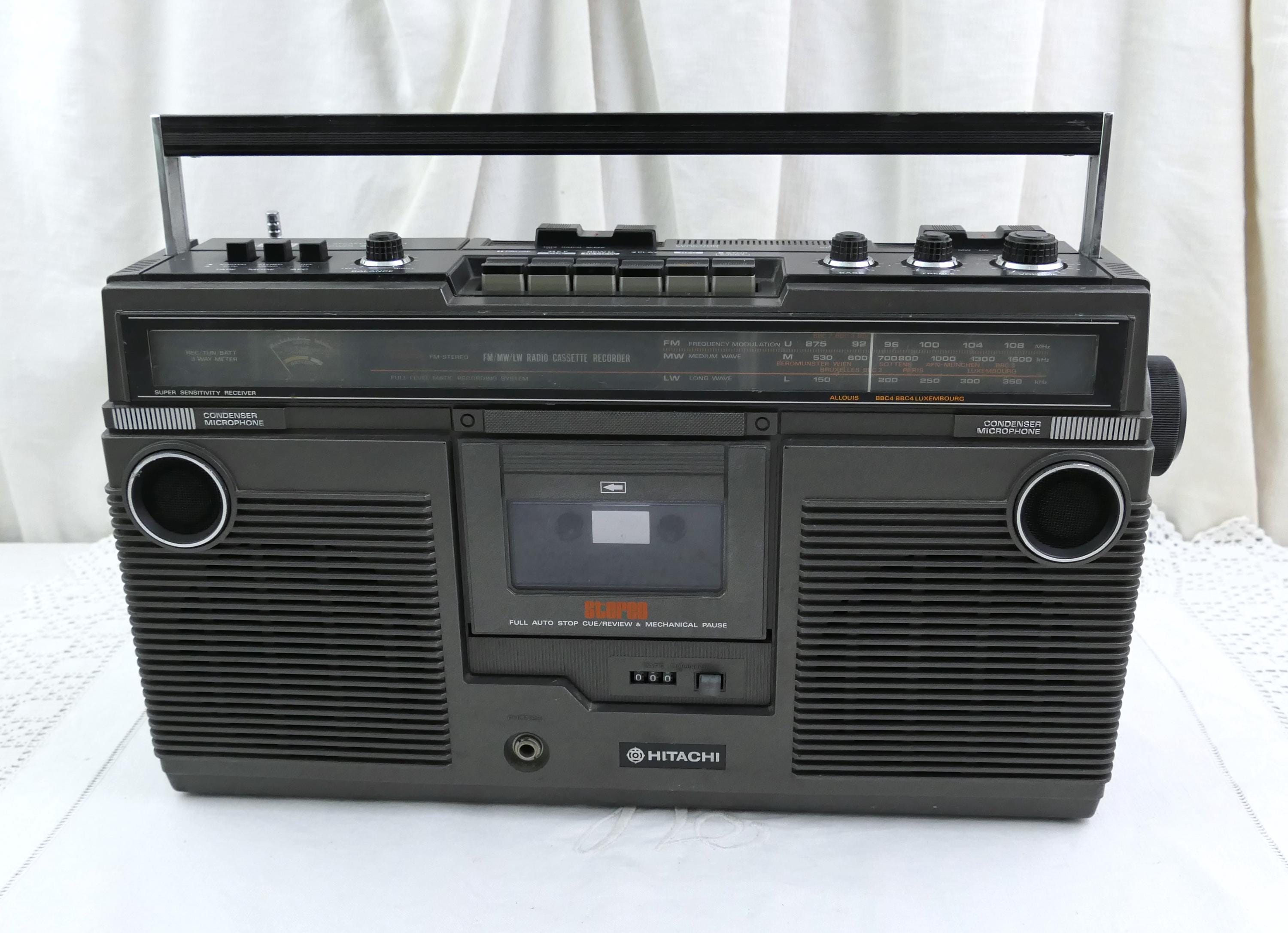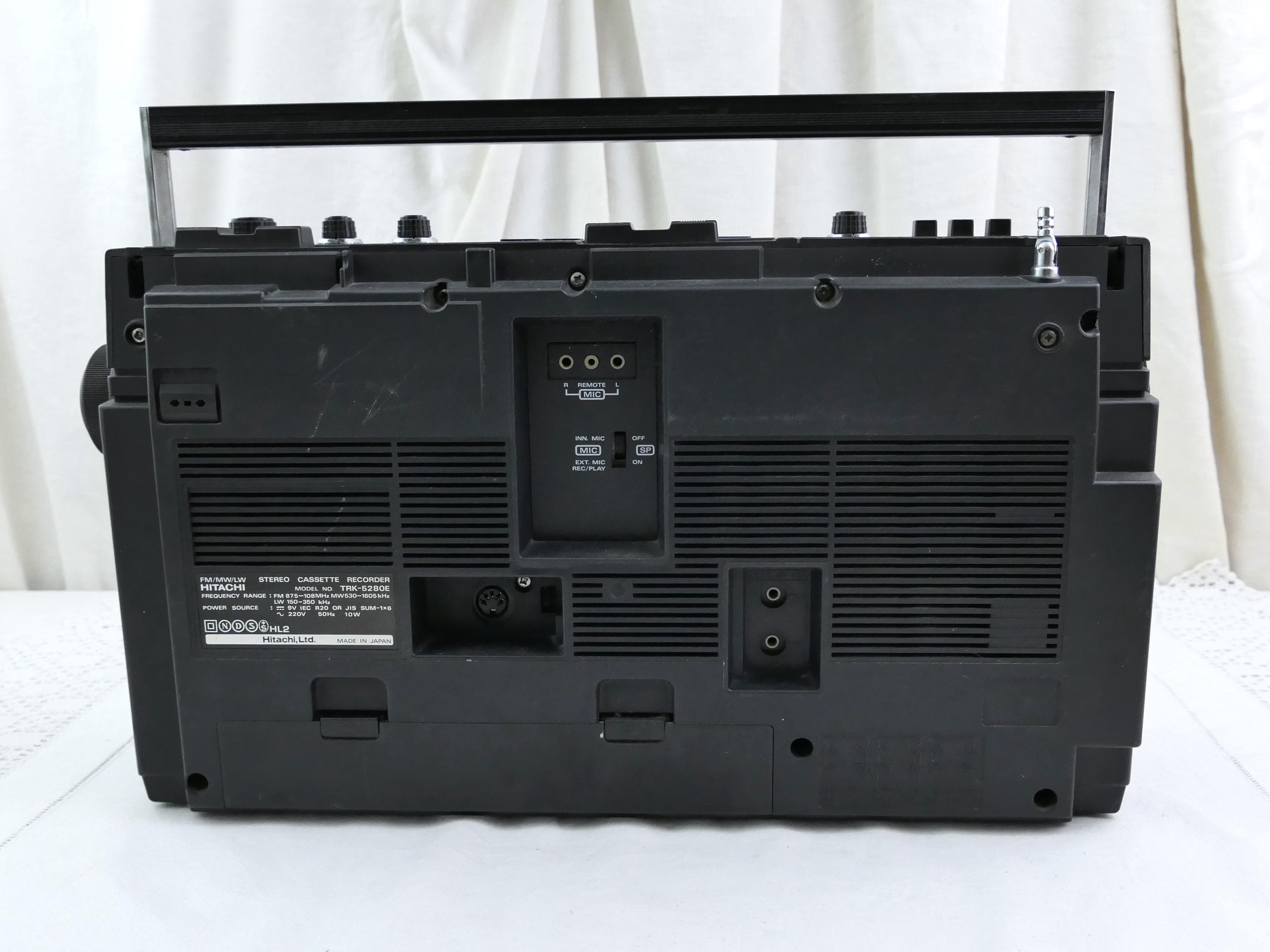 Vintage Hitachi TRK 5280E boombox ghetto blaster radio cassette player. The radio is in working order, the cassette player does not work, works with batteries also. The electrical cord has a European continental plug. Ca 1980s.