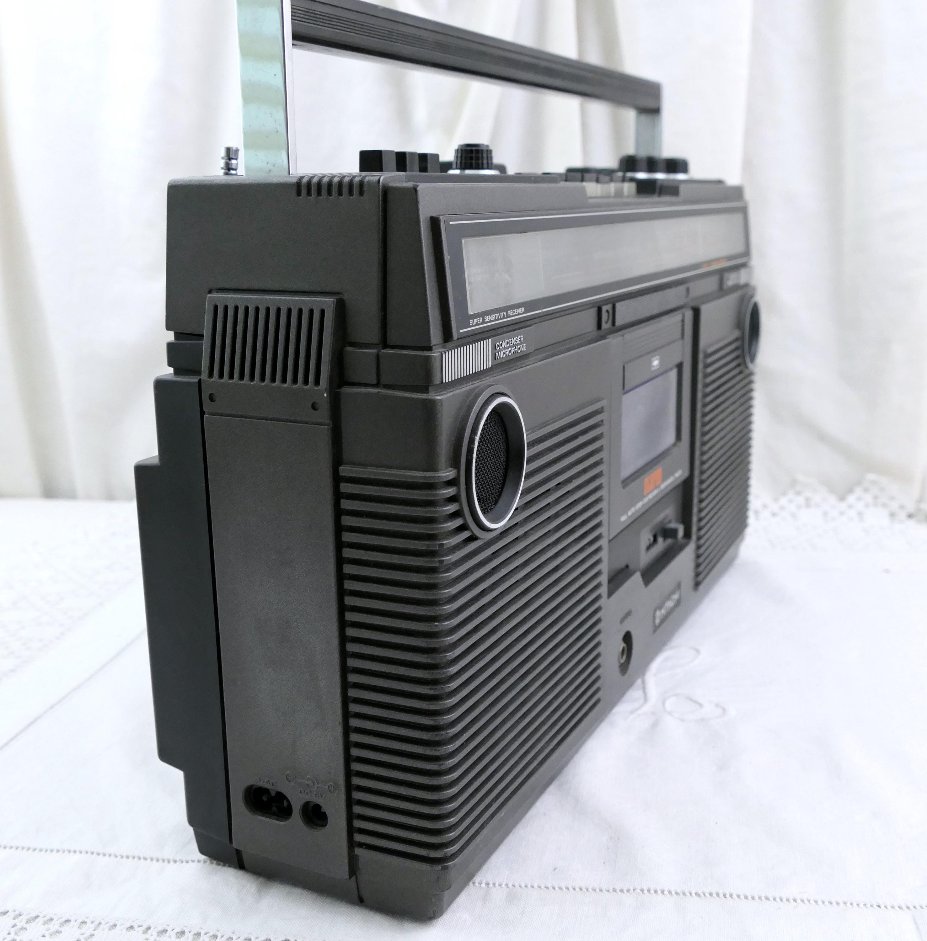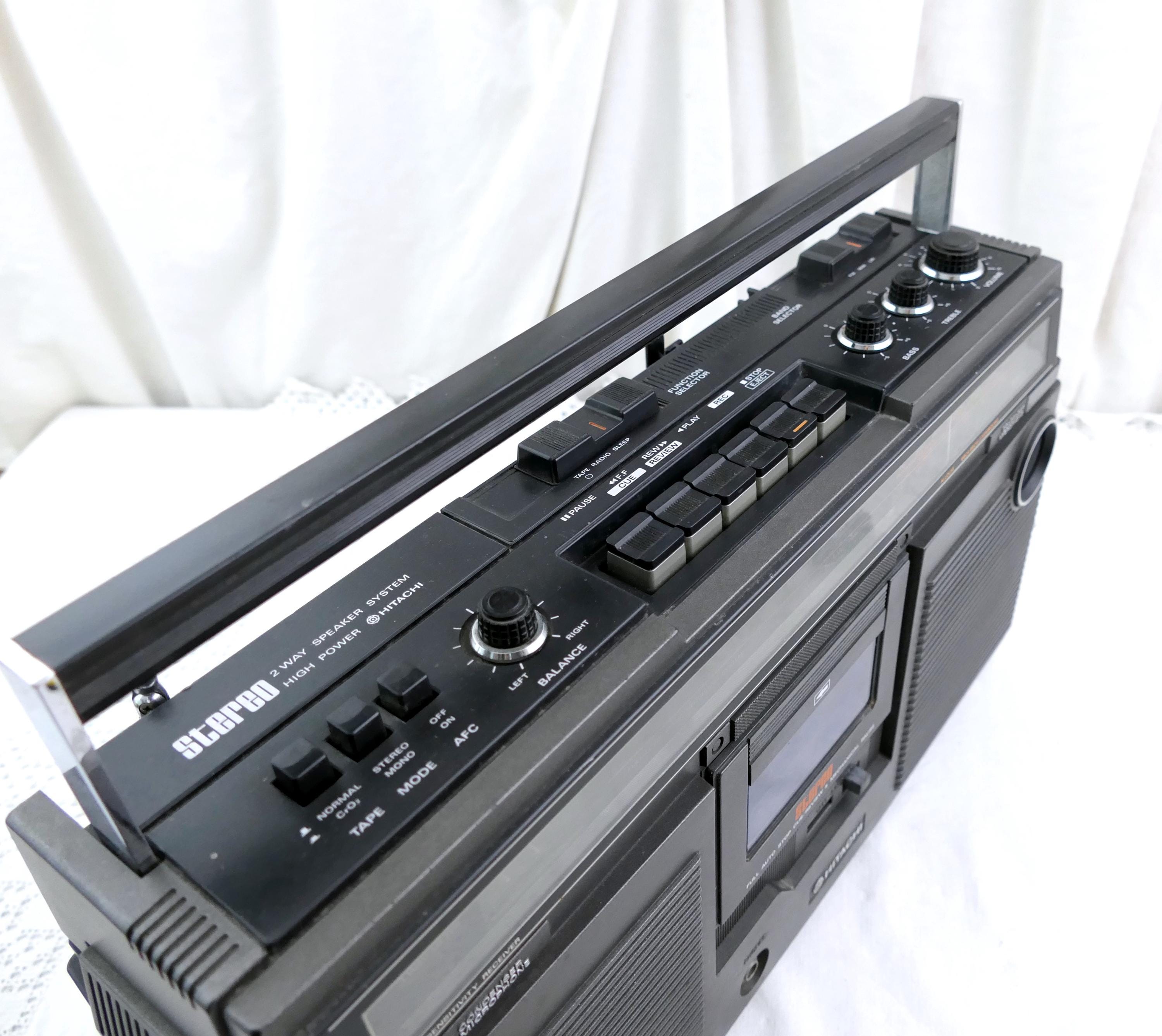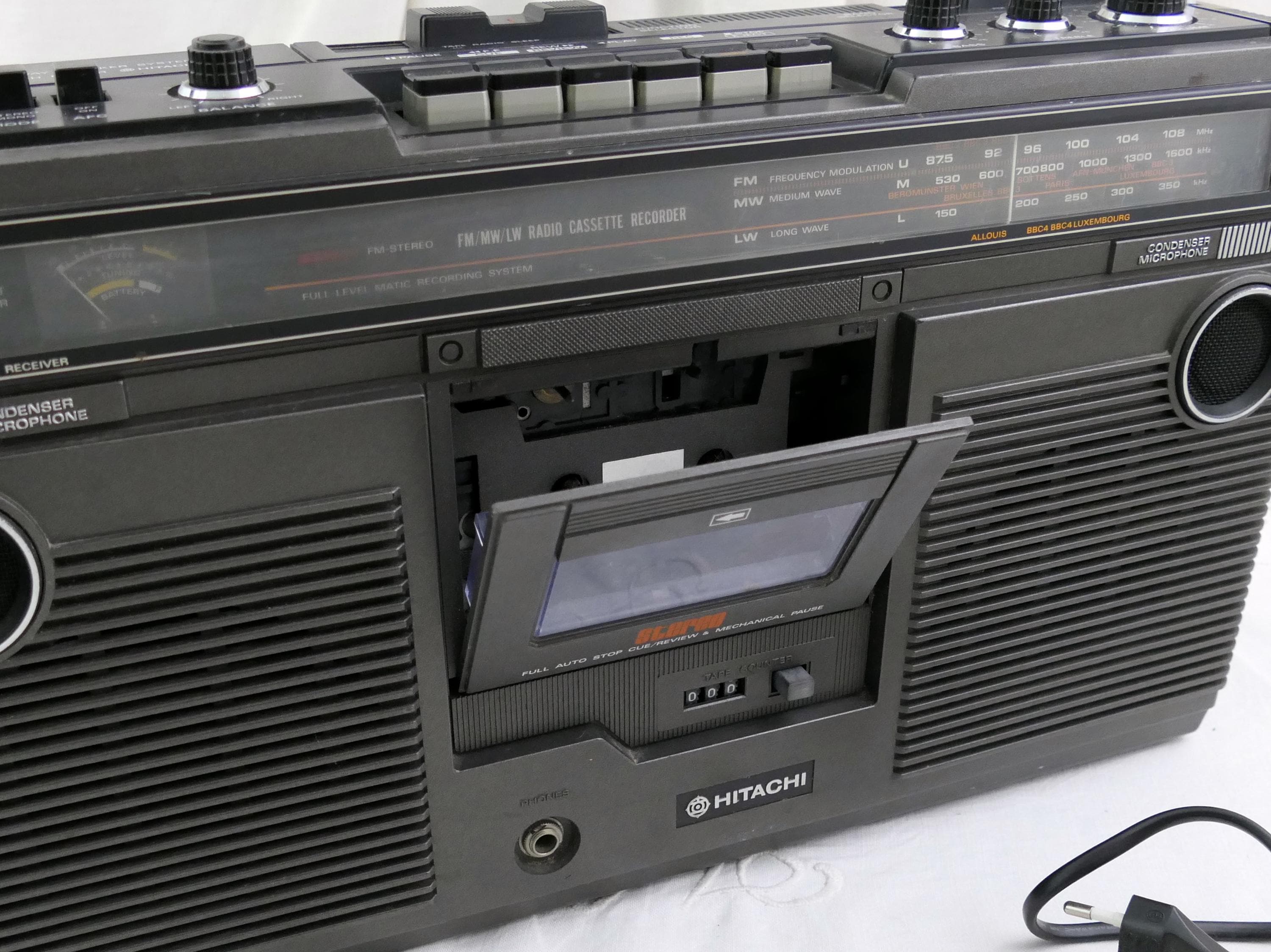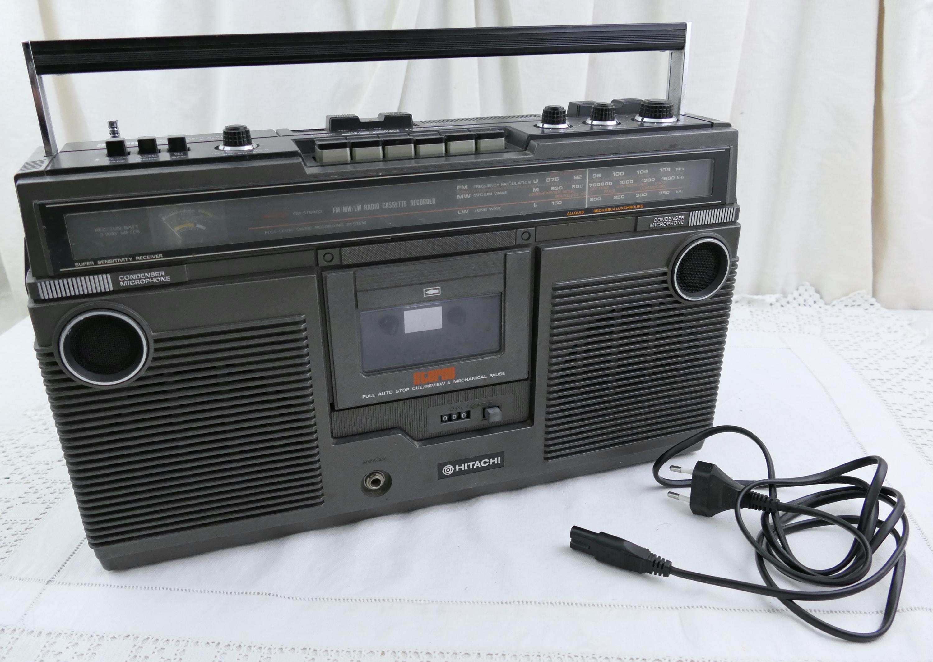 Vintage Hitachi TRK 5280E boombox ghetto blaster radio cassette player. The radio is in working order, the cassette player does not work, works with batteries also. The electrical cord has a European continental plug. Ca 1980s.
