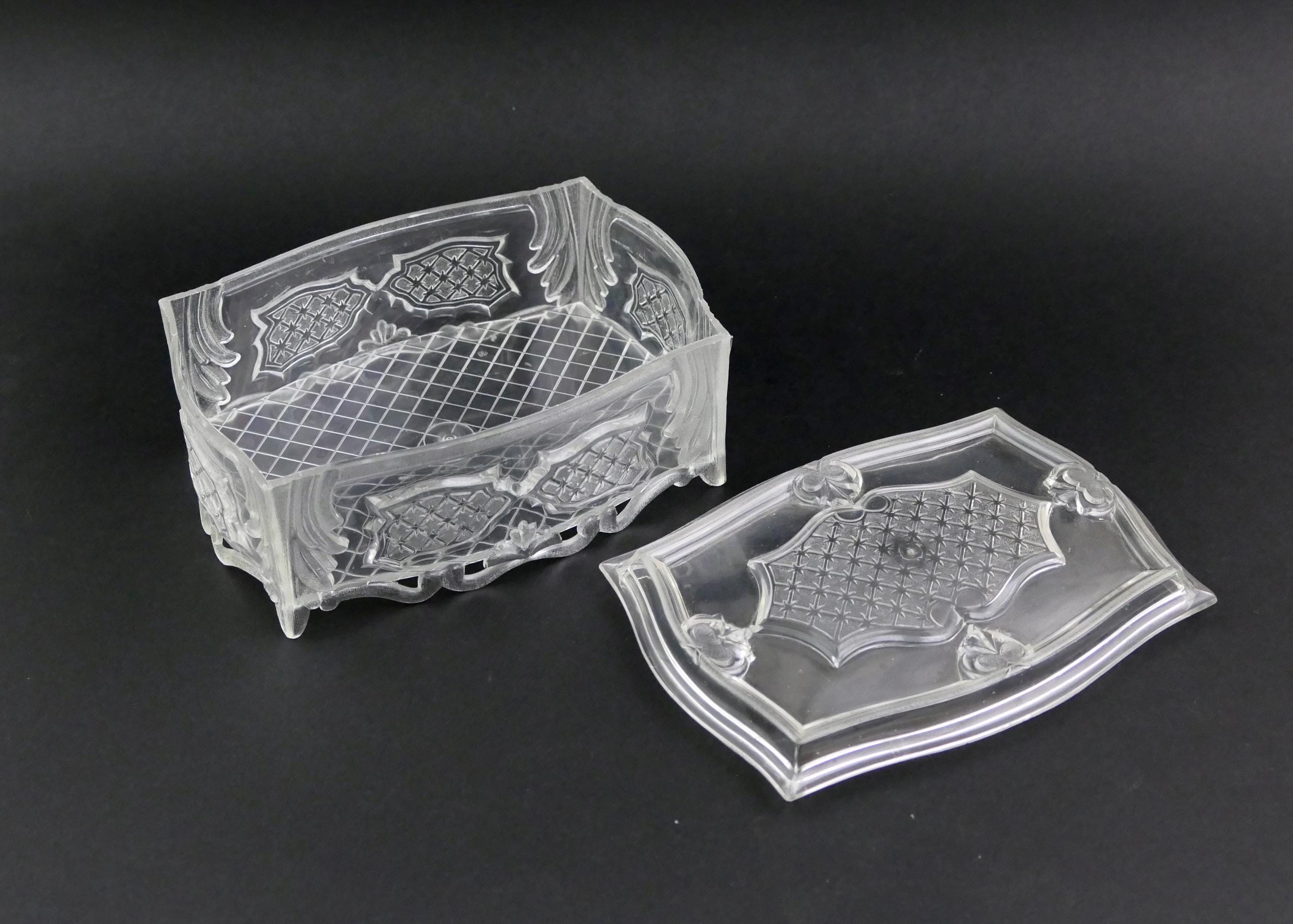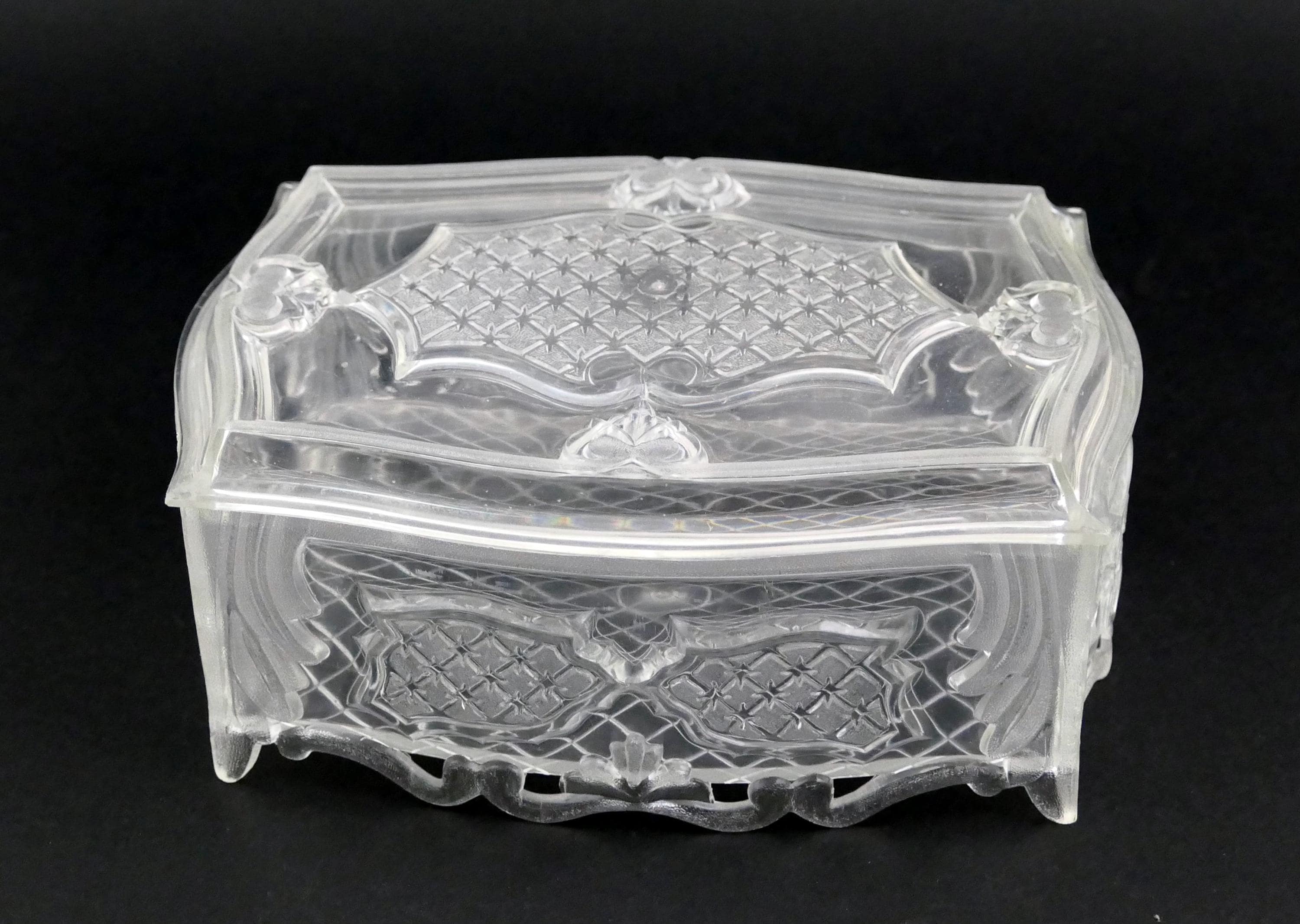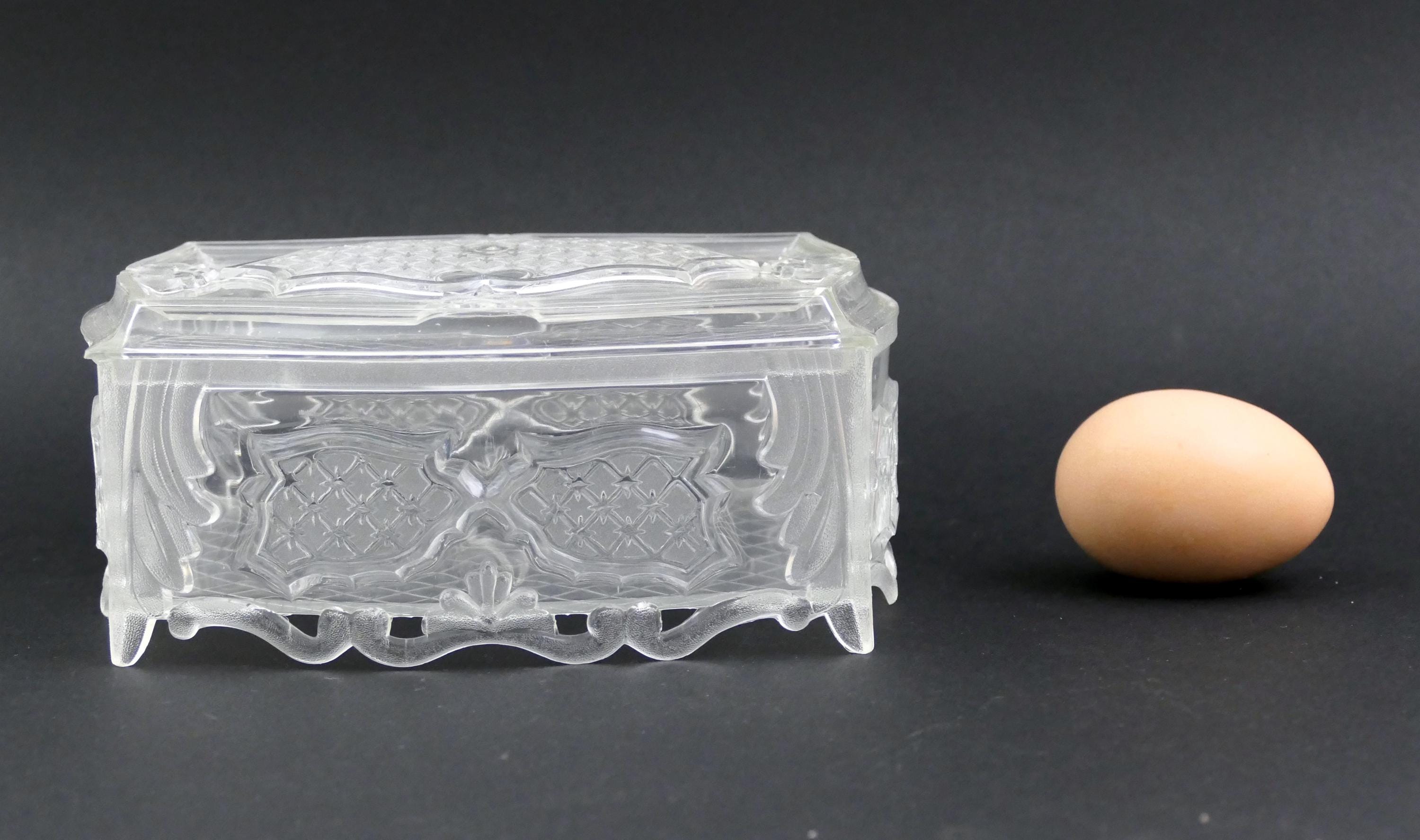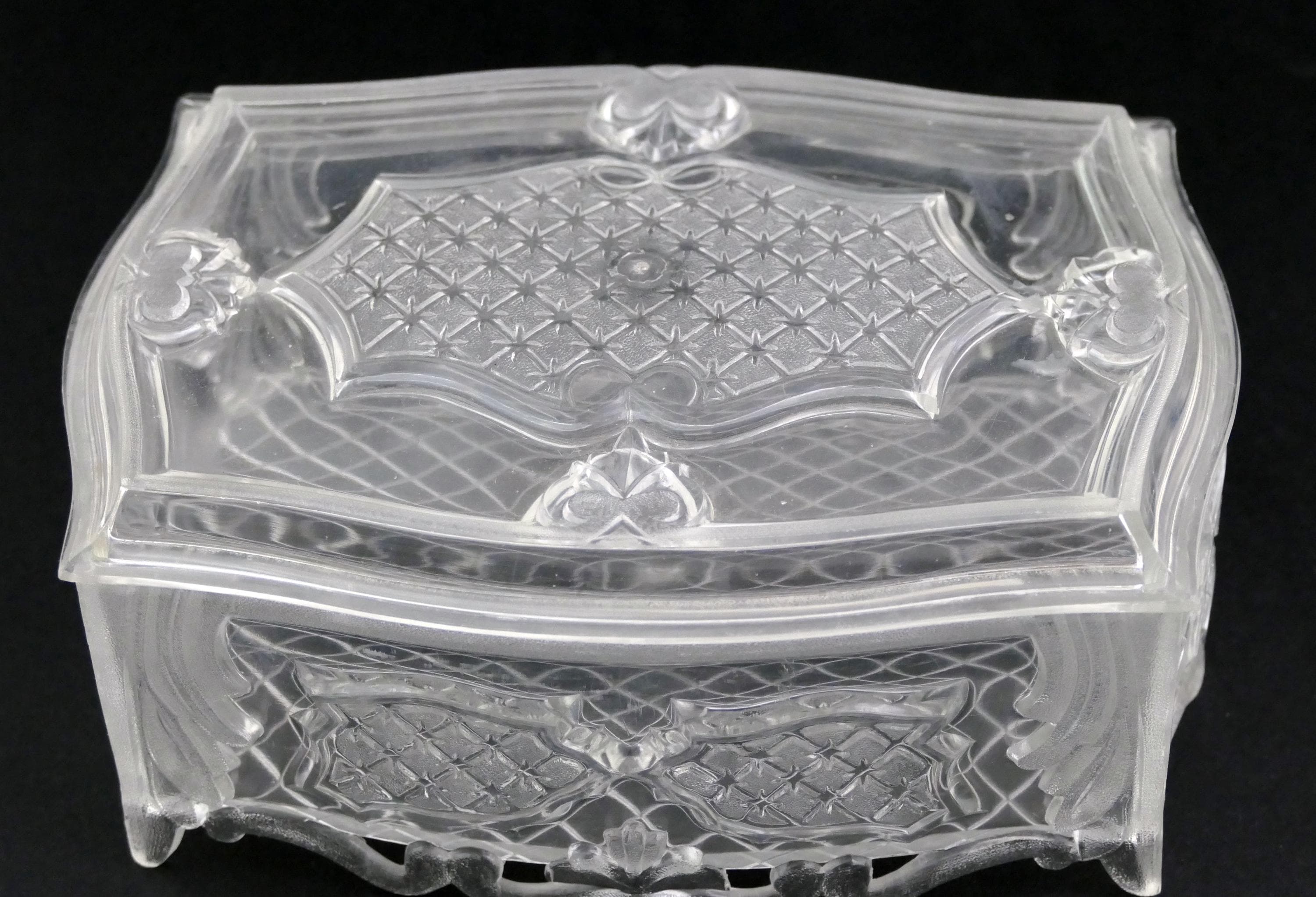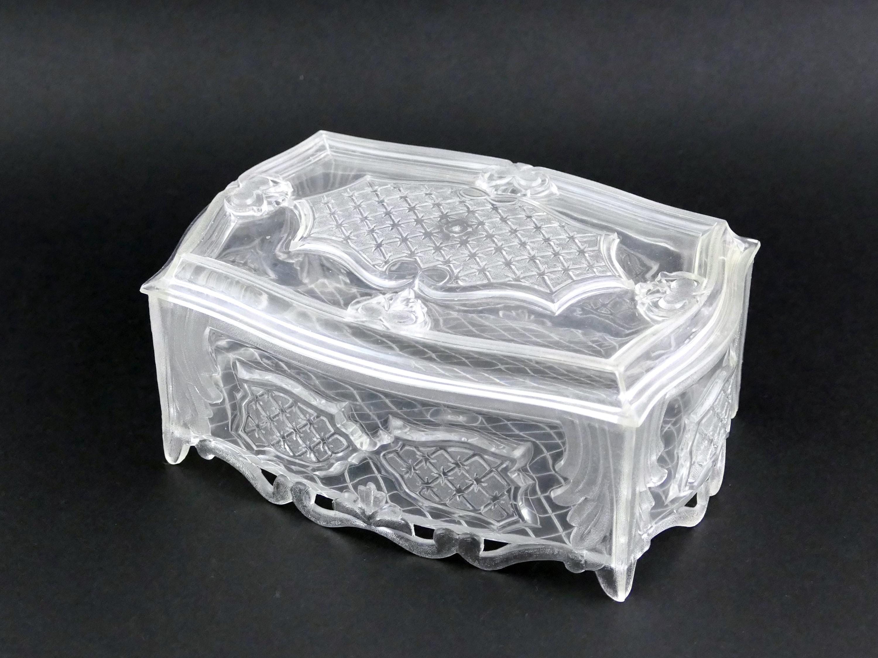 Vintage Lucite ornate decorative jewelry box. Made of clear plastic. Ca 1950s - 1960s.