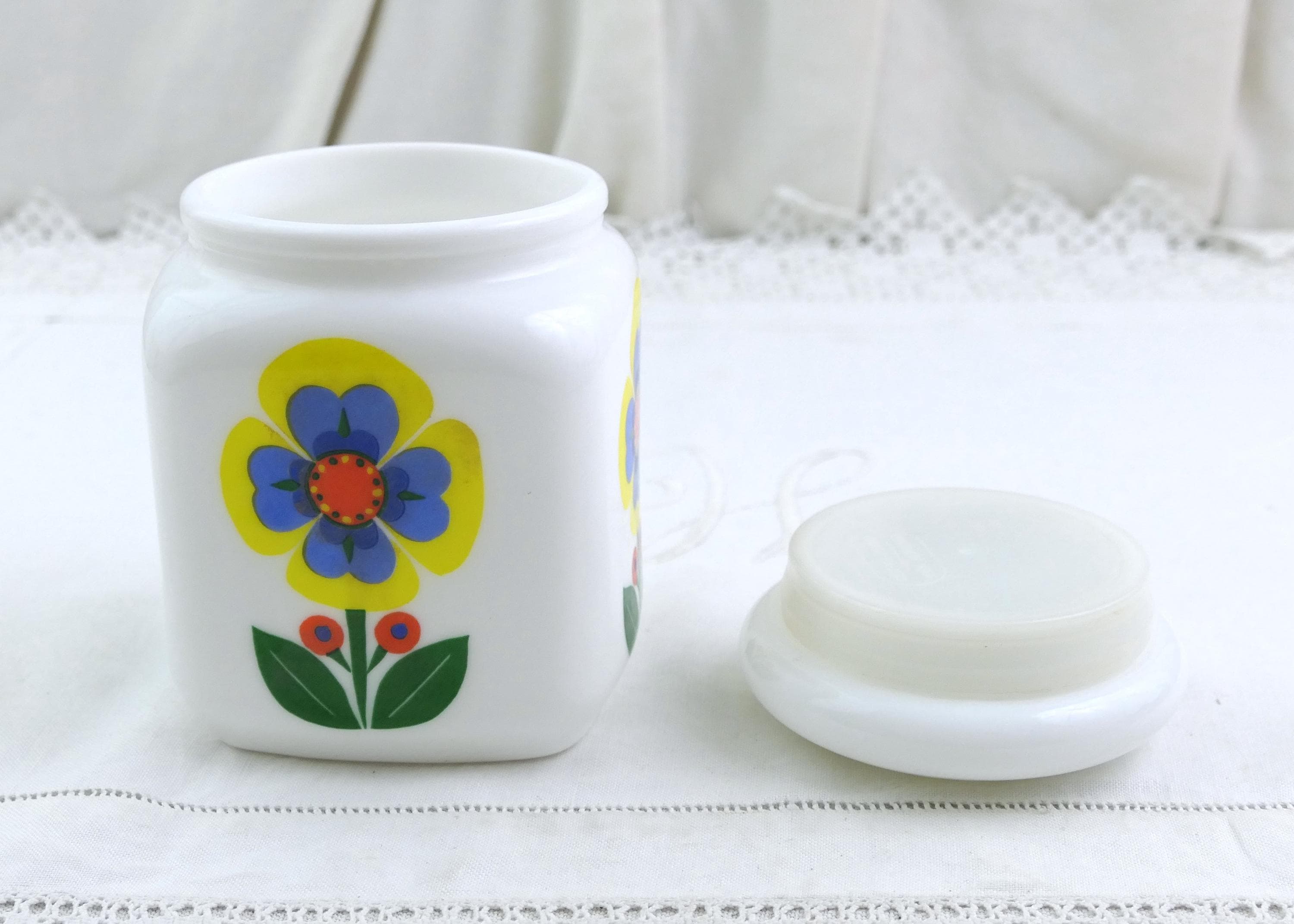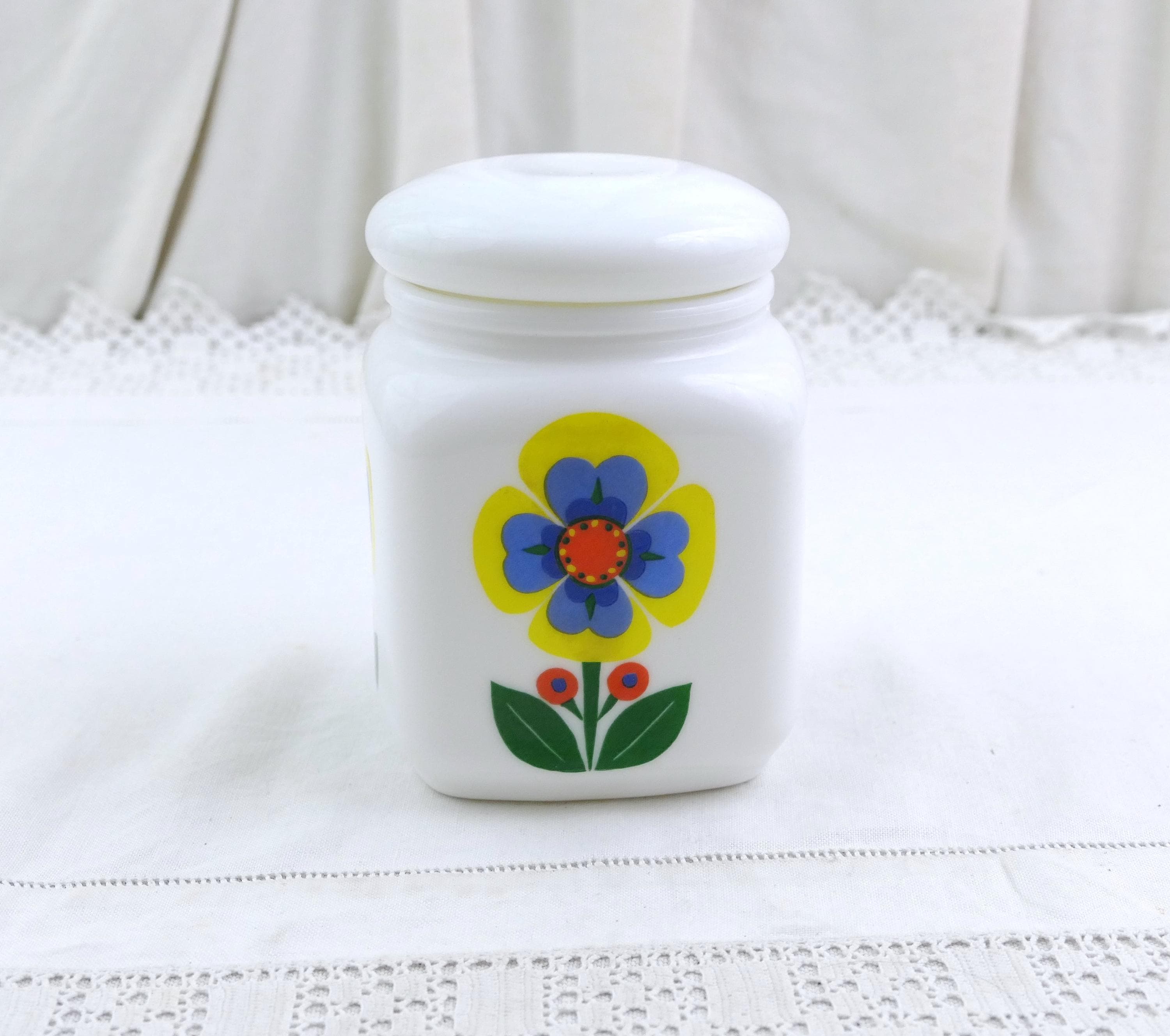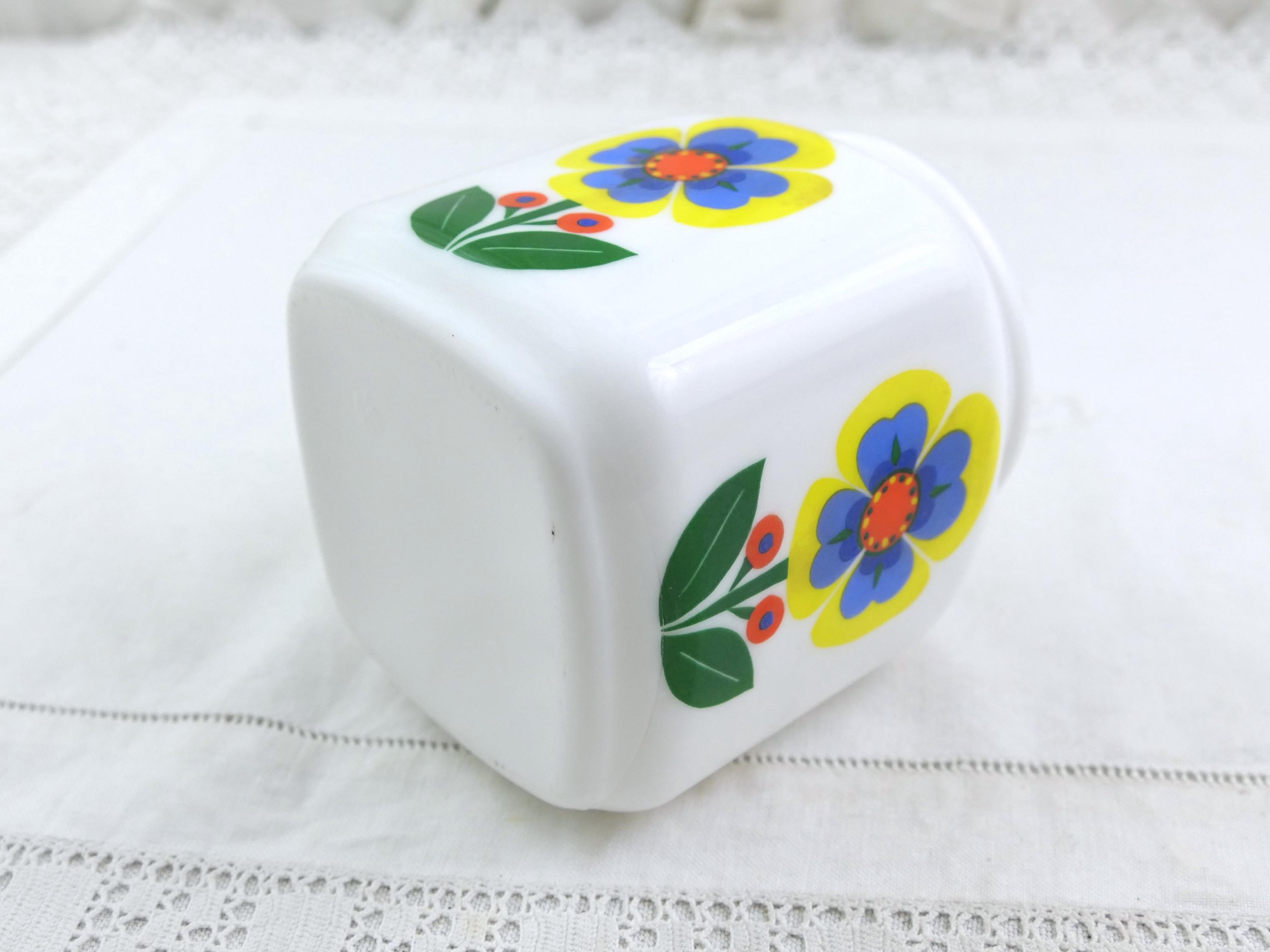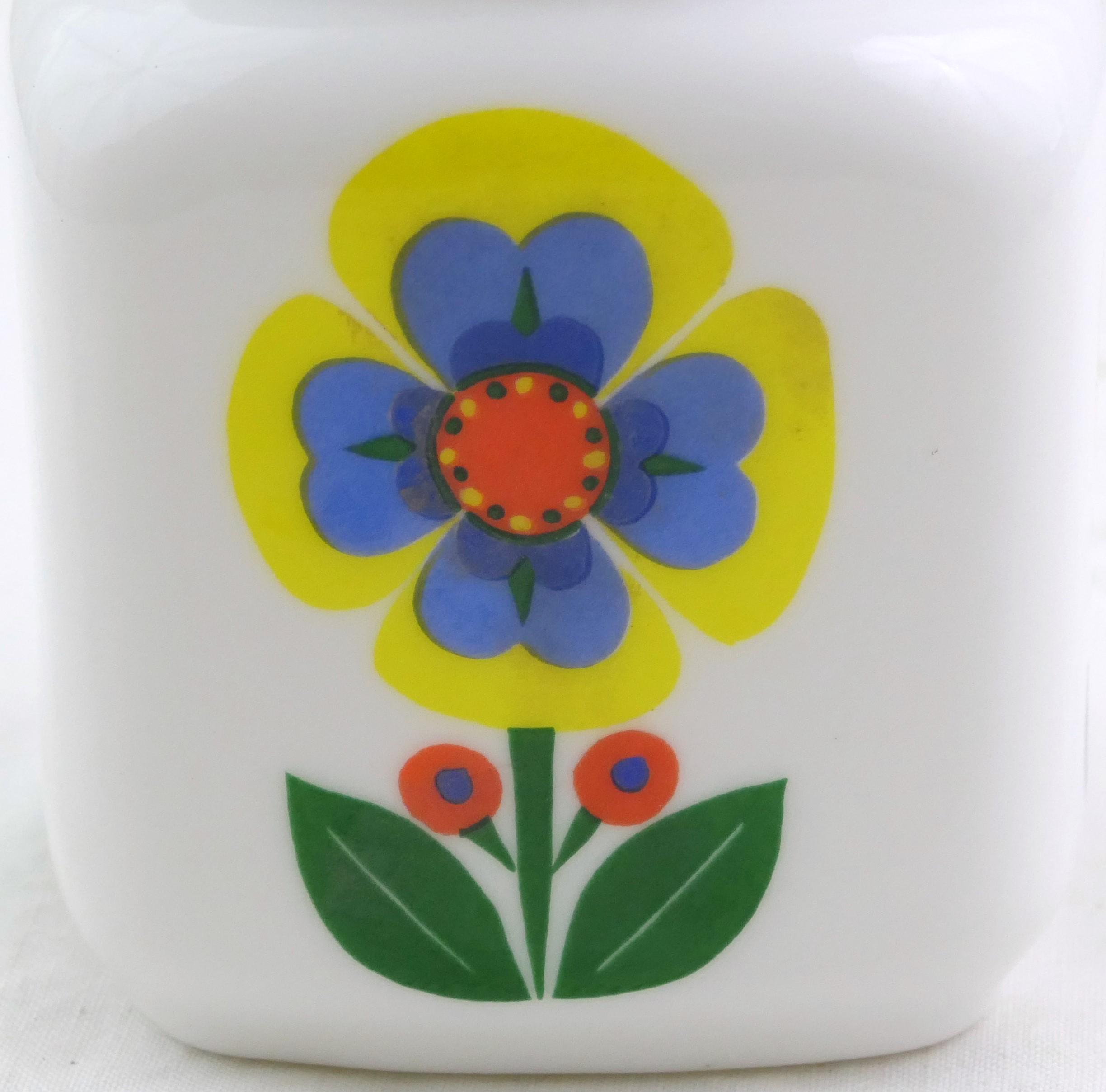 Vintage French Mid Century square storage jar with stylized flower pattern in bold bright colors. Made of white milk glass. Ca 1960s.