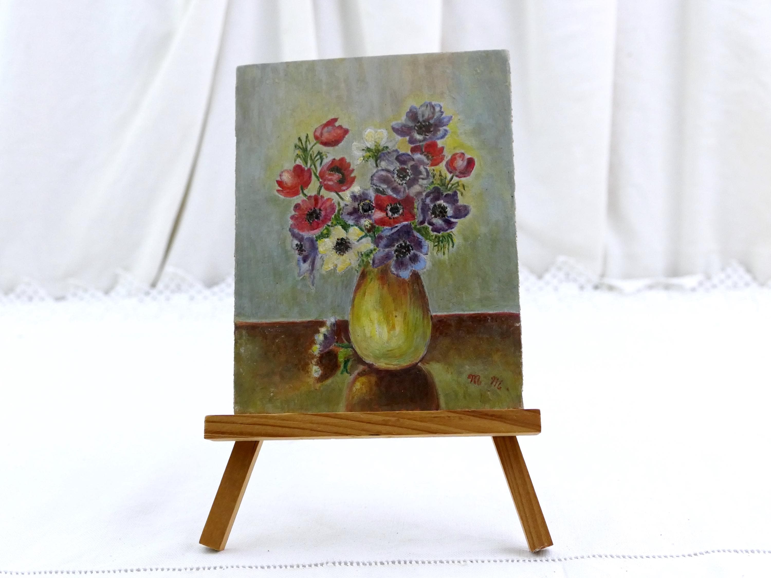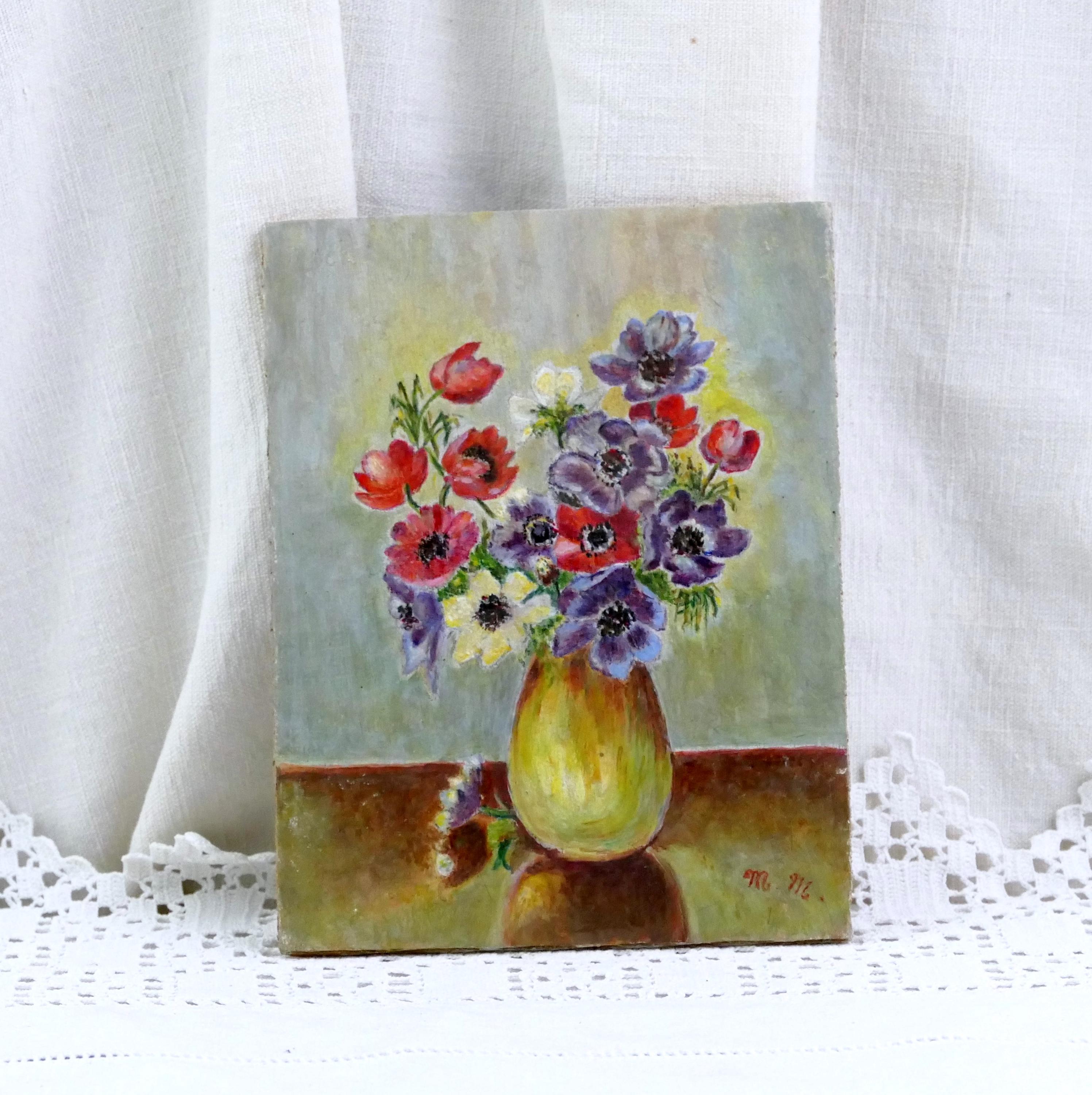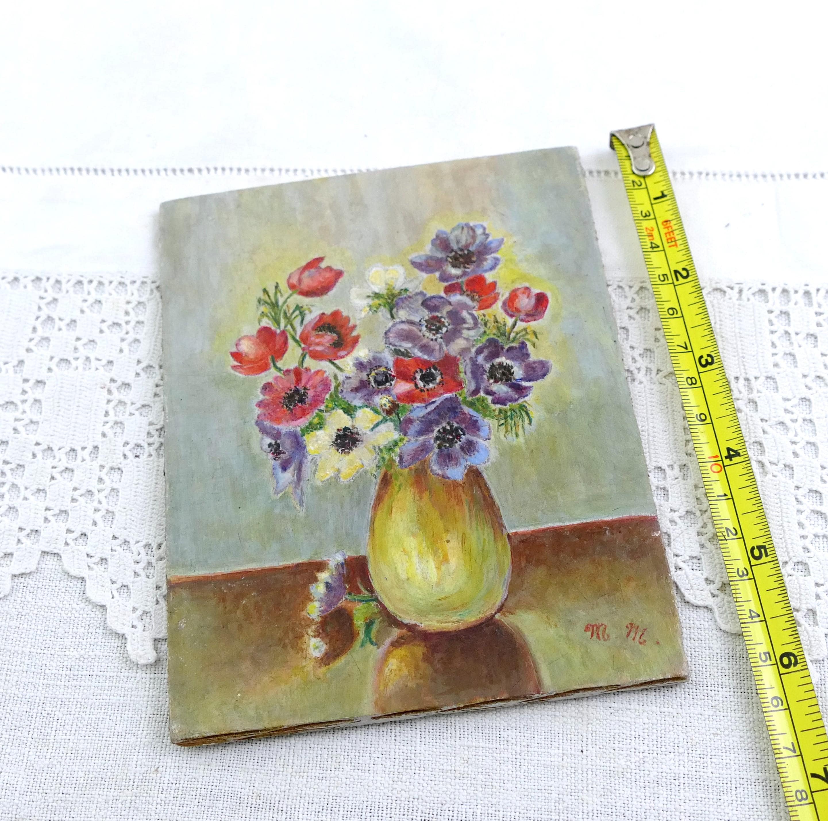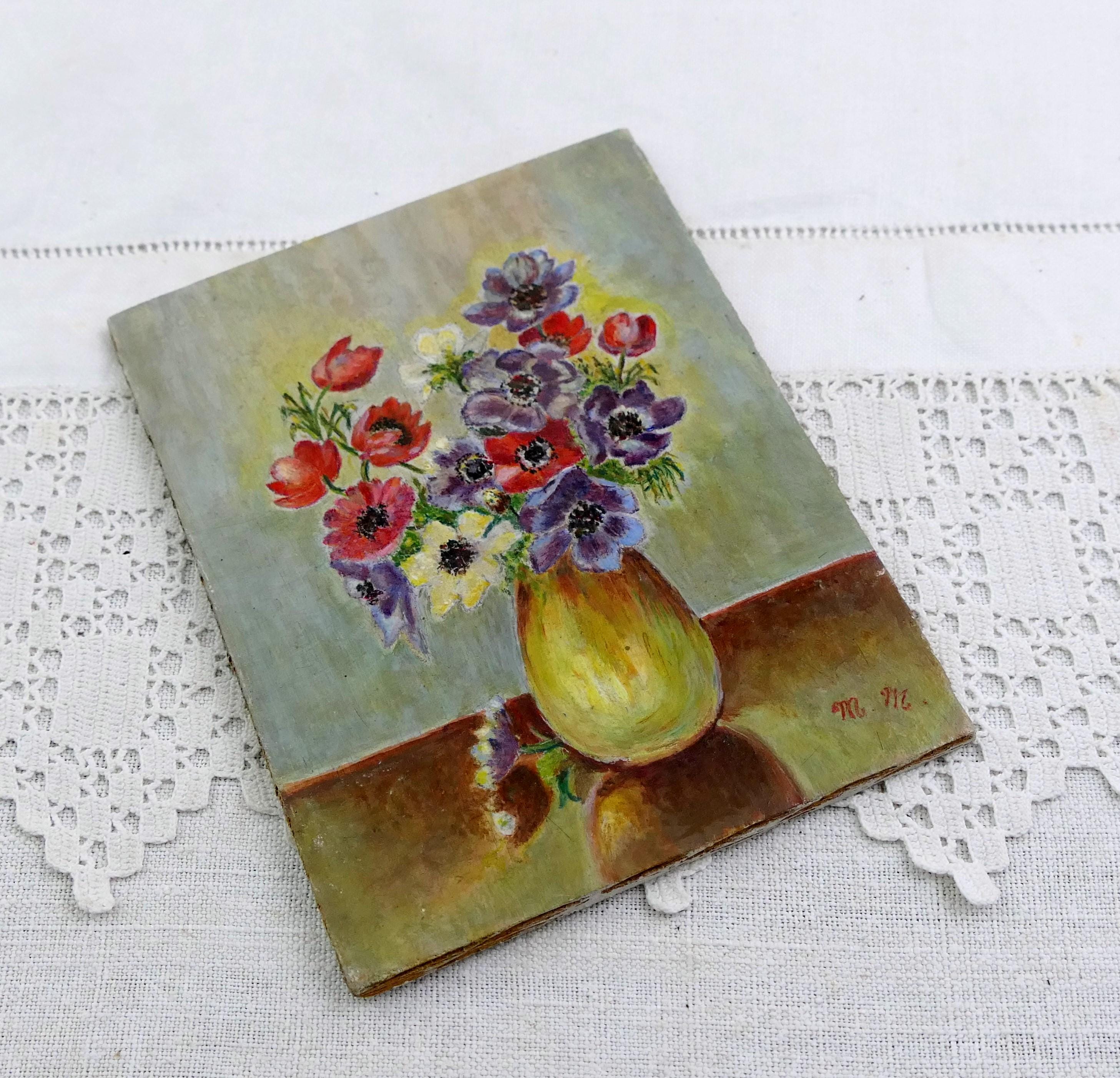 Small vintage postcard sized unframed still life painting of flowers in a vase. Hand painted varnished gouache paint on wooden board. Ca mid to late 1900s.