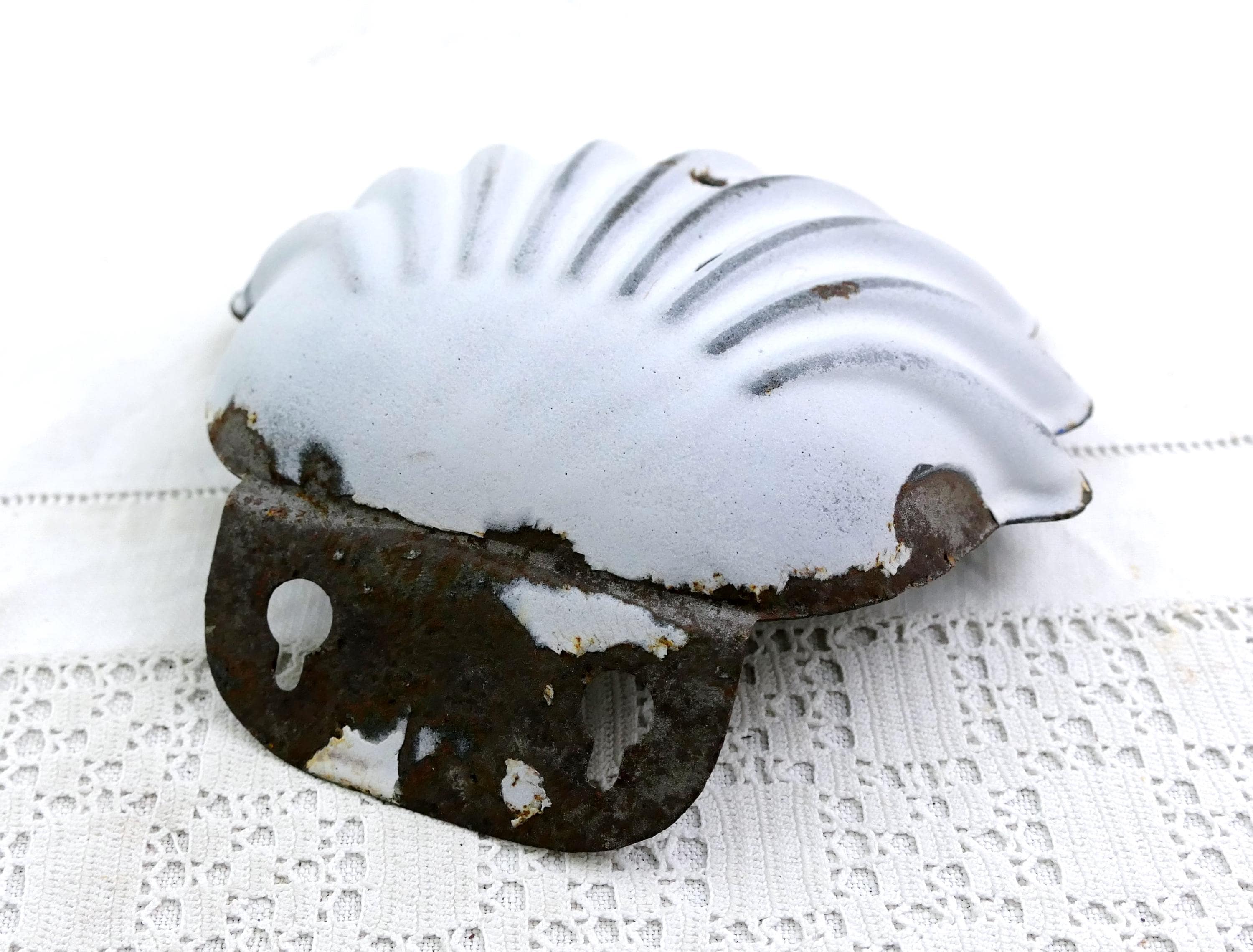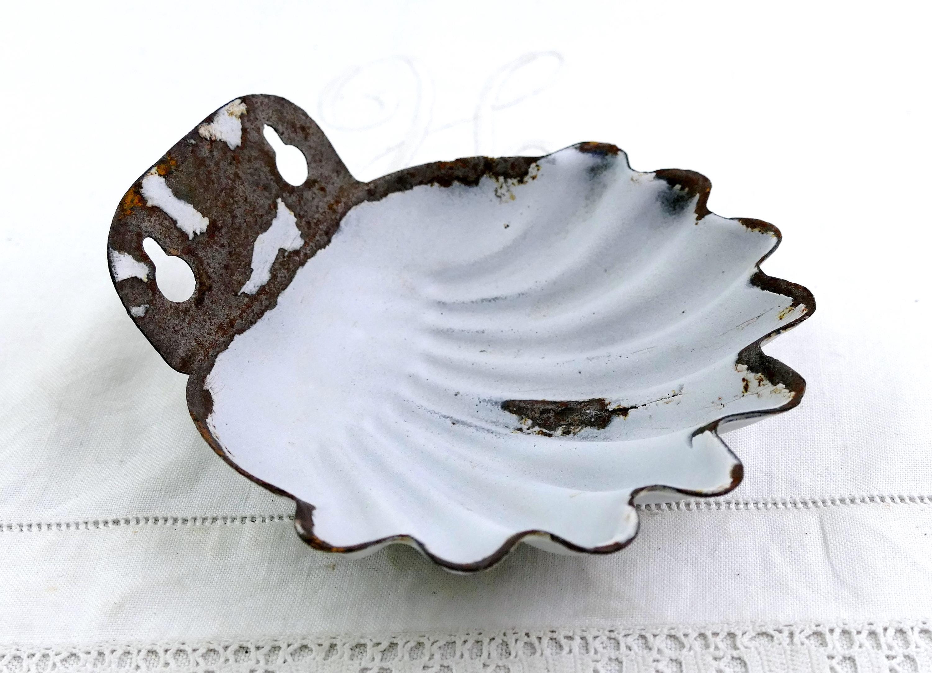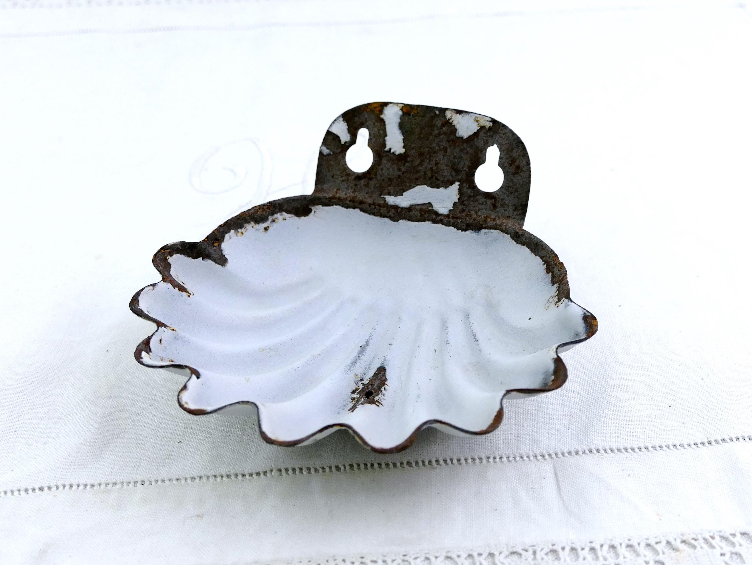 Antique French white enamel wall hanging / free standing soap dish, scalloped shell shaped. Made of white enameled metal. Ca late 1800s.