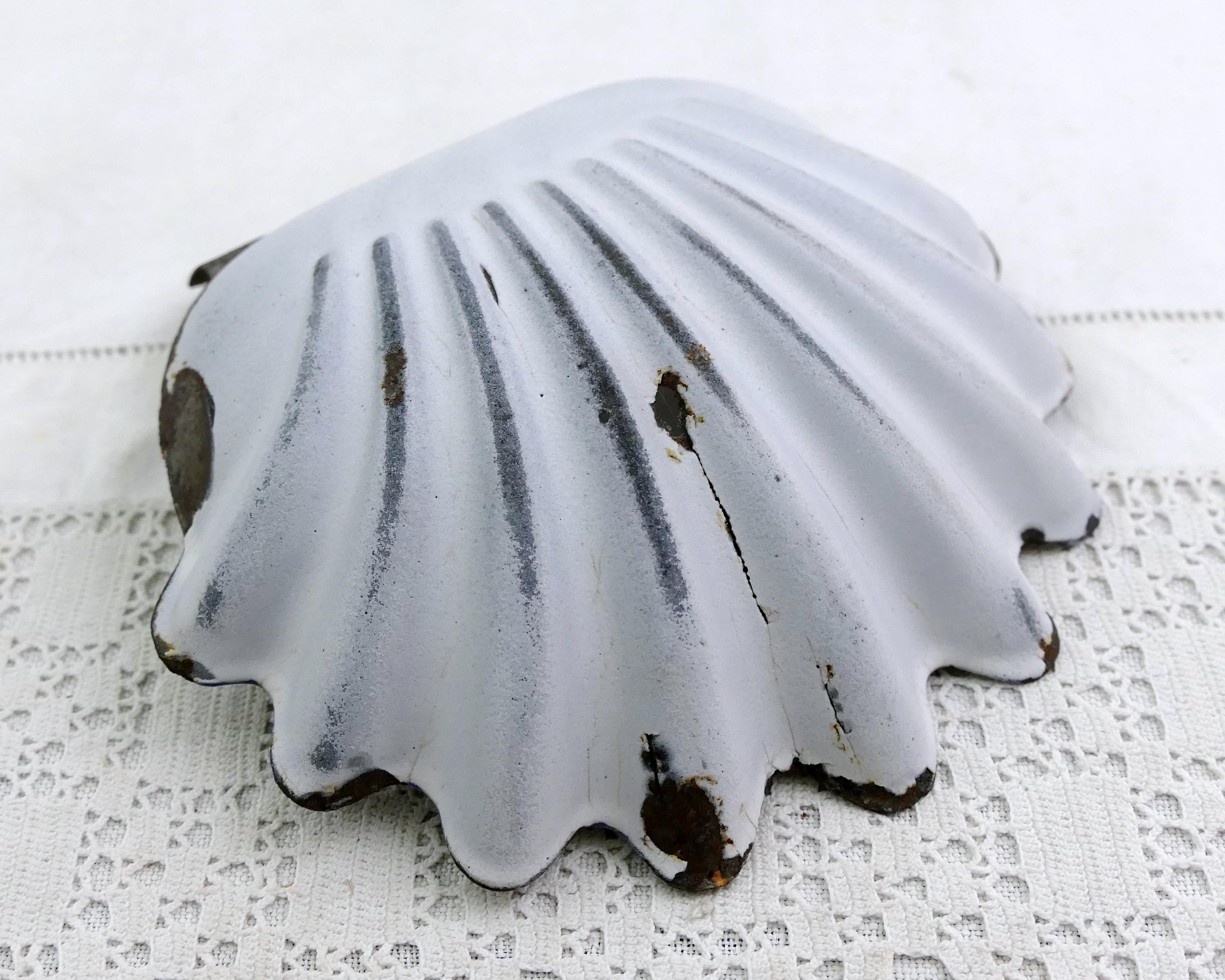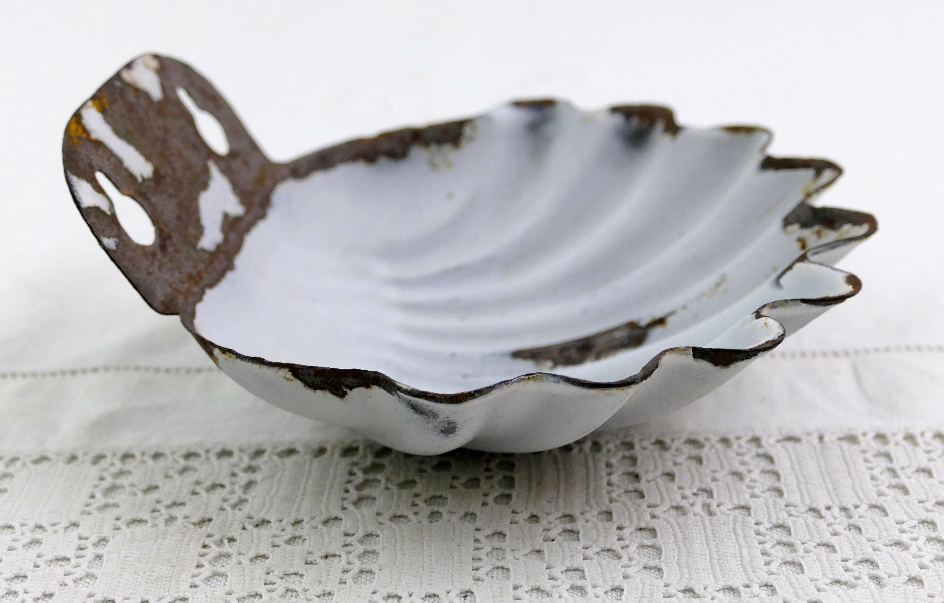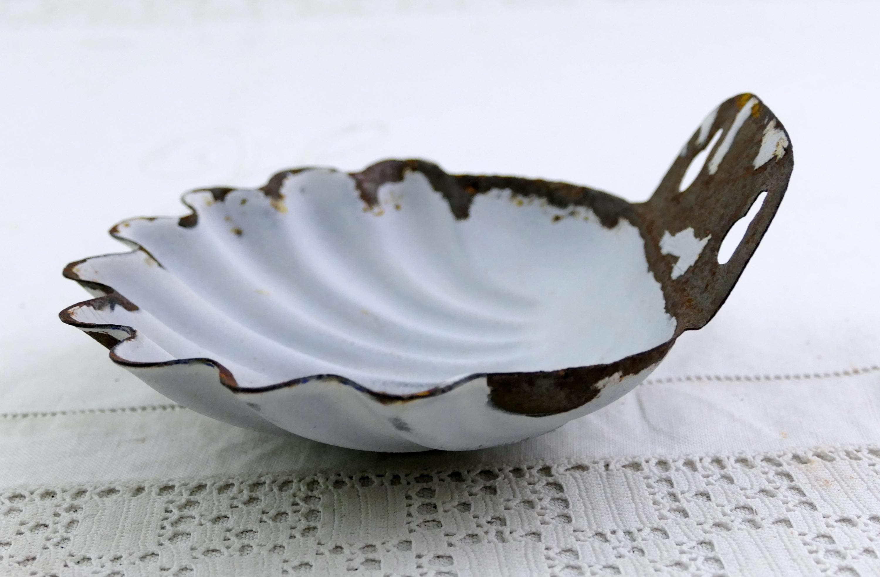 Antique French white enamel wall hanging / free standing soap dish, scalloped shell shaped. Made of white enameled metal. Ca late 1800s.