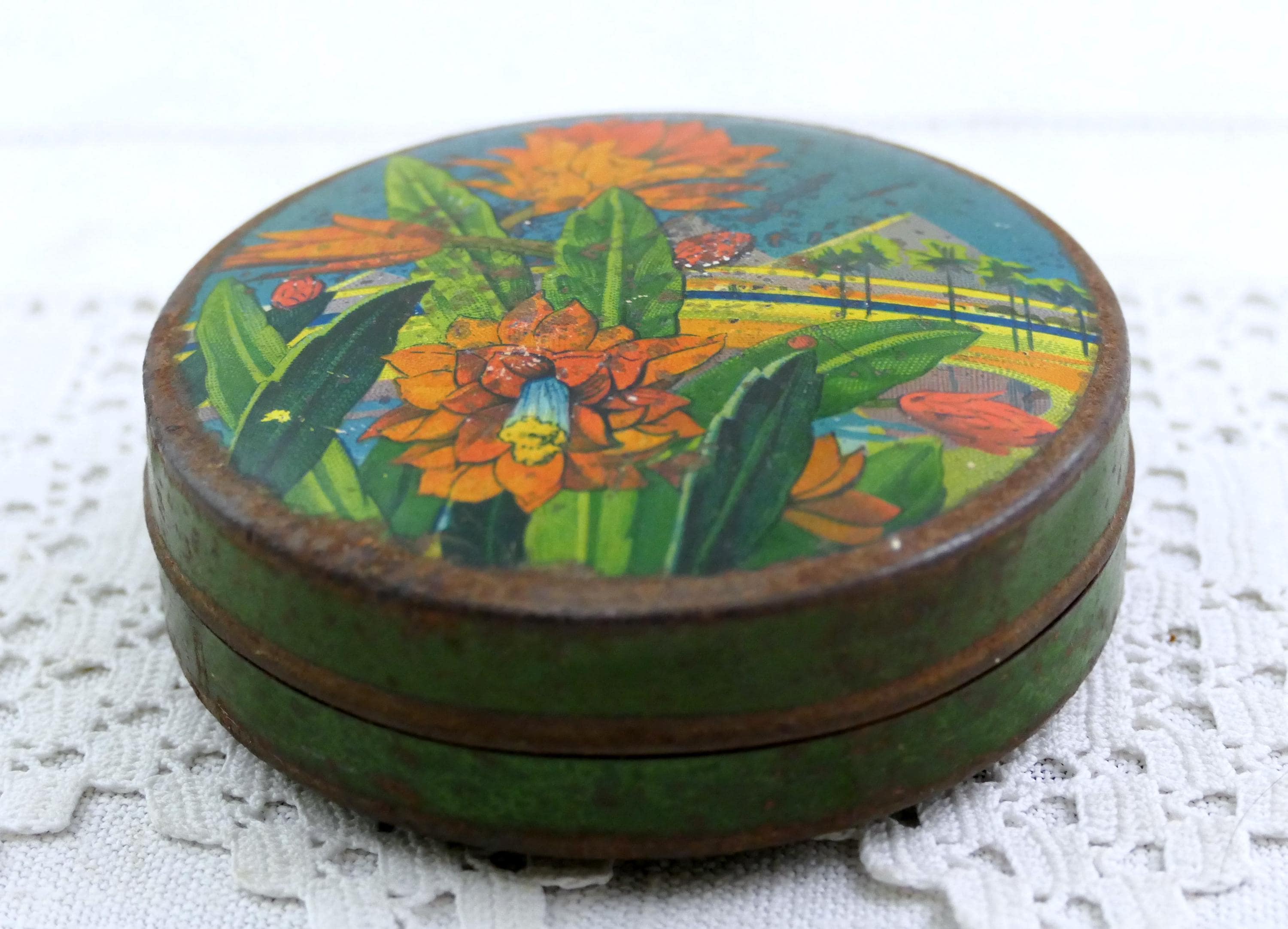 Antique French round tin with a Egyptian themed pattern. Made of lithographed metal. Ca early 1900s.