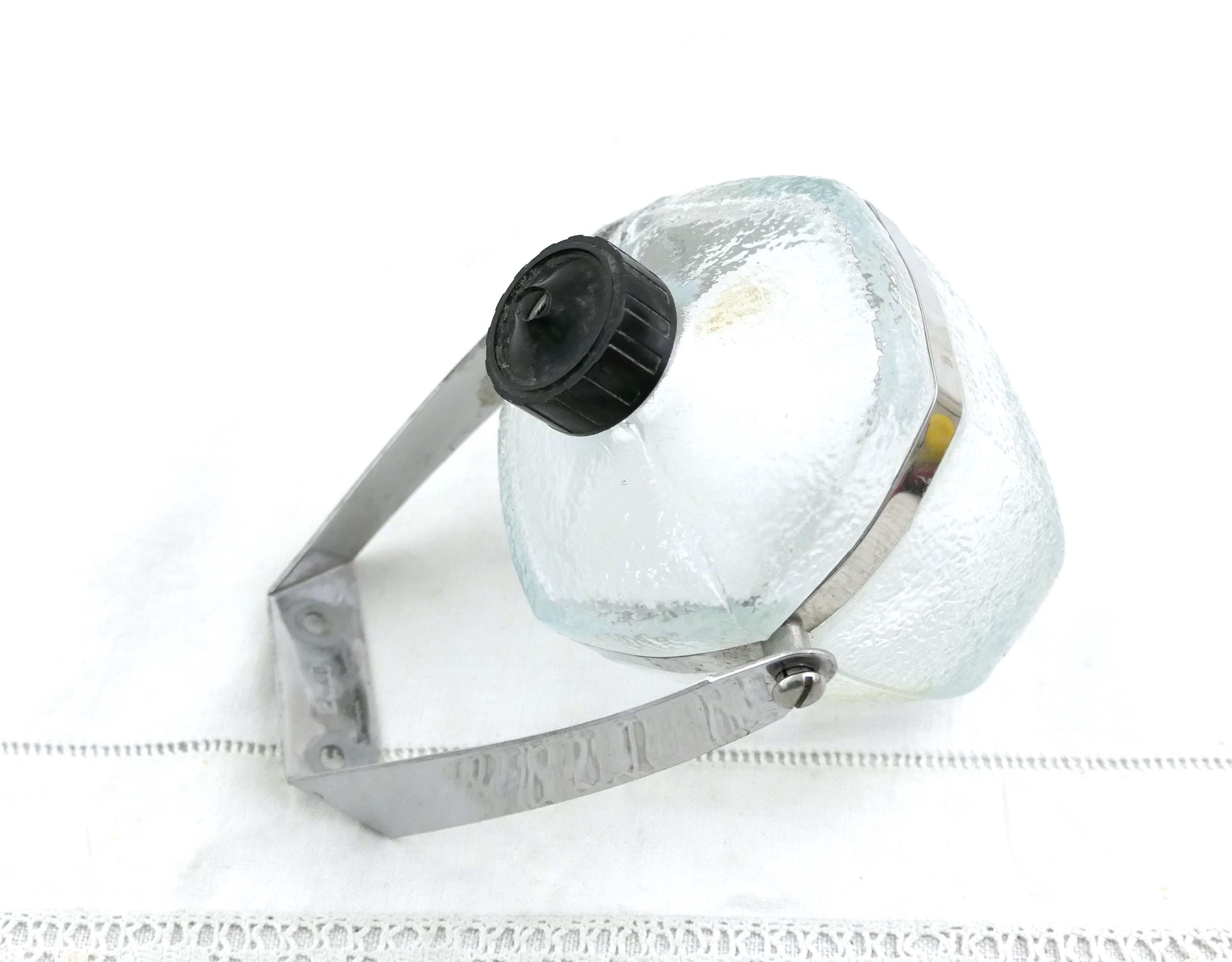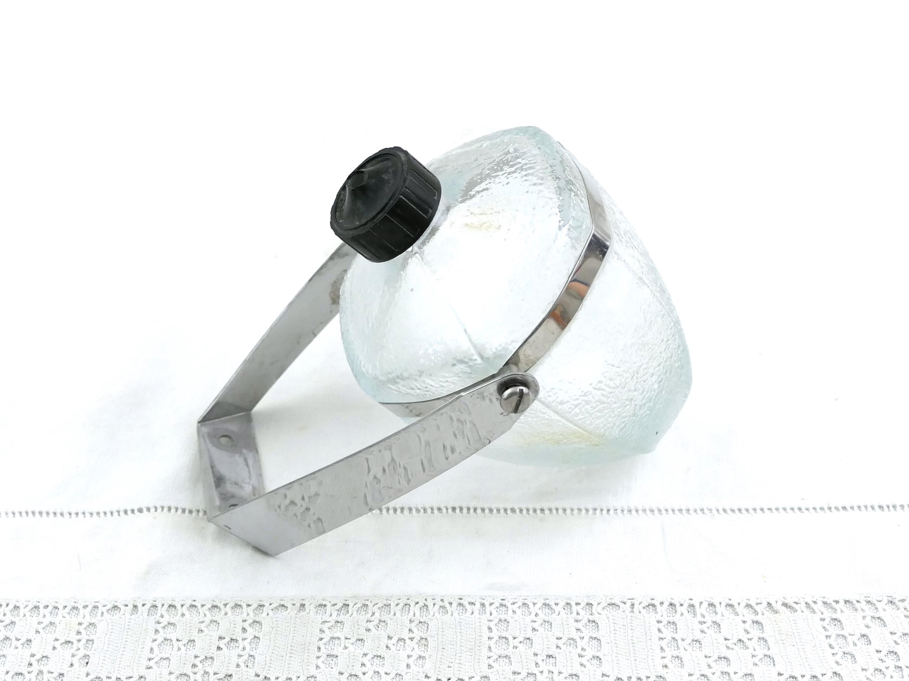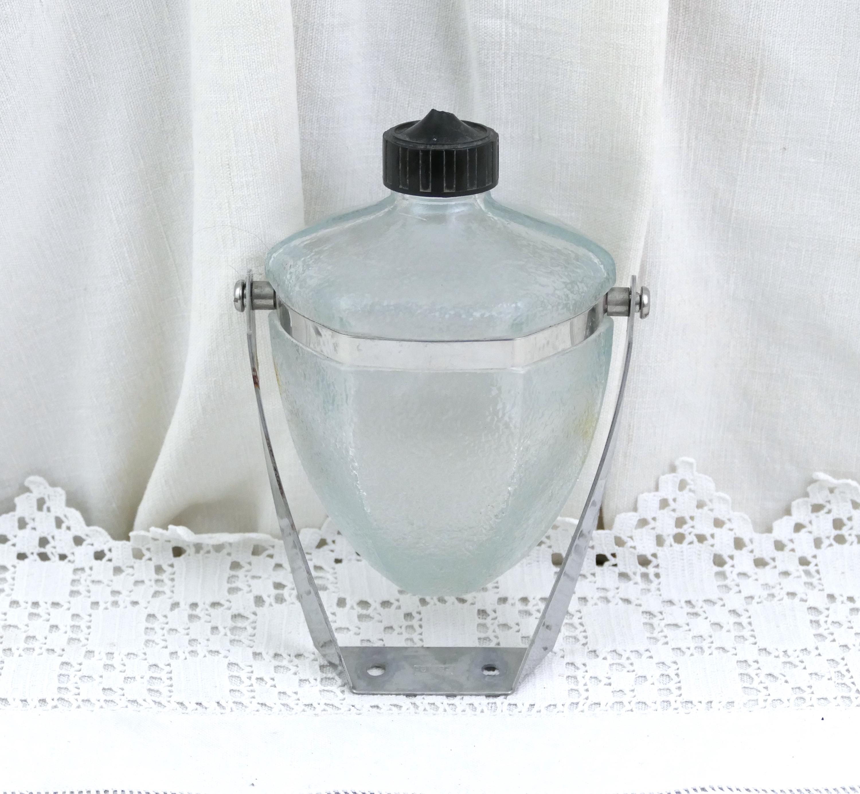 Vintage French wall mounted pivoting liquid soap dispenser. Made of clear glass with metal mount. Ca mid 1900s.