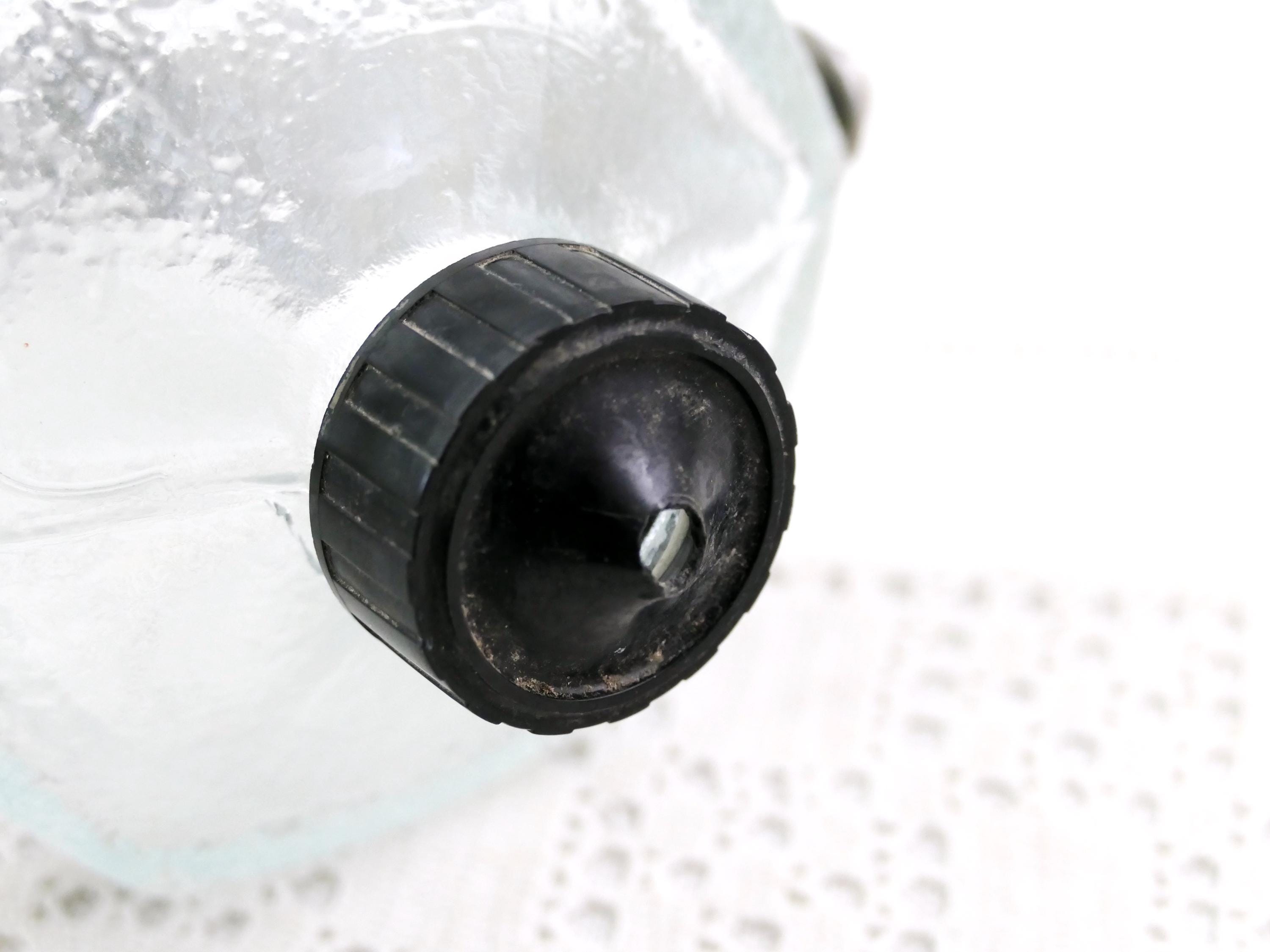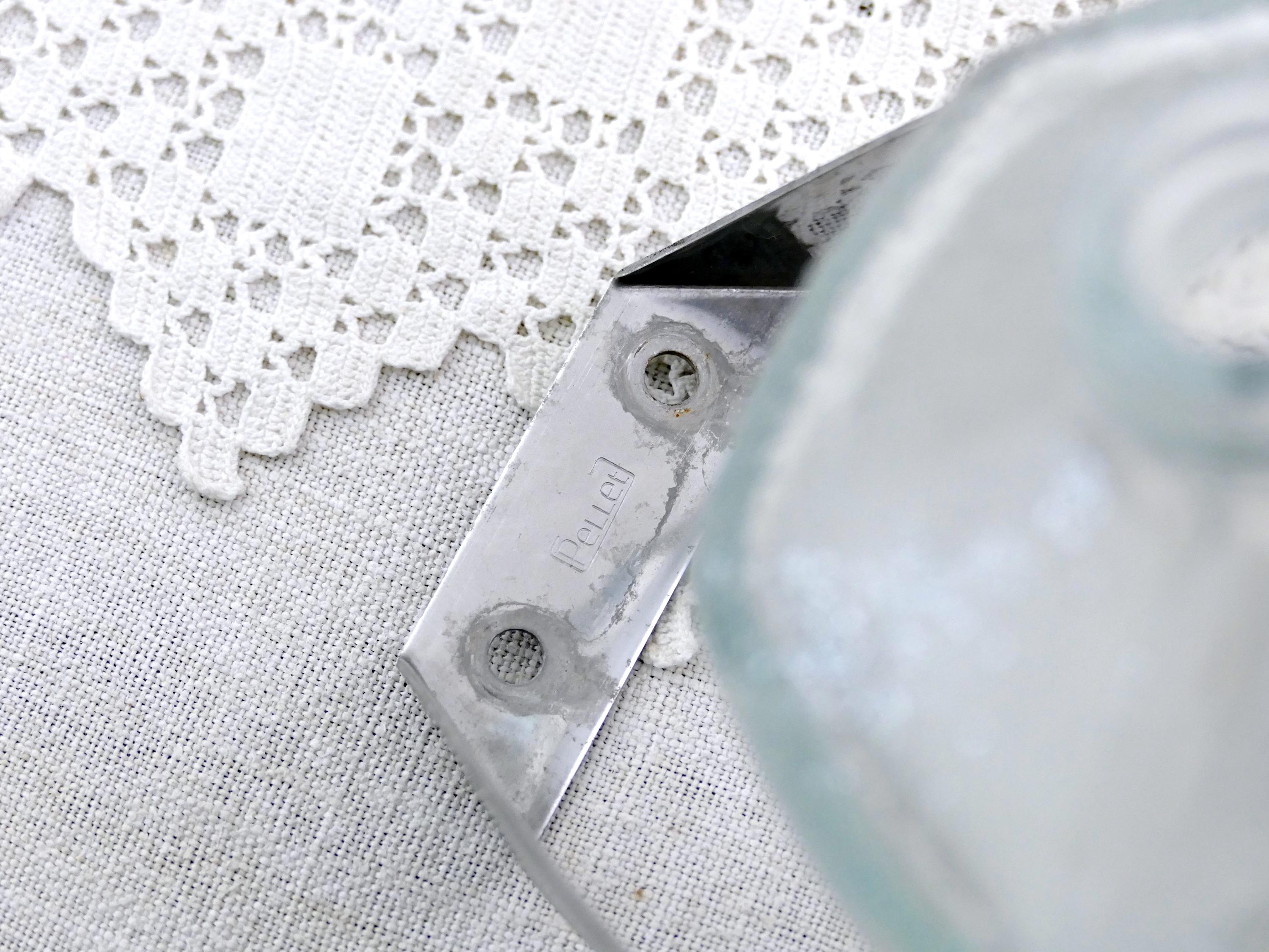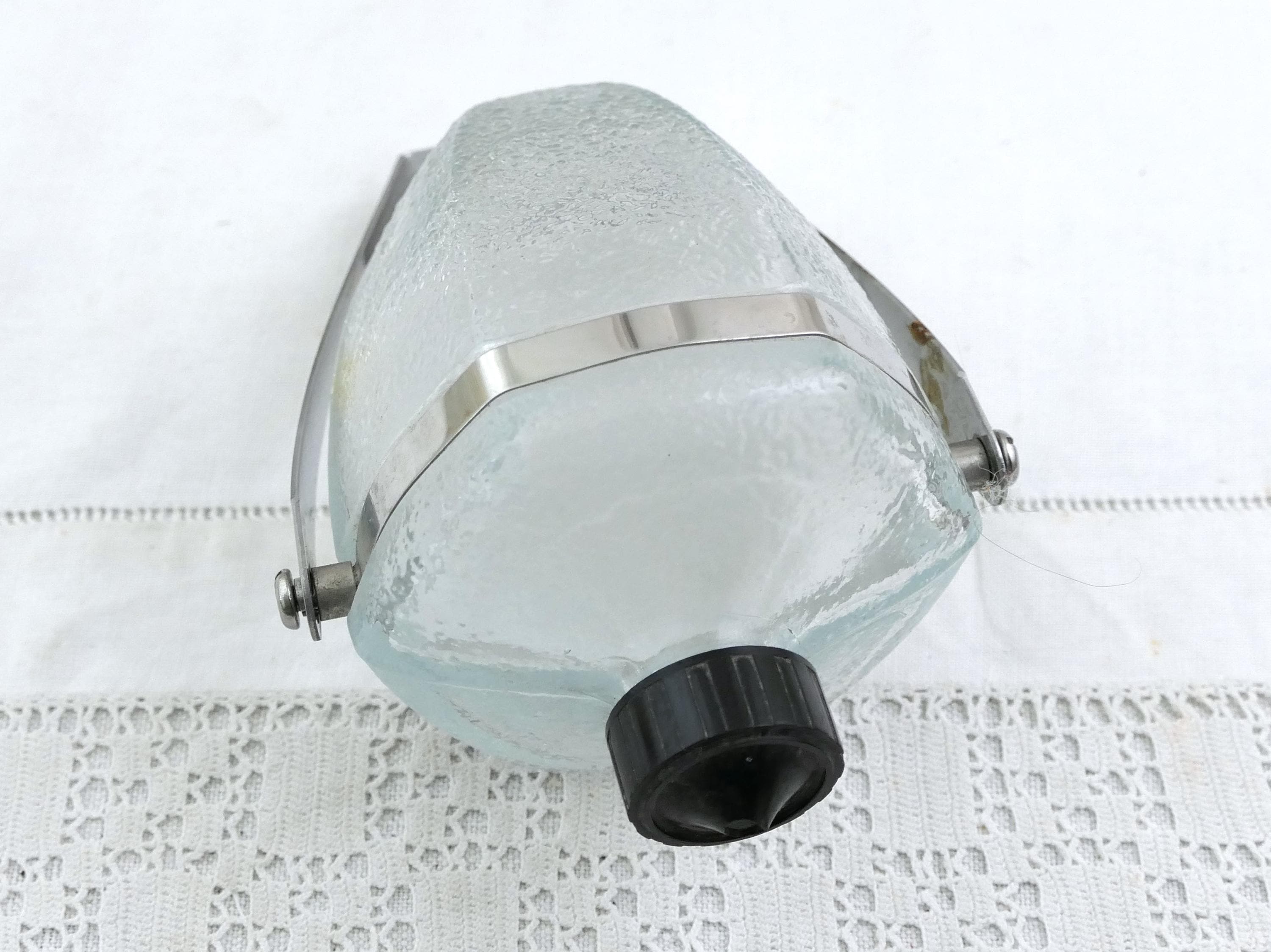 Vintage French wall mounted pivoting liquid soap dispenser. Made of clear glass with metal mount. Ca mid 1900s.