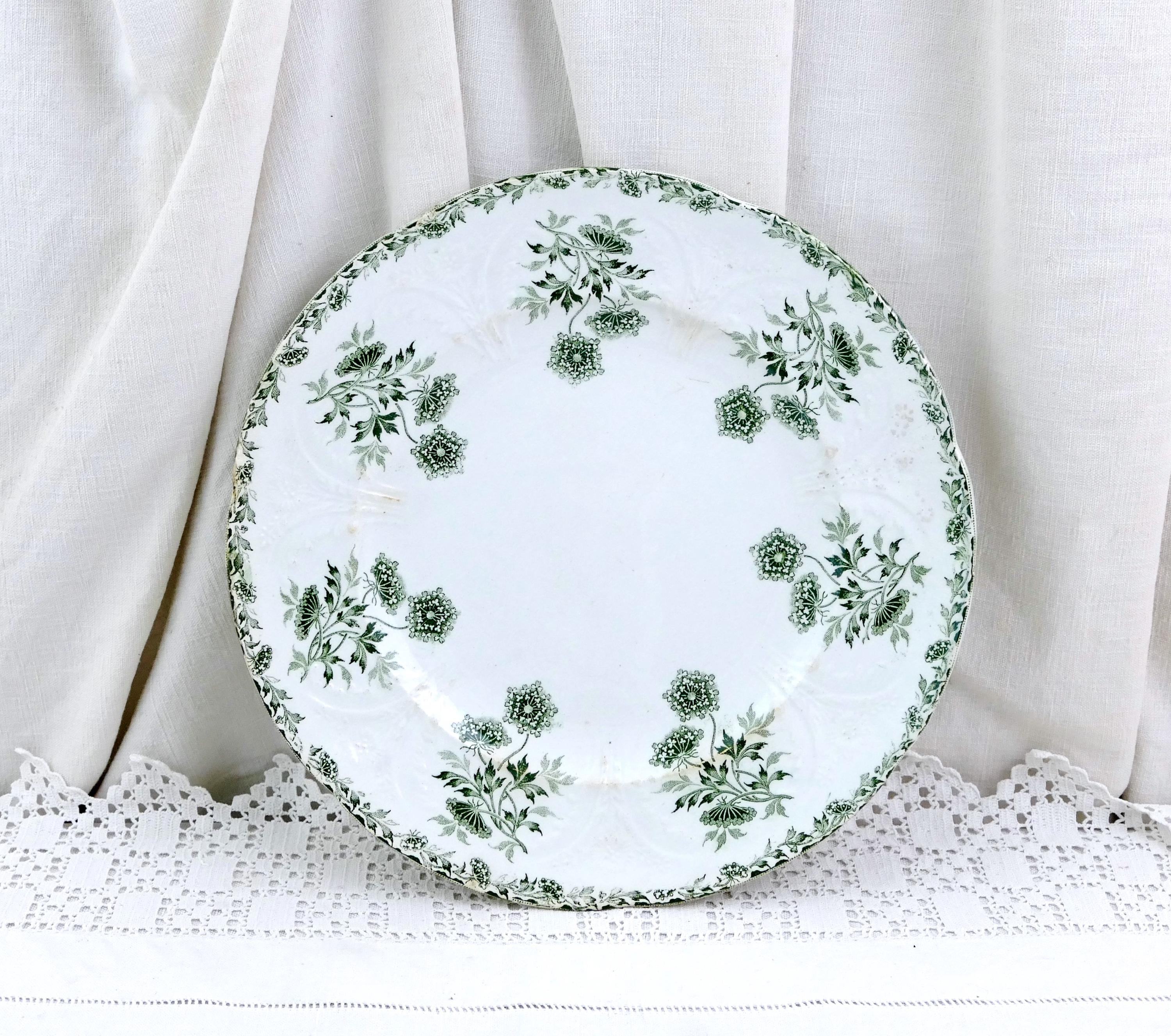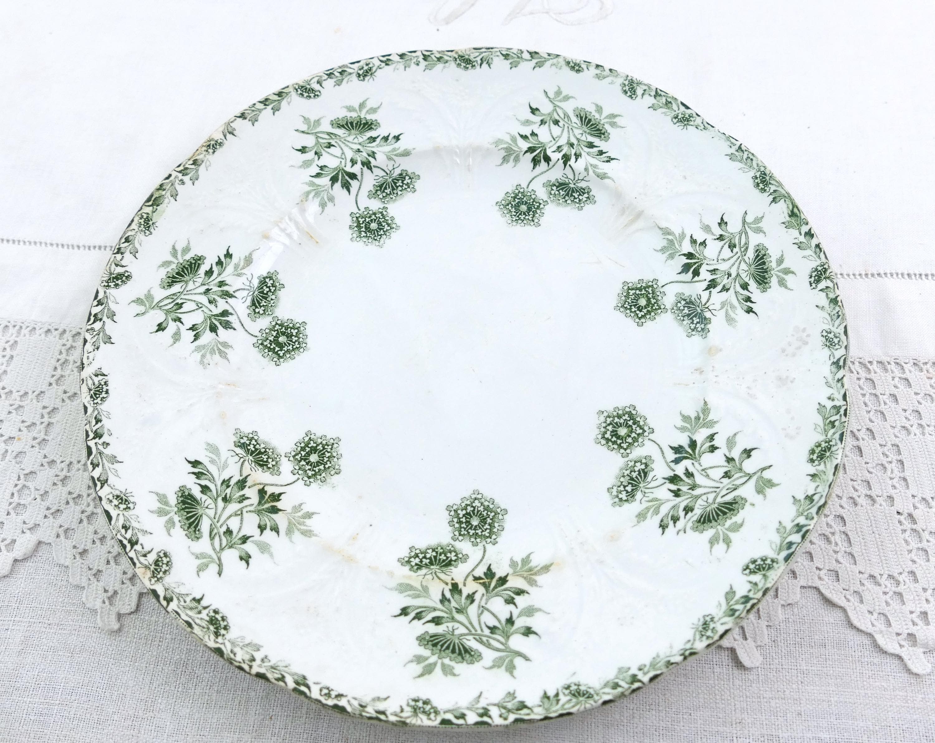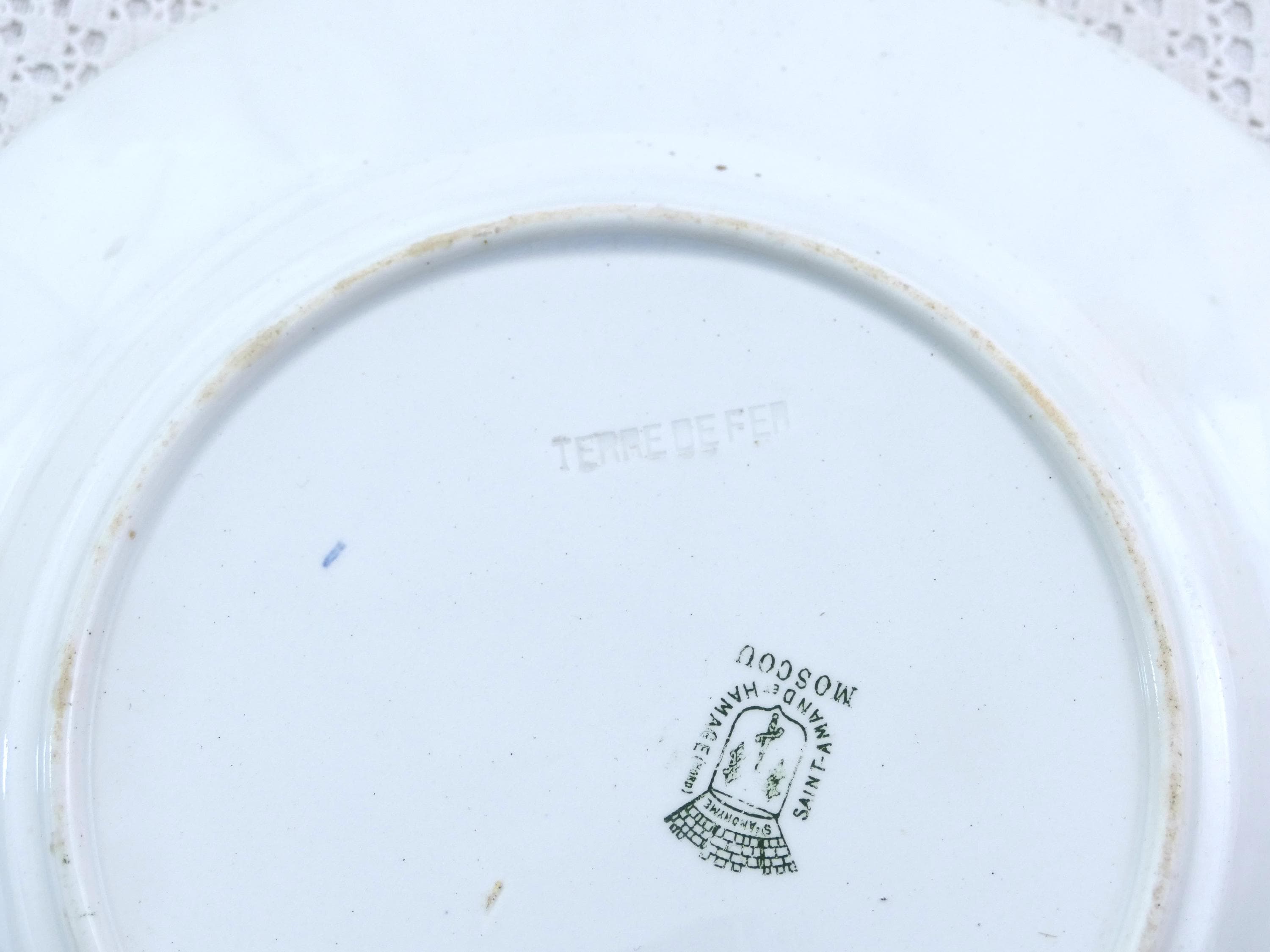 Antique French plate with Art Nouveau teal blue flower pattern. Made by Saint Amand of ironstone pottery with white glaze and teal blue motif ceramic. Ca mid to late 1800s.