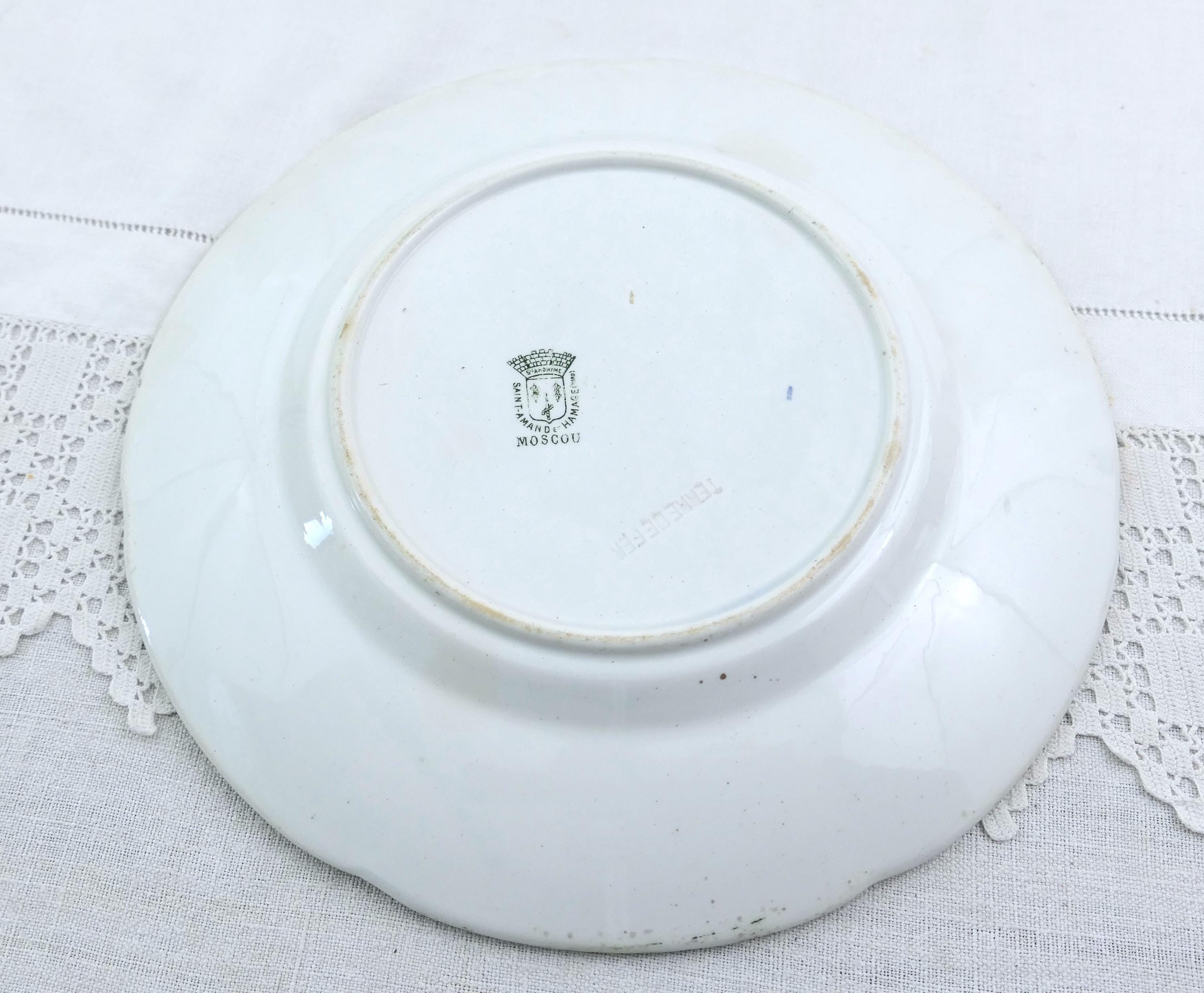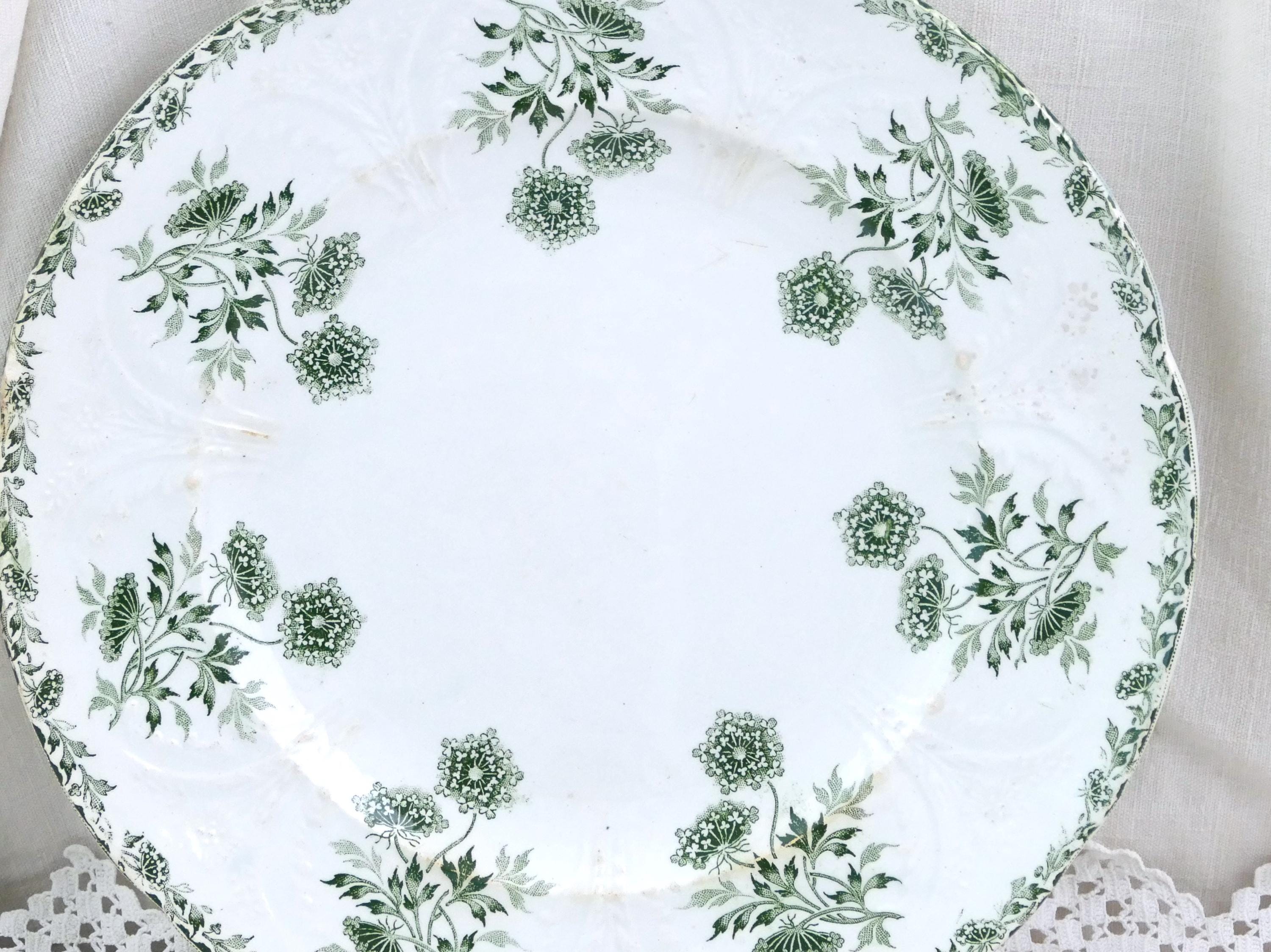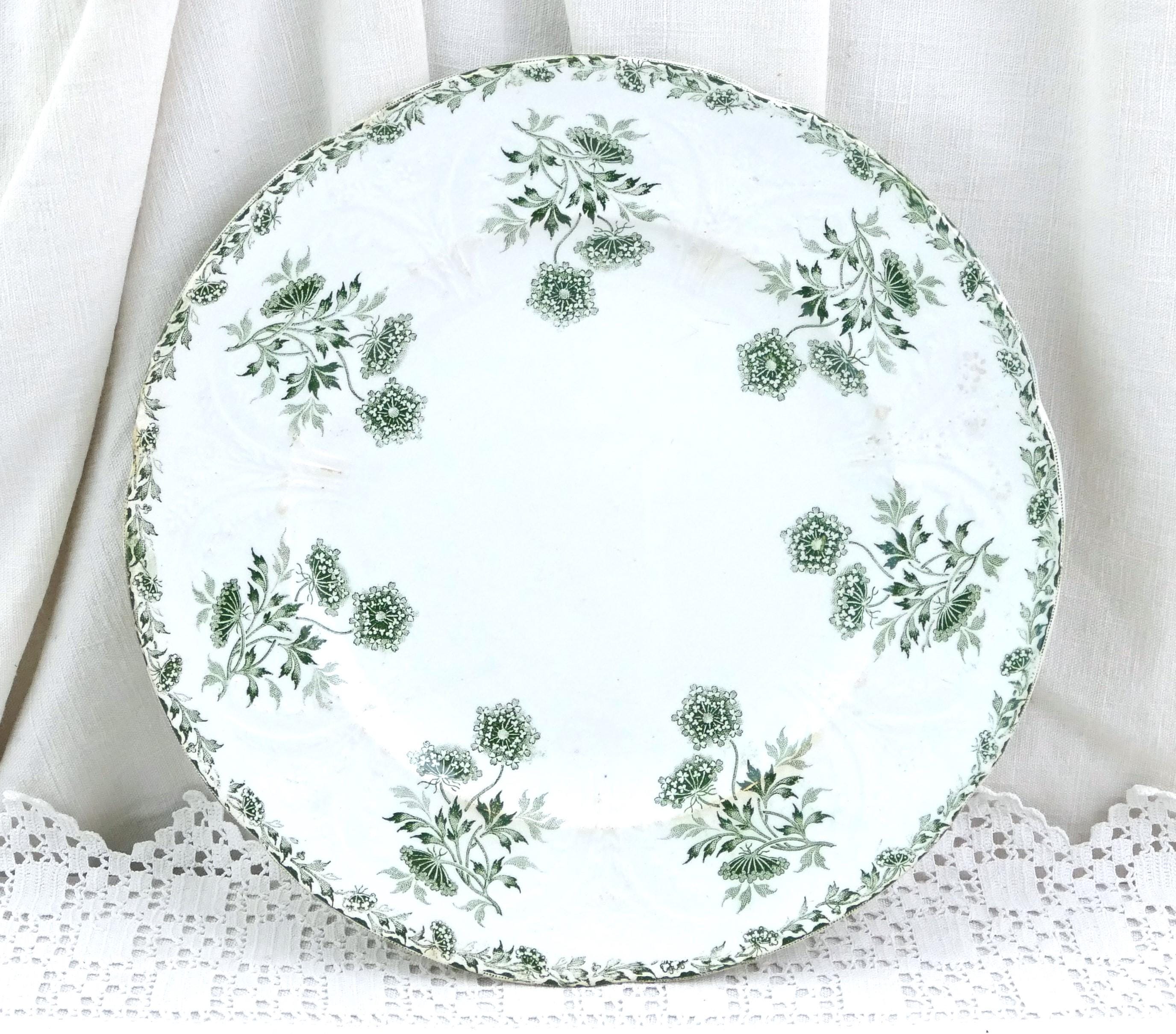 Antique French plate with Art Nouveau teal blue flower pattern. Made by Saint Amand of ironstone pottery with white glaze and teal blue motif ceramic. Ca mid to late 1800s.