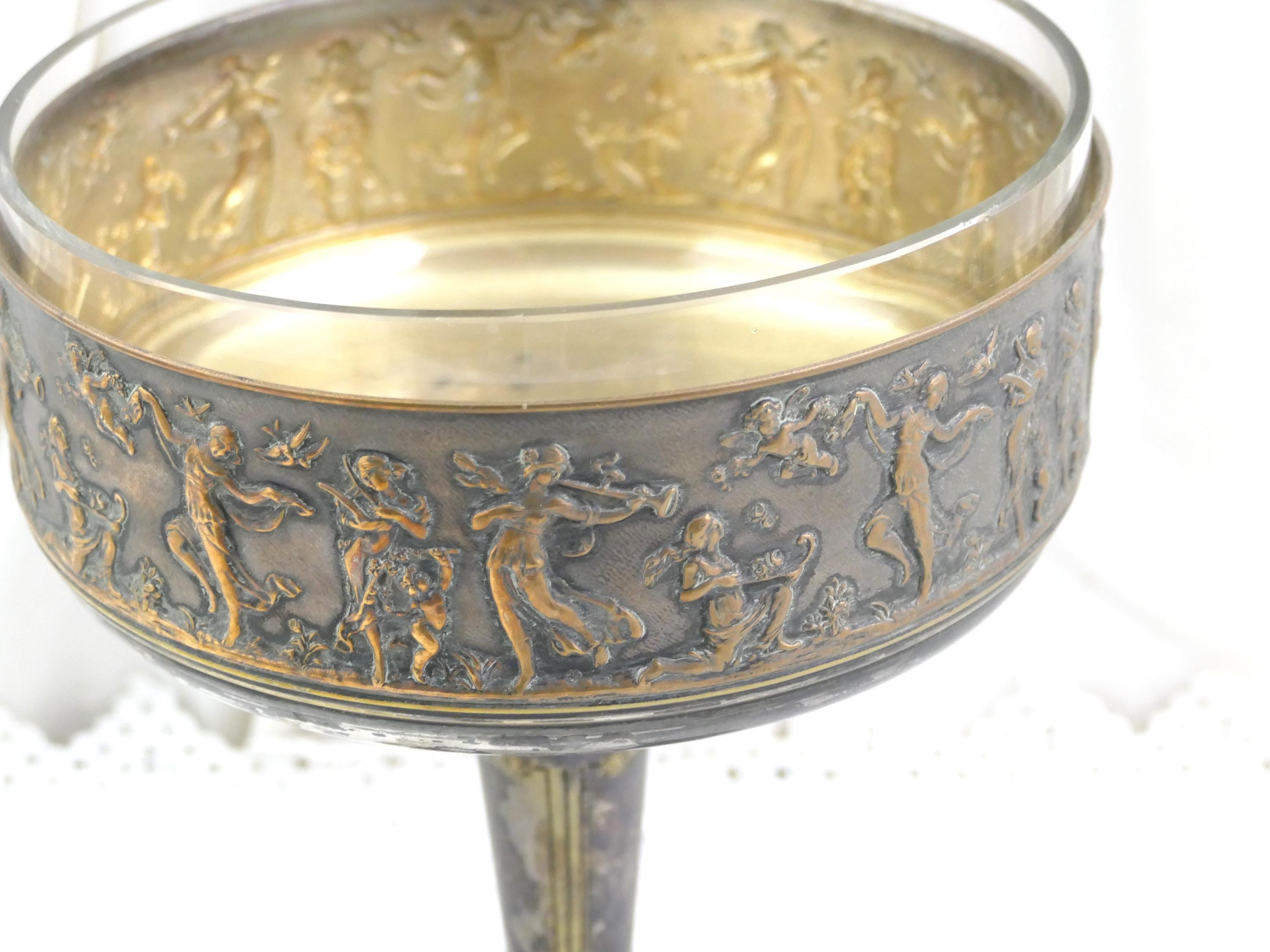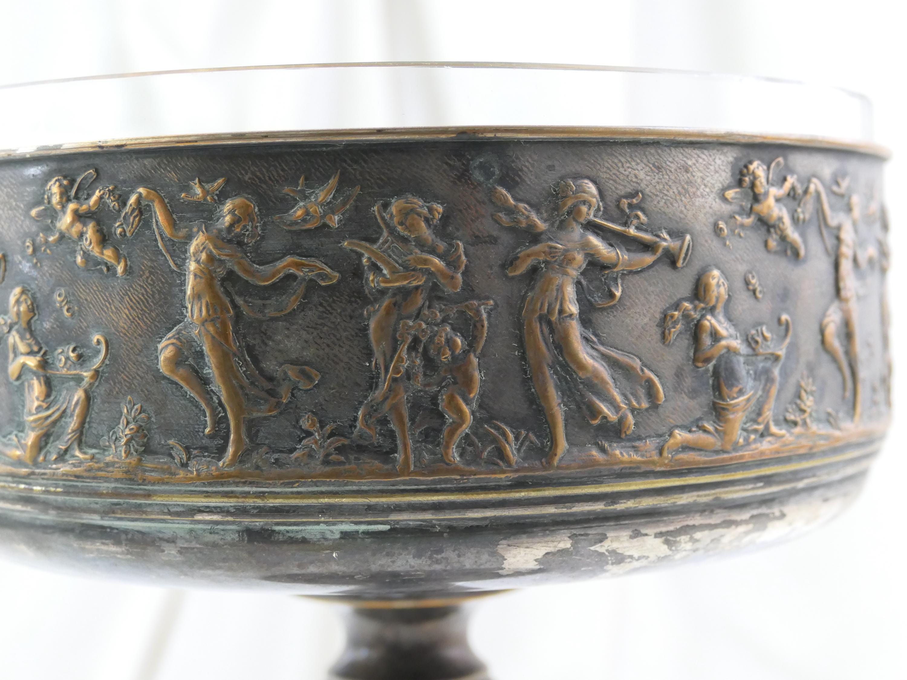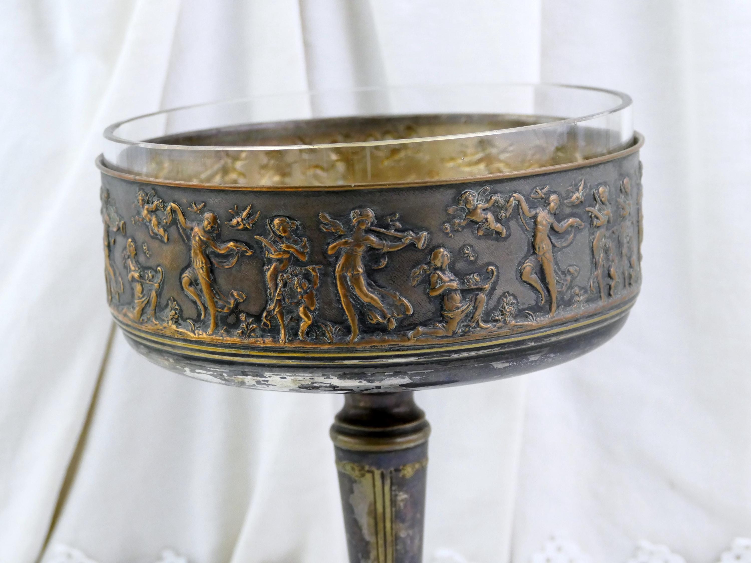 Antique French pedestal fruit dish with classical scene. Made of silver plated metal with removable glass lining. Ca 1800s.