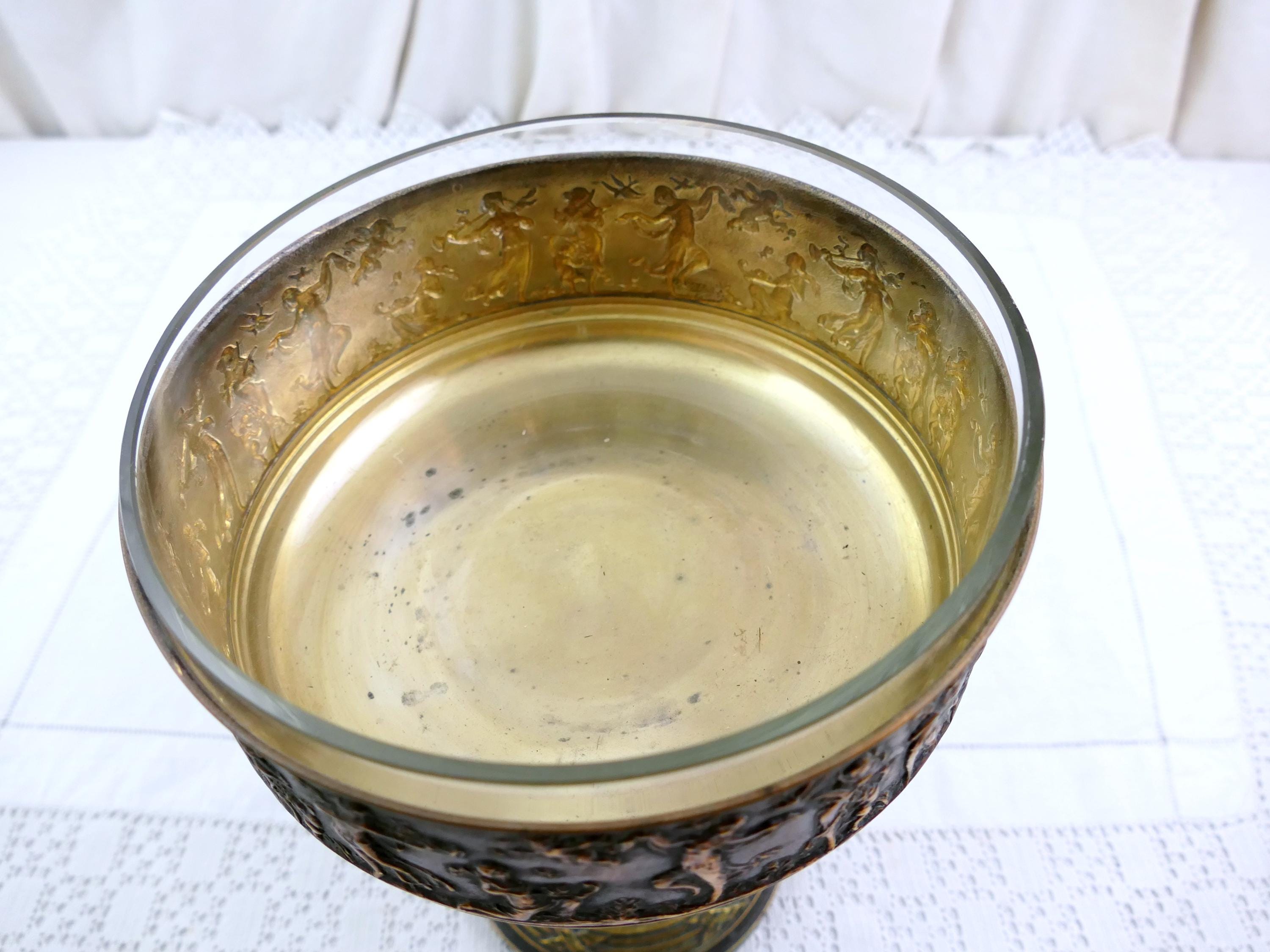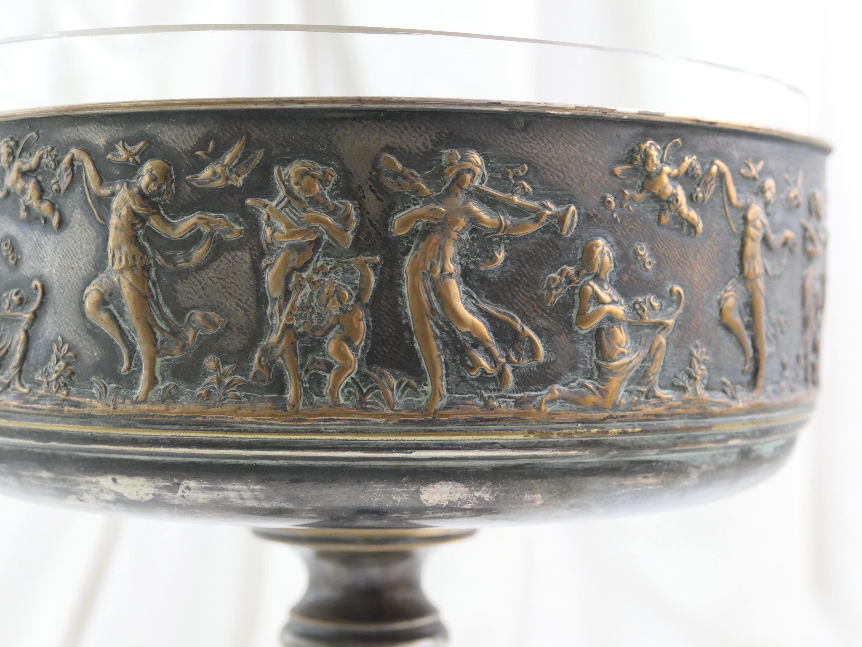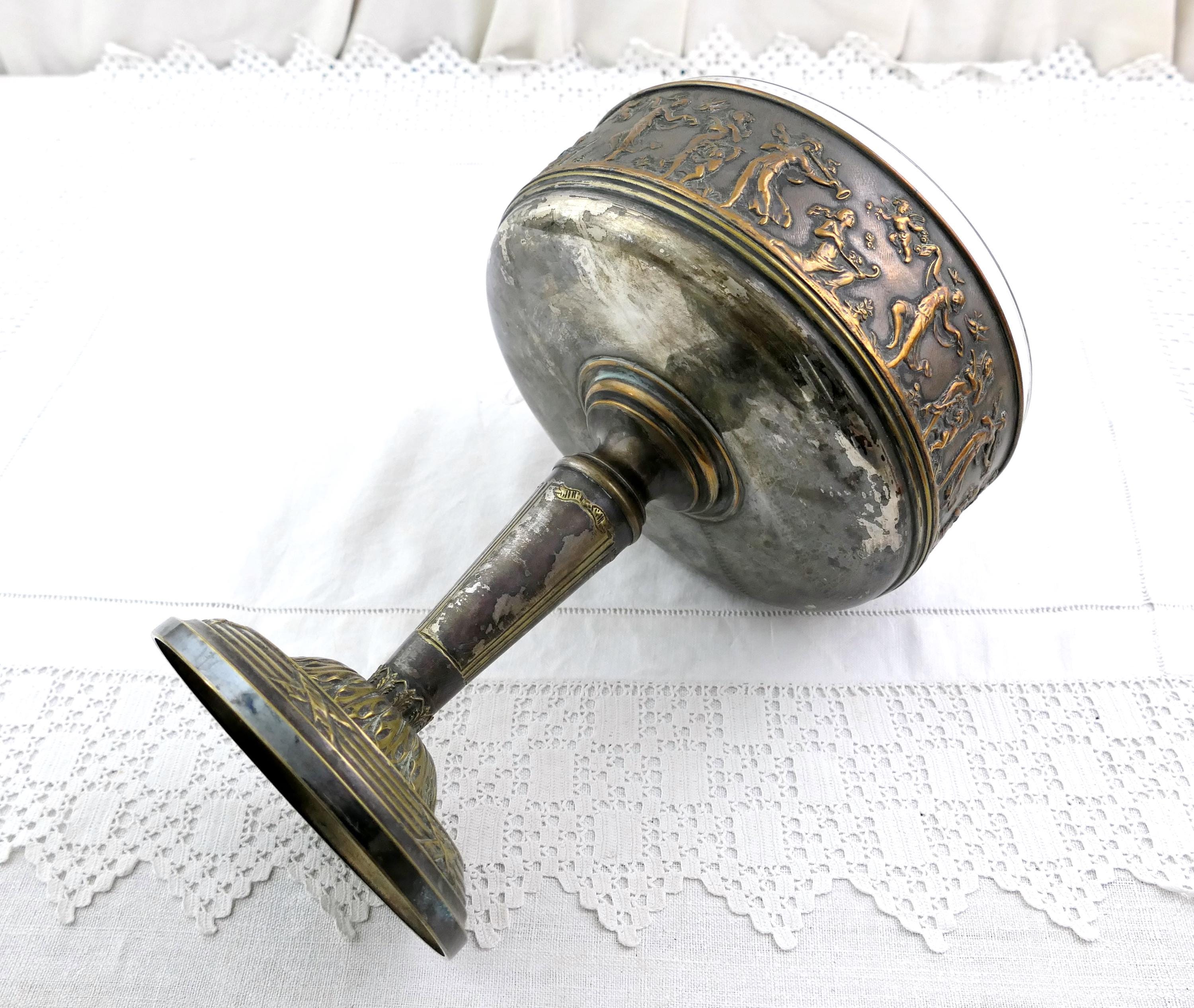 Antique French pedestal fruit dish with classical scene. Made of silver plated metal with removable glass lining. Ca 1800s.