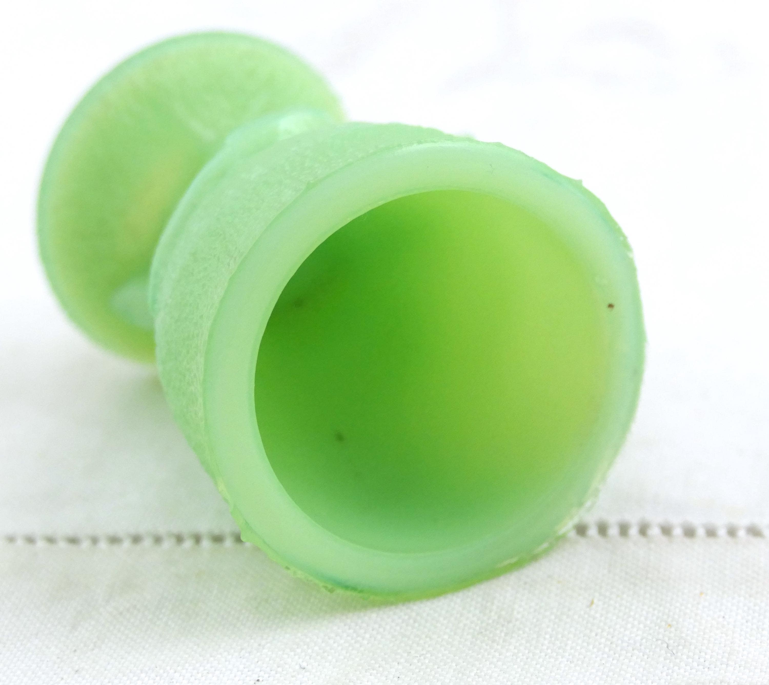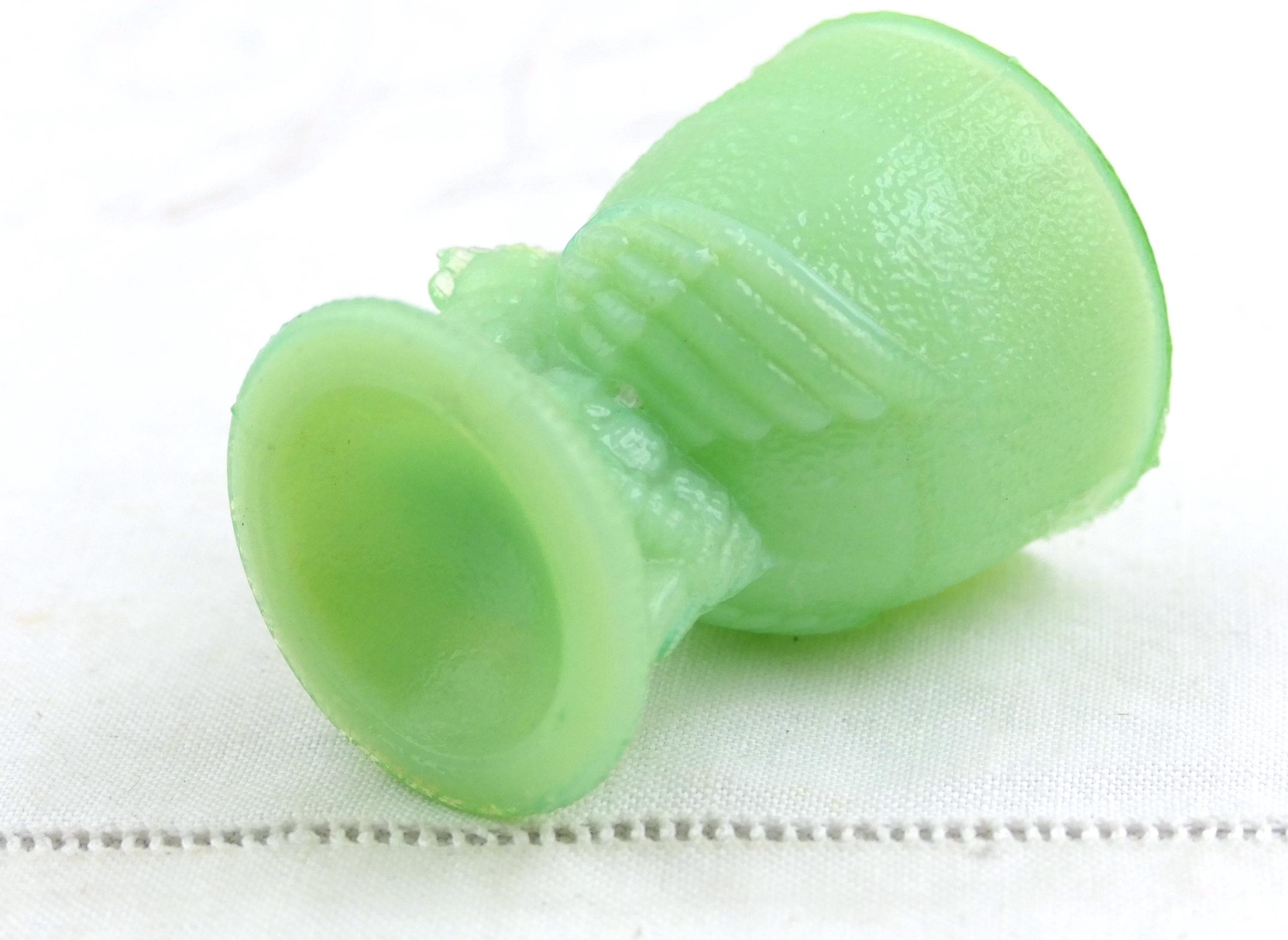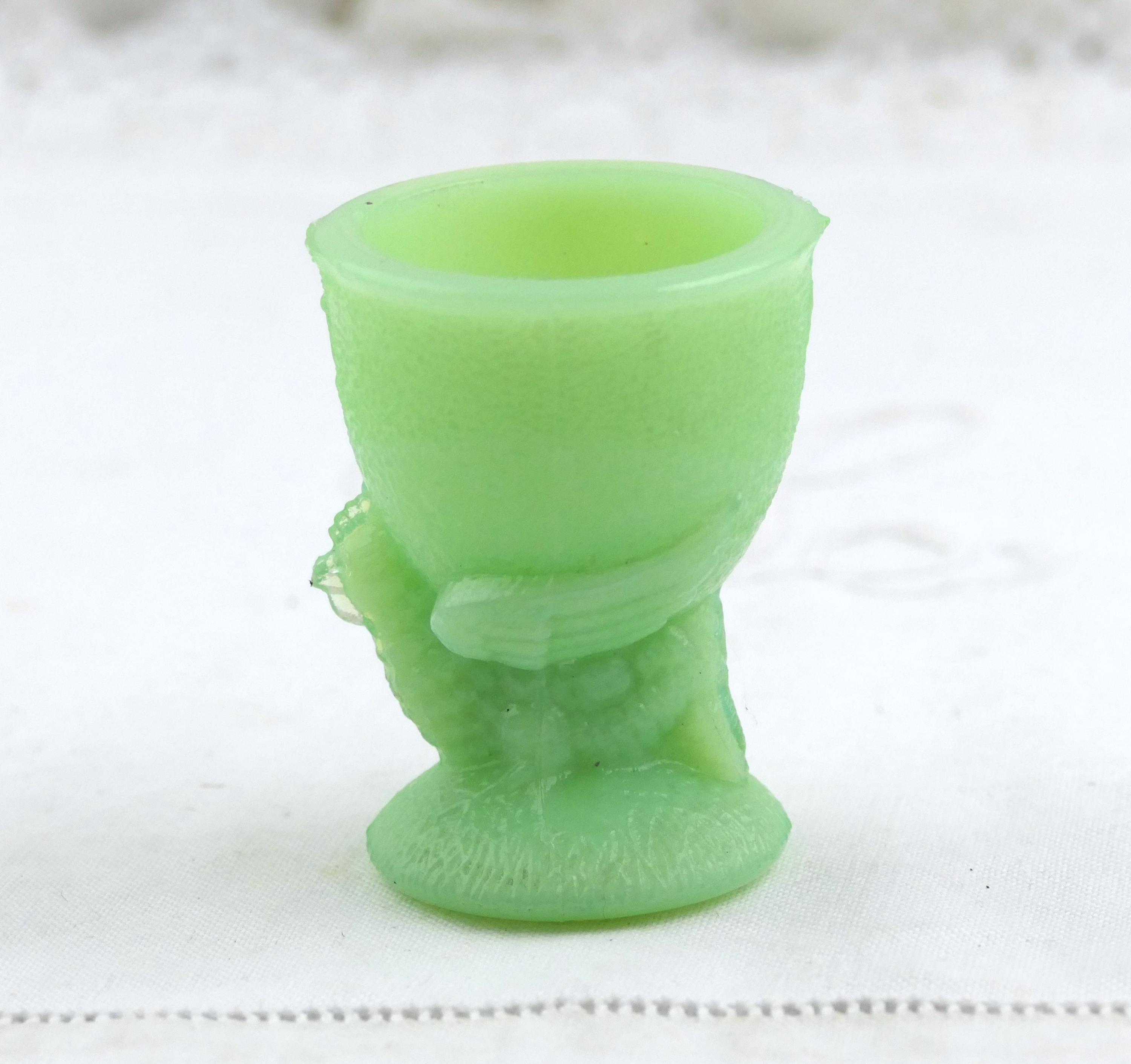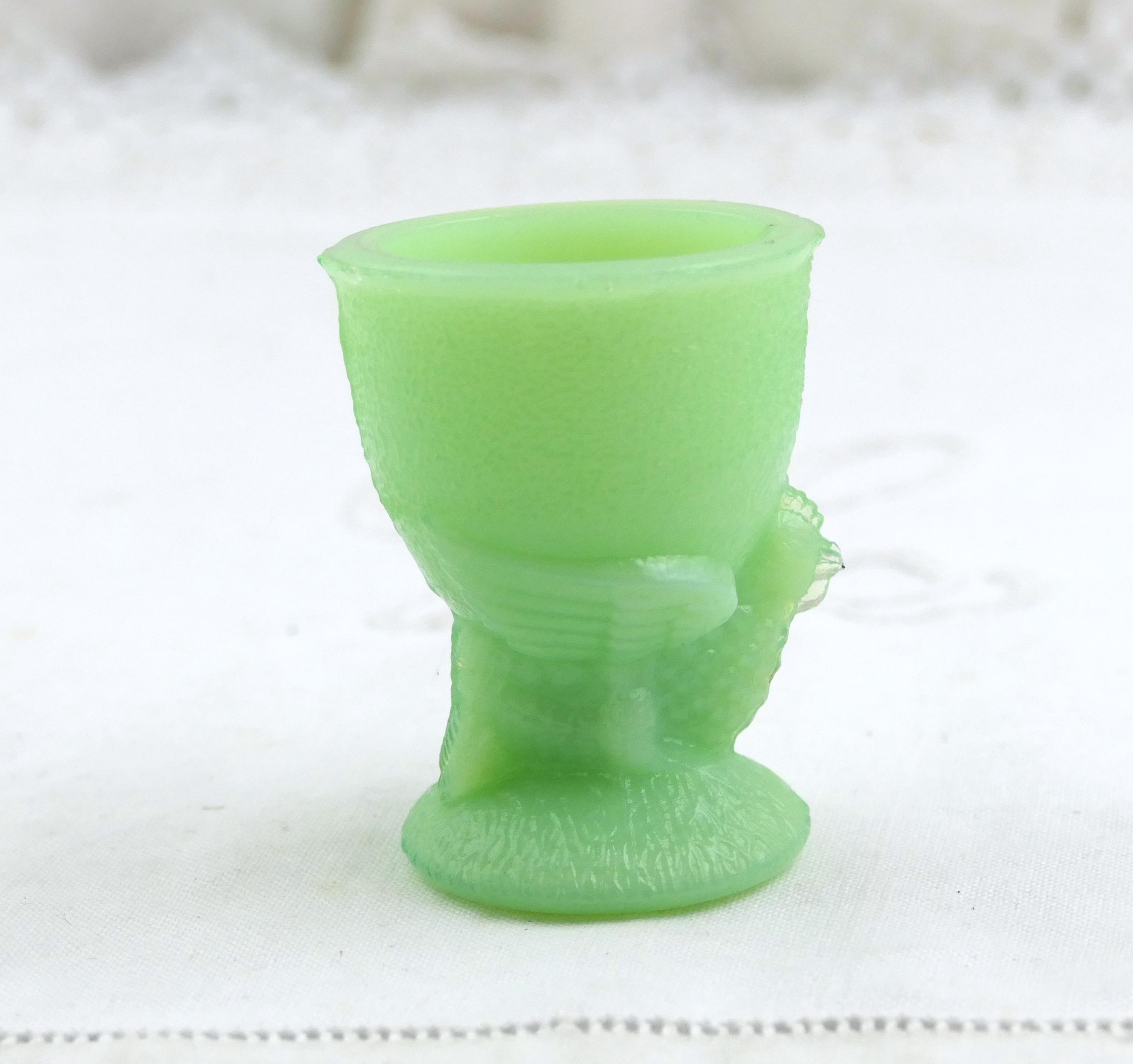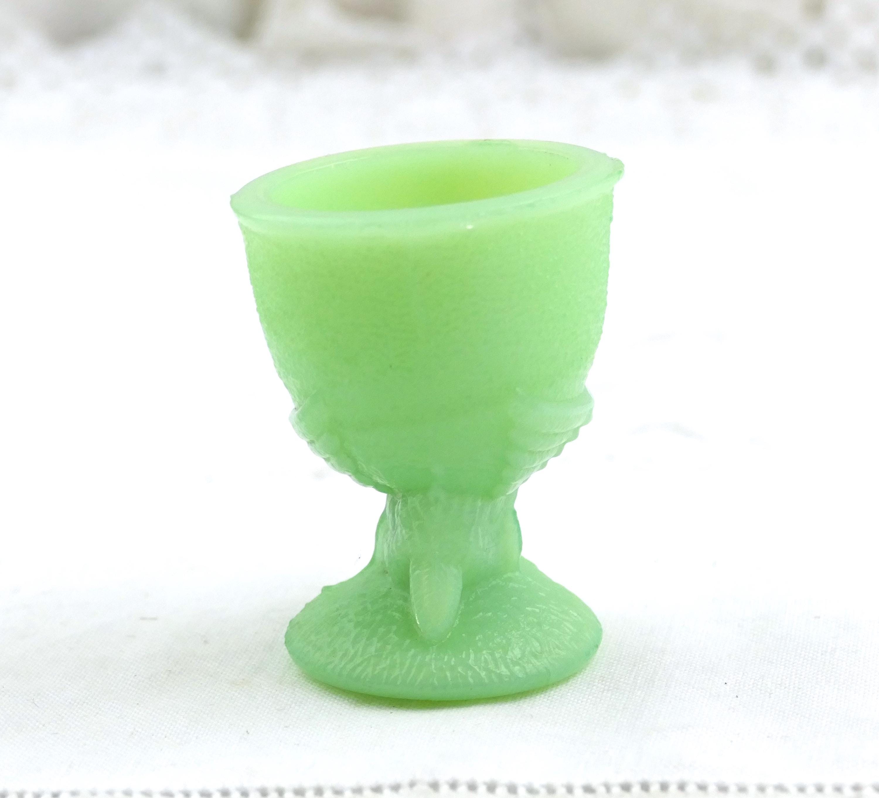 Vintage French uranium jadeite glass chicken shaped eggcup. Made of mint green uranium vaseline milk glass. Ca 1930s- 1950s.