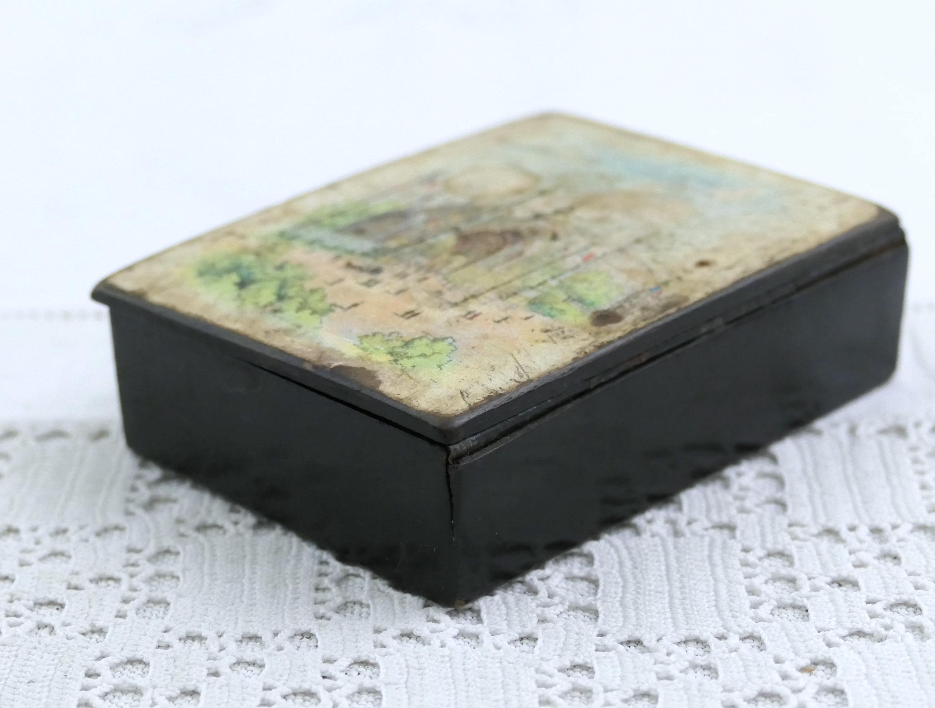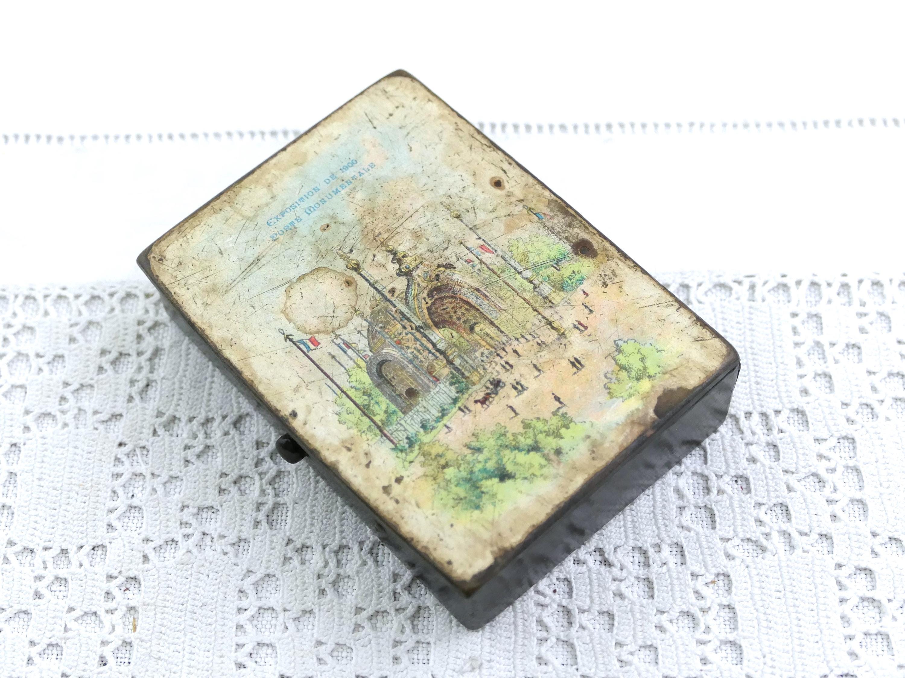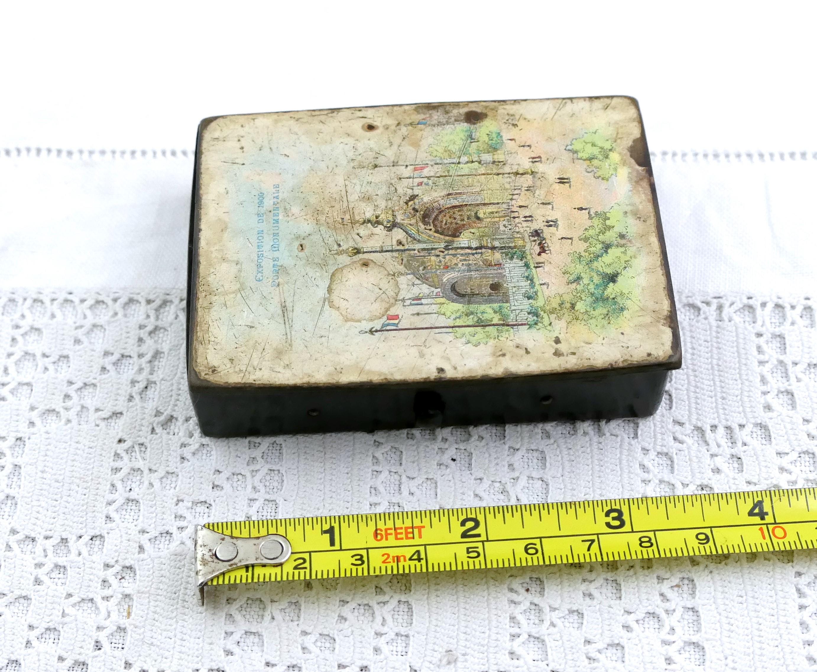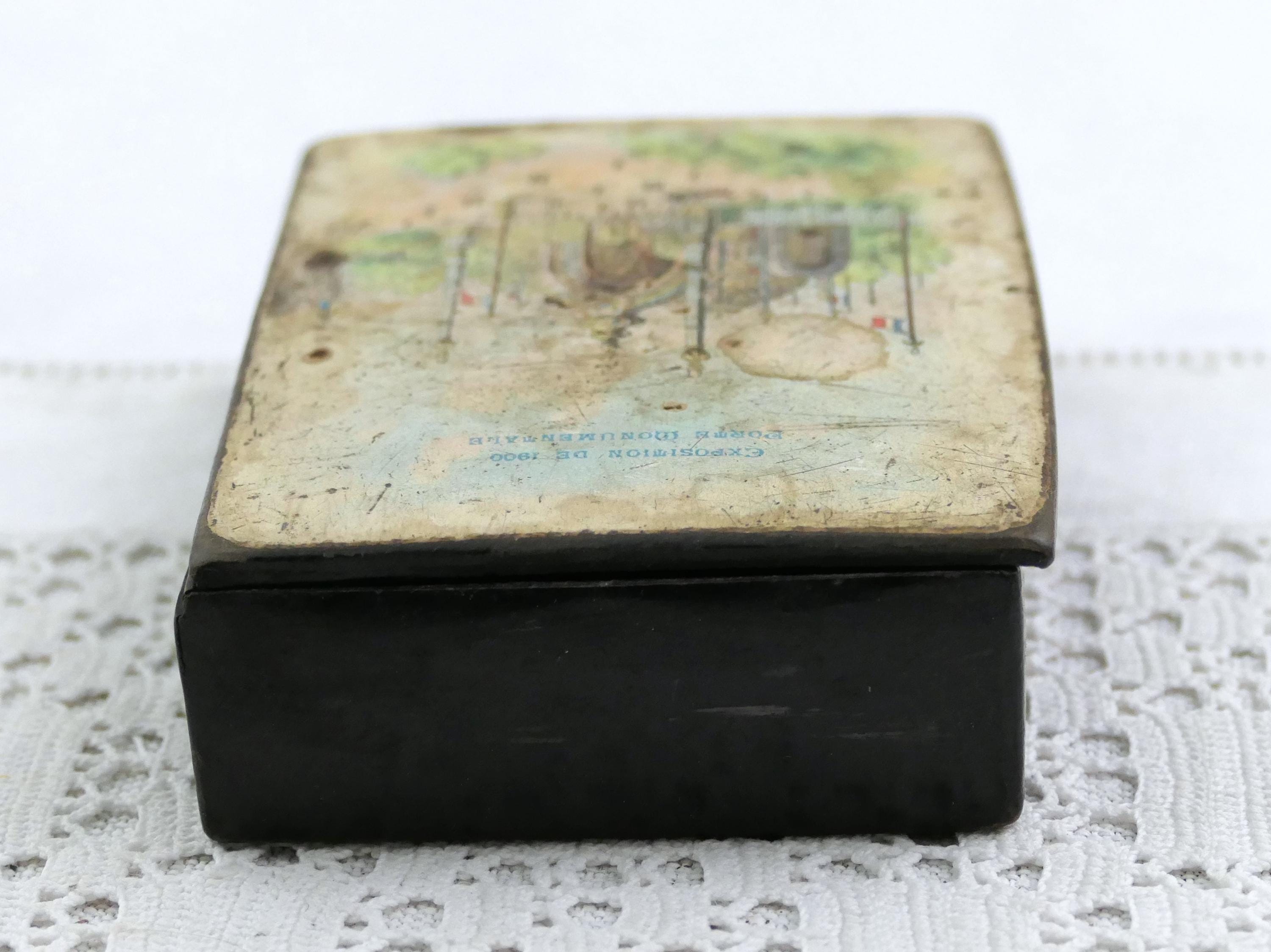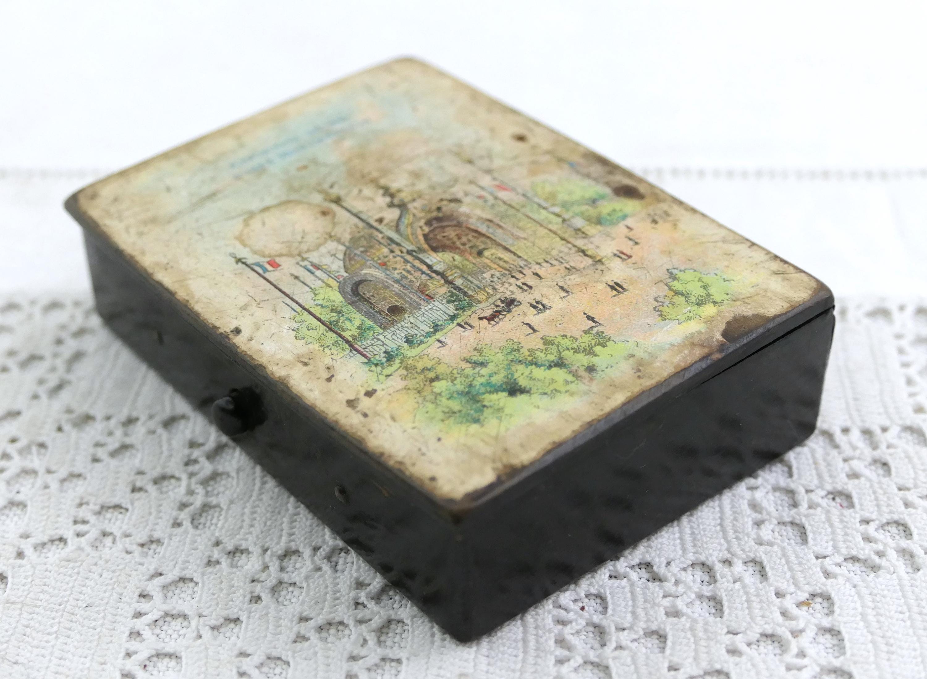 Small Antique French box with image if a building from the 1900 Paris Exhibition. Made of black lacquered wood. Ca late 1800s.
