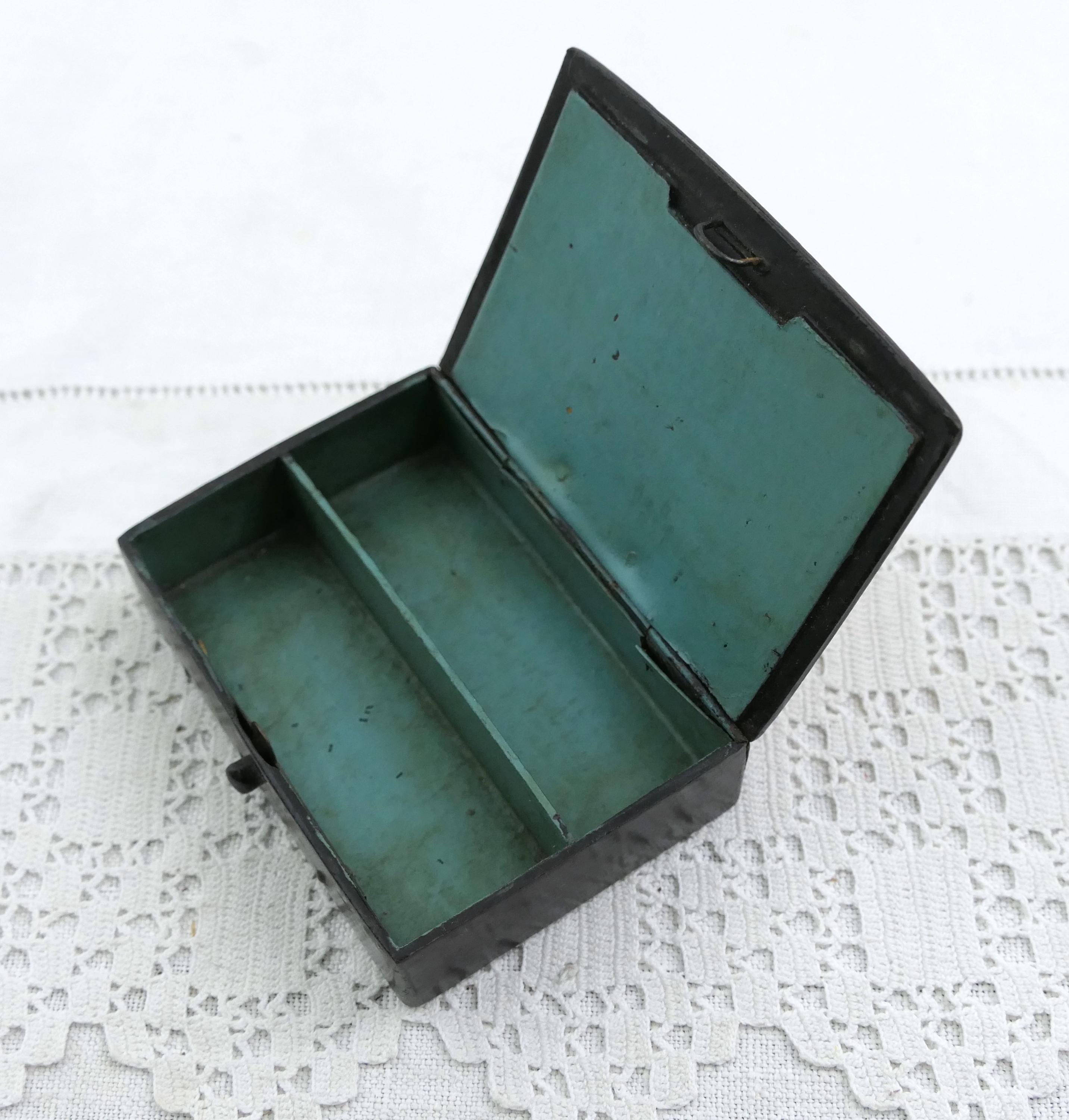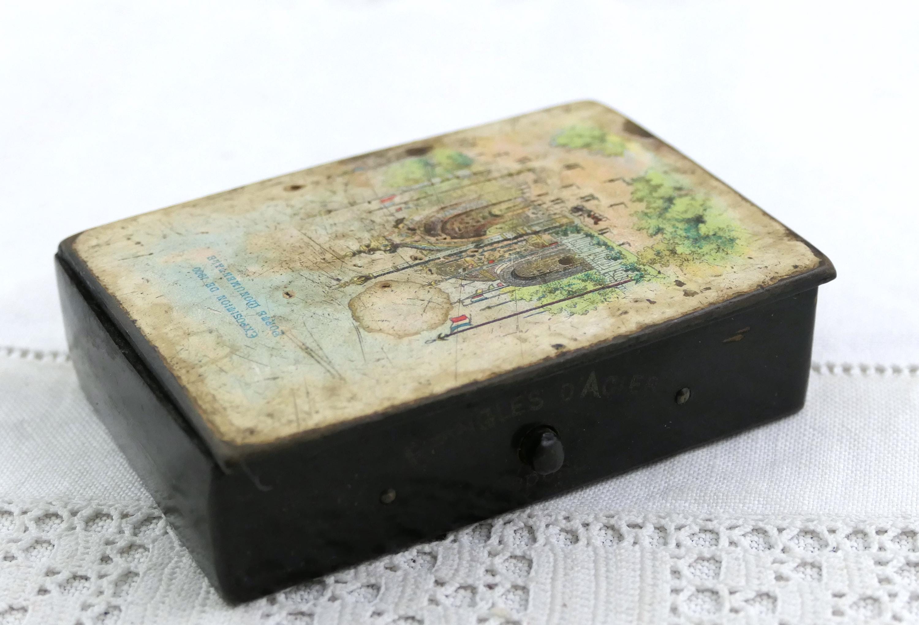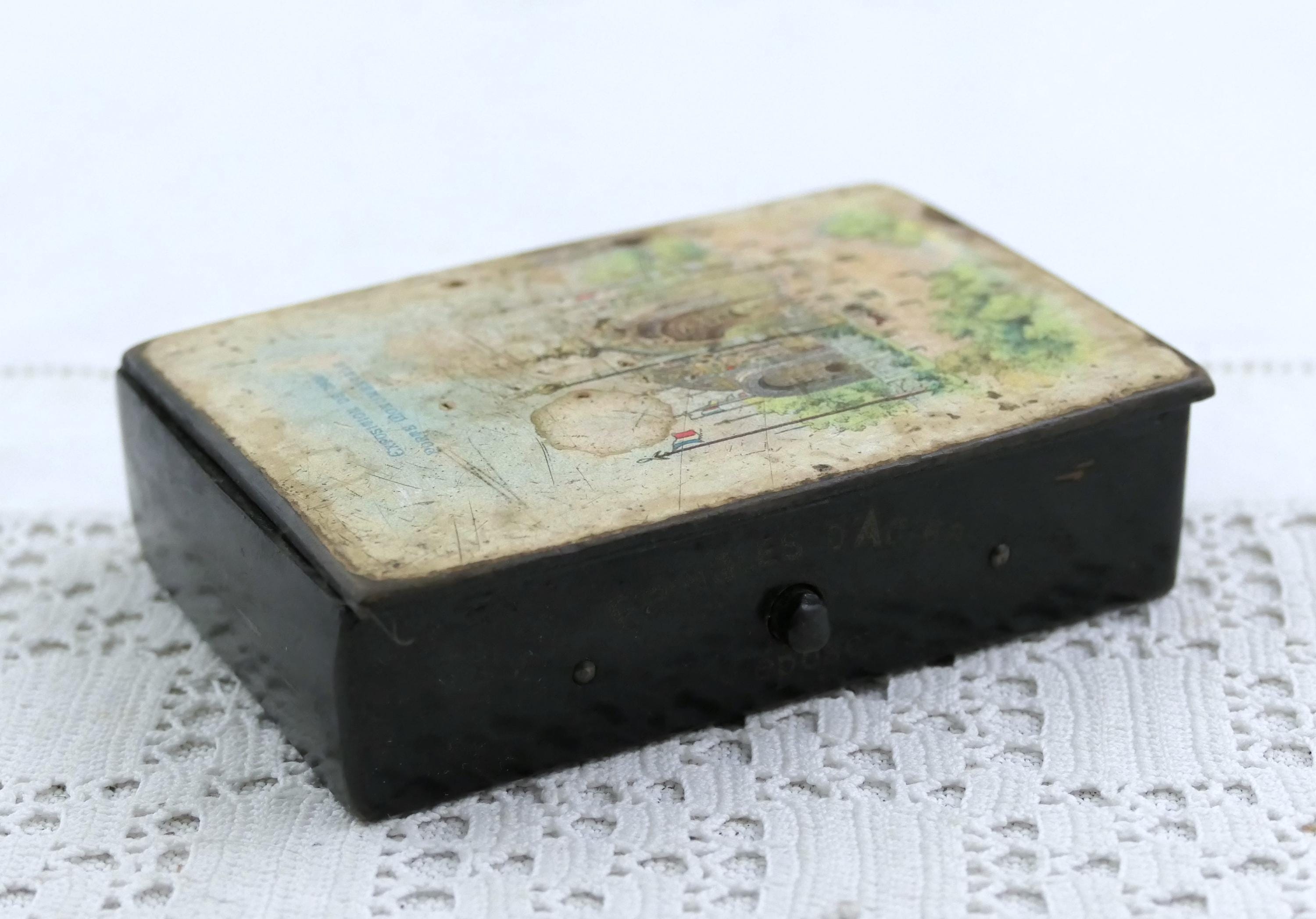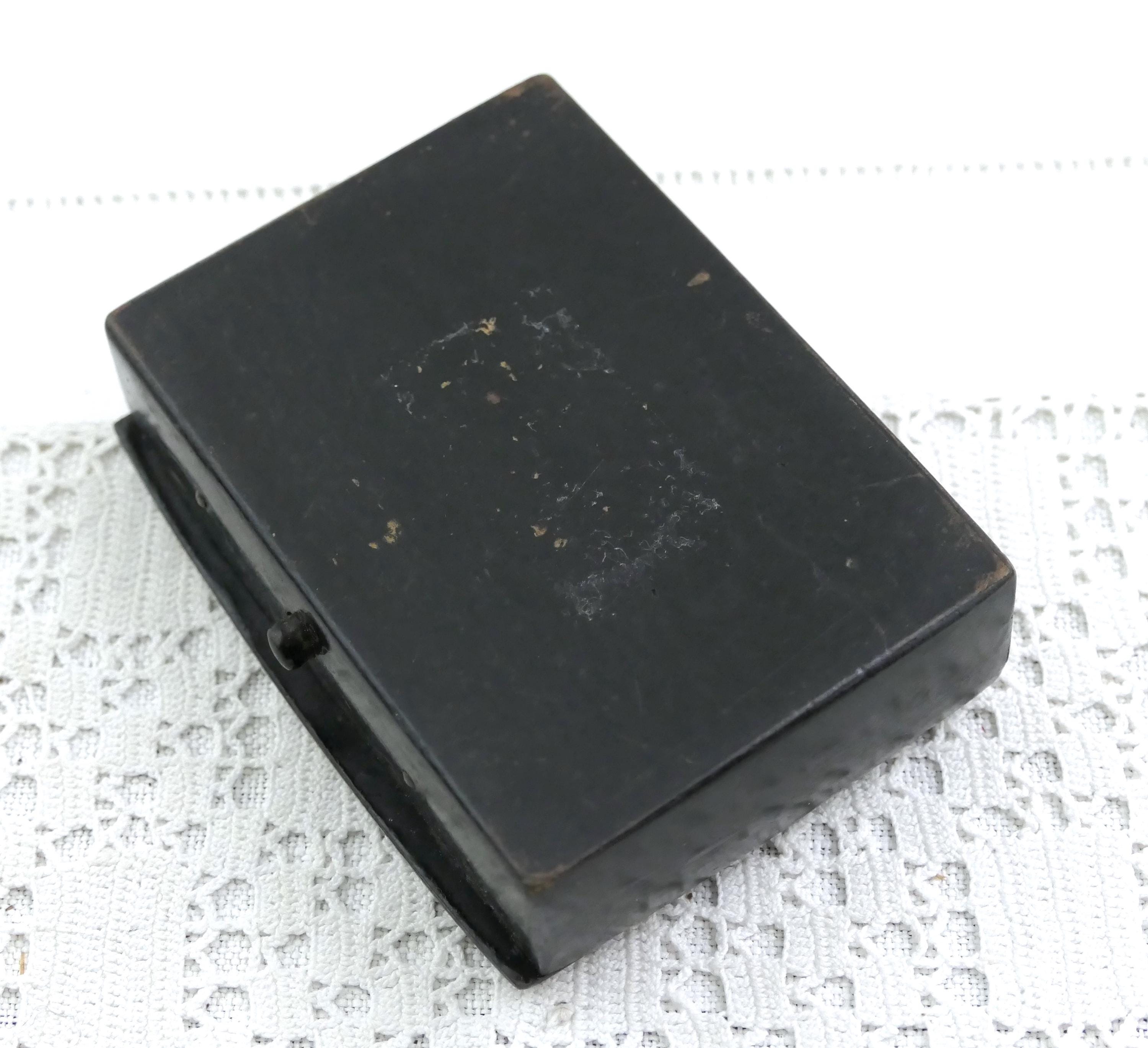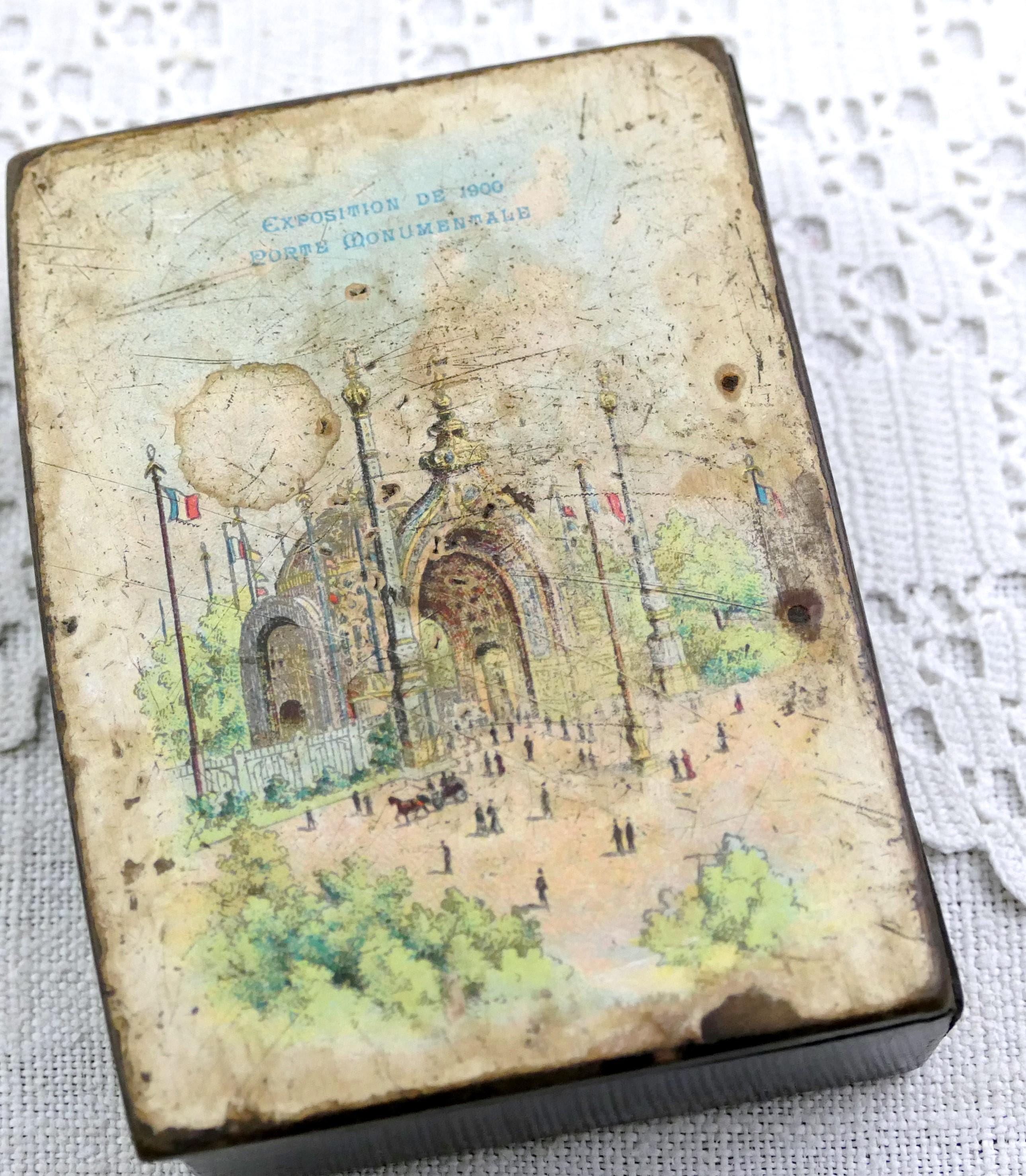 Small Antique French box with image if a building from the 1900 Paris Exhibition. Made of black lacquered wood. Ca late 1800s.