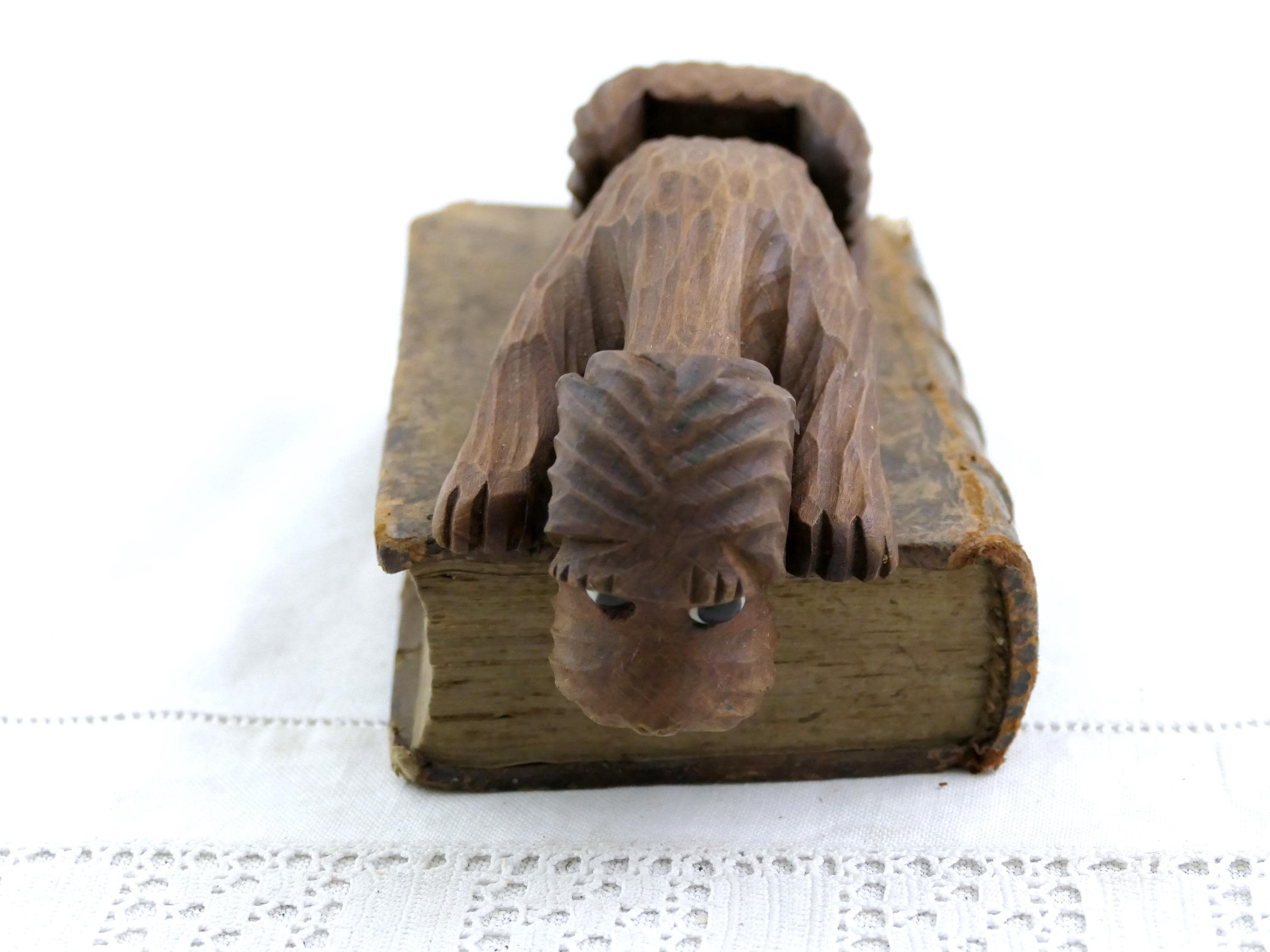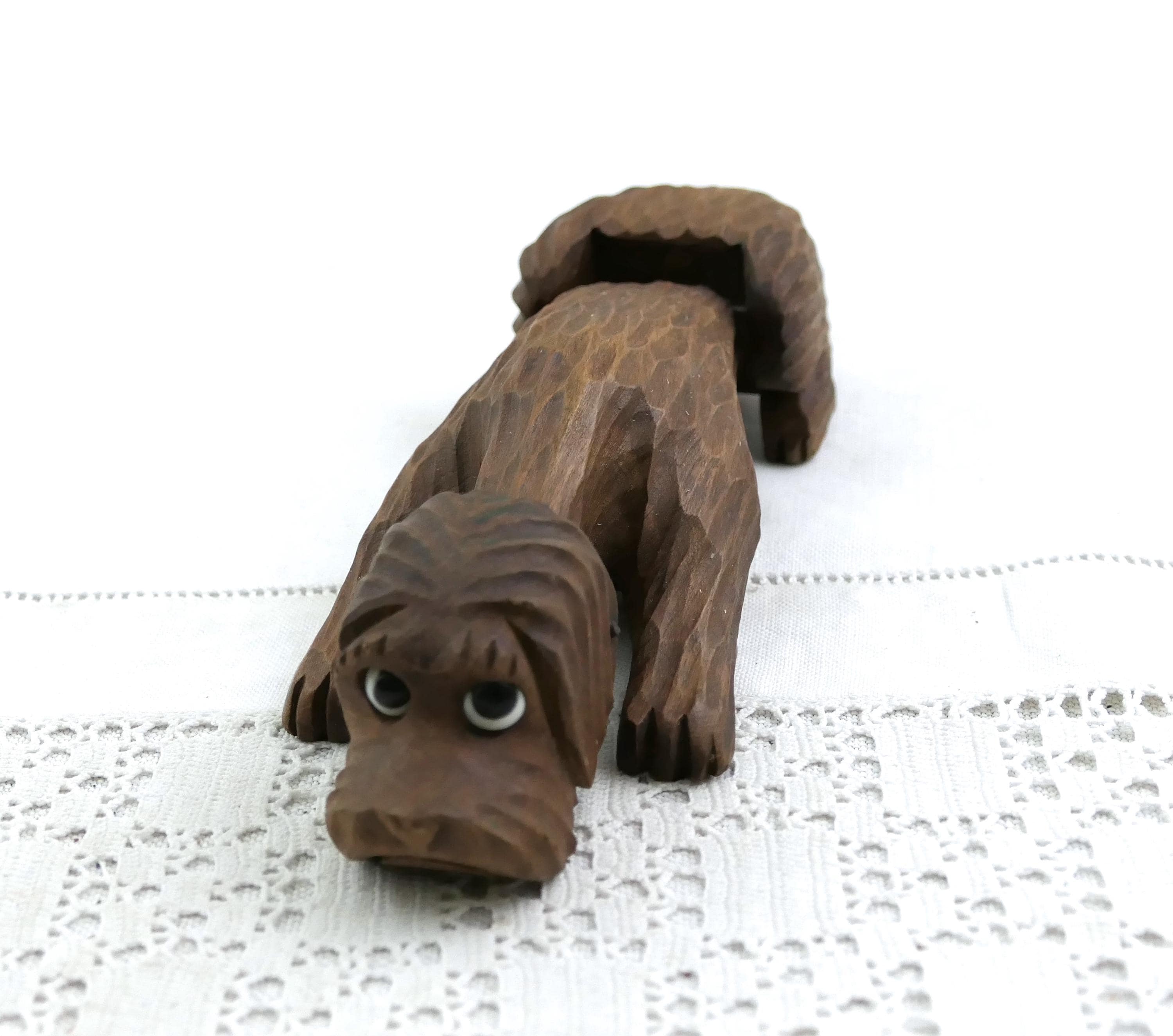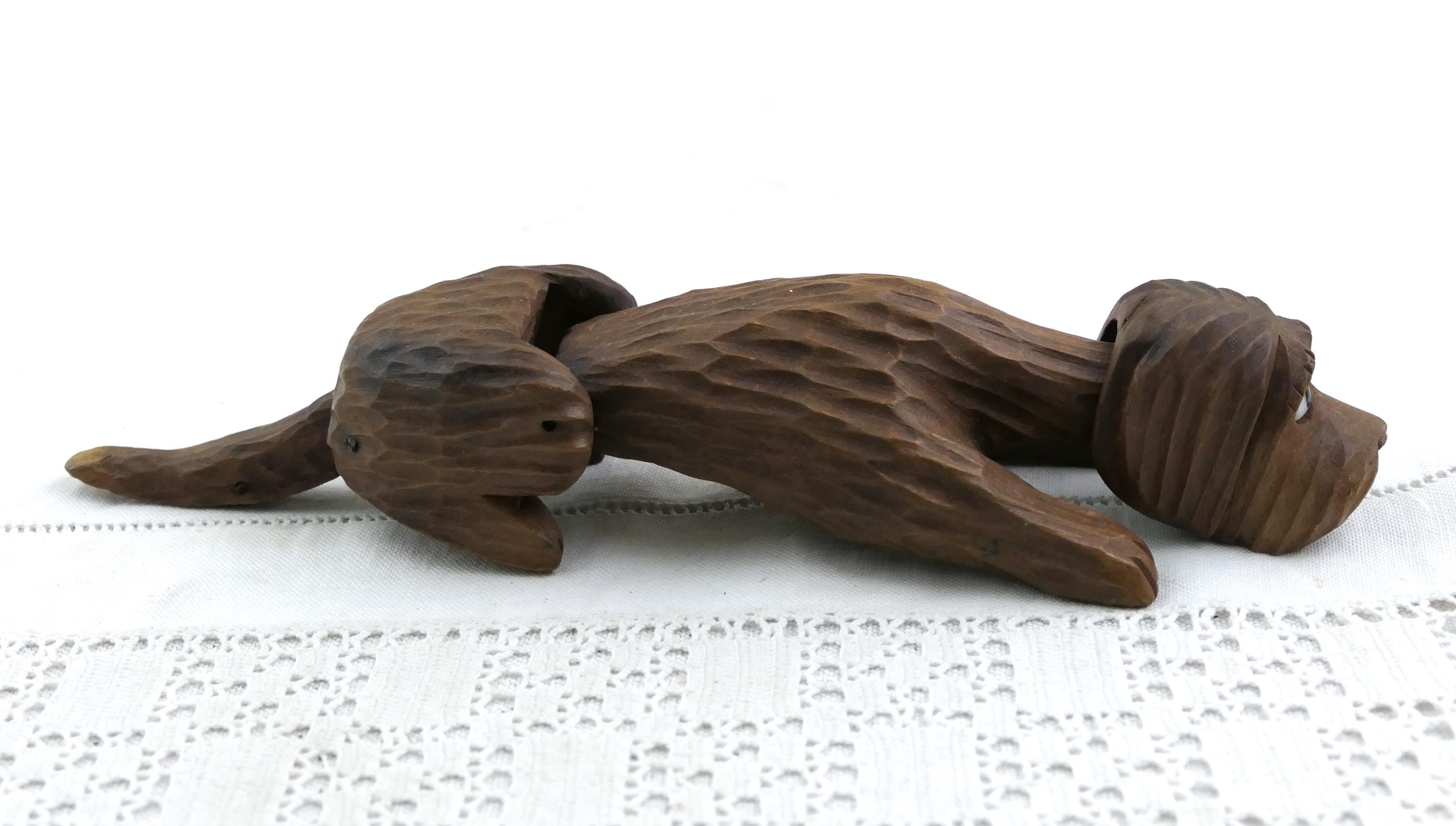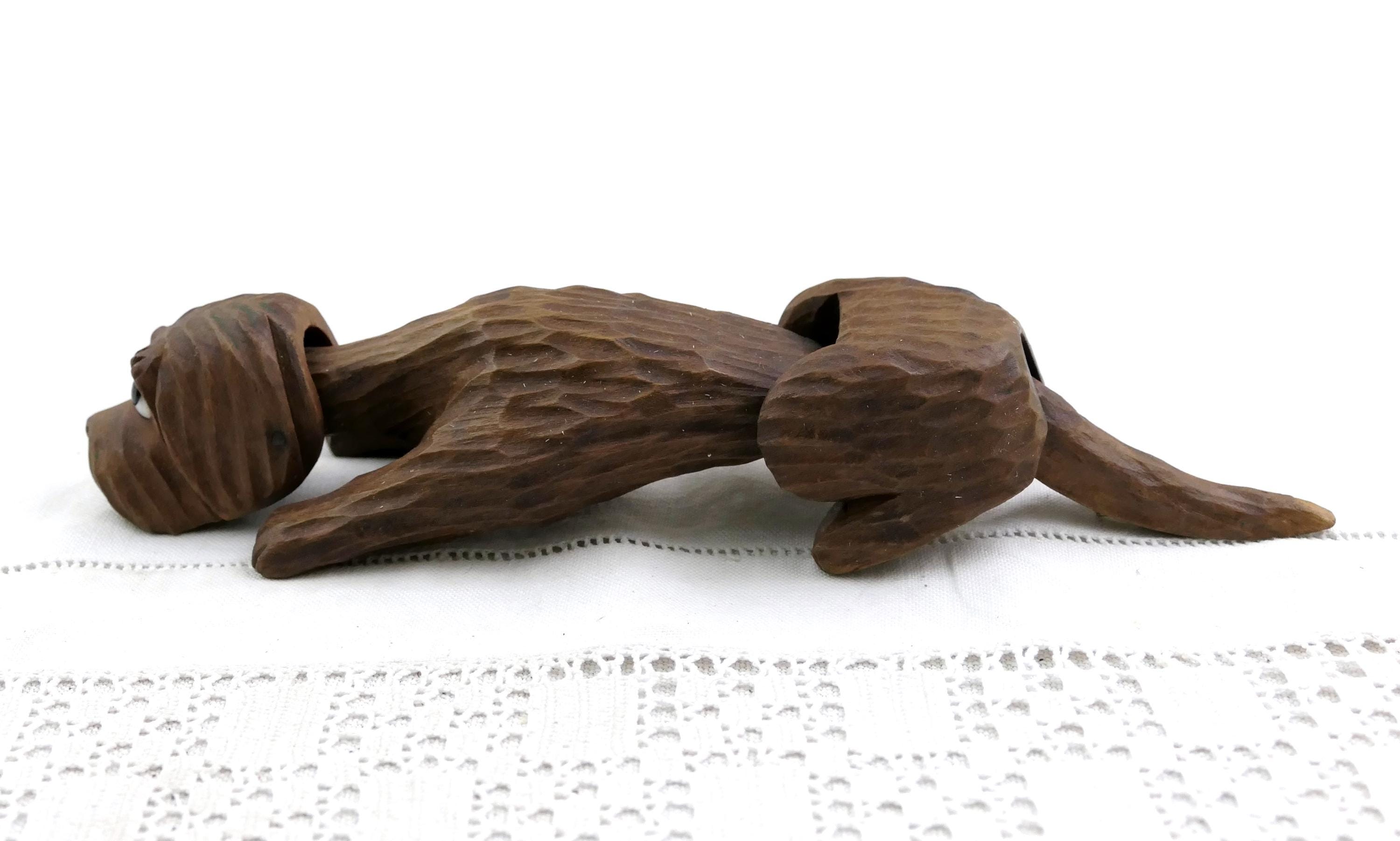 Vintage hand carved Black Forest articulated dog figurine. Once part of cigarette box or such like. Made of wood. Ca early to mid 1900s.
