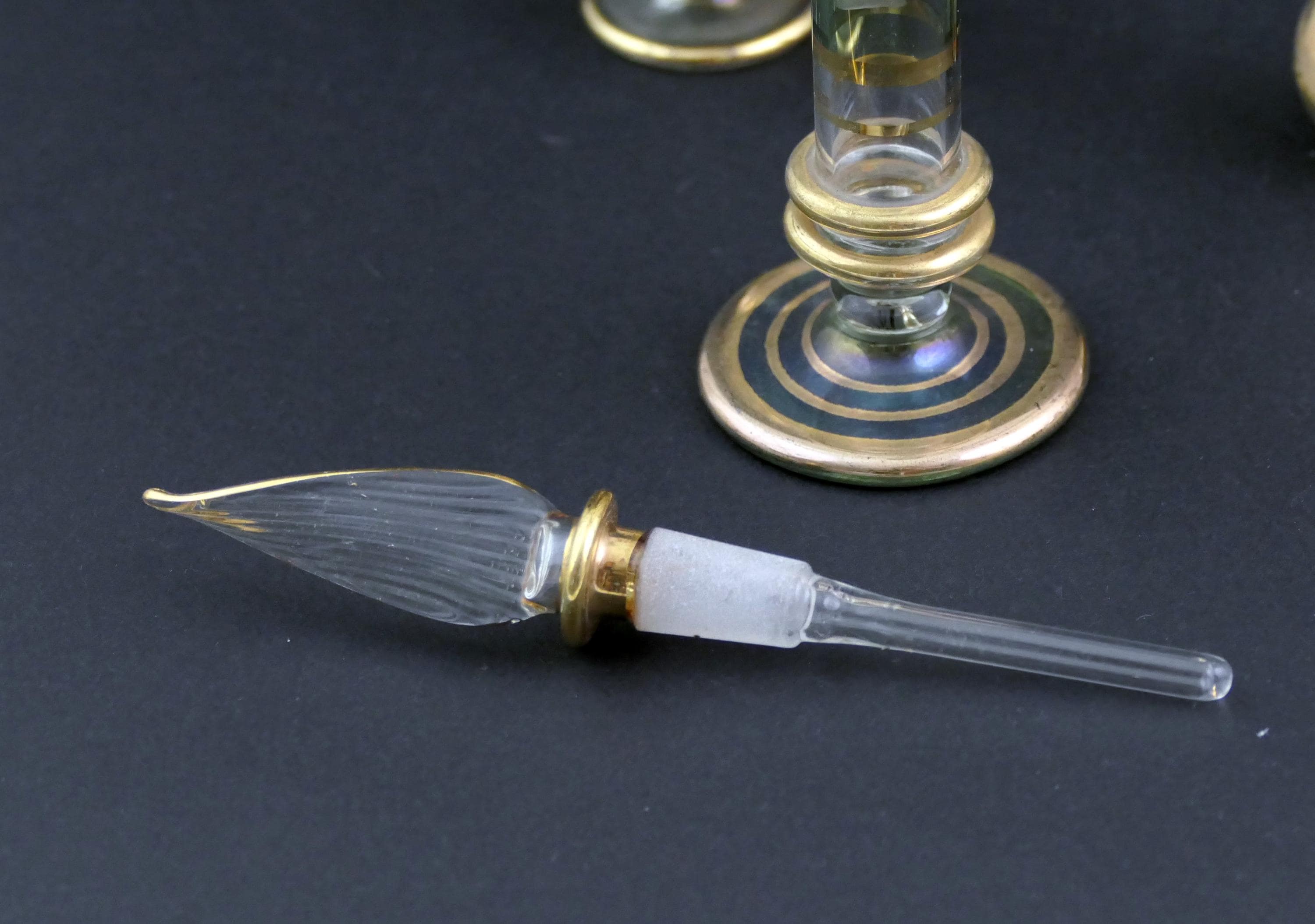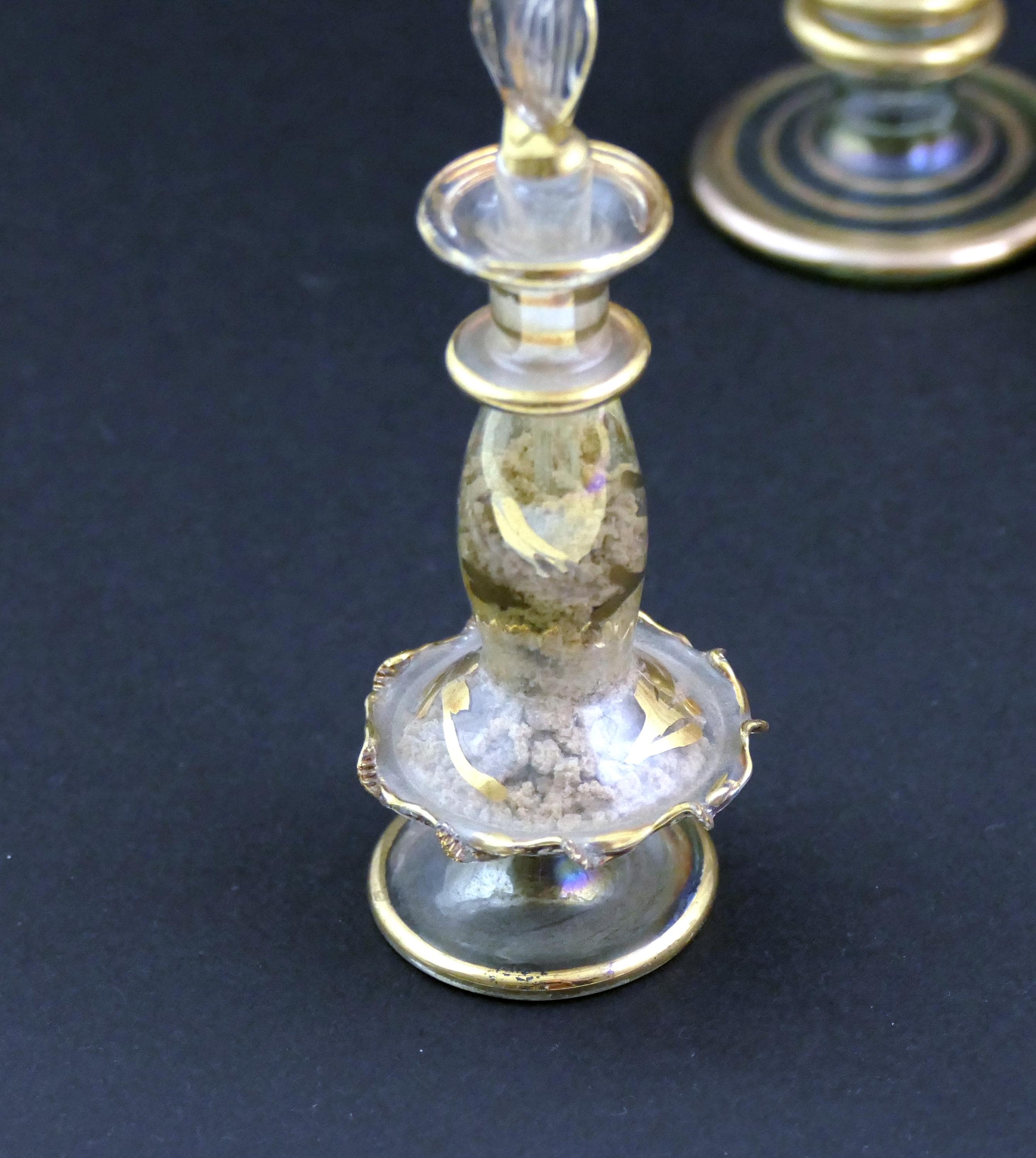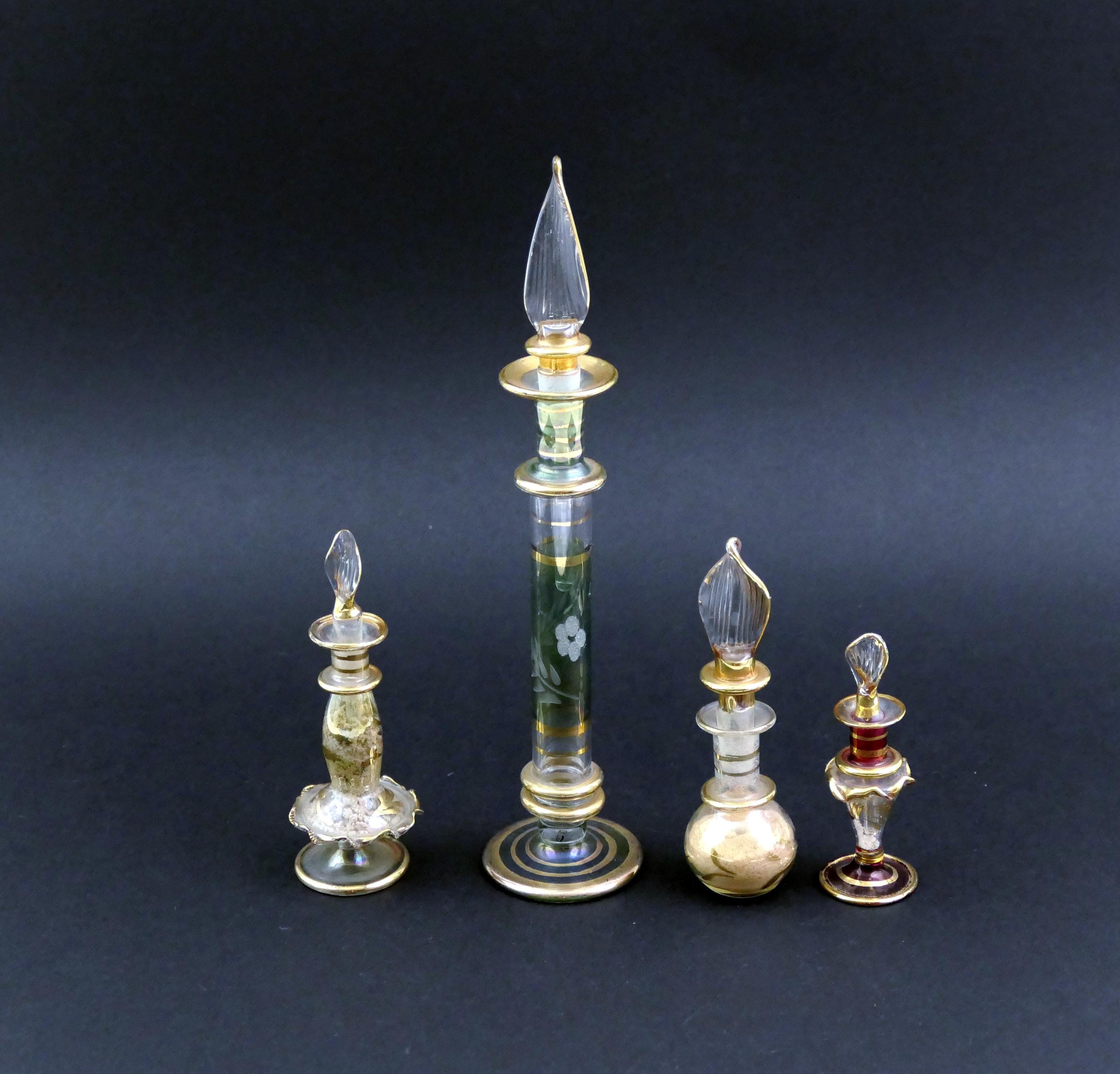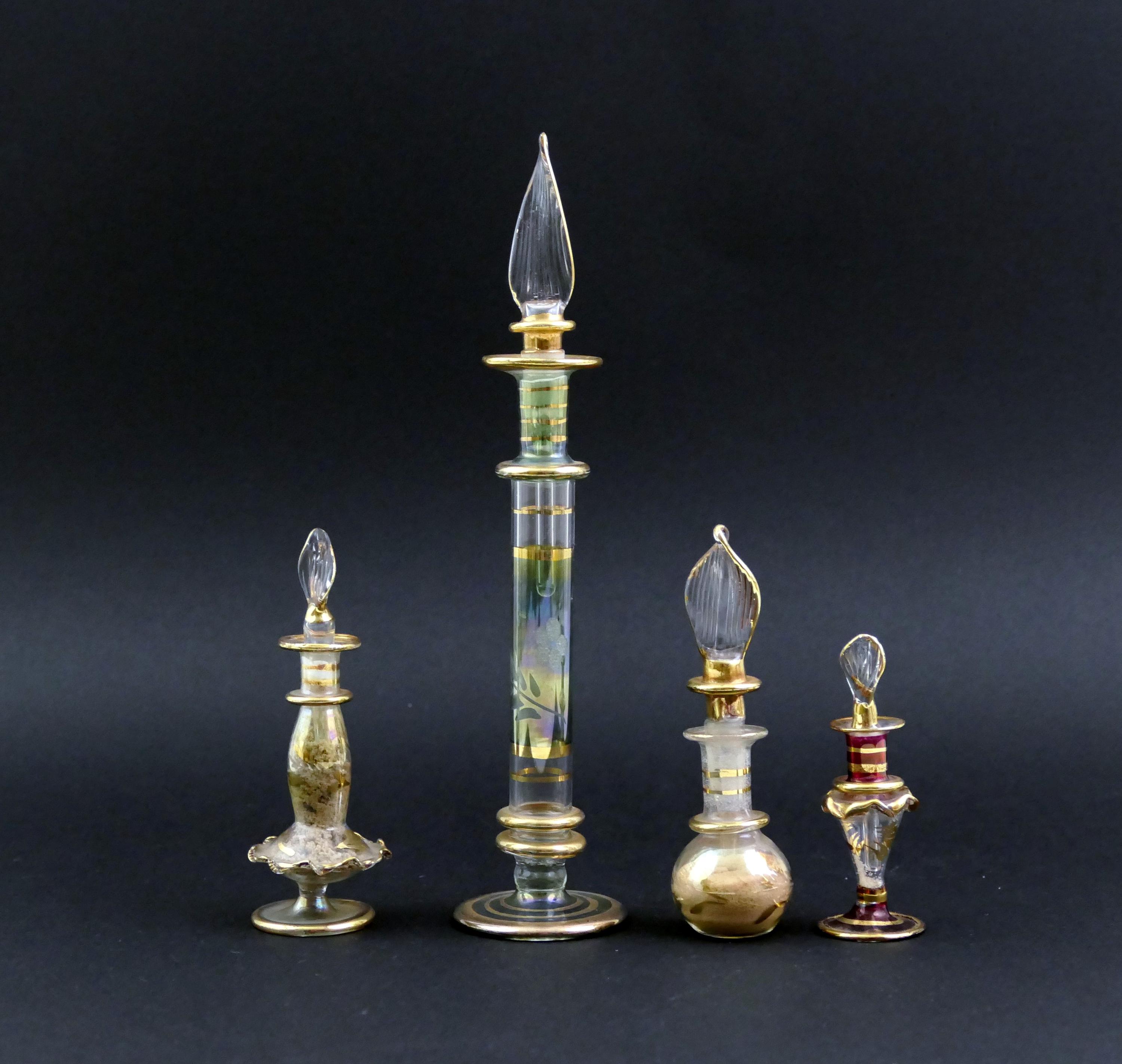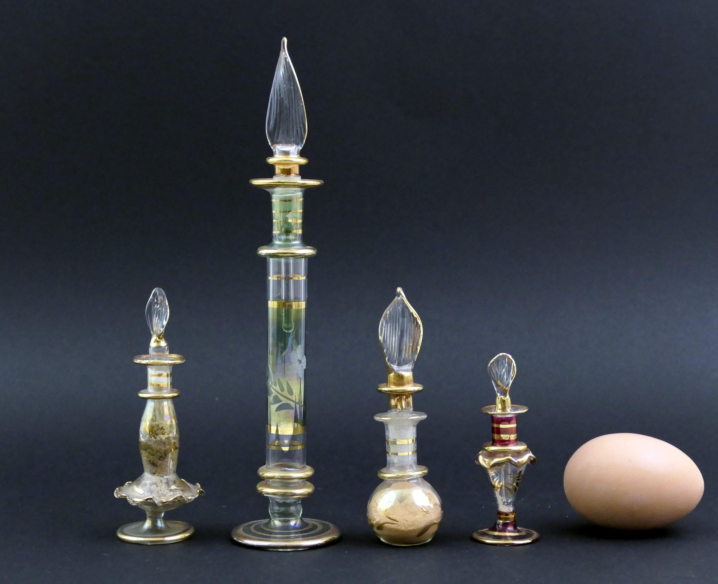 Set of 4 Vintage Egyptian perfume bottles with 2 containing sand from the Sahara desert. Hand made of glass. Ca late 1900s.