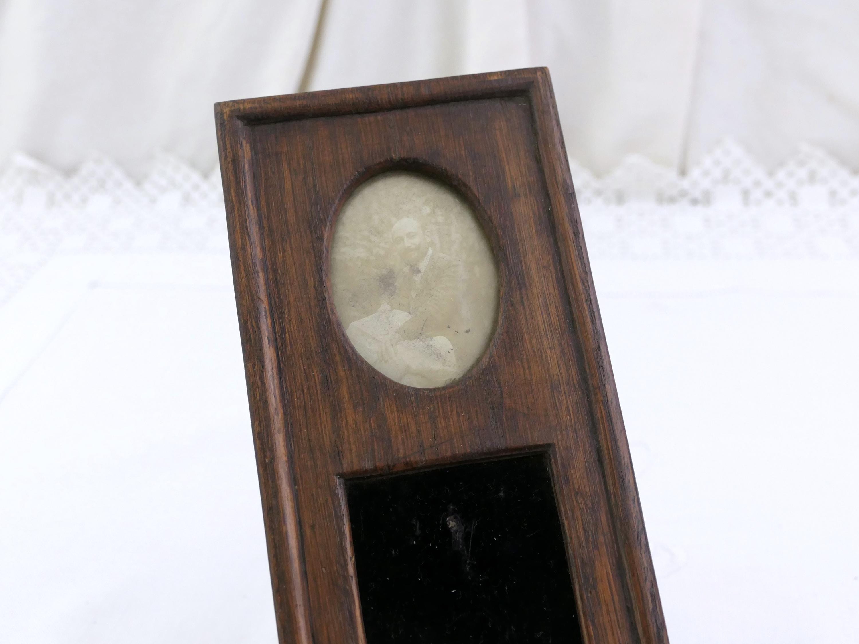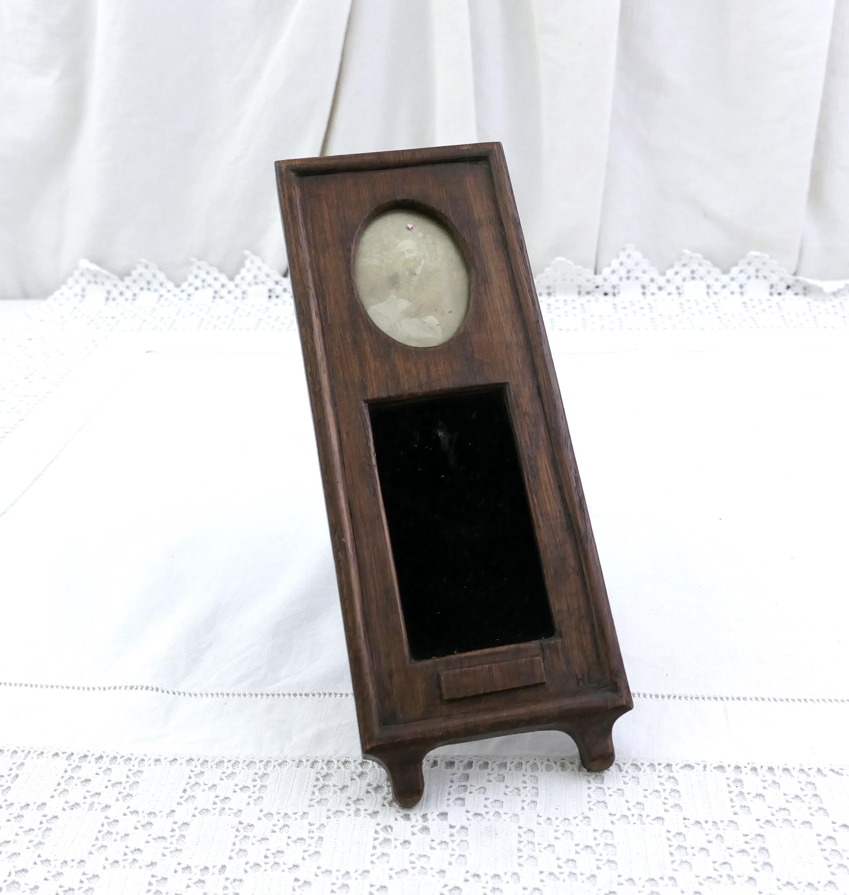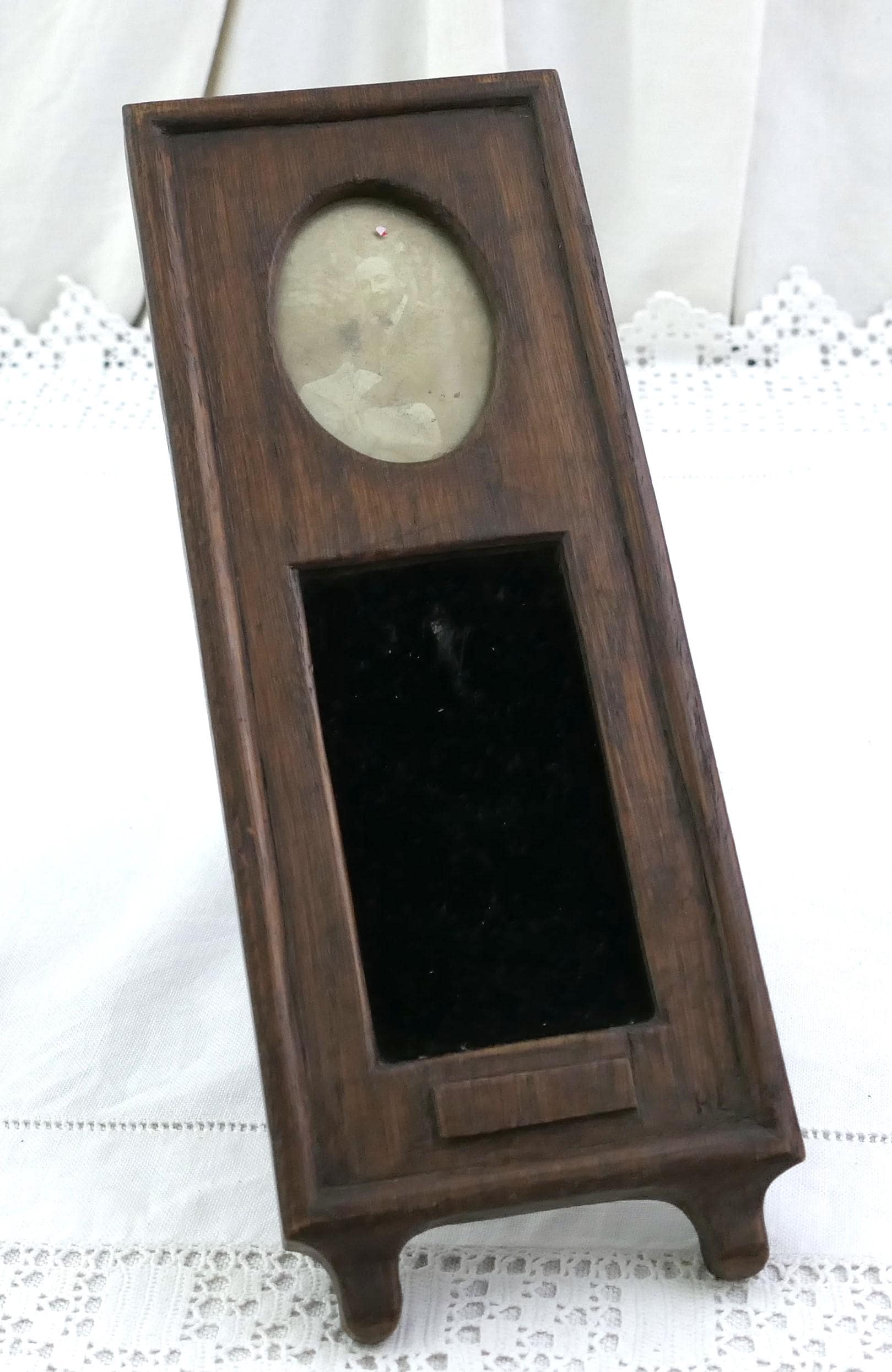Antique Primitive hand carved tall thin portrait frame with pocket watch holder. Made of oak wood. Ca early 1900s.
