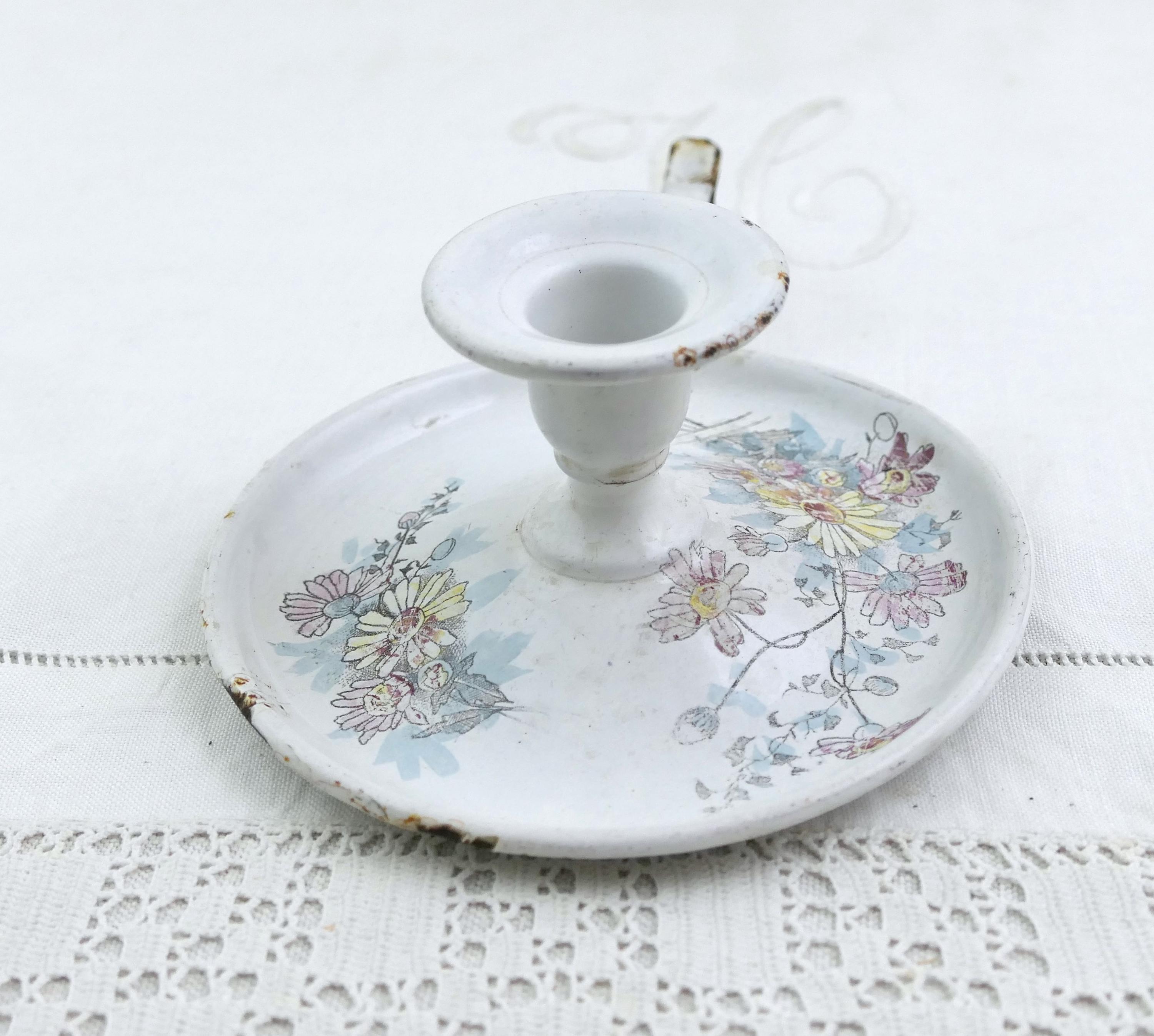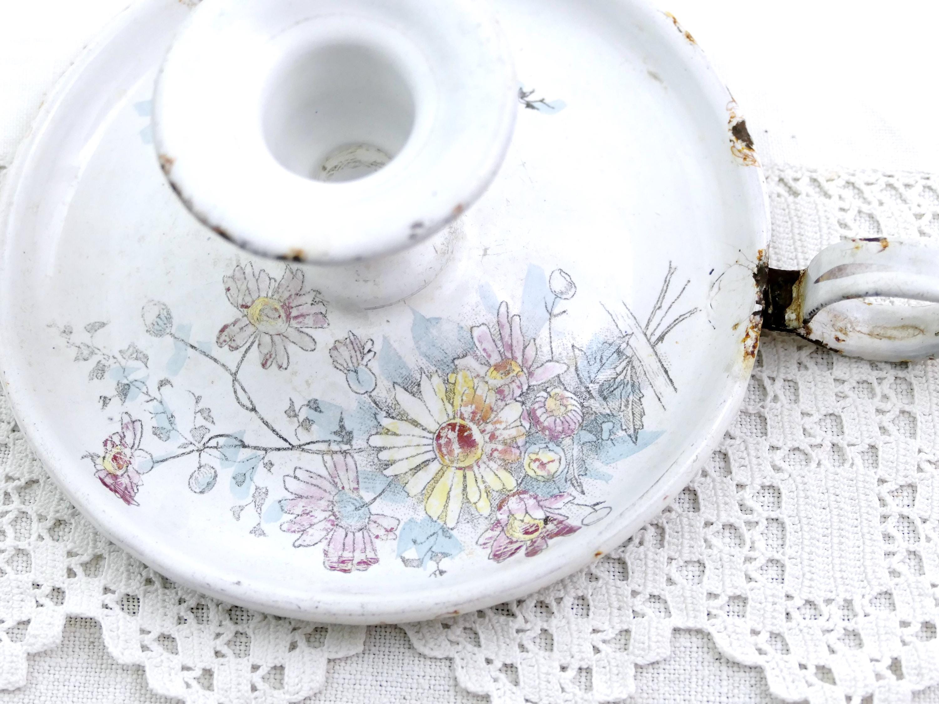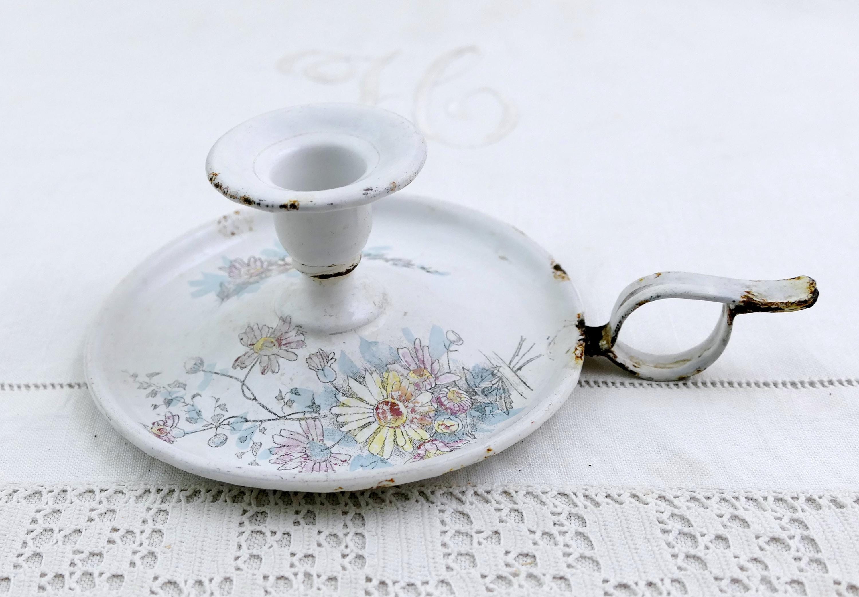 Antique French white enamelware bedchamber stick with flower pattern. Made of enameled metal. Ca mid to late 1800s.