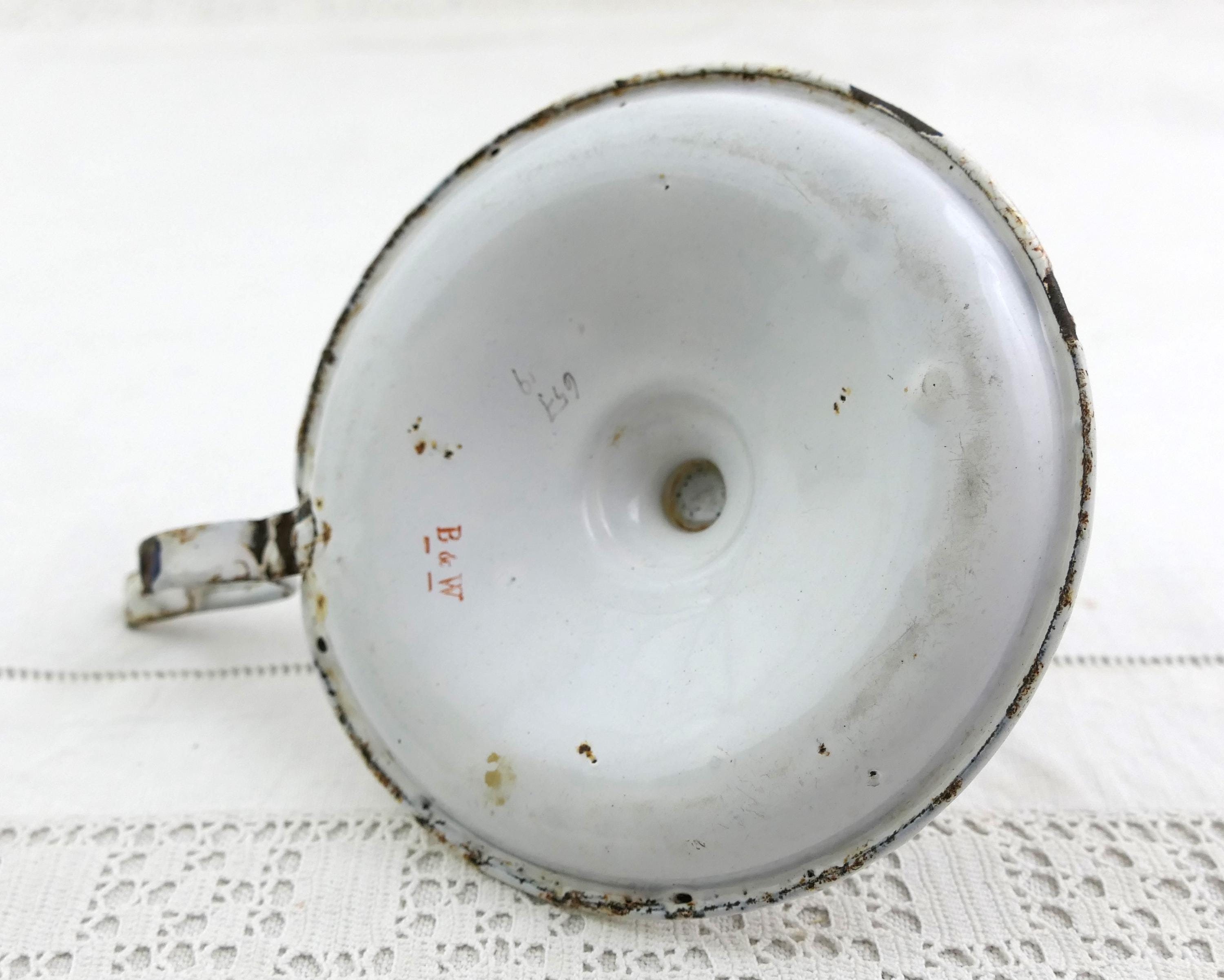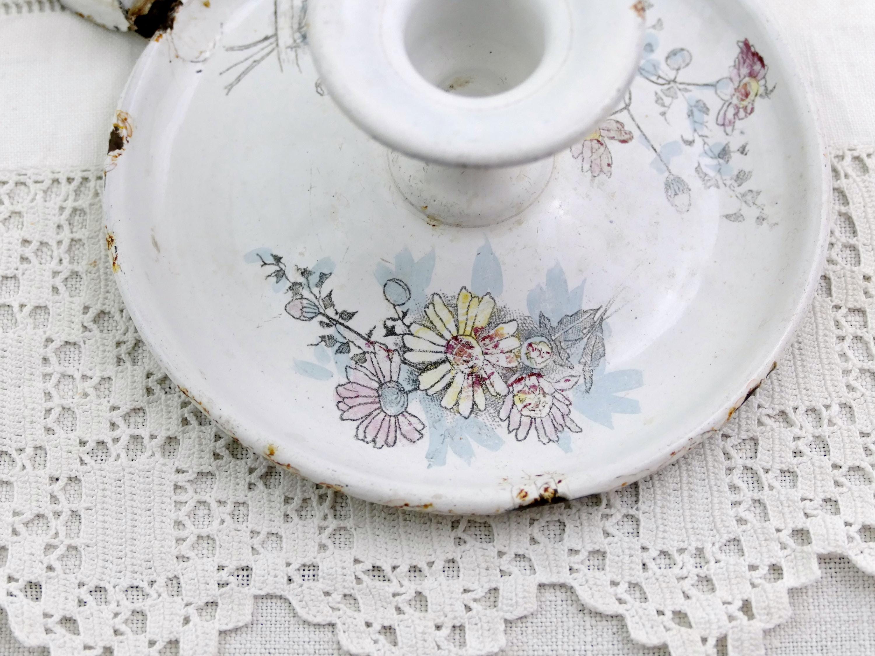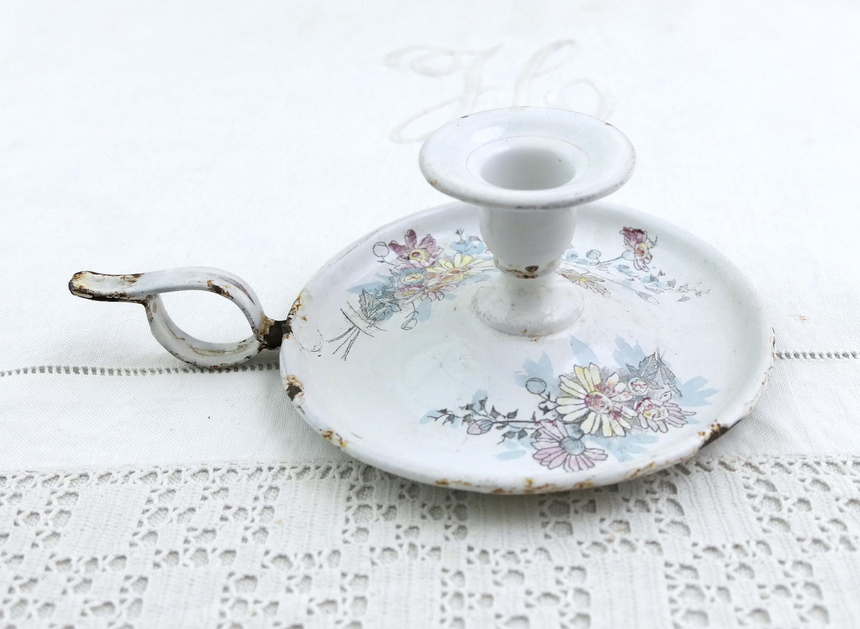 Antique French white enamelware bedchamber stick with flower pattern. Made of enameled metal. Ca mid to late 1800s.