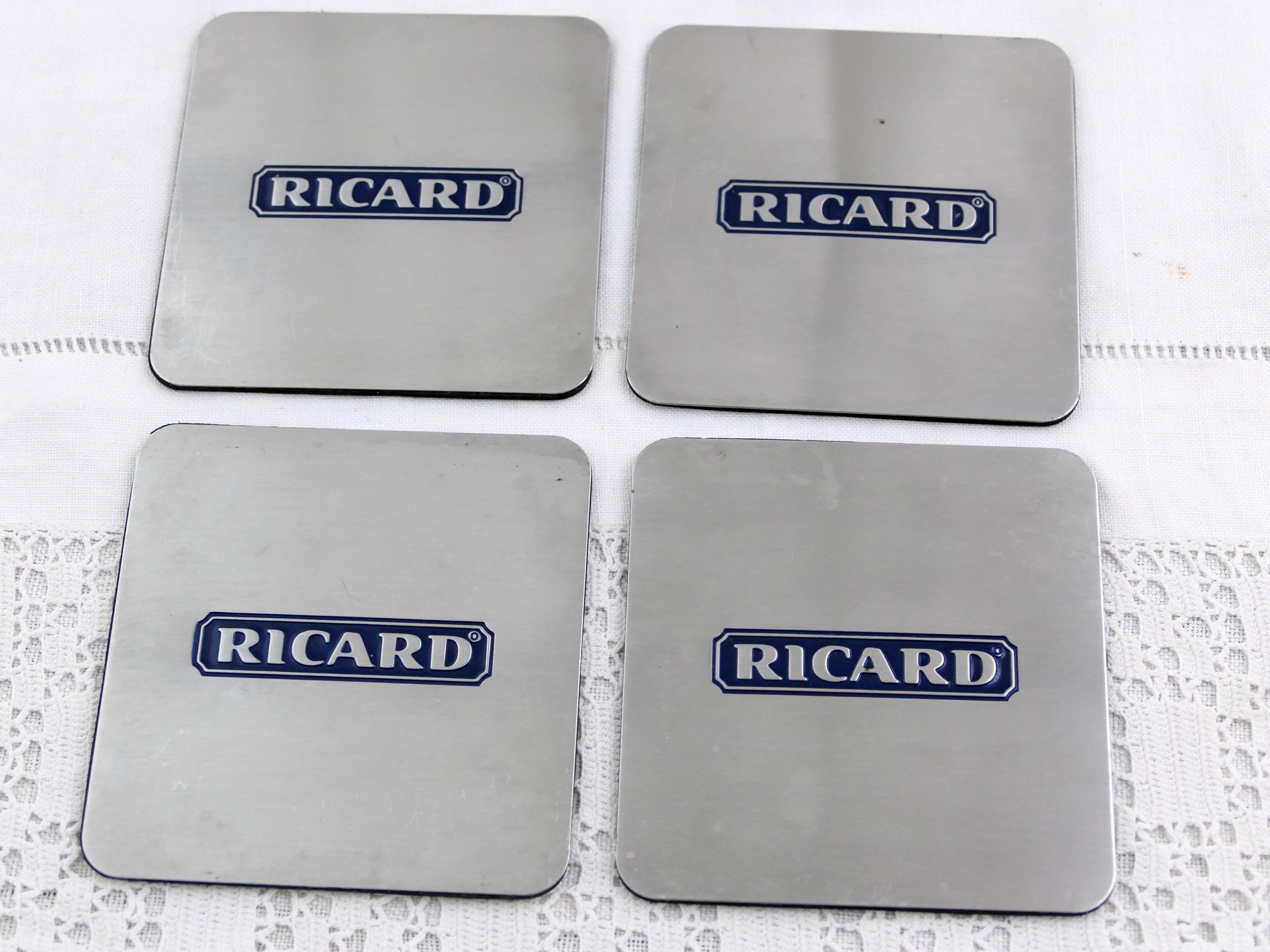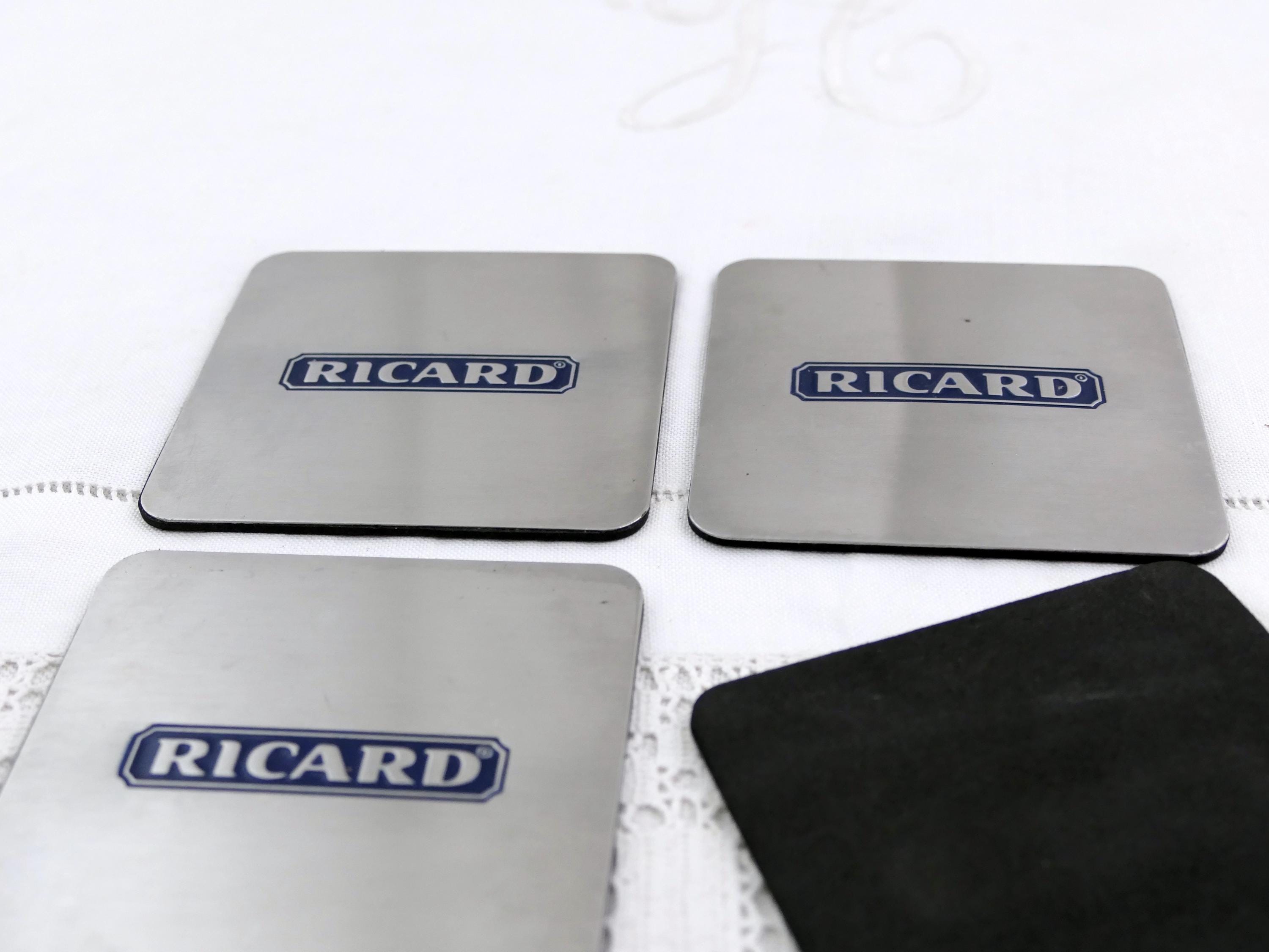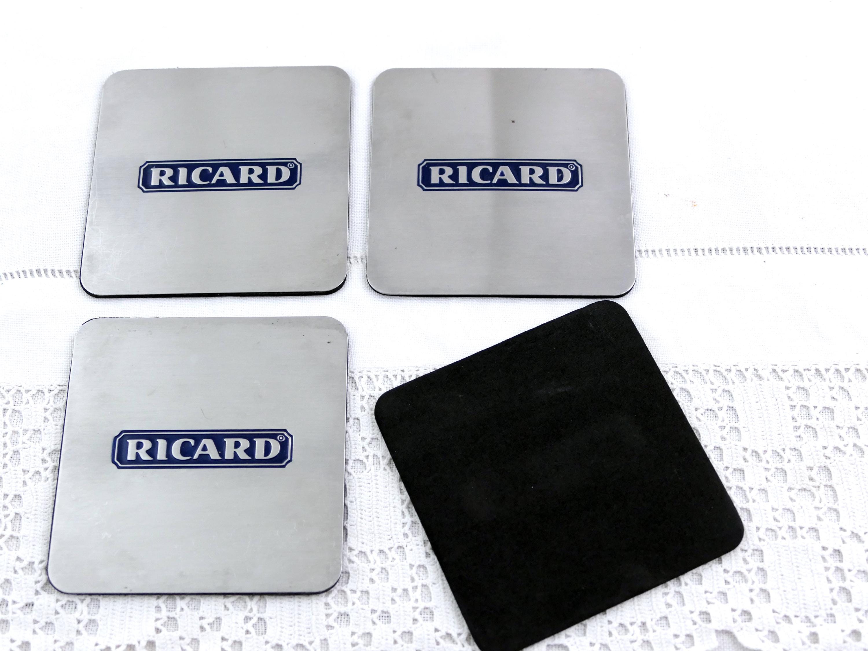 Vintage French set of 4 Ricard coasters. Made of brushed metal with black foam backing. Ca late 1900s.