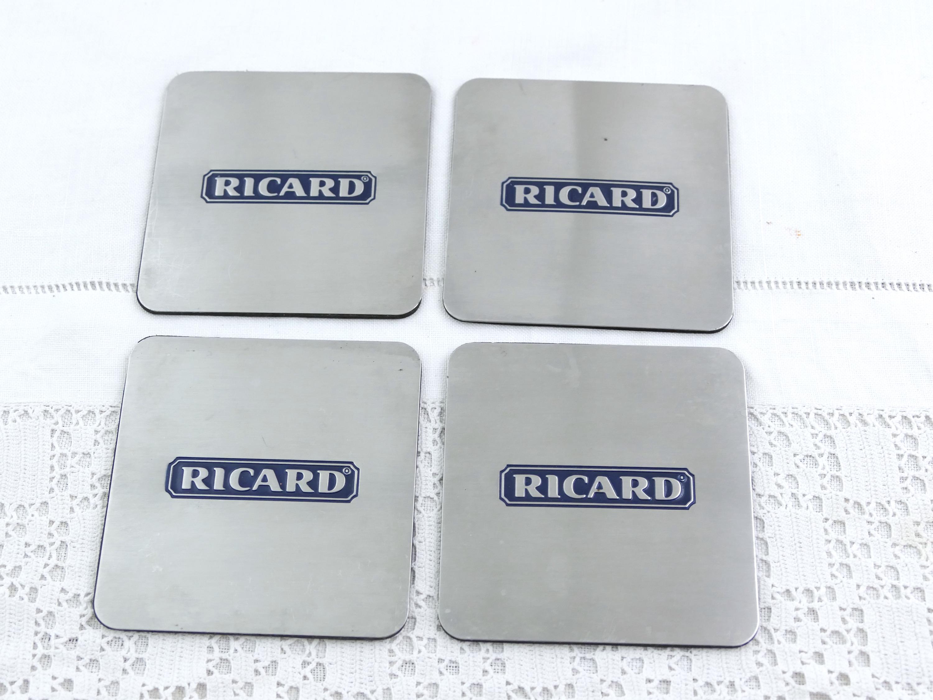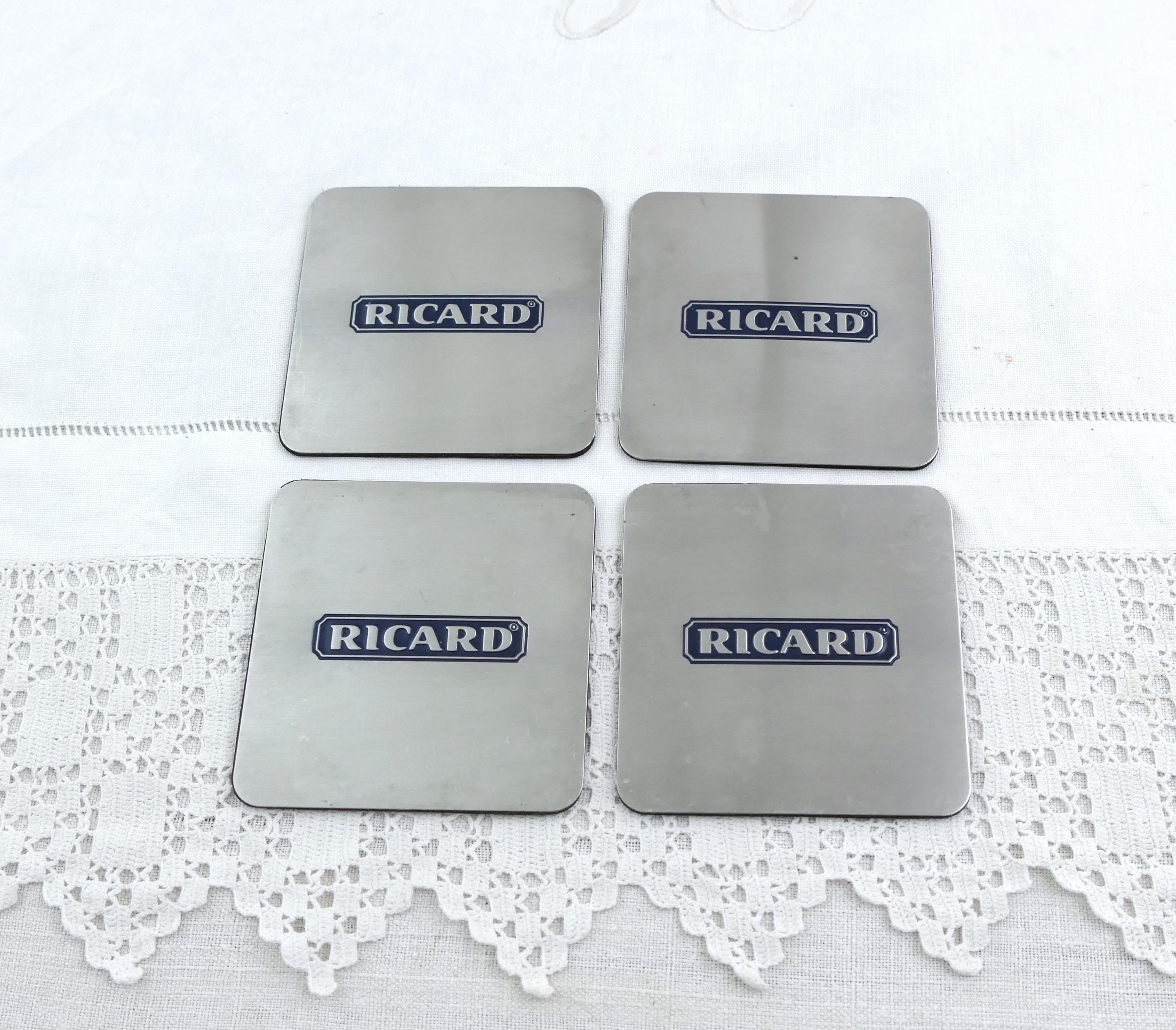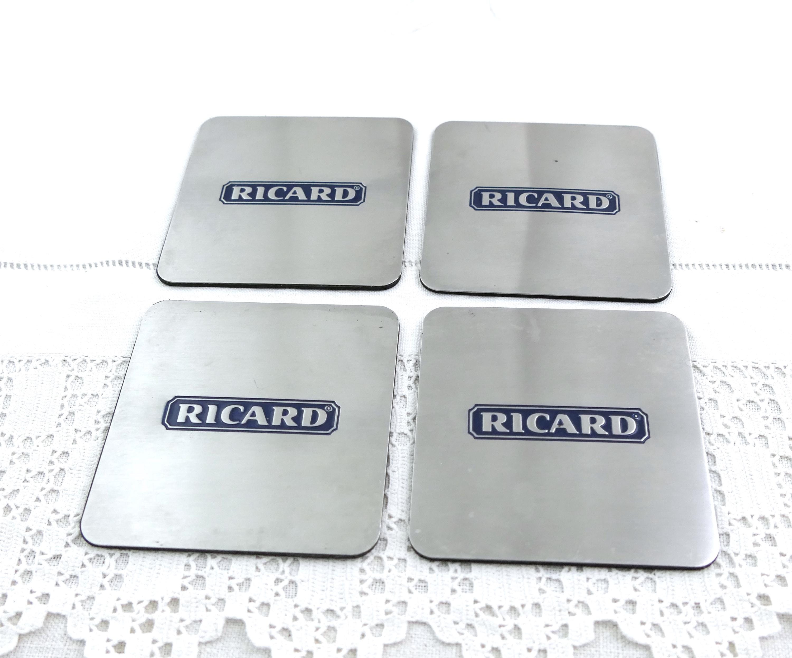 Vintage French set of 4 Ricard coasters. Made of brushed metal with black foam backing. Ca late 1900s.