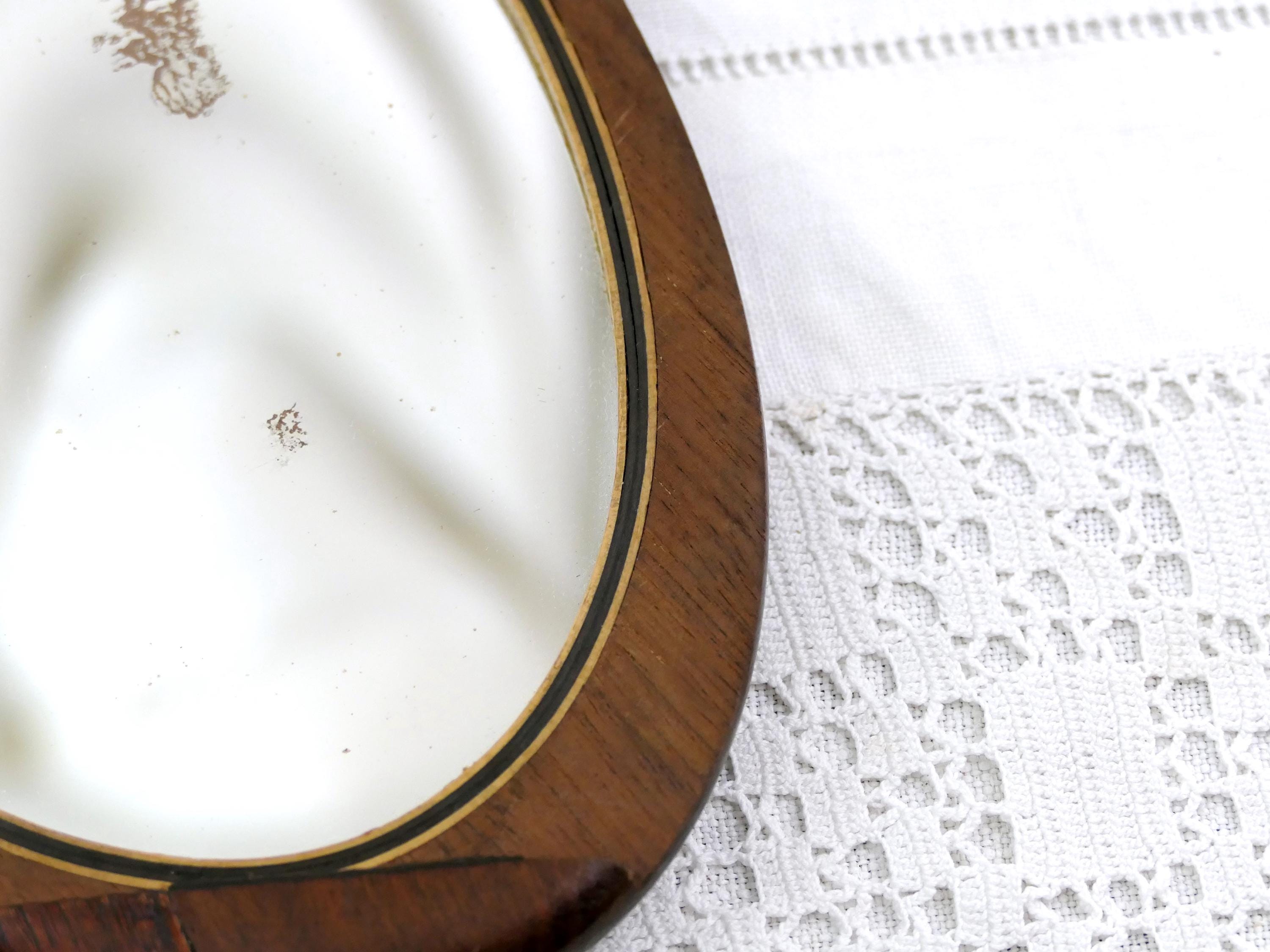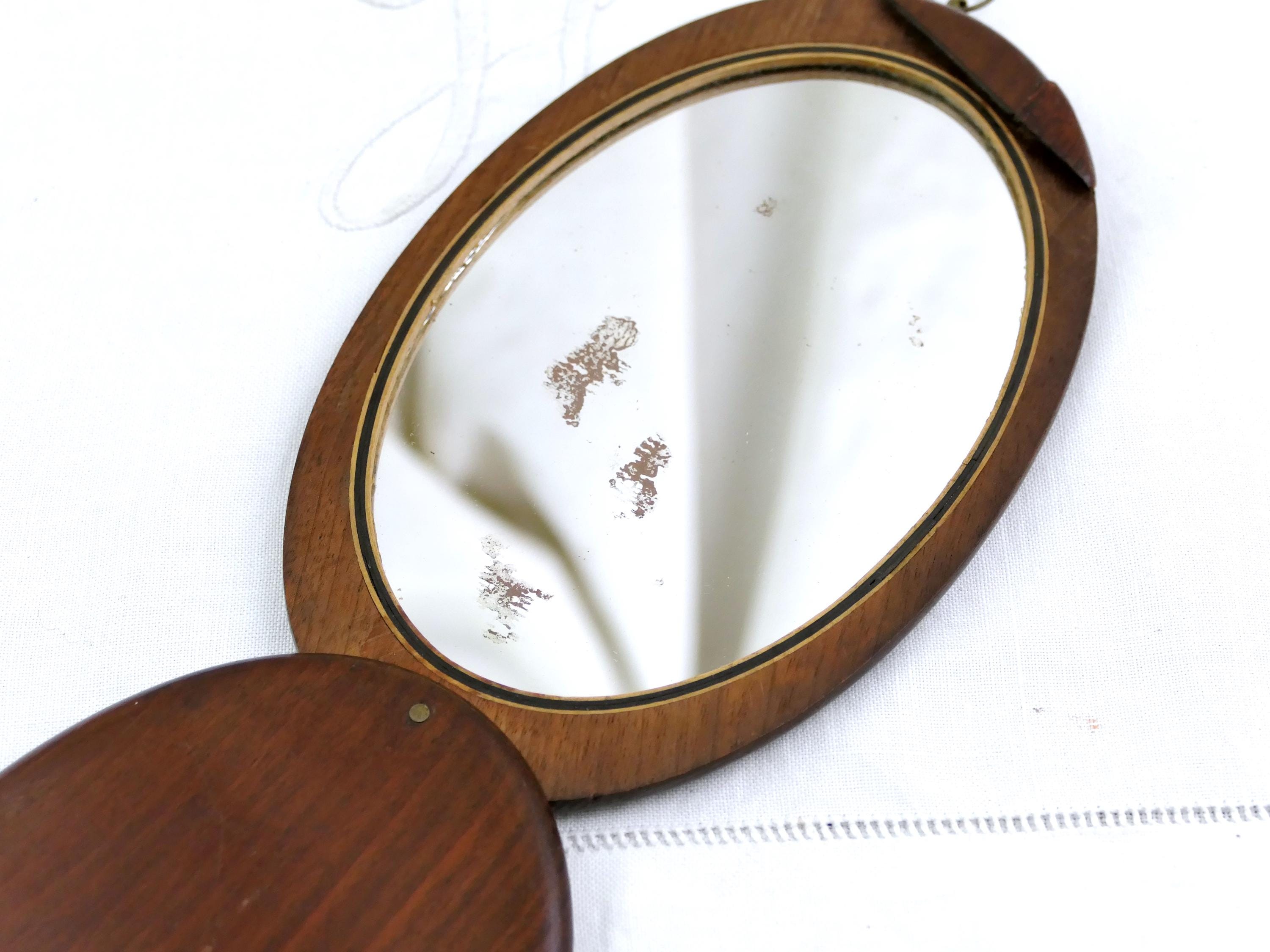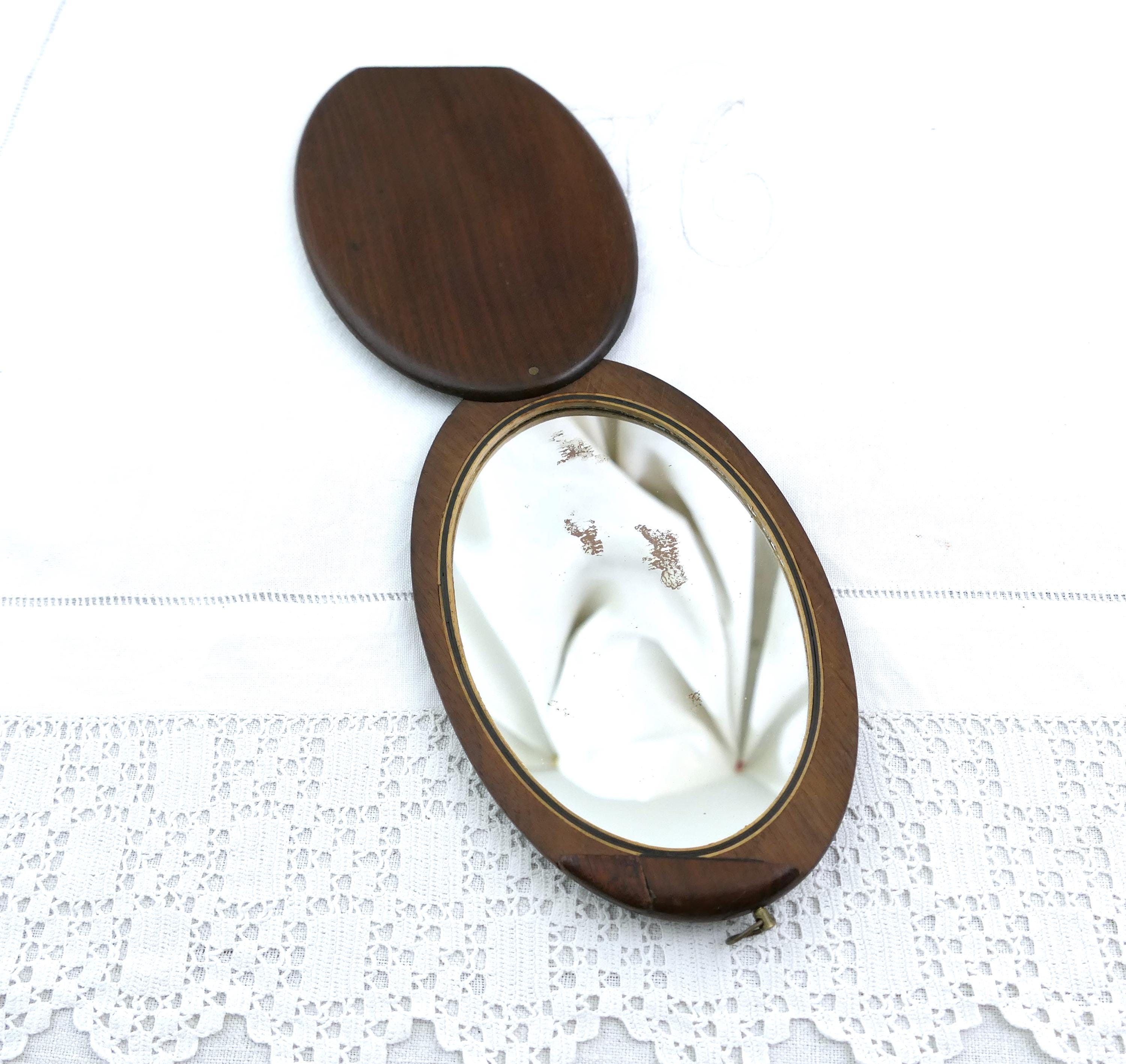 Antique French oval travel vanity mirror with swivel lid. Made of wood with glass mirror. Ca 1800s.