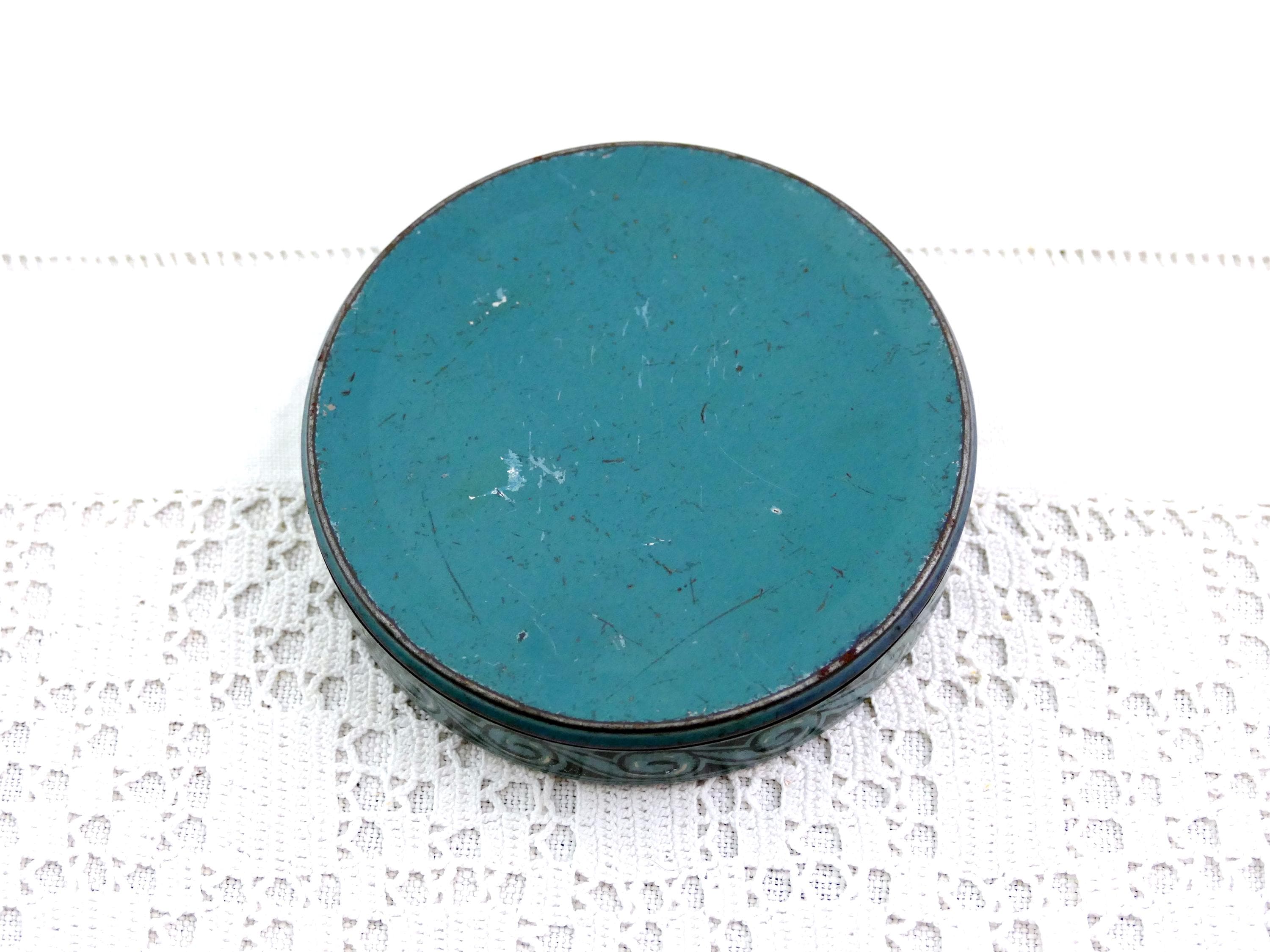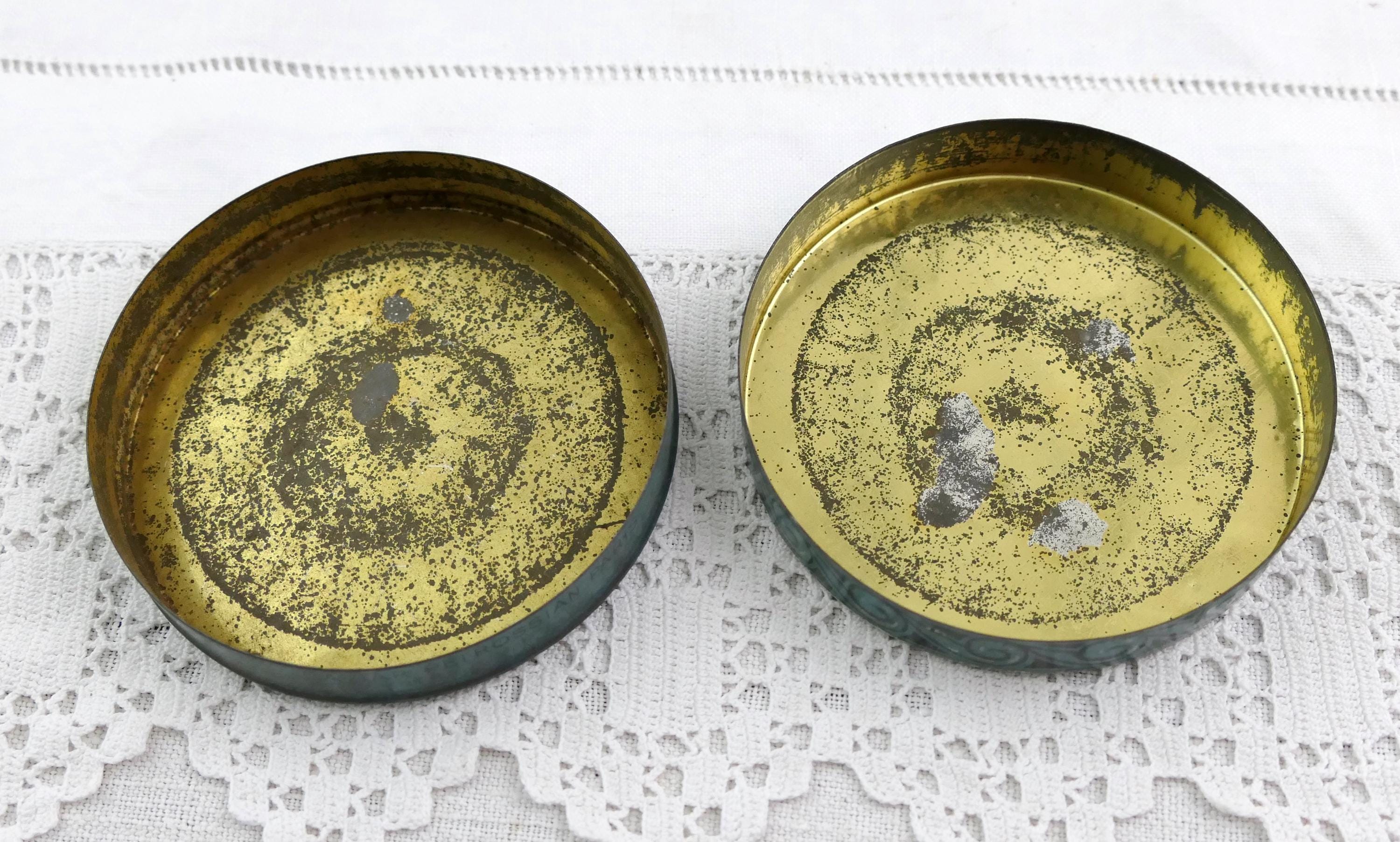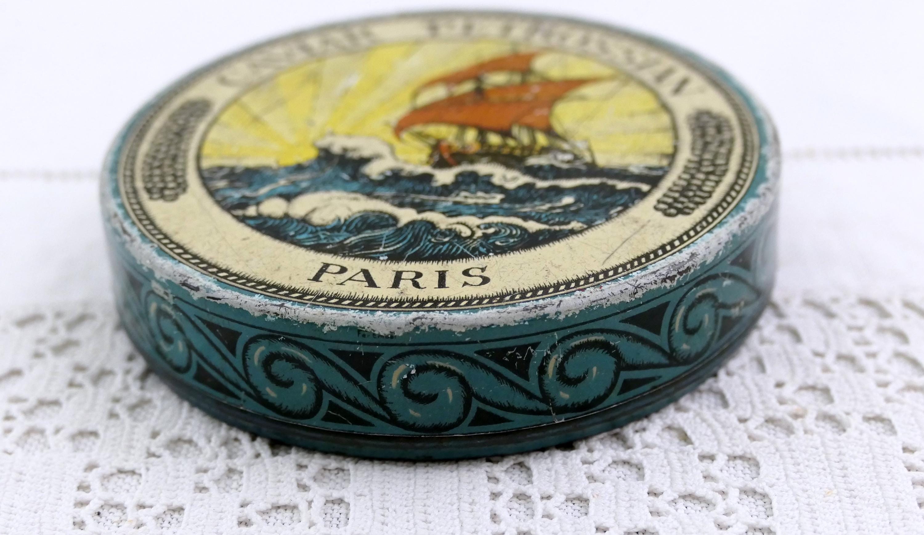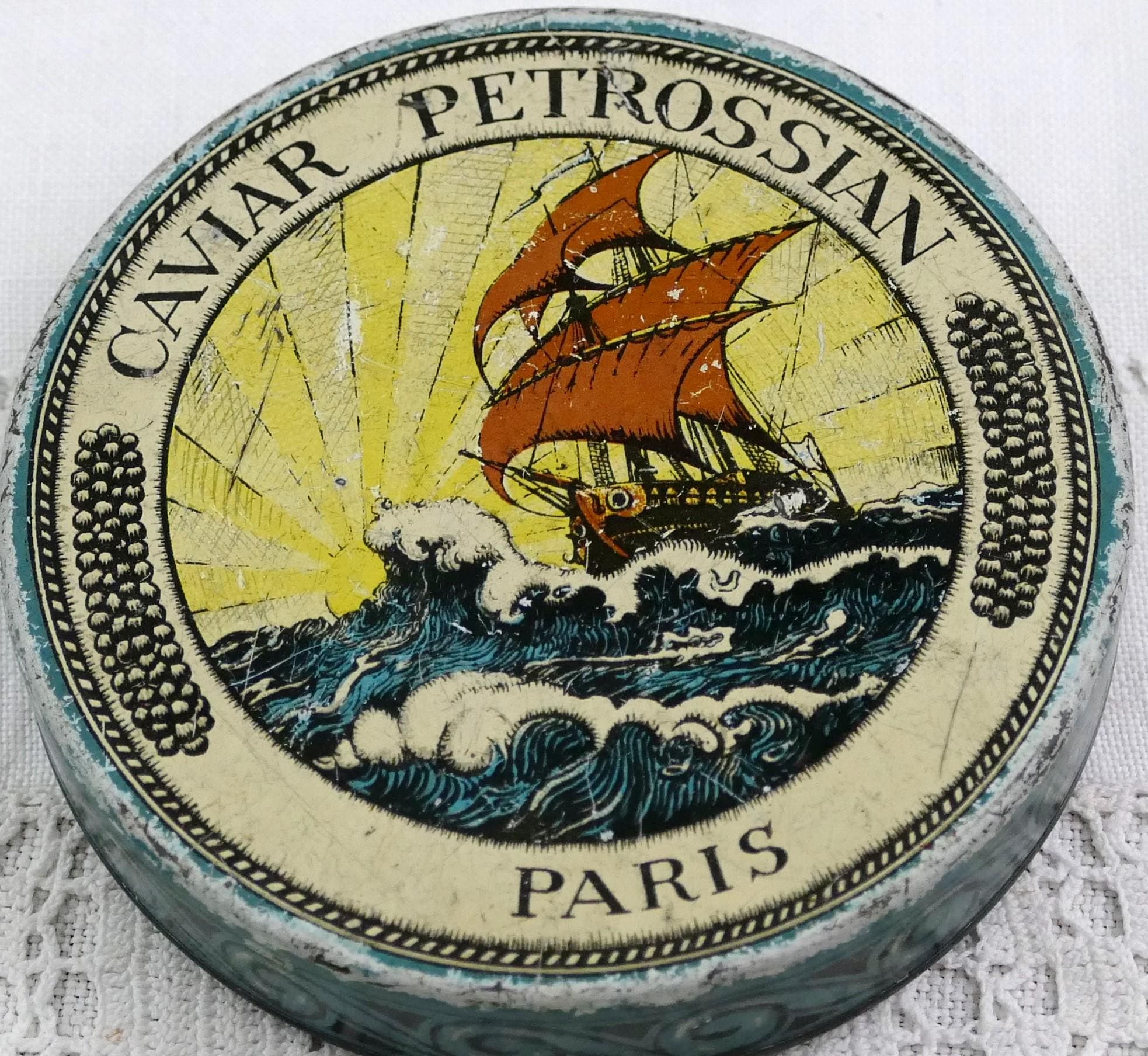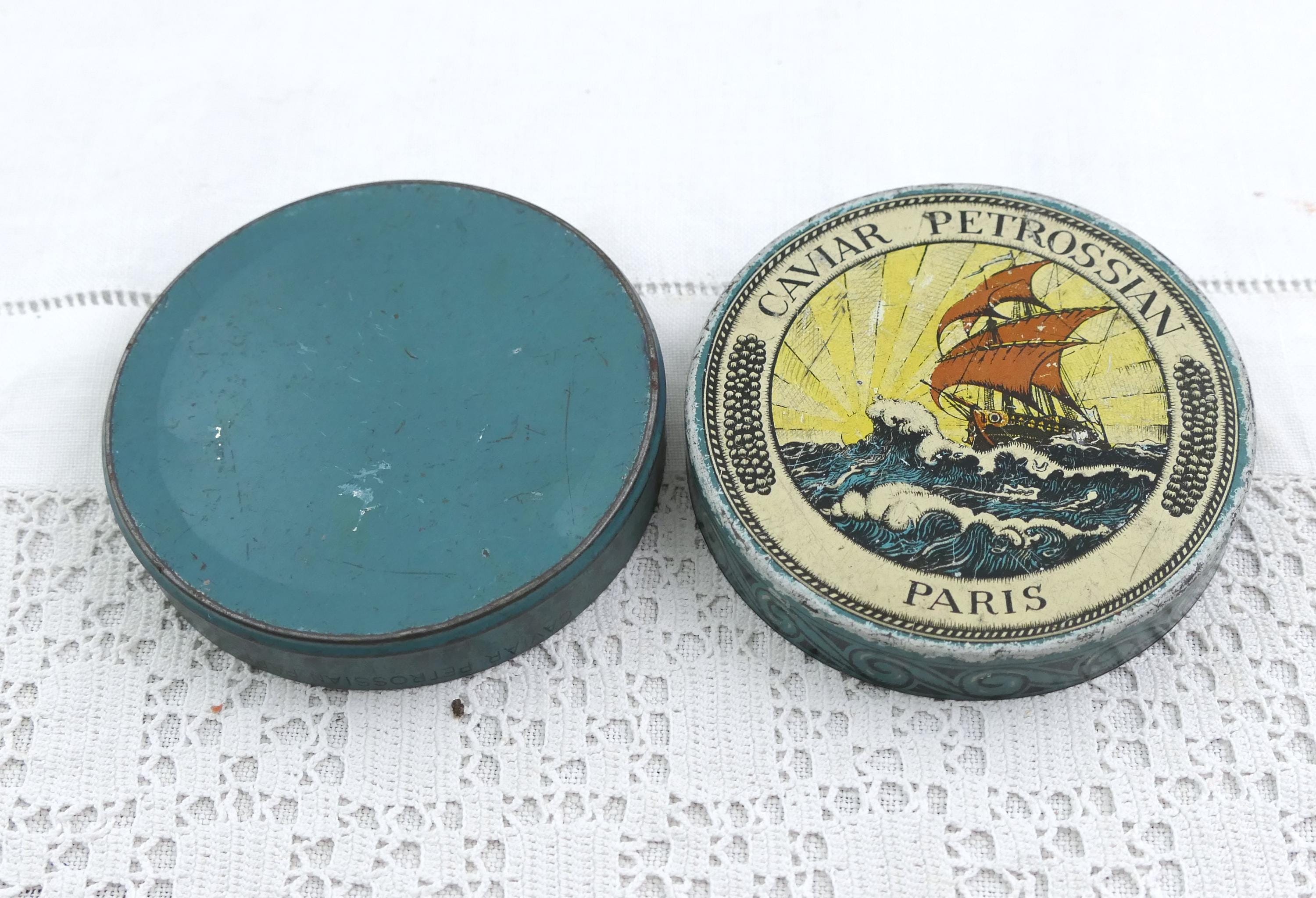 Vintage French round Petrossian caviar tin. Made of printed metal. Ca mid 1900s.