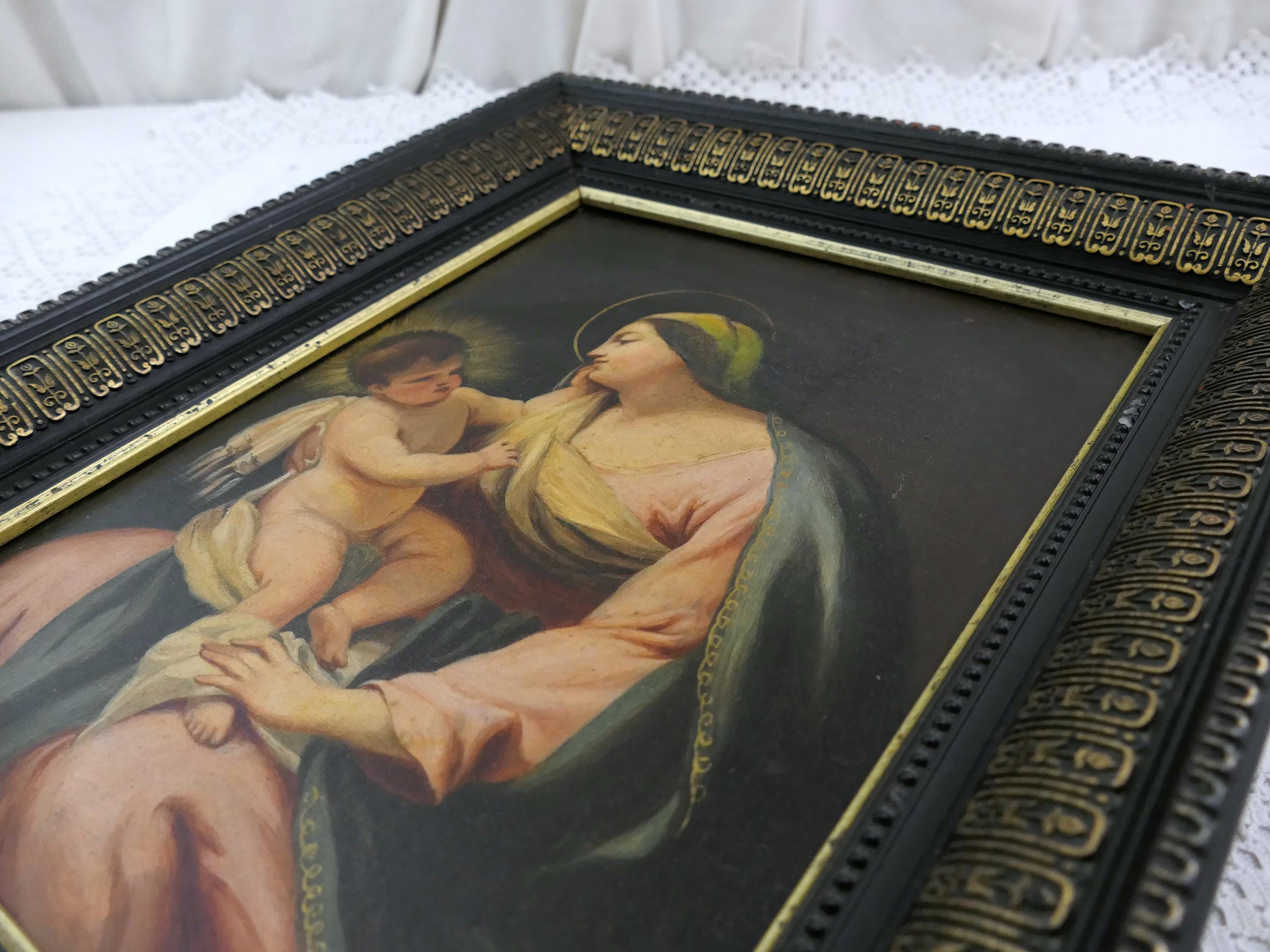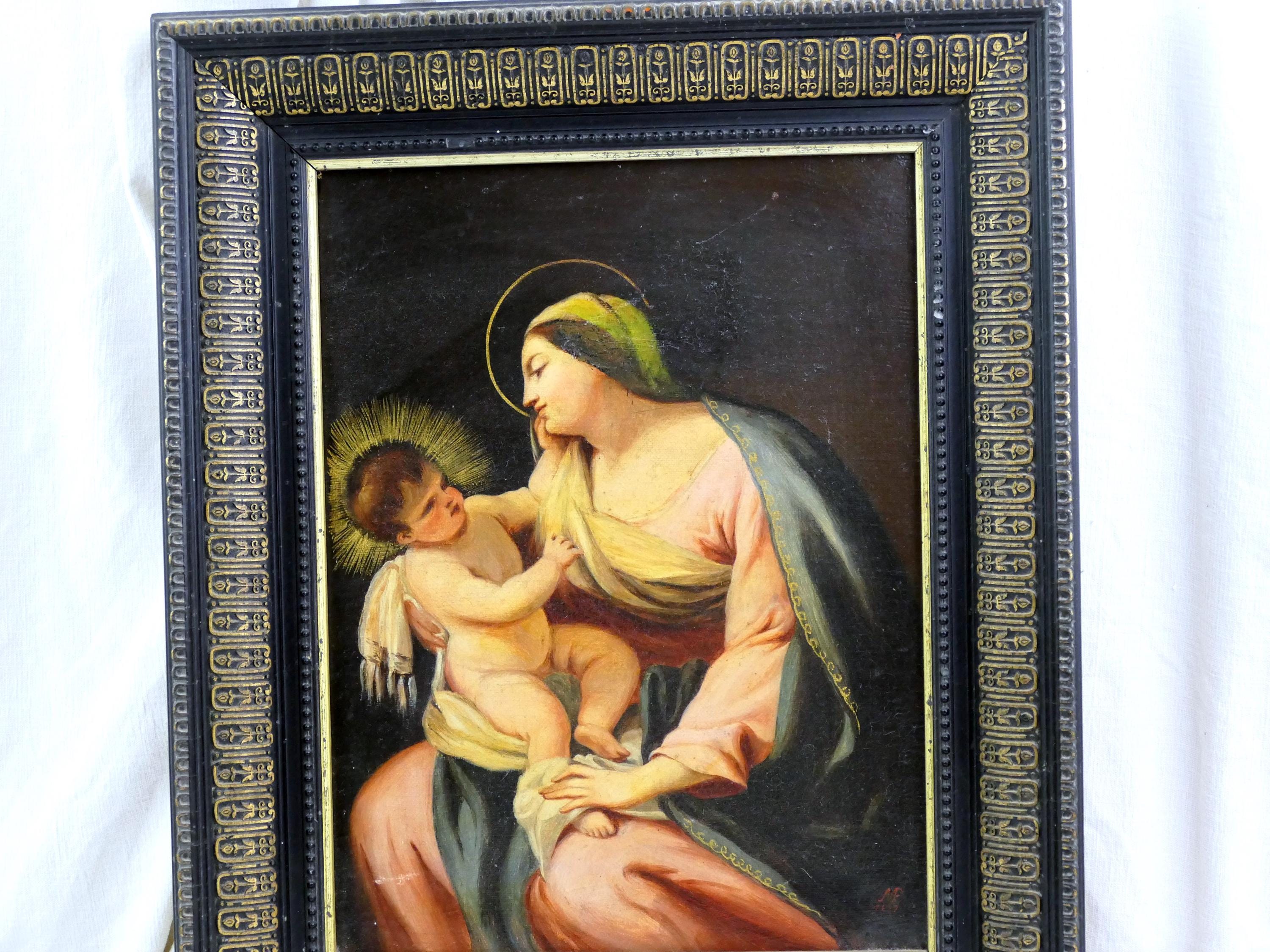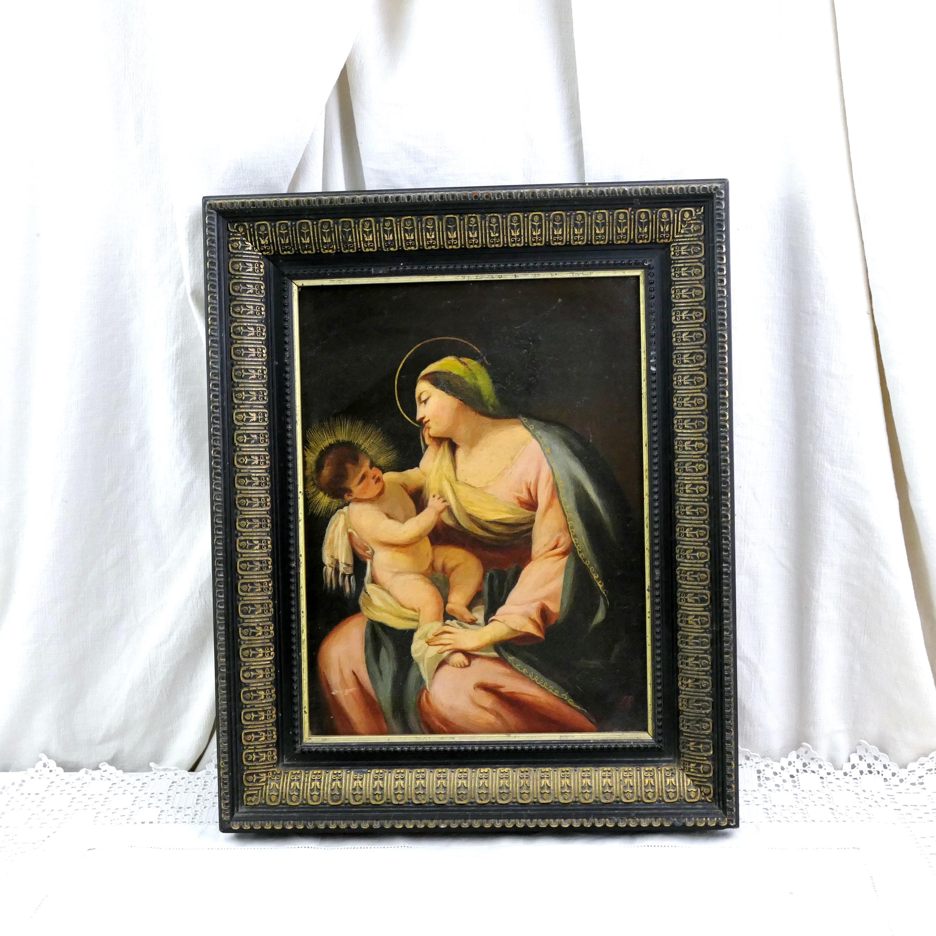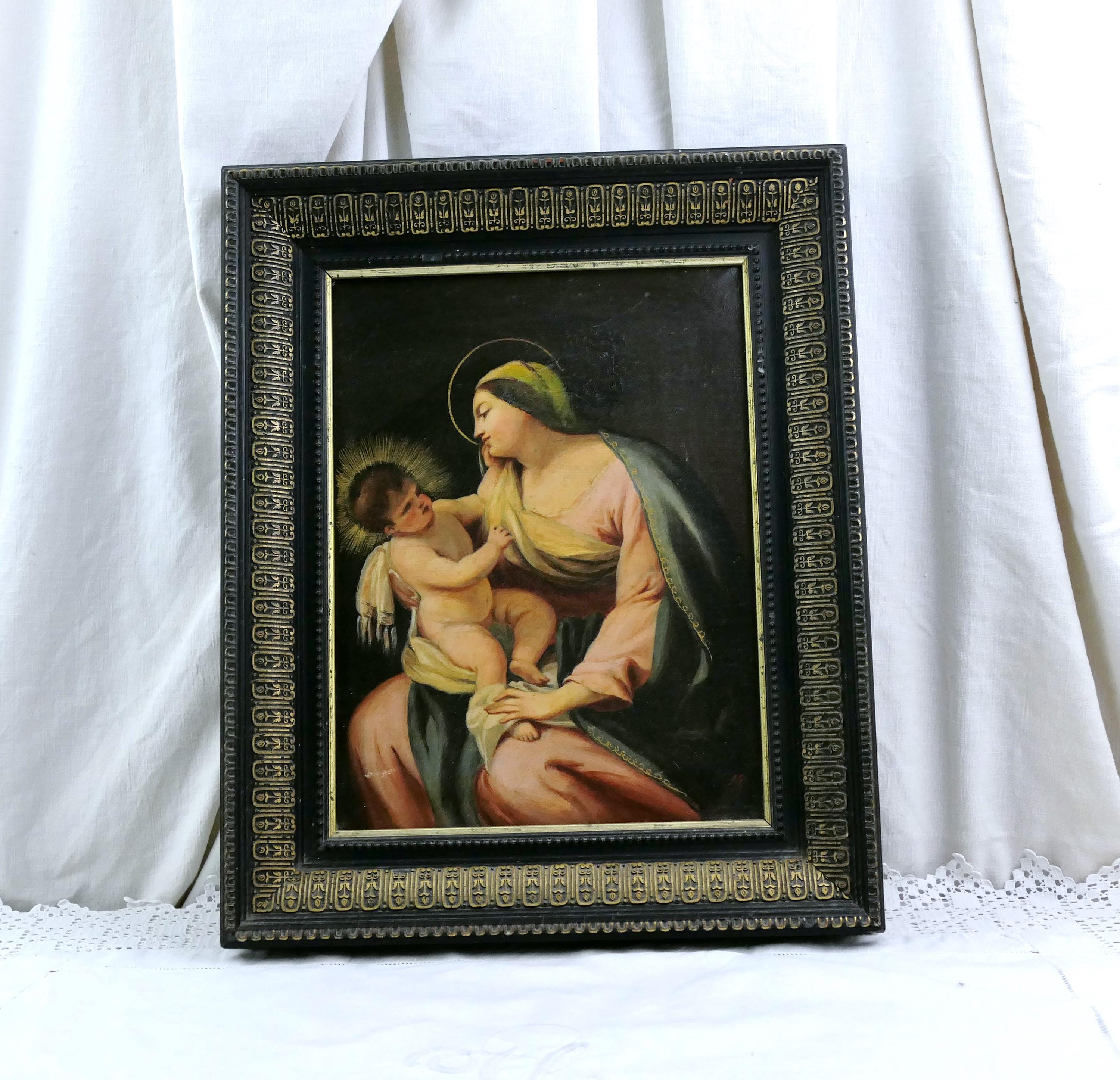 Antique French framed painting of Virgin Mary with baby Jesus. Oil paint on canvas. Signed MP 1887. Ca 1800s.