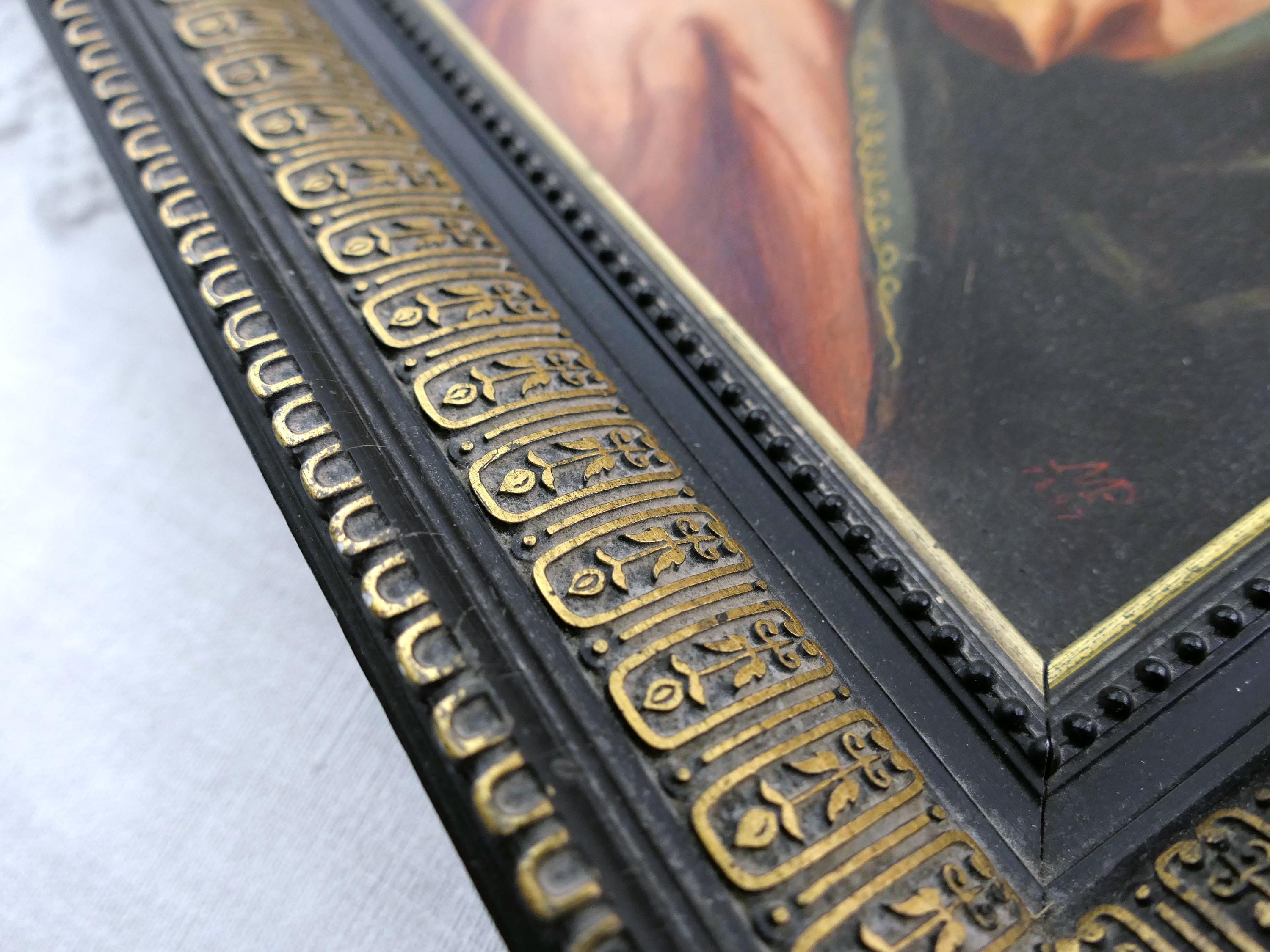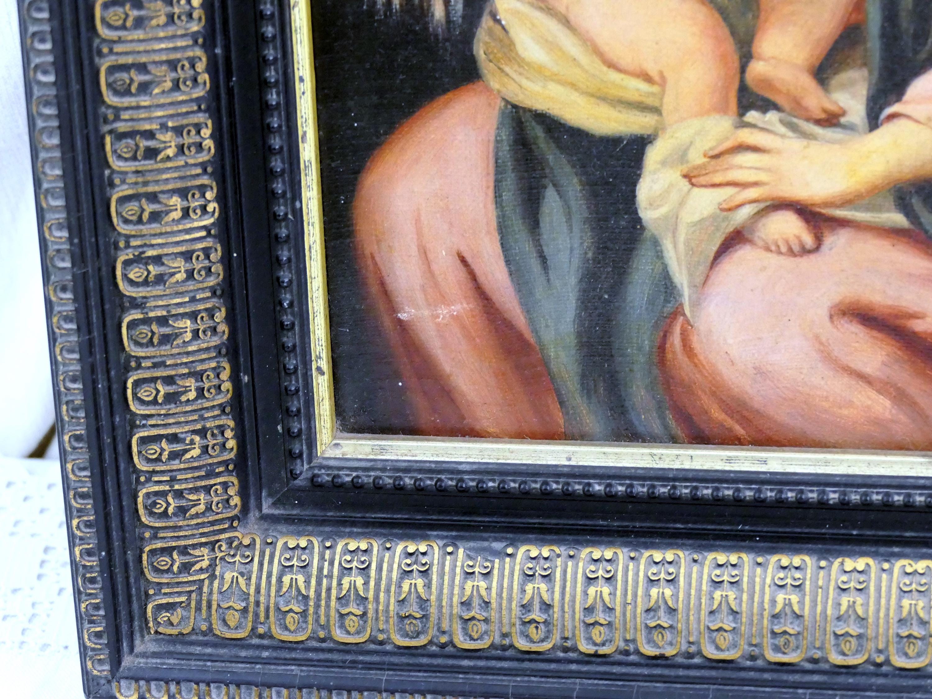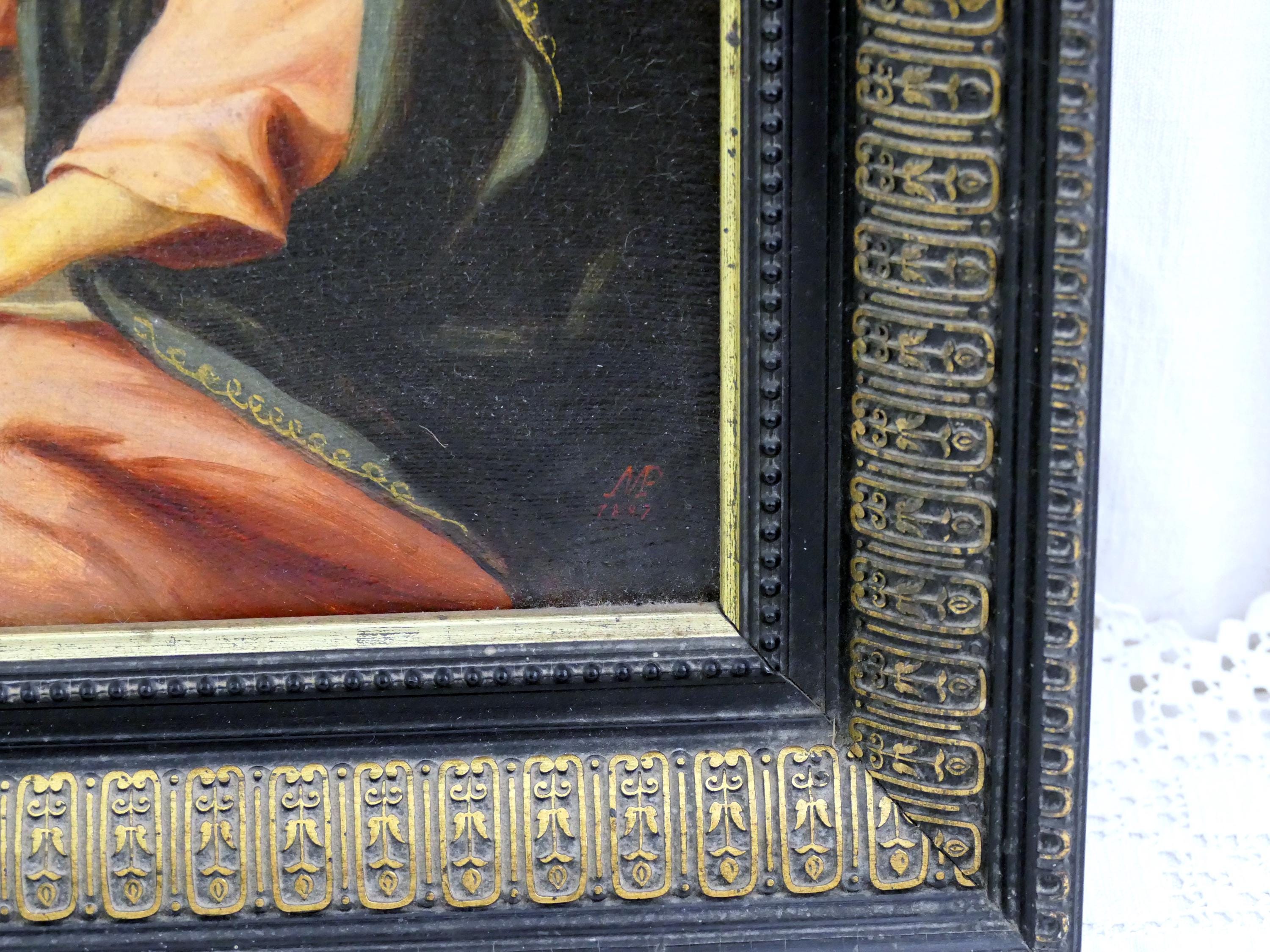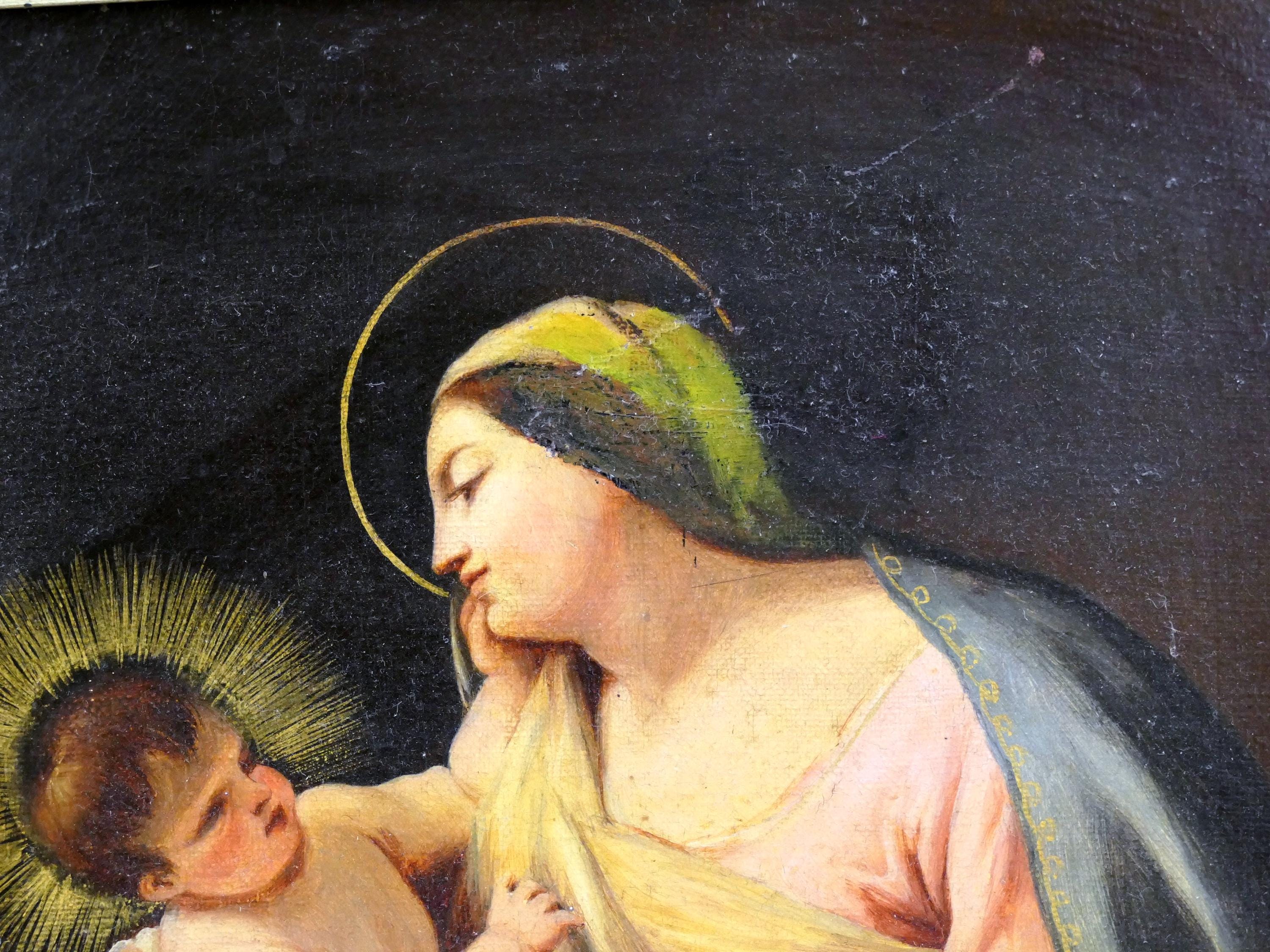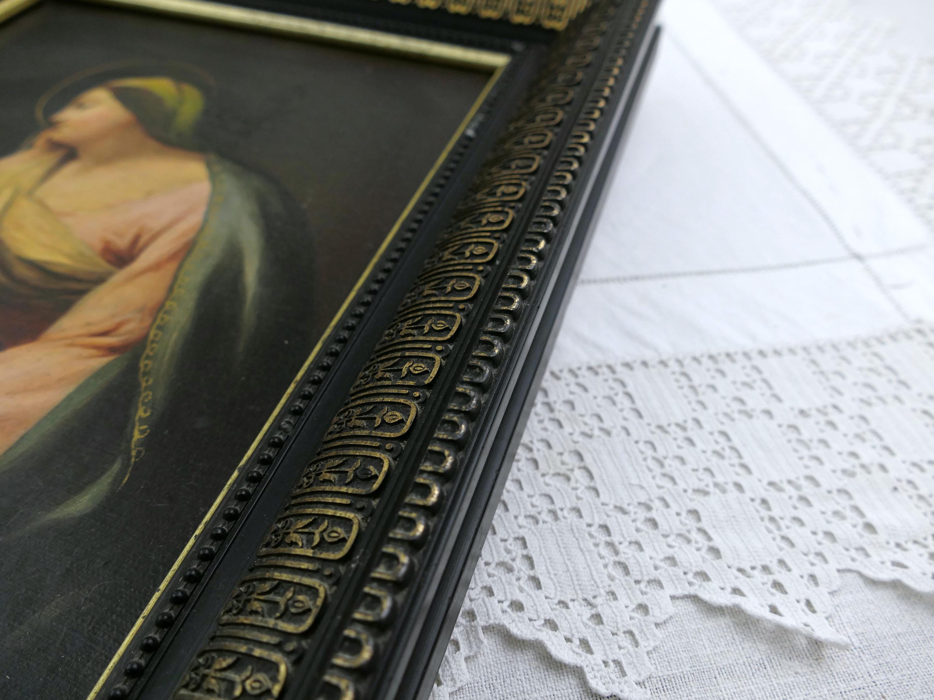 Antique French framed painting of Virgin Mary with baby Jesus. Oil paint on canvas. Signed MP 1887. Ca 1800s.