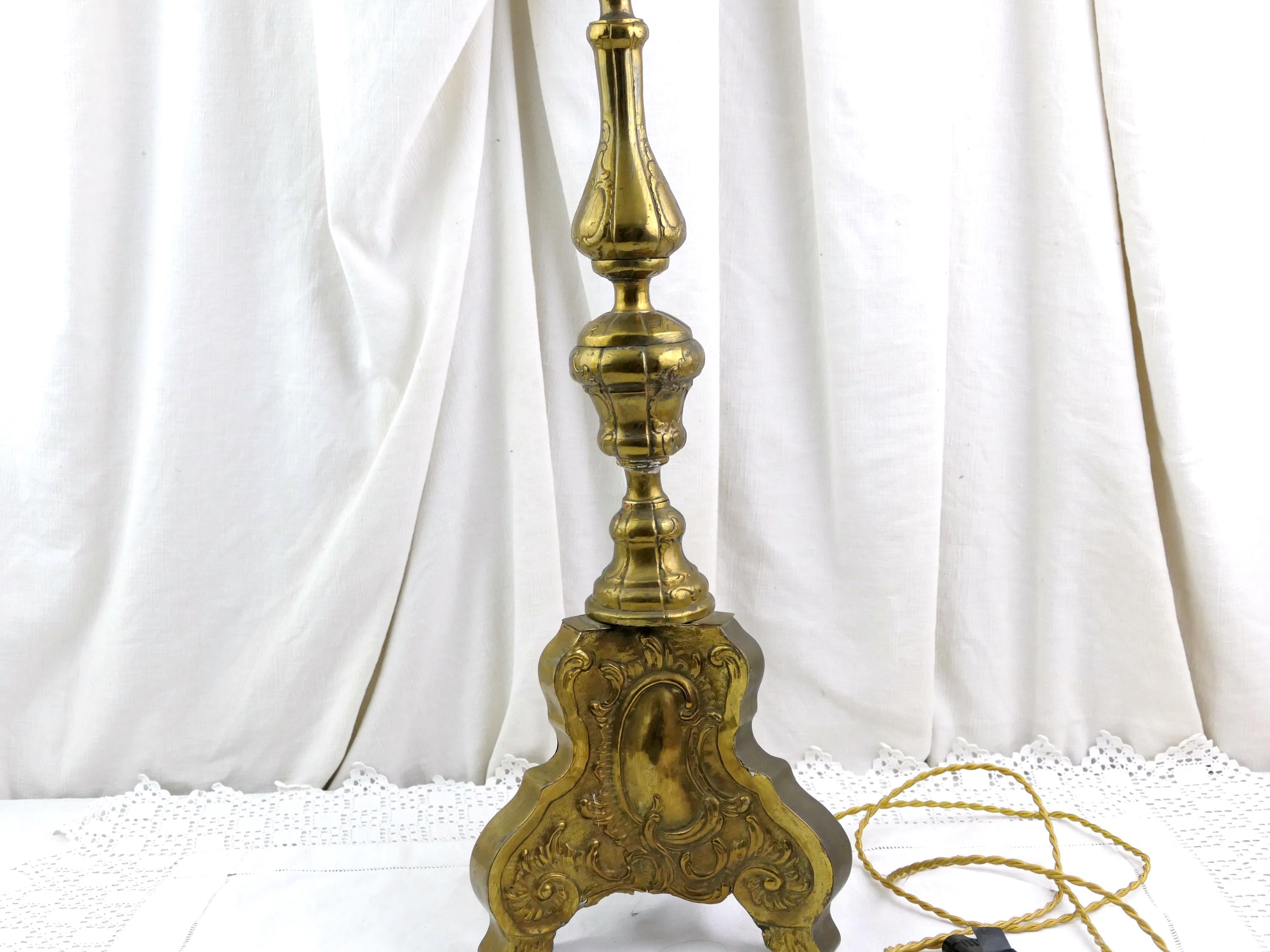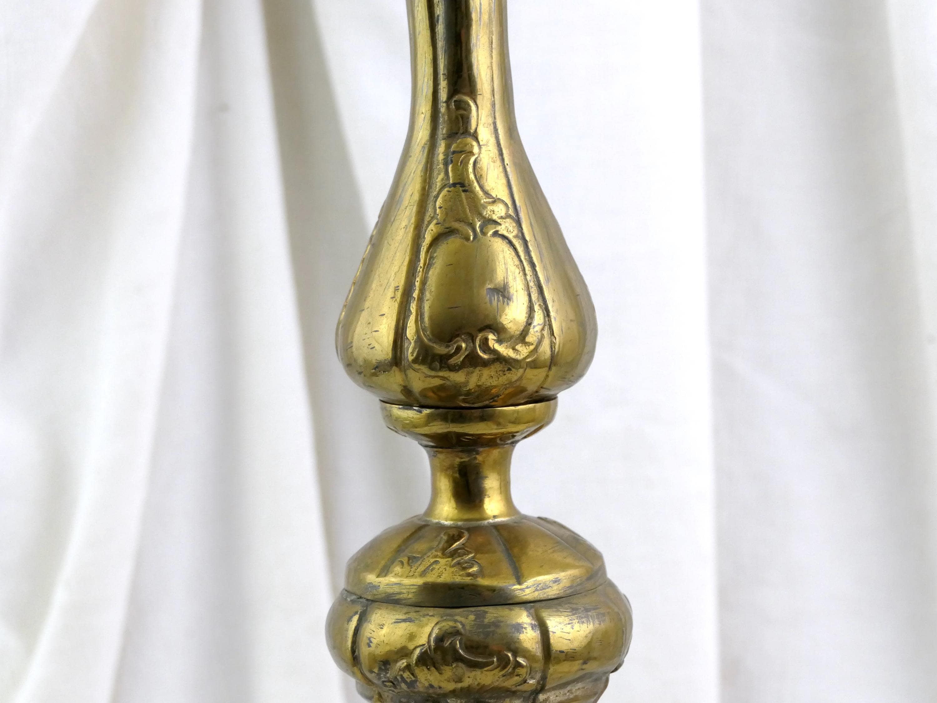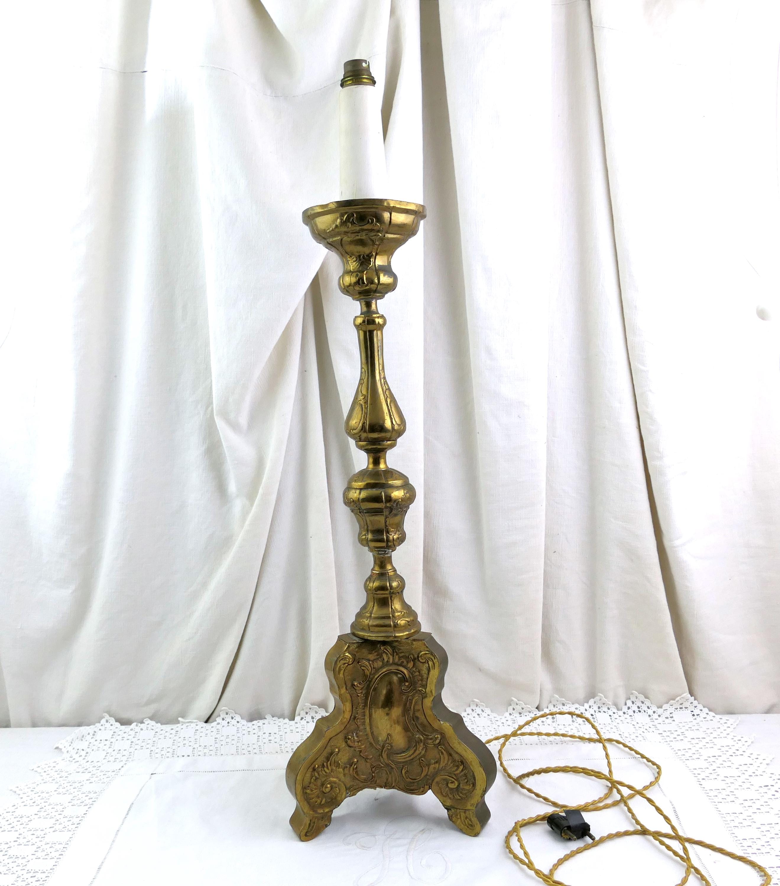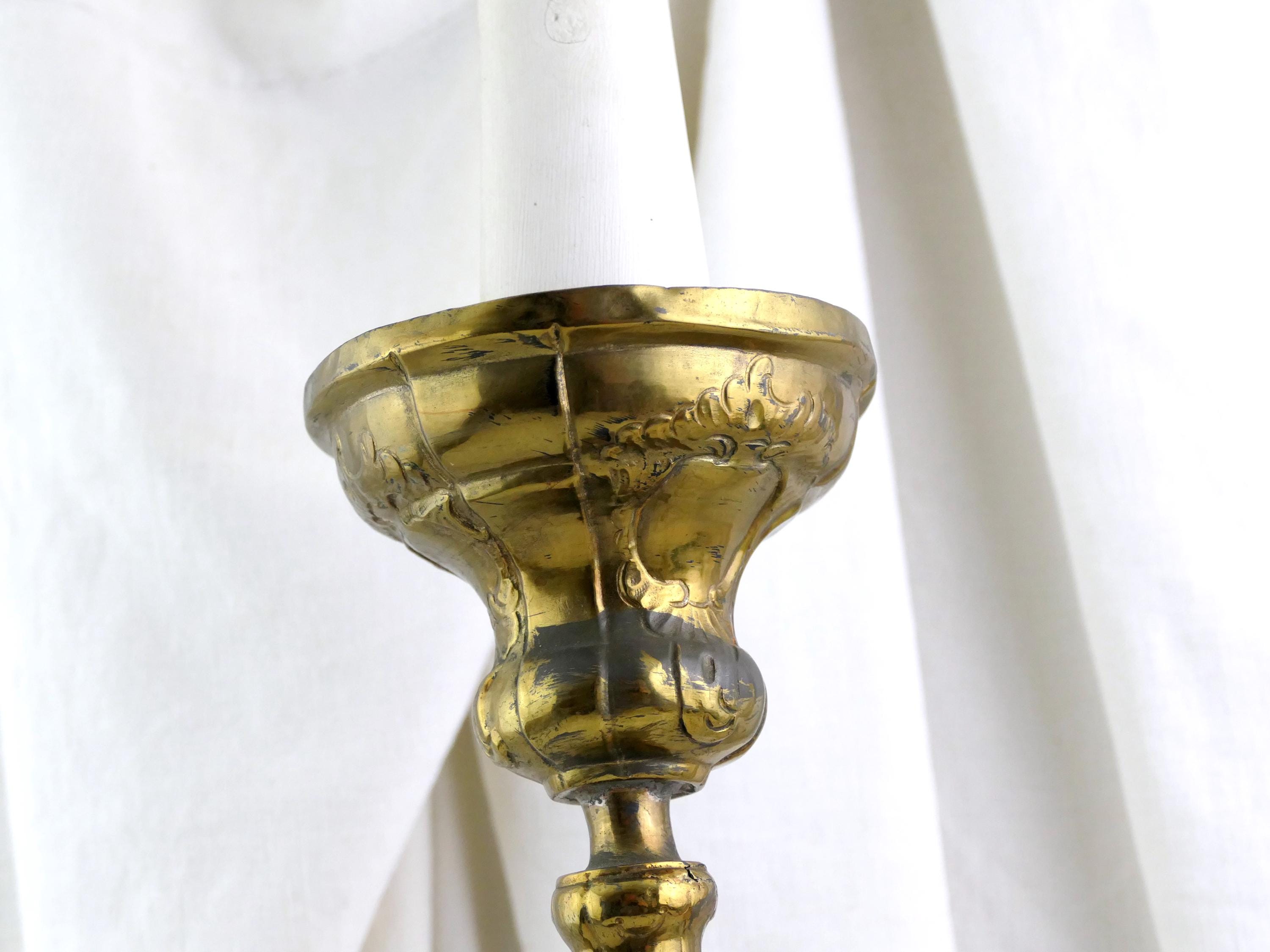 Tall antique French 18th Century liturgical candleholder. Made of gilded pressed brass metal.