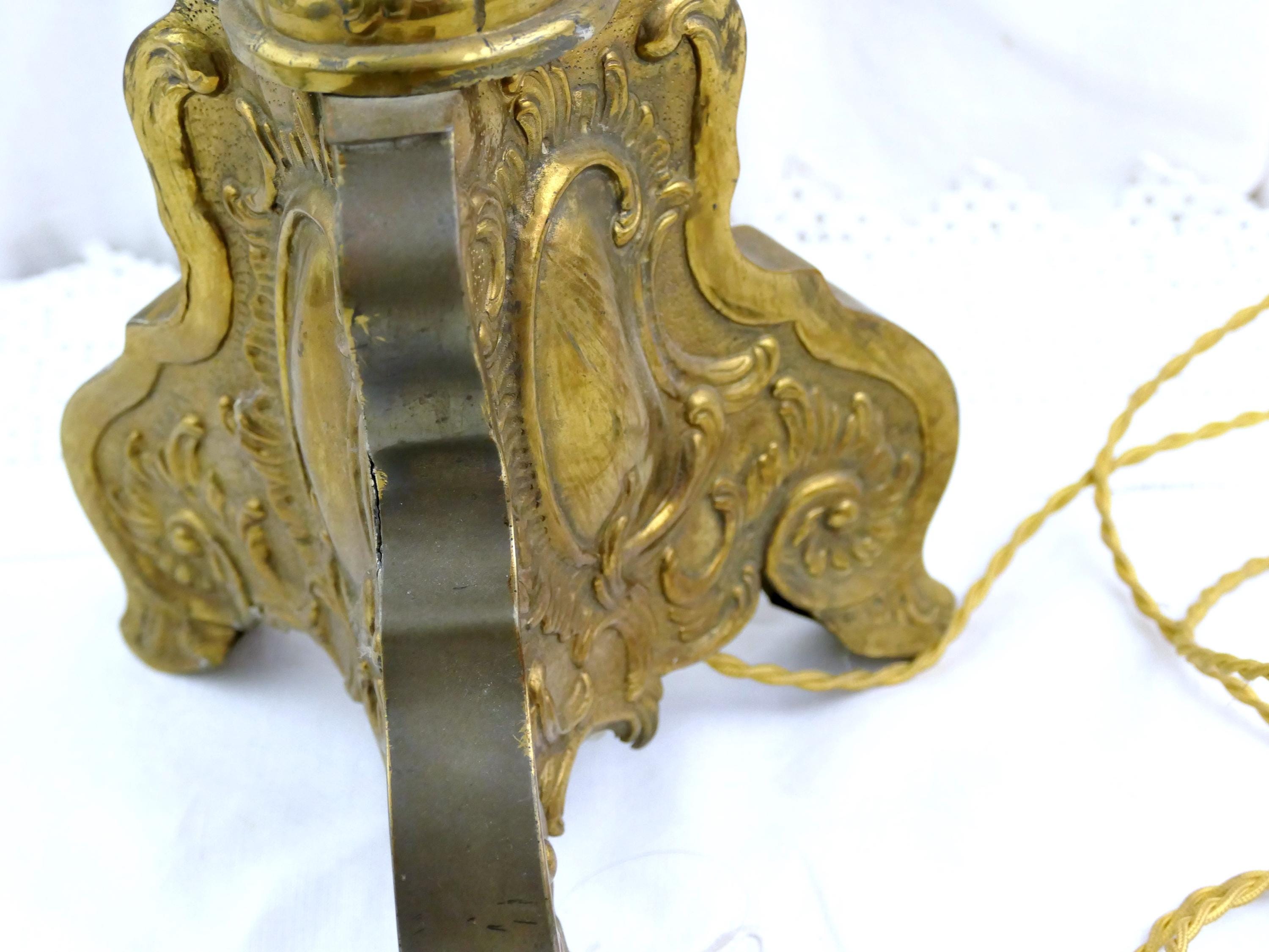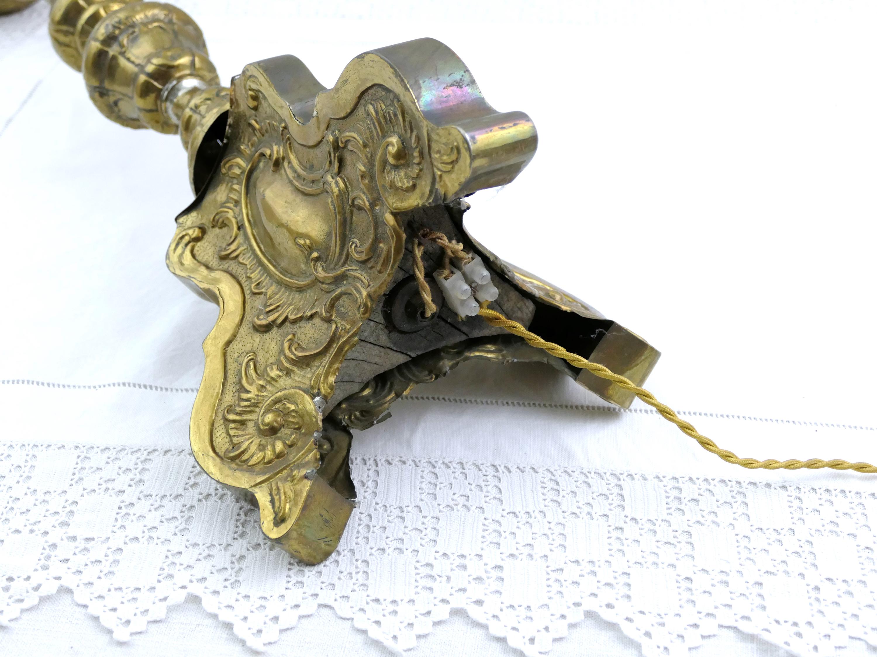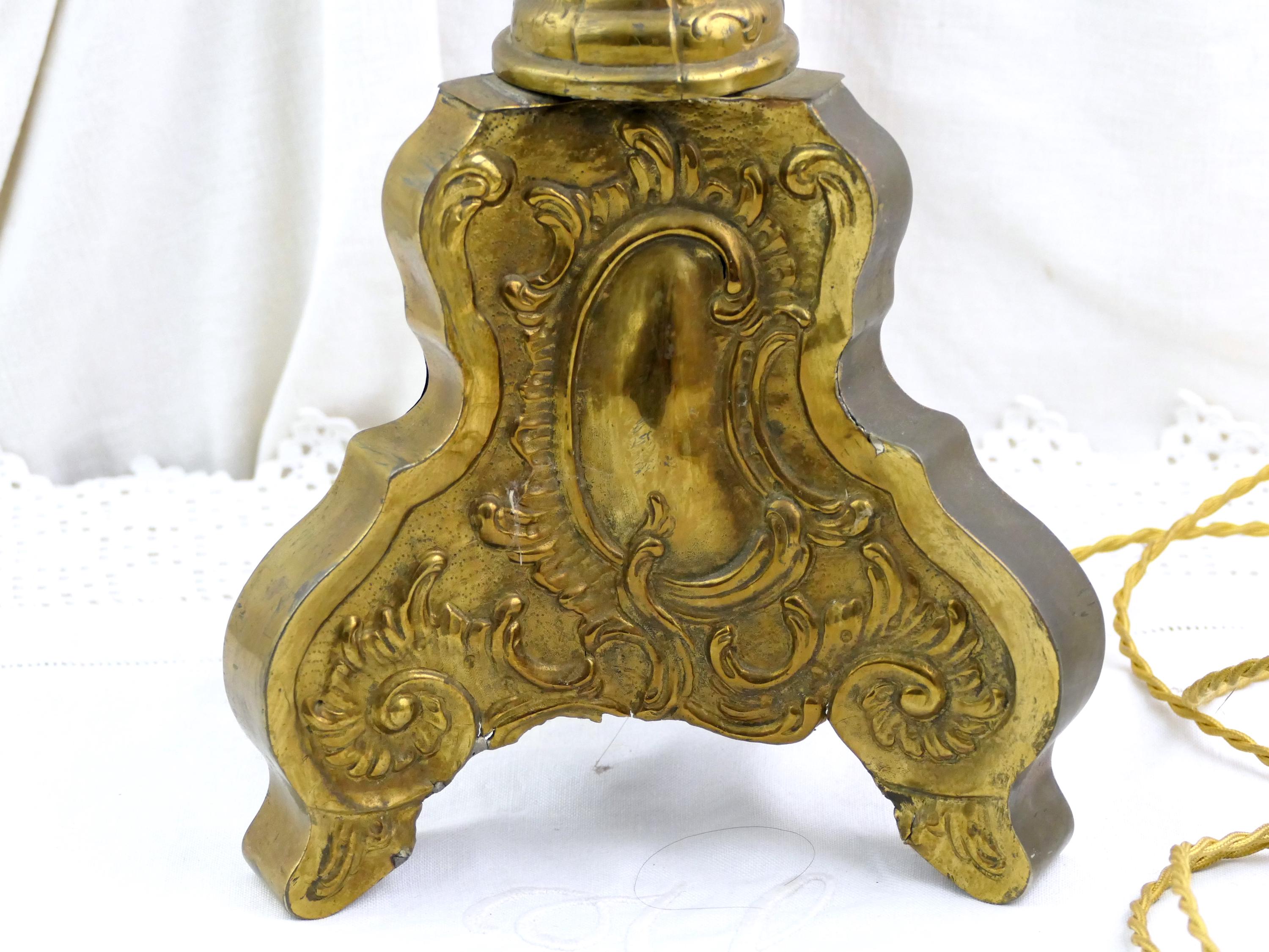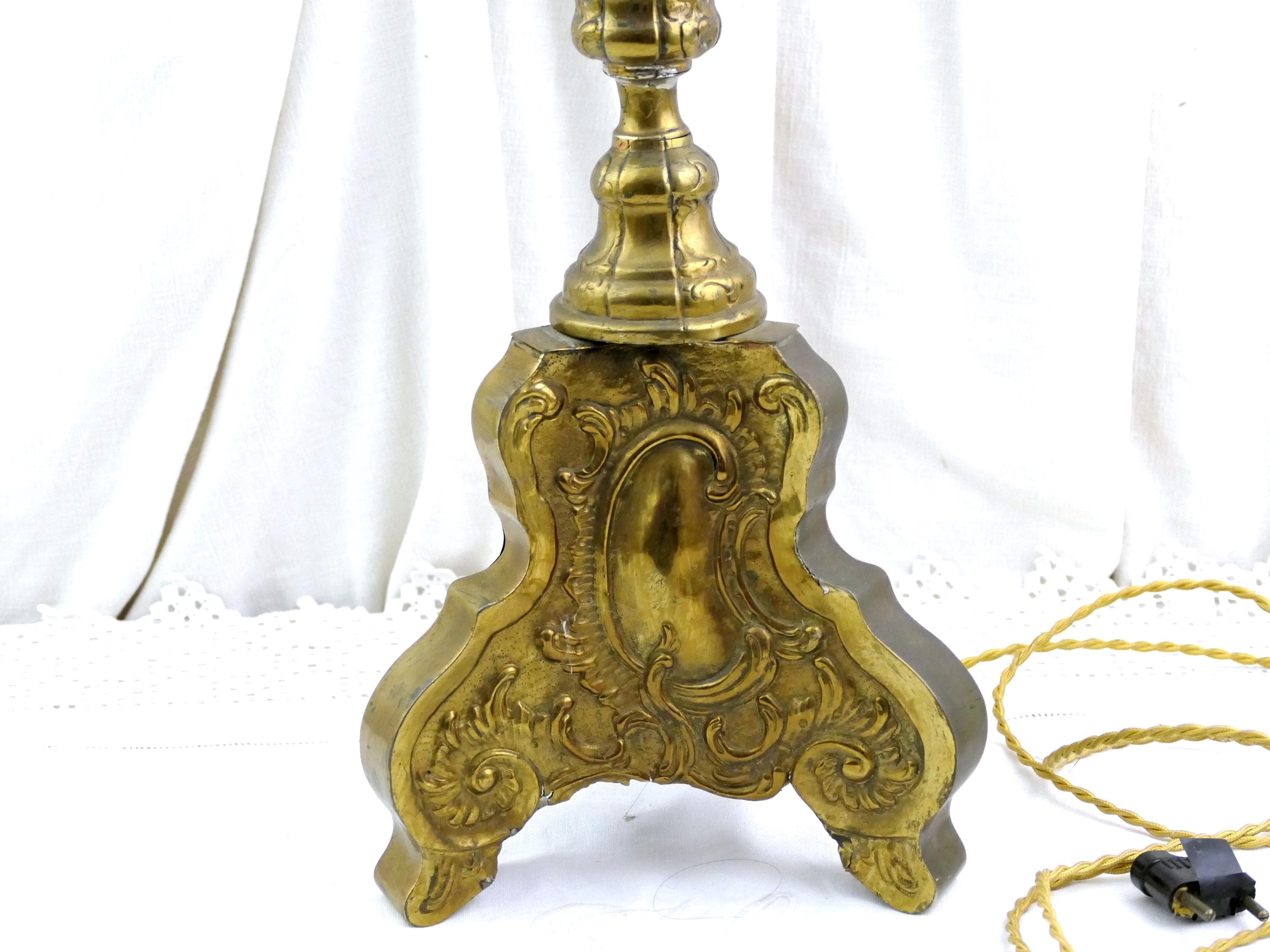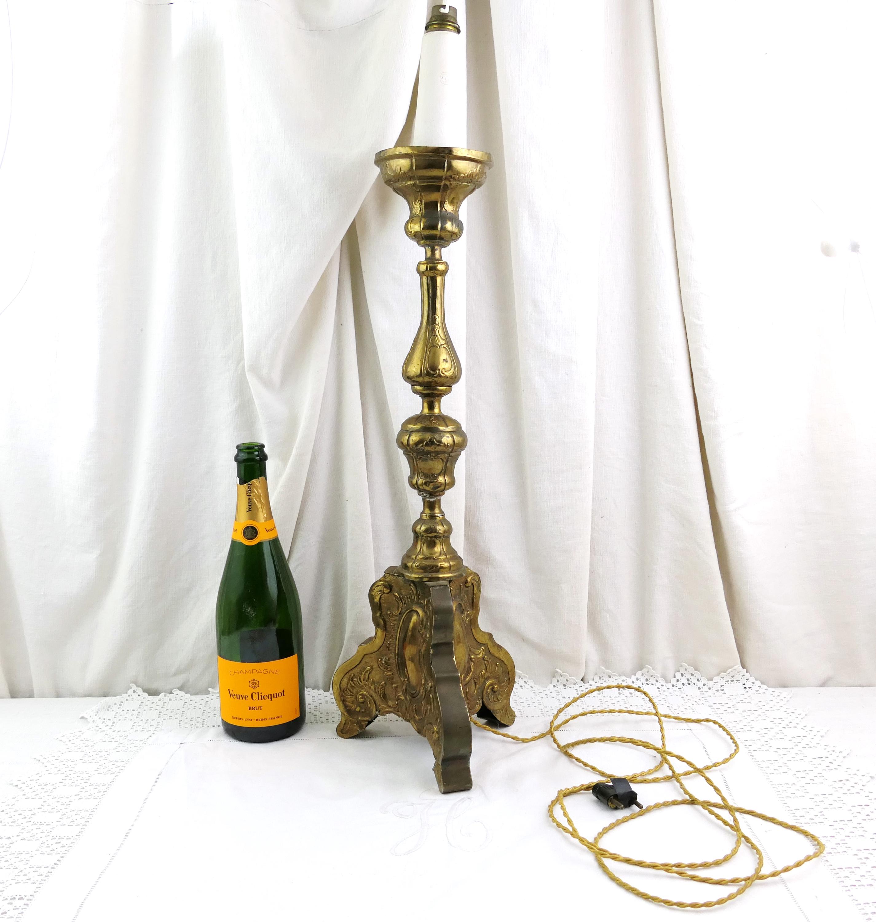 Tall antique French 18th Century liturgical candleholder. Made of gilded pressed brass metal.