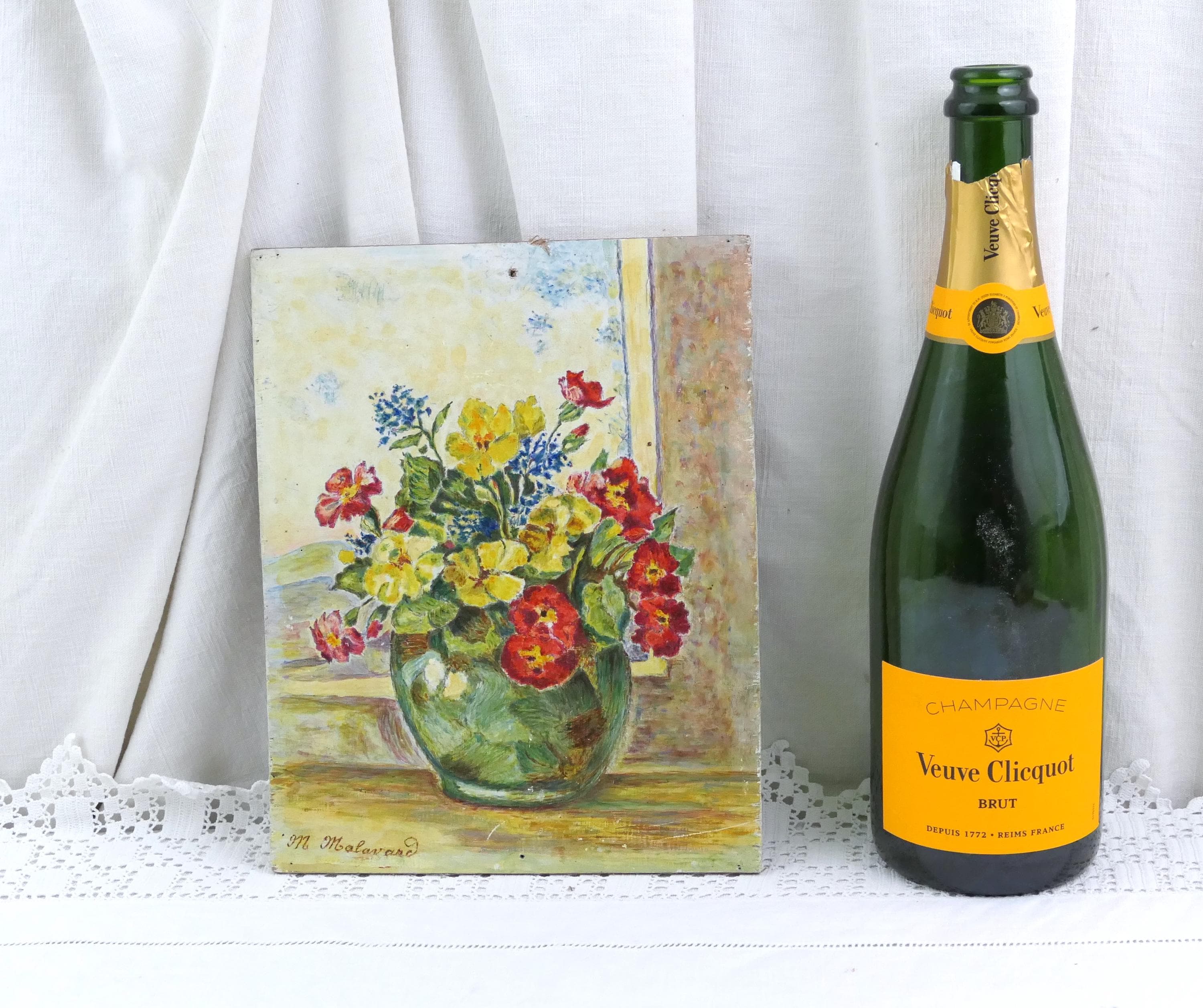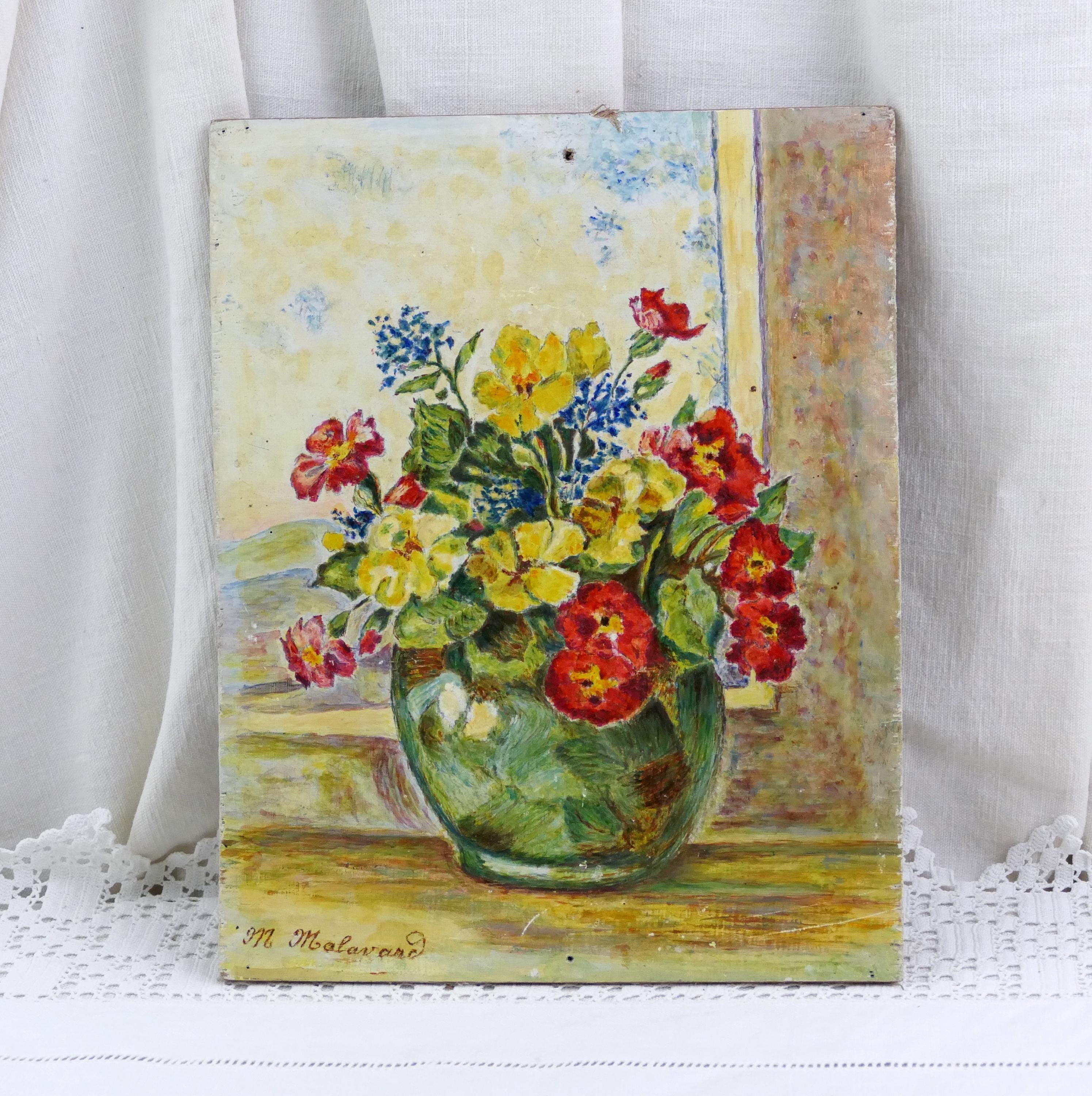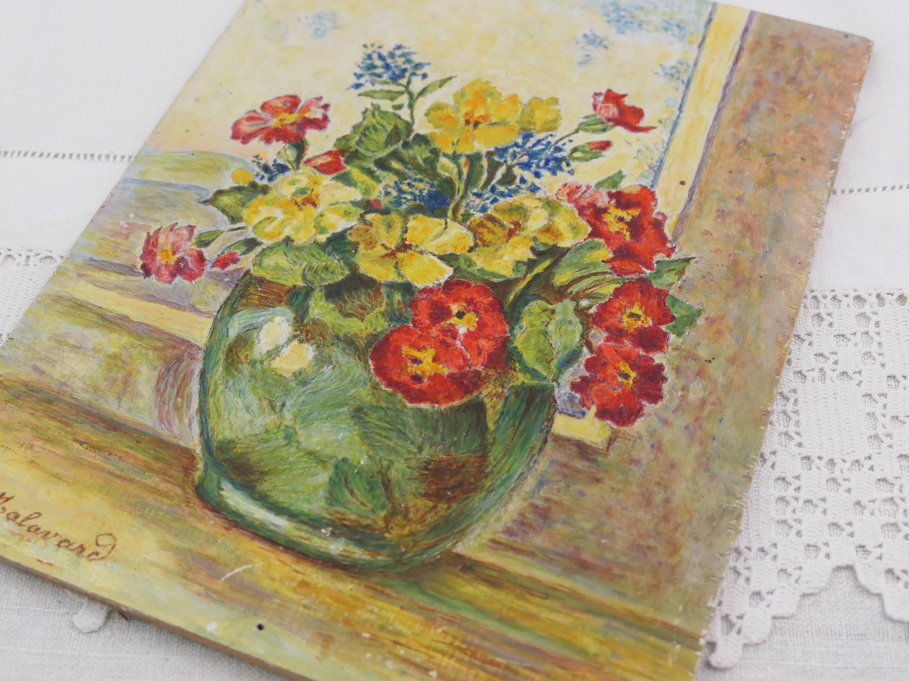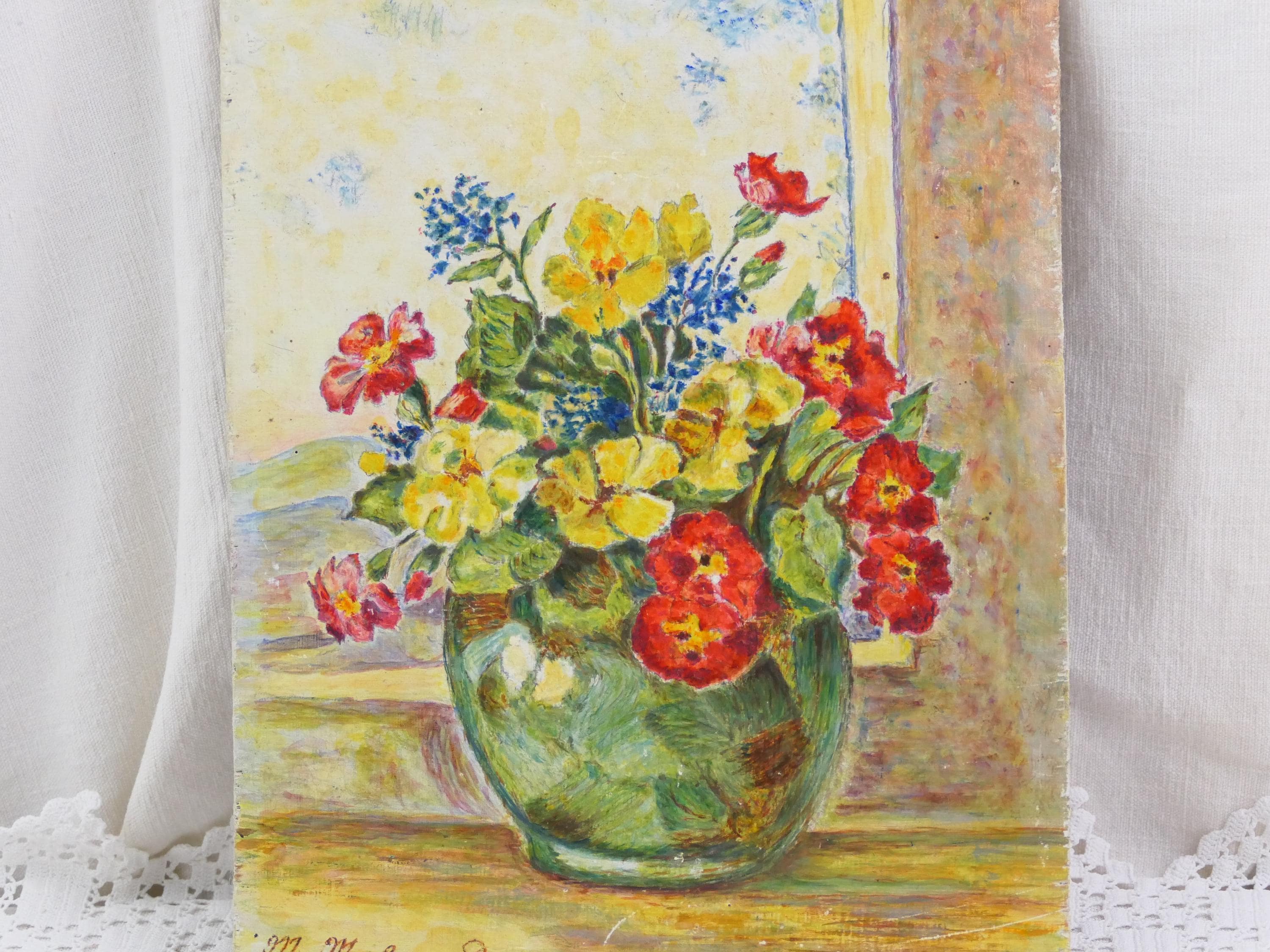 Vintage unframed still life painting of flowers in a vase. Hand painted varnished gouache paint on wooden board. Ca mid to late 1900s.