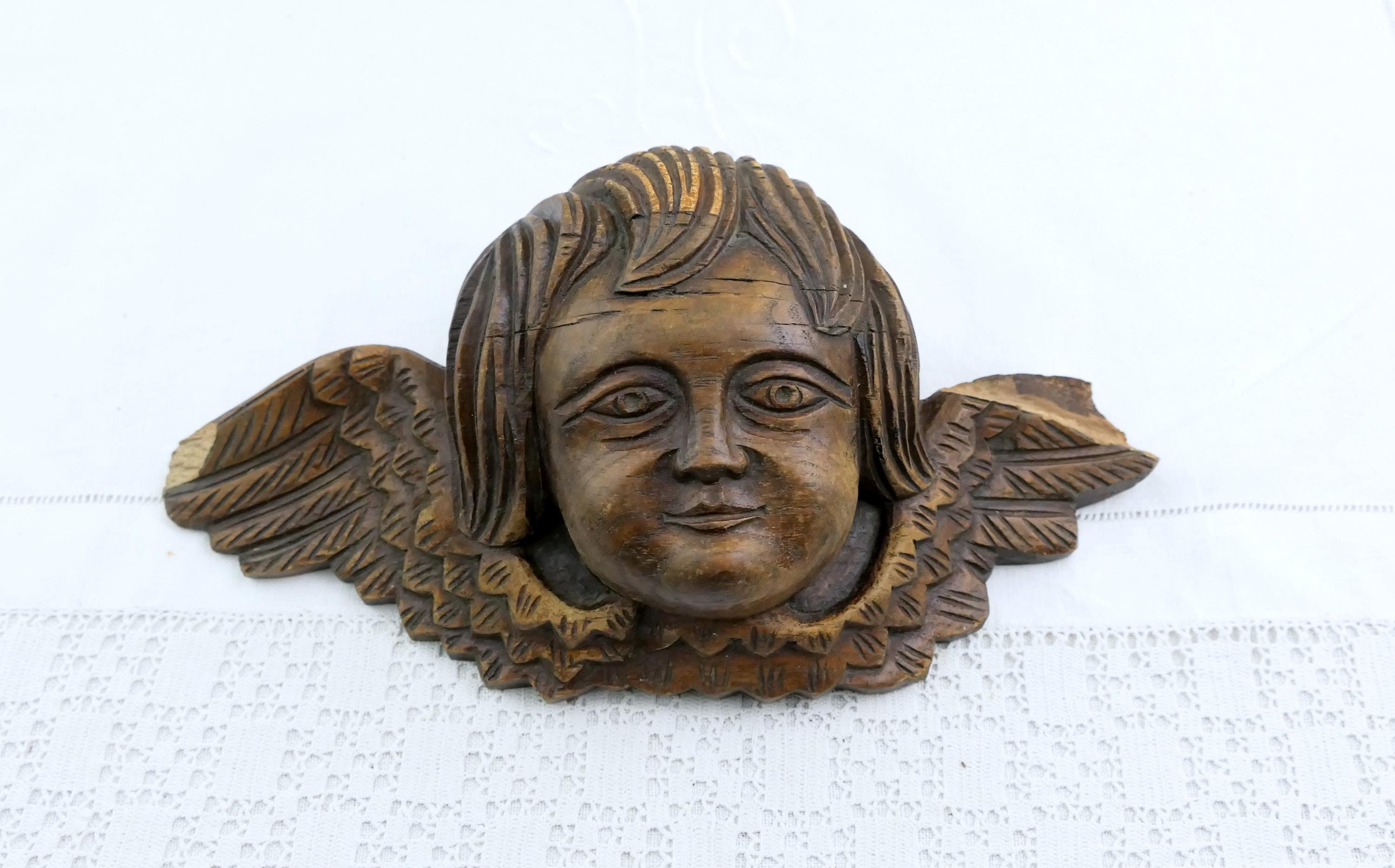 Antique wall hanging cherub sculpture. Made of carved oak wood. Ca 1700s.