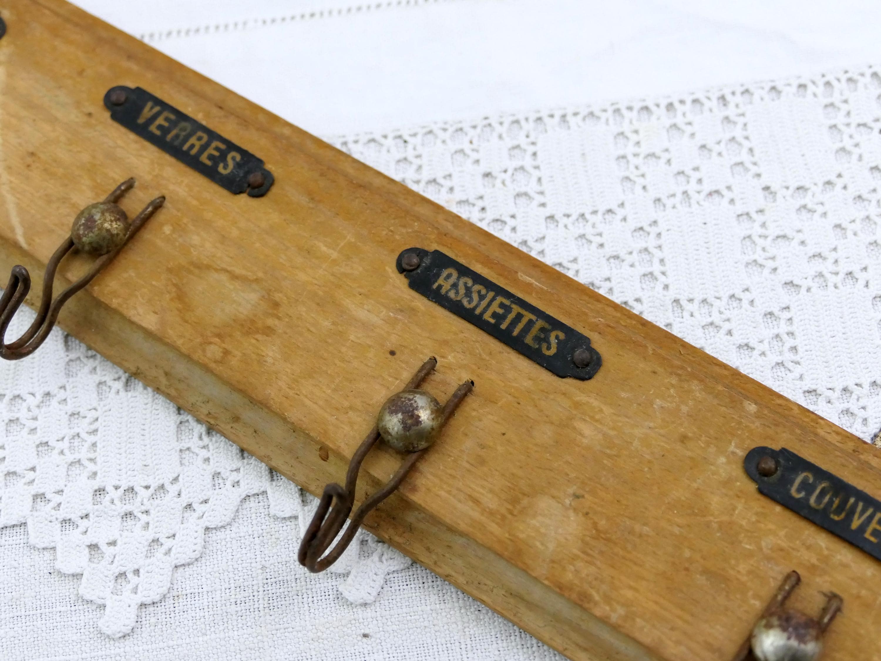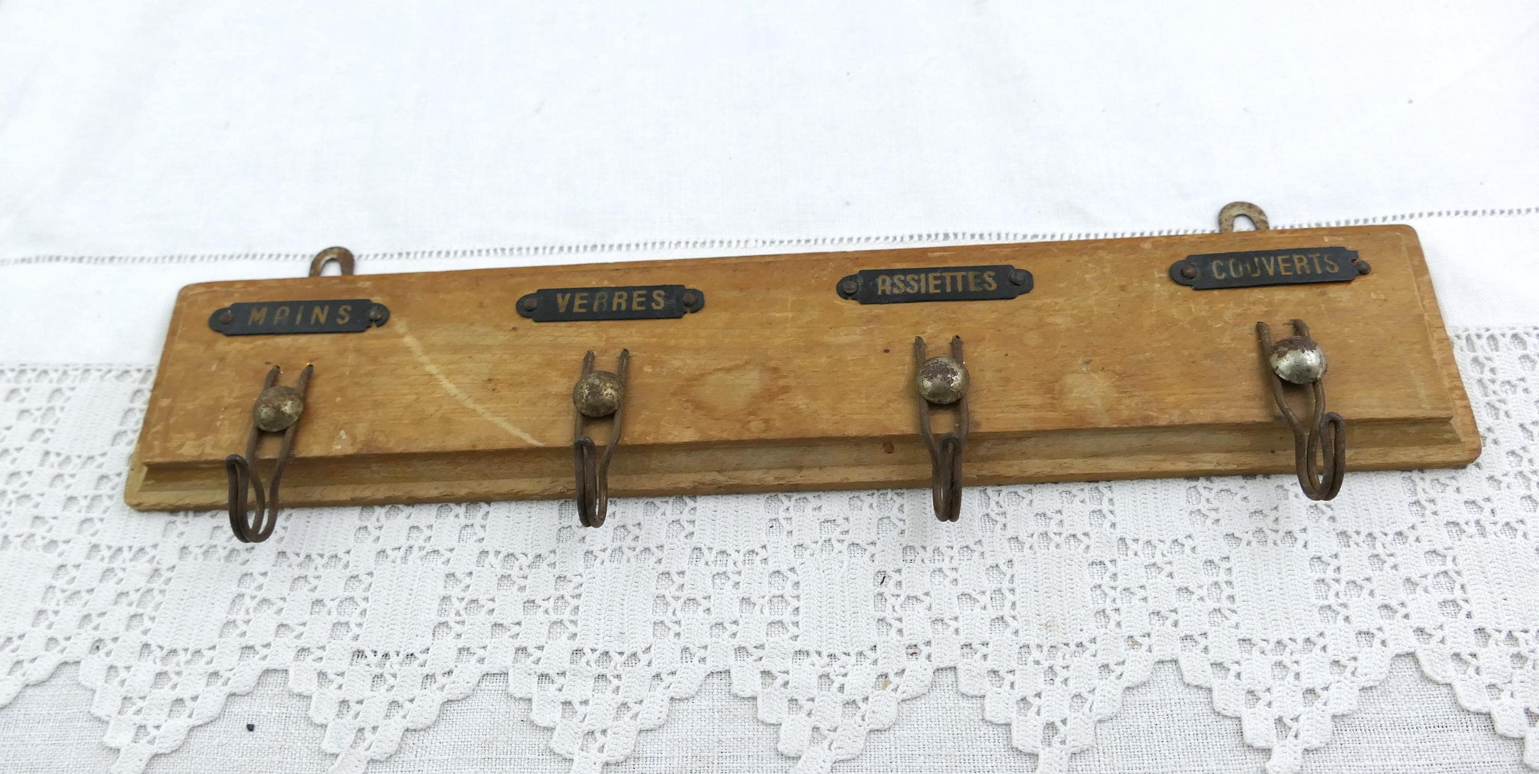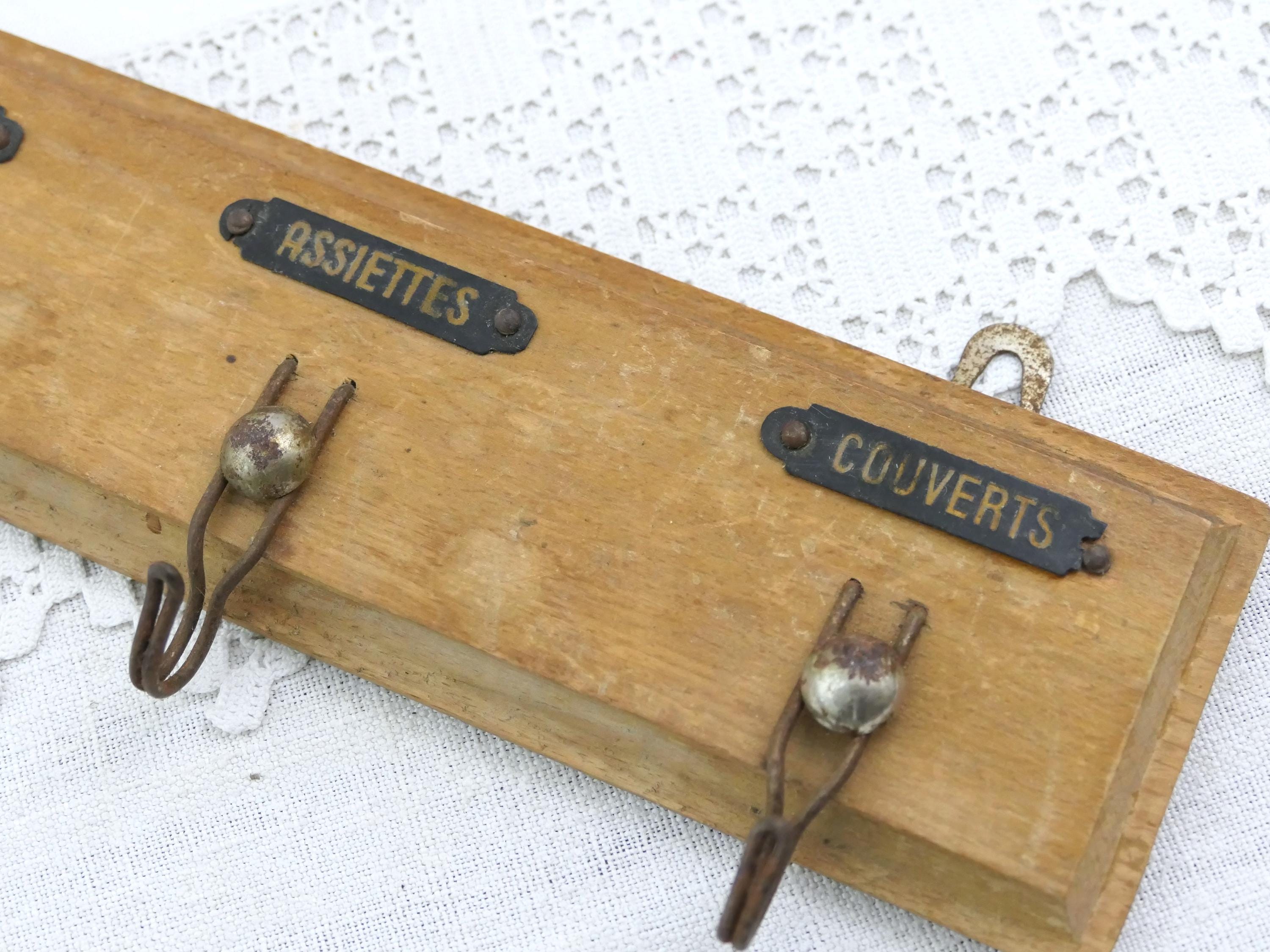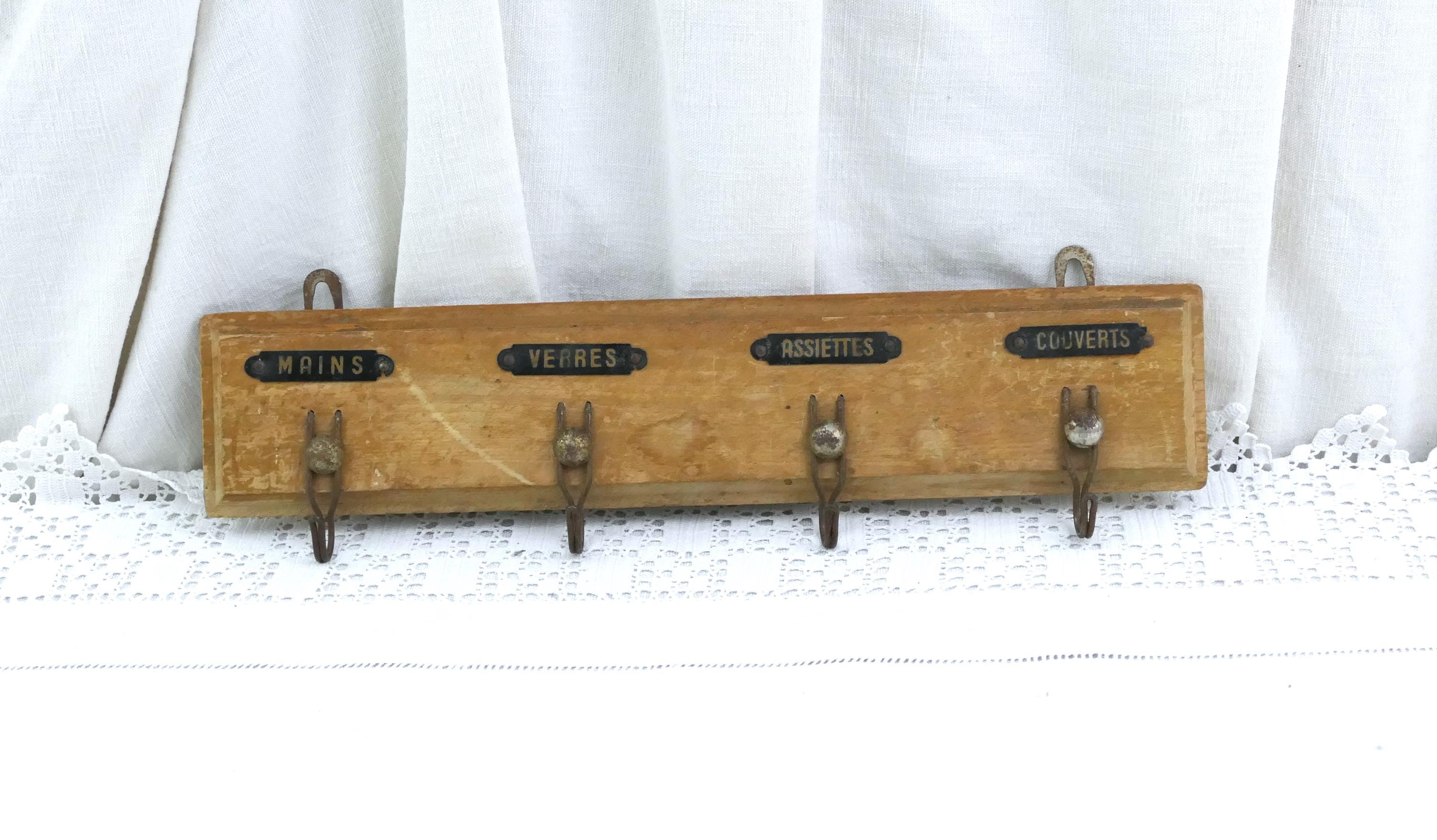 Vintage French 4 hook tea towel rack. Traditionally used in French kitchens to keep towels separate, with a hook for each different towels, hands, glasses, plates cutlery. Made of chrome plated metal mounted on wood. Circa 1930s.