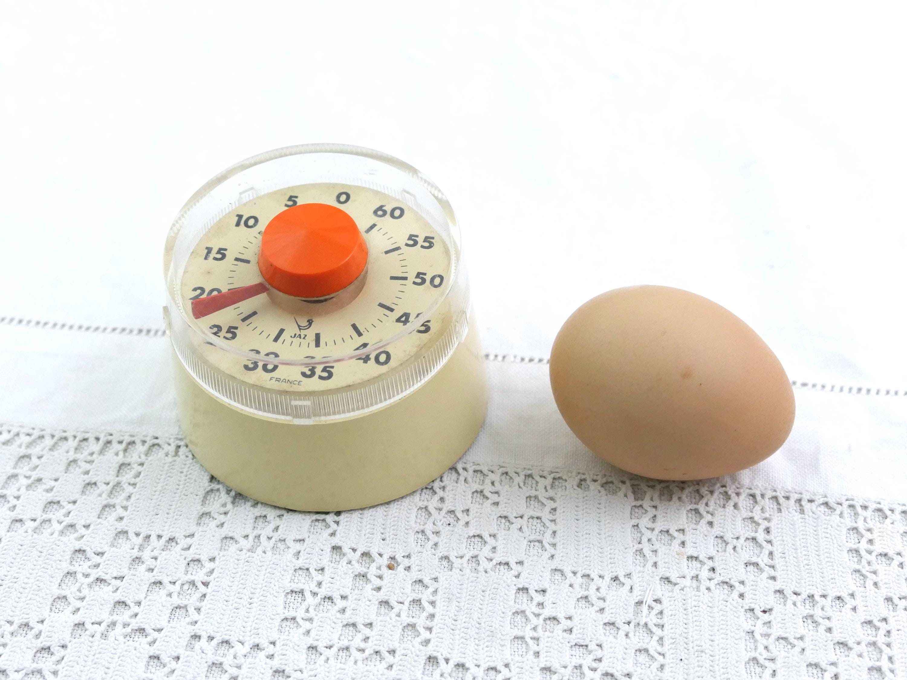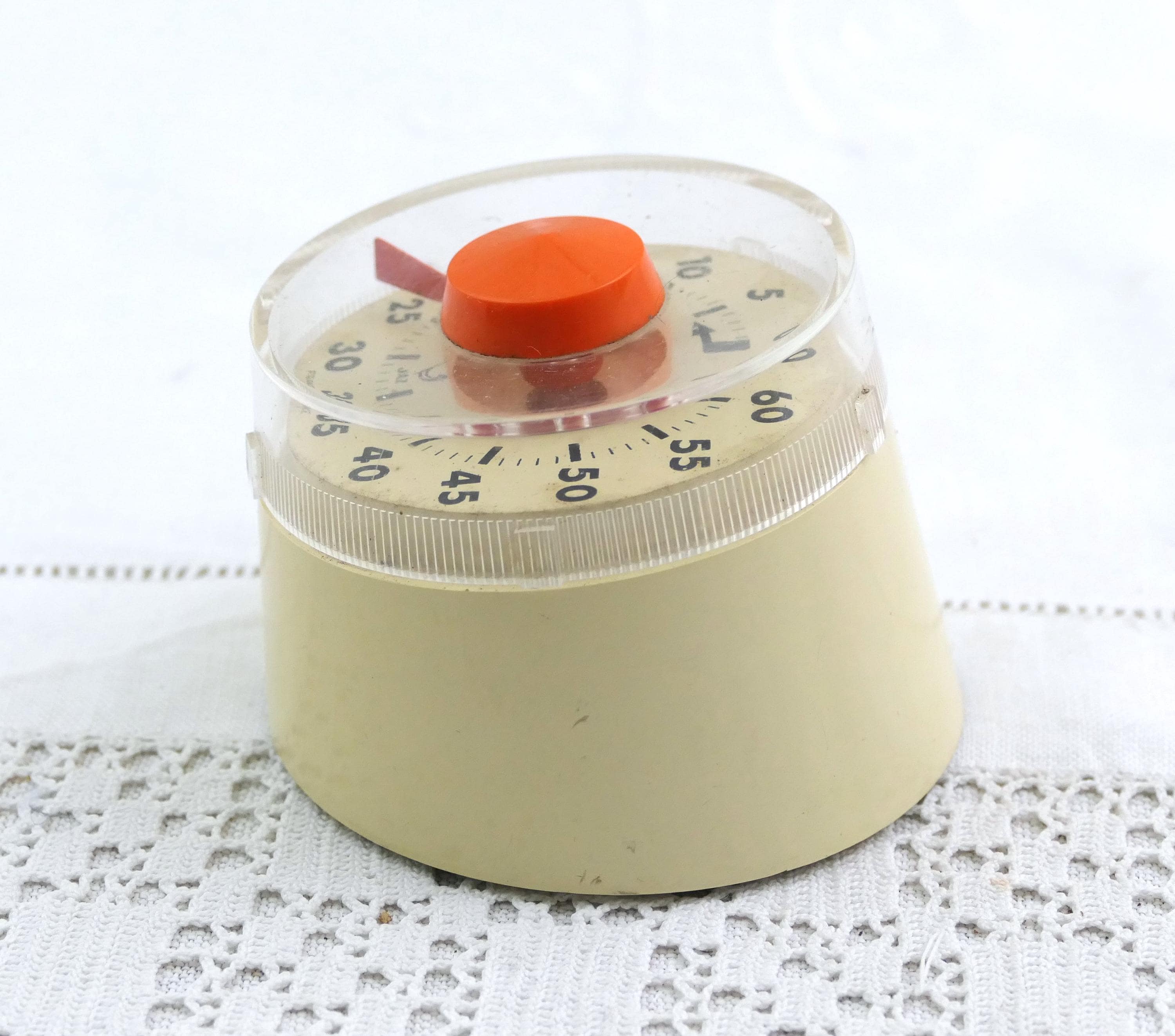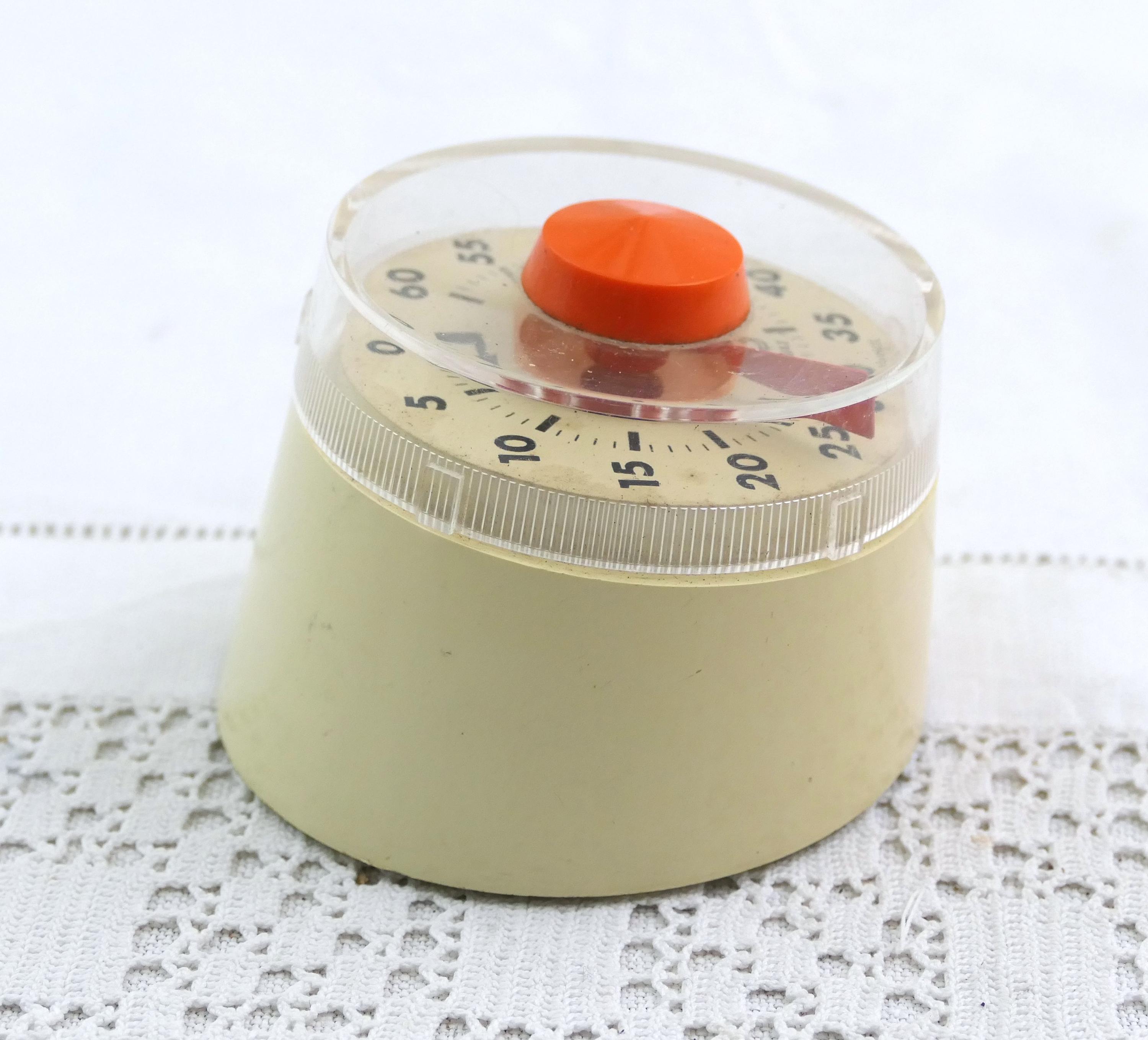 Vintage French Mid Century kitchen 60 minute timer by Jaz. Made of plastic with metal. Ca 1960s.