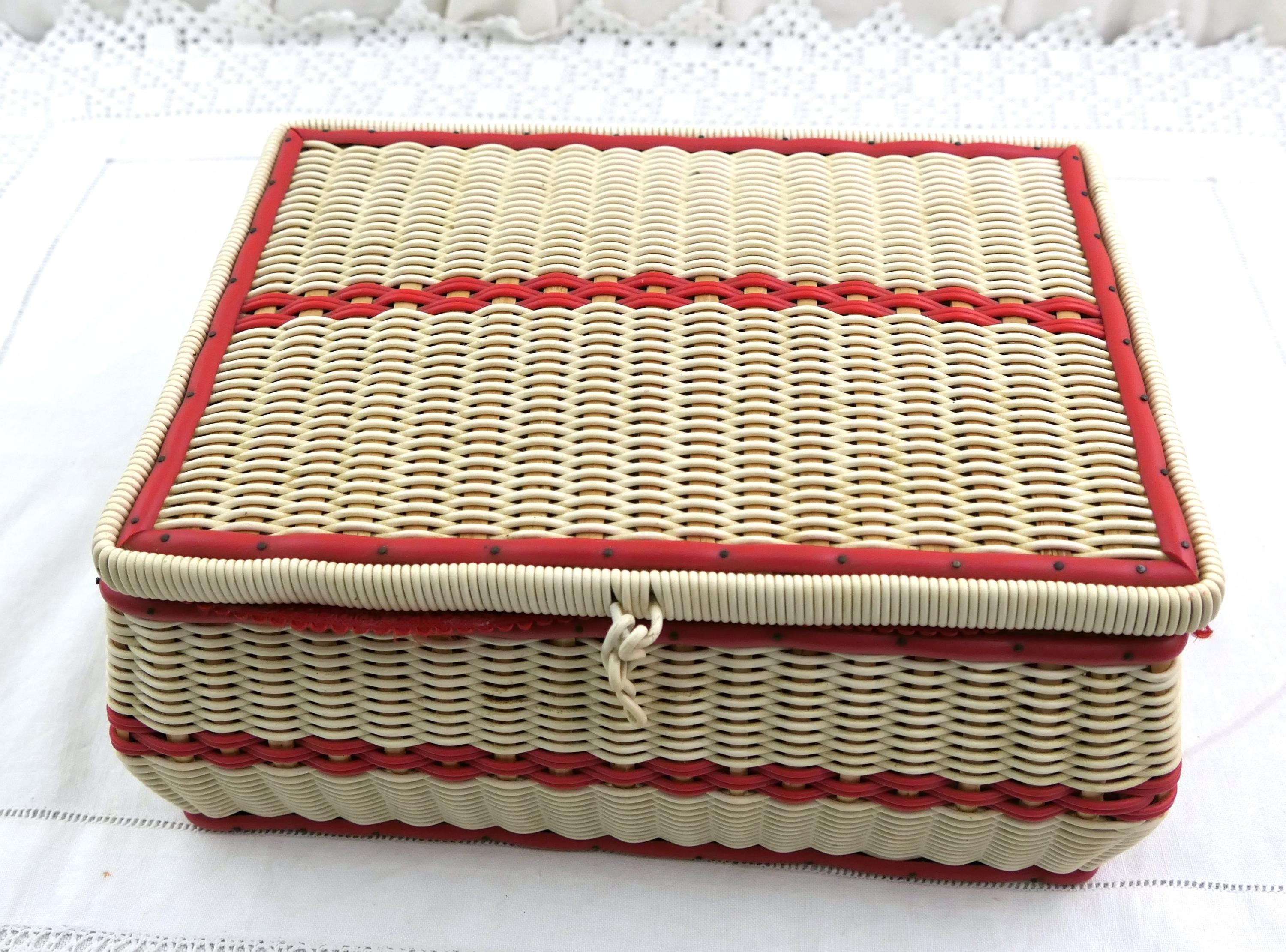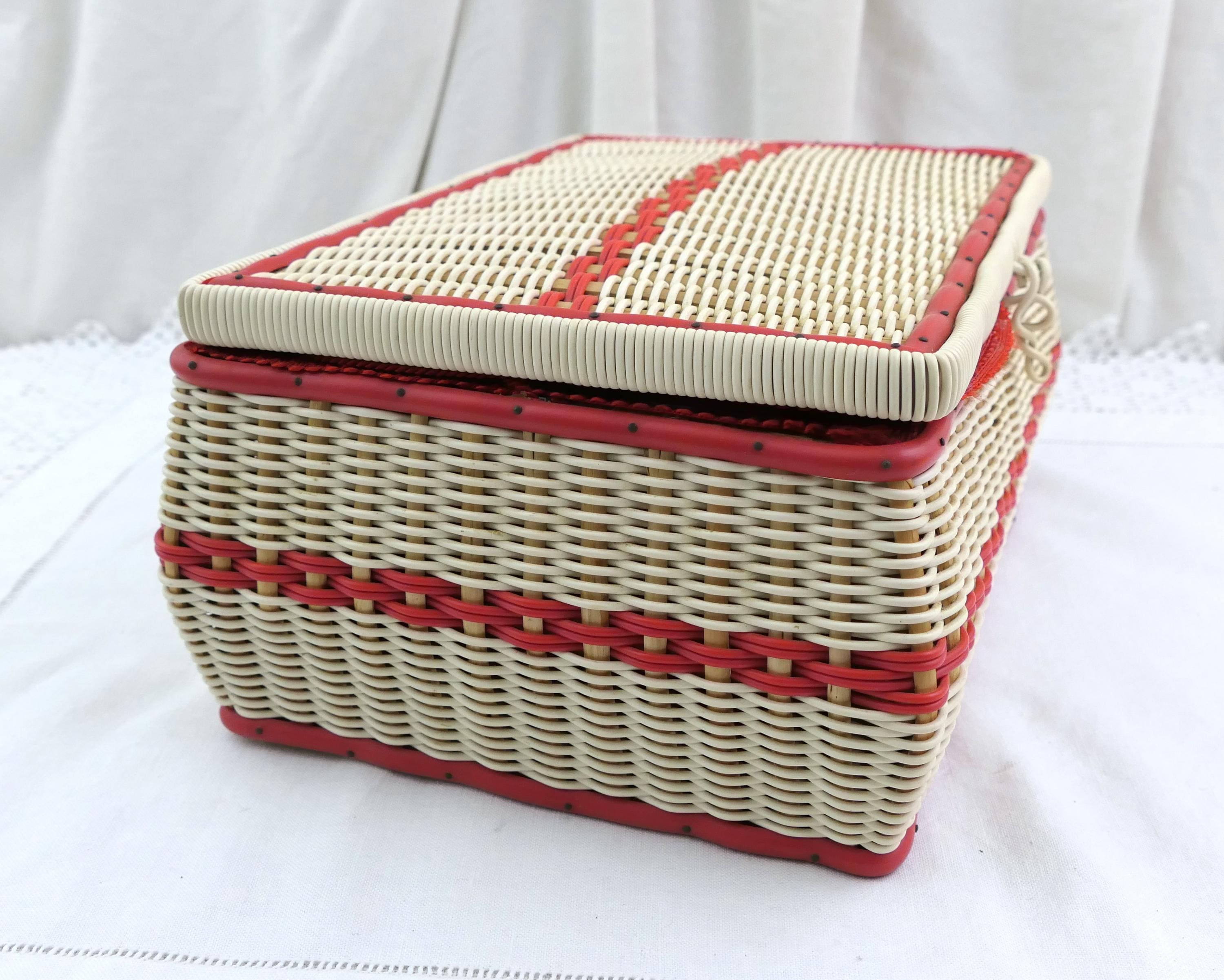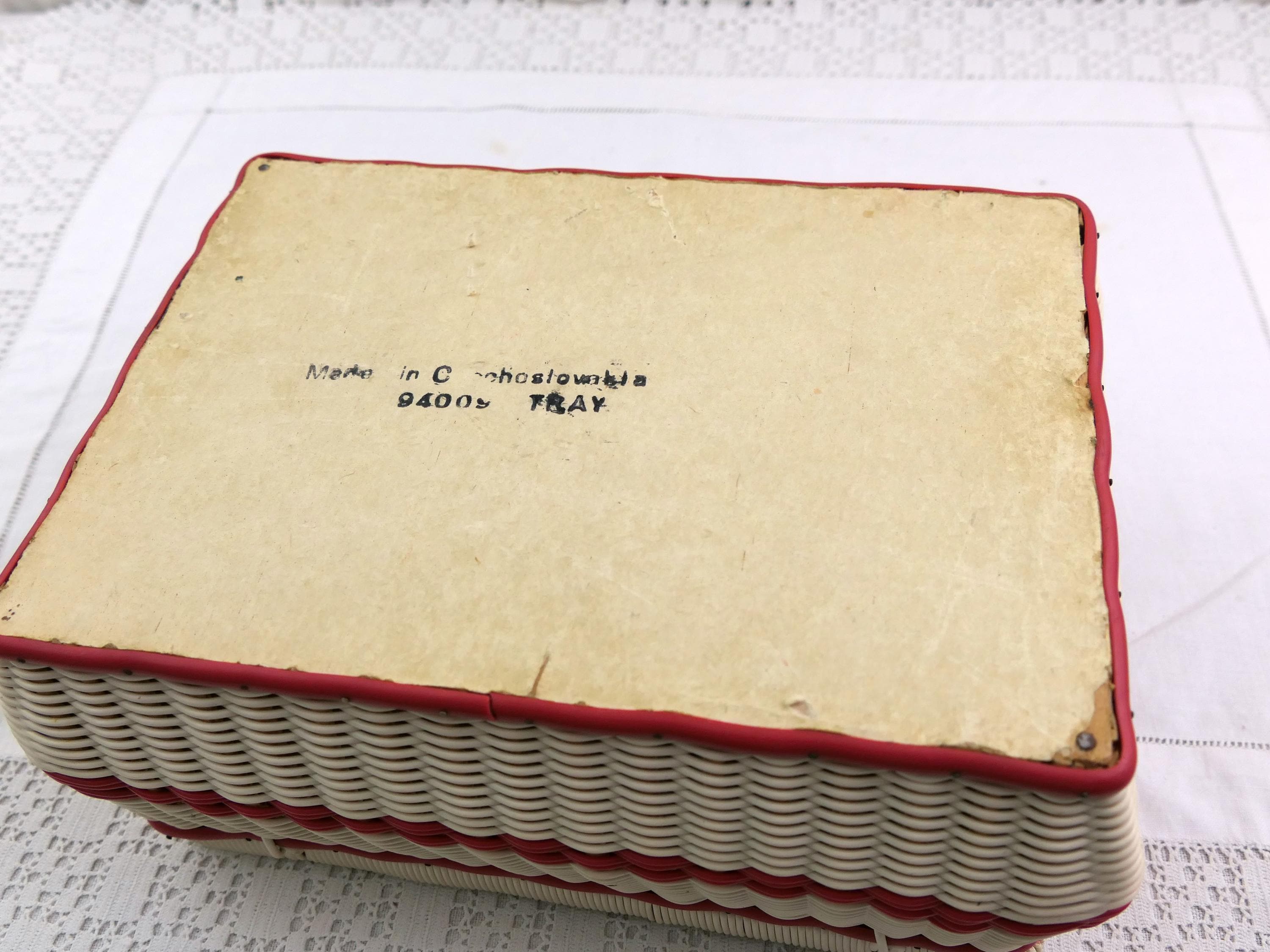 Vintage 1950s sewing box with removable interior compartment. Made in Czechoslovakia of wood covered in woven colored vinyl yarn. Ca mid 1900s.