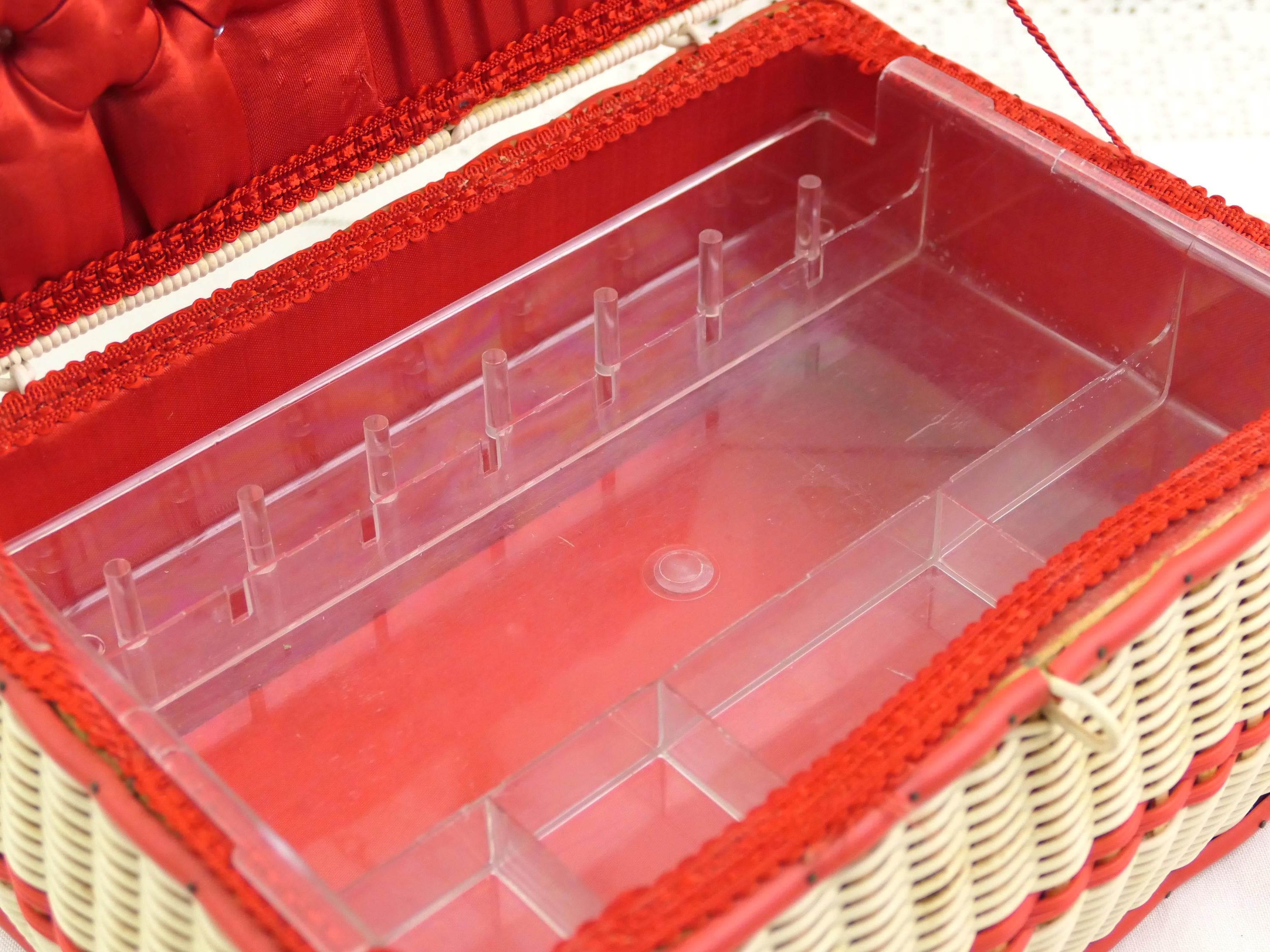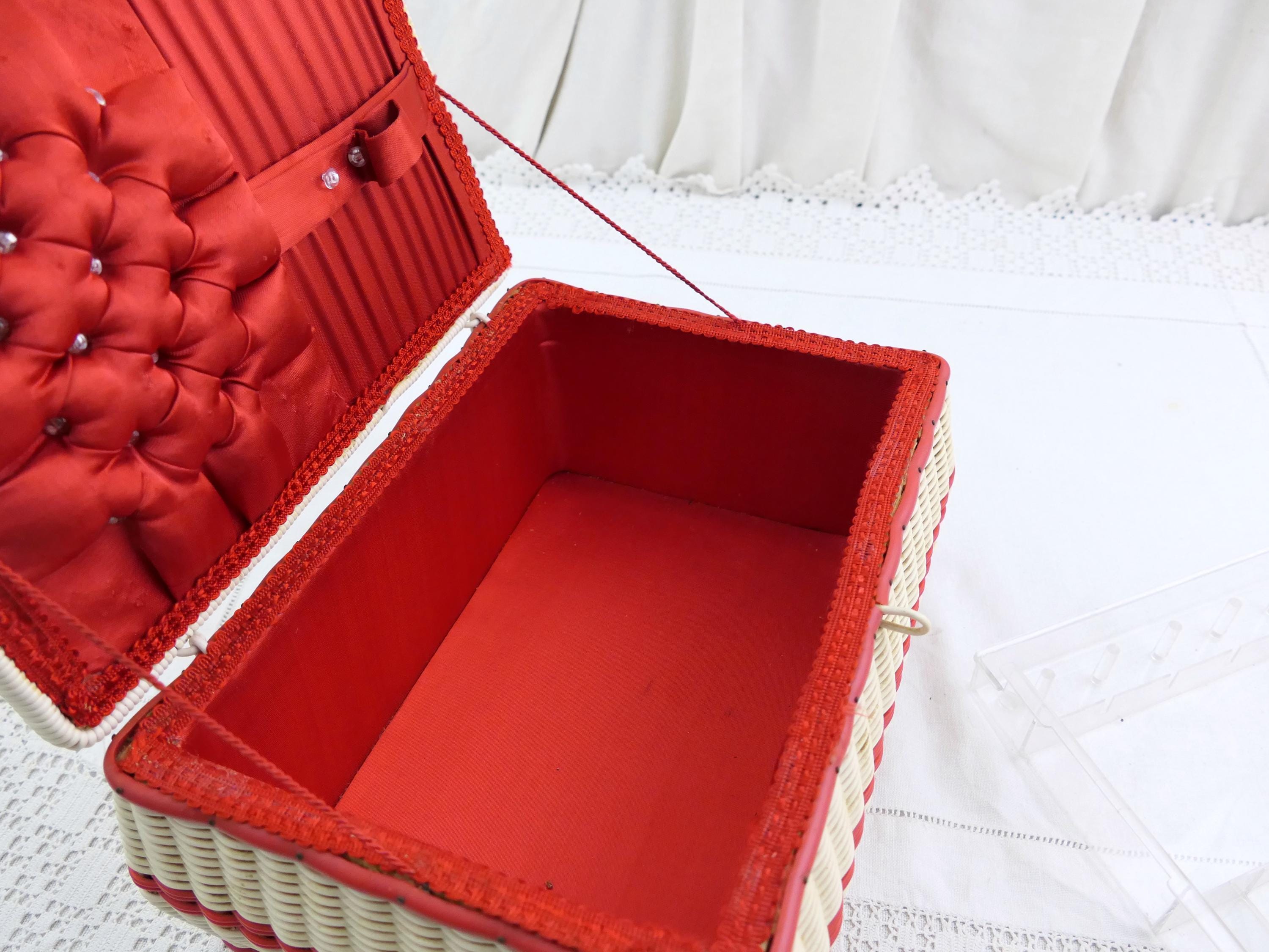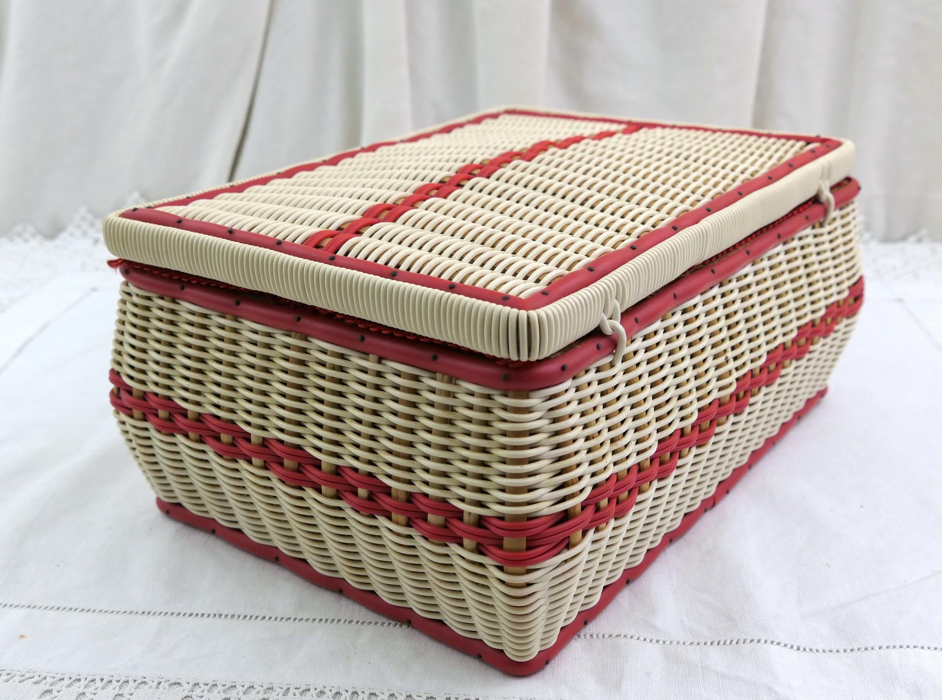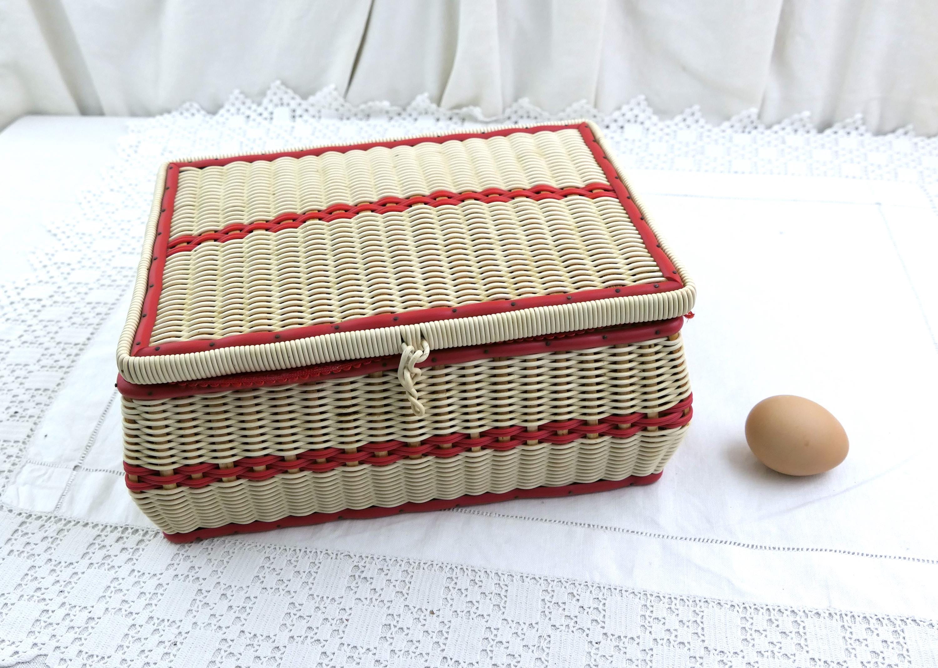 Vintage 1950s sewing box with removable interior compartment. Made in Czechoslovakia of wood covered in woven colored vinyl yarn. Ca mid 1900s.