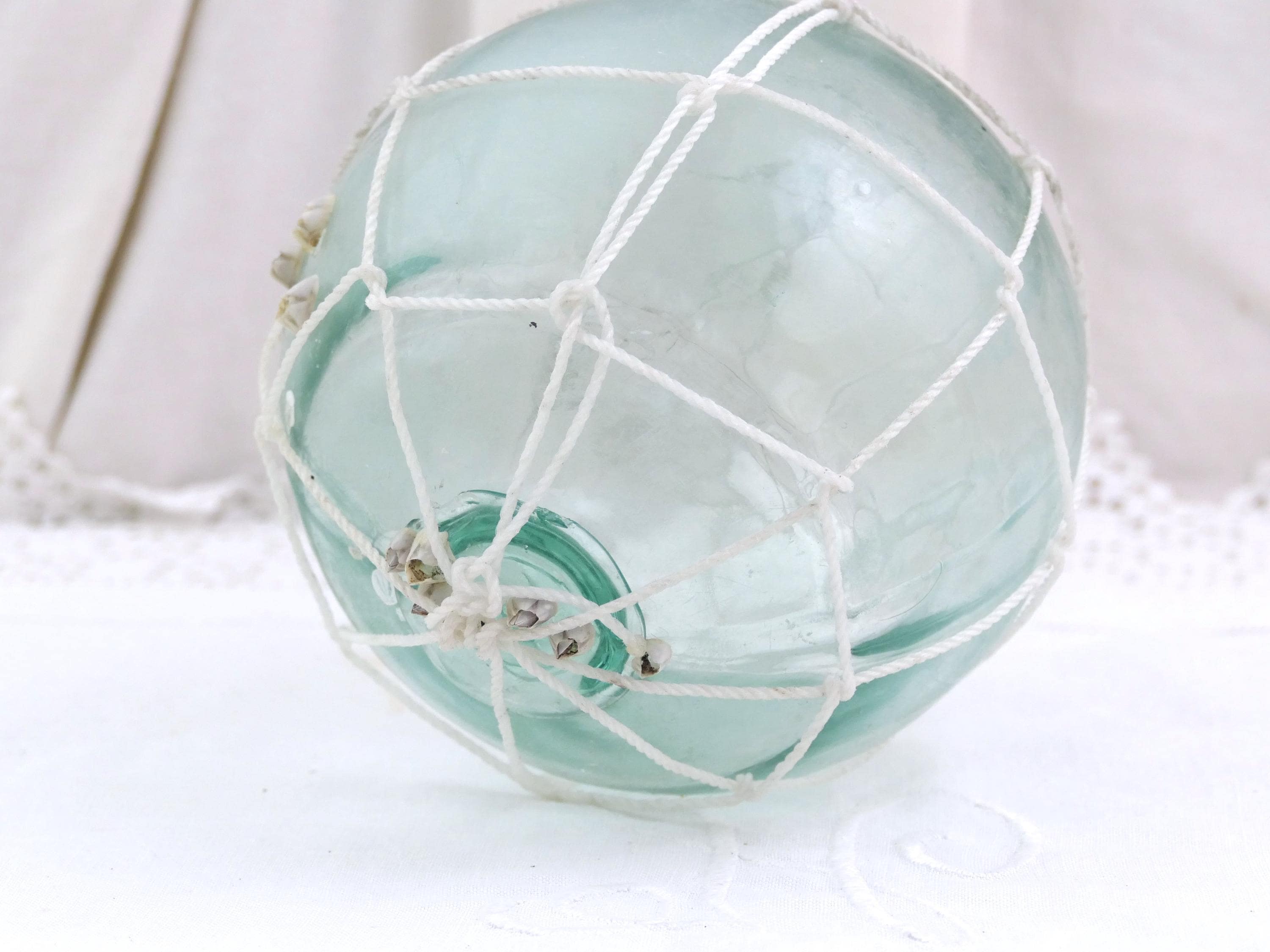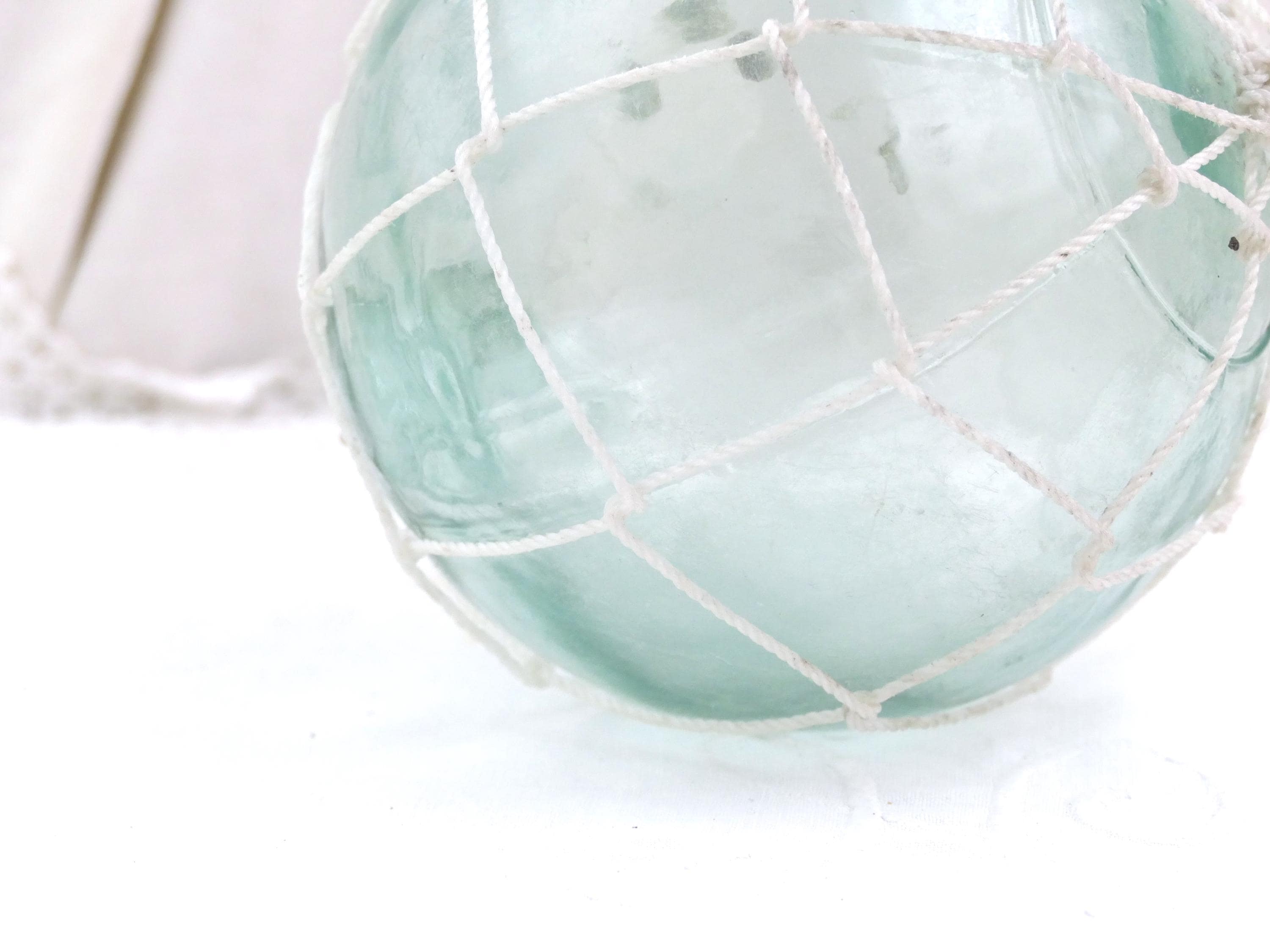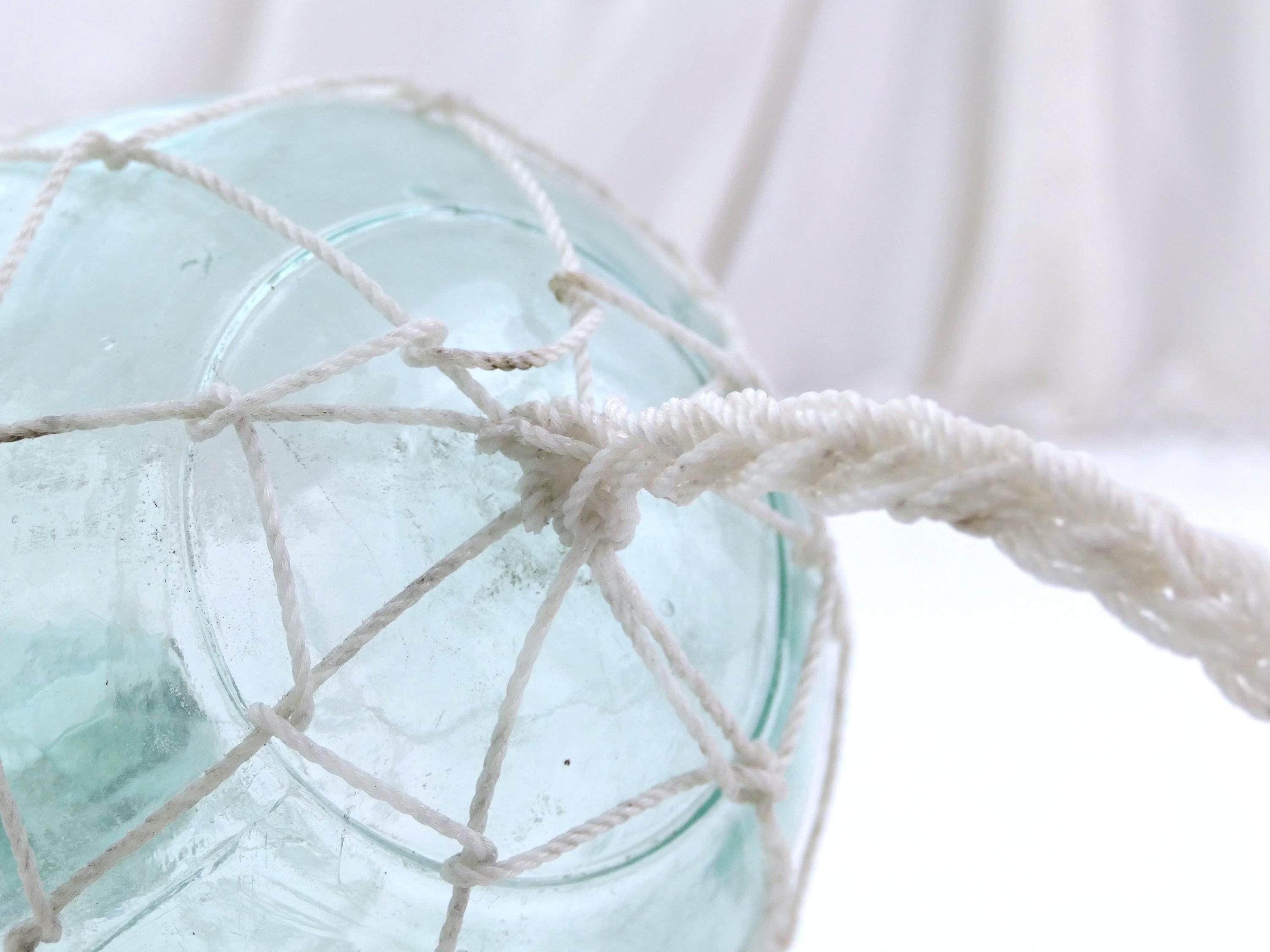 Vintage fishing net float. Made of green glass with knotted cord surround. Ca 1940s.