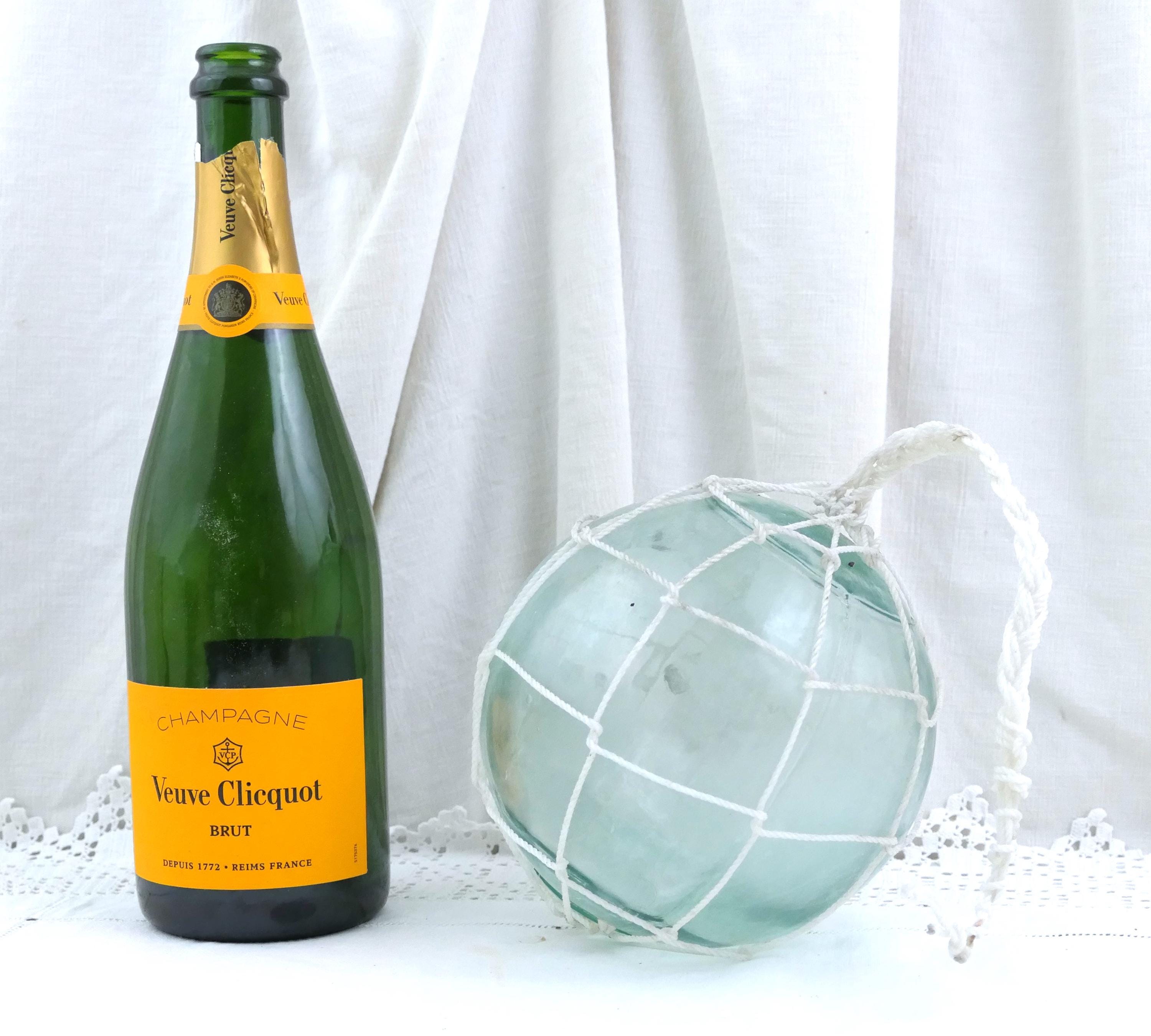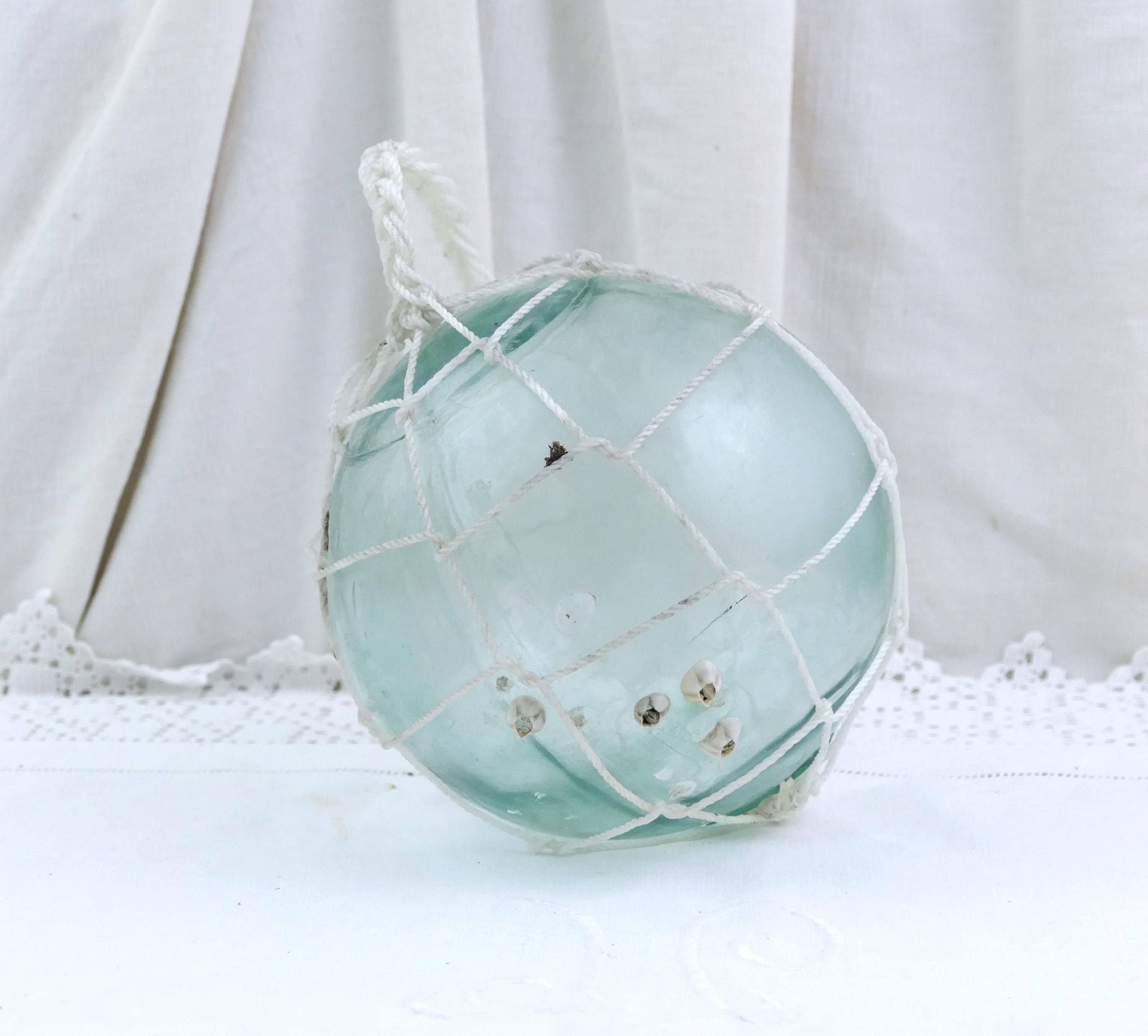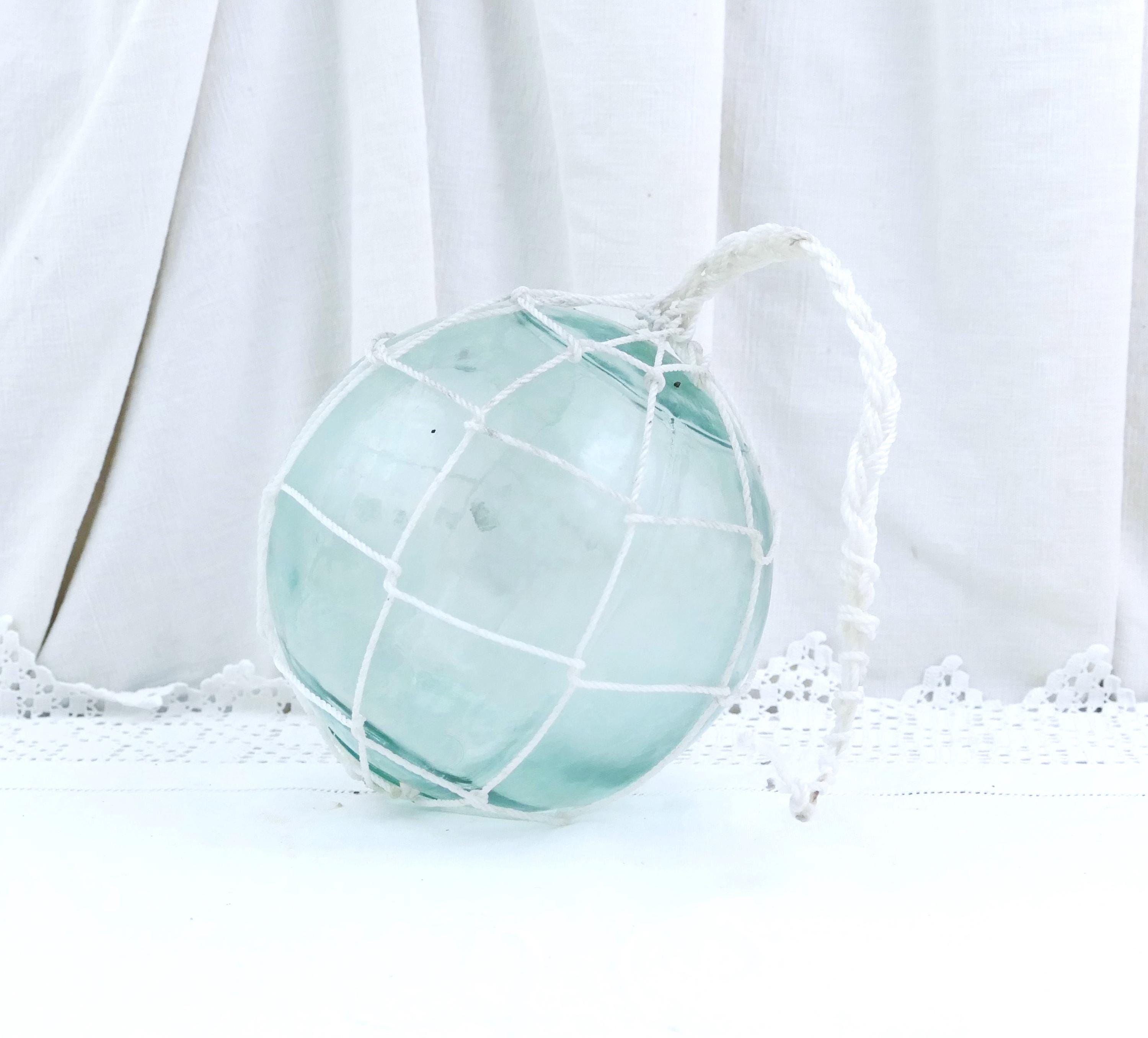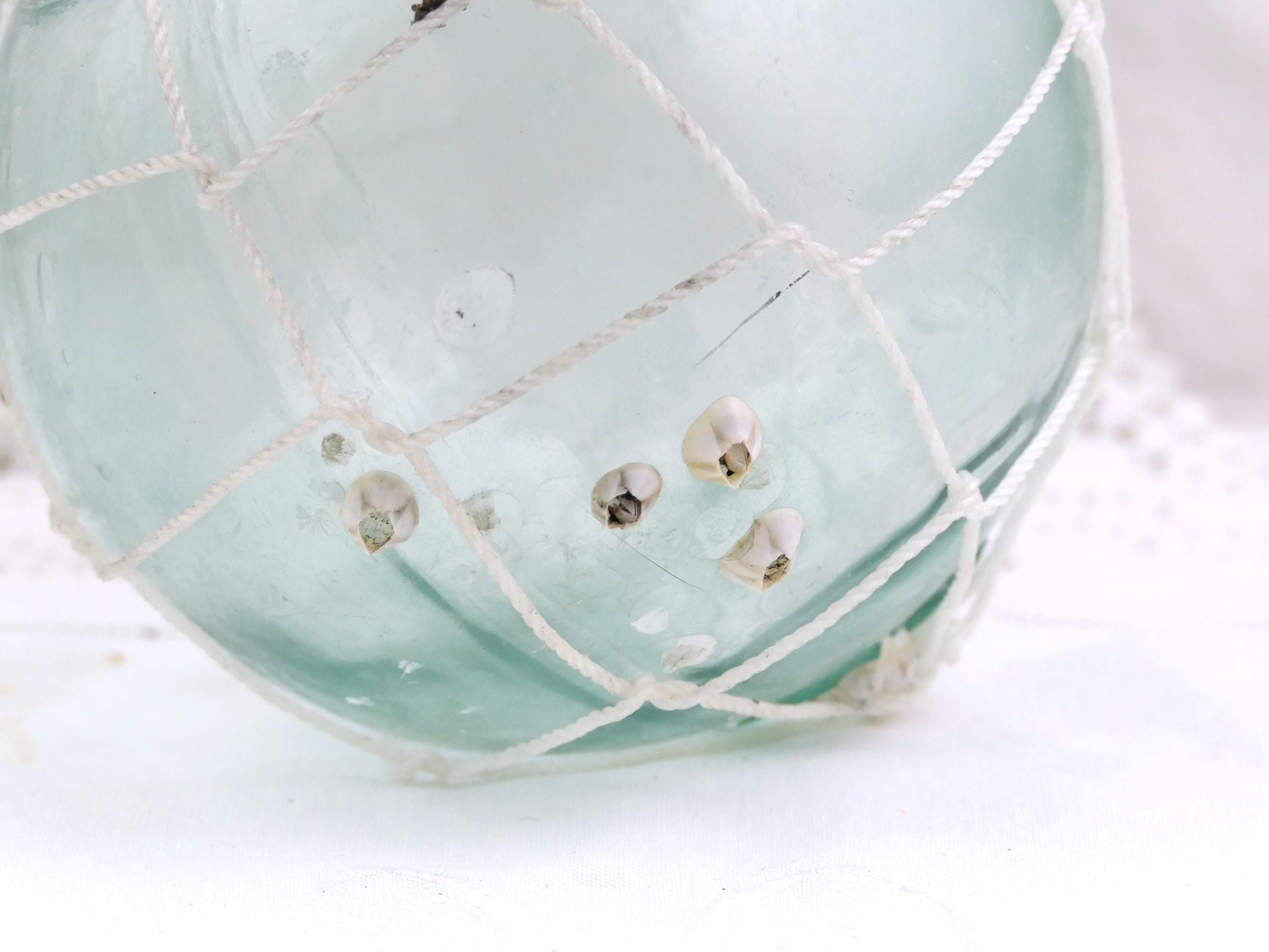 Vintage fishing net float. Made of green glass with knotted cord surround. Ca 1940s.