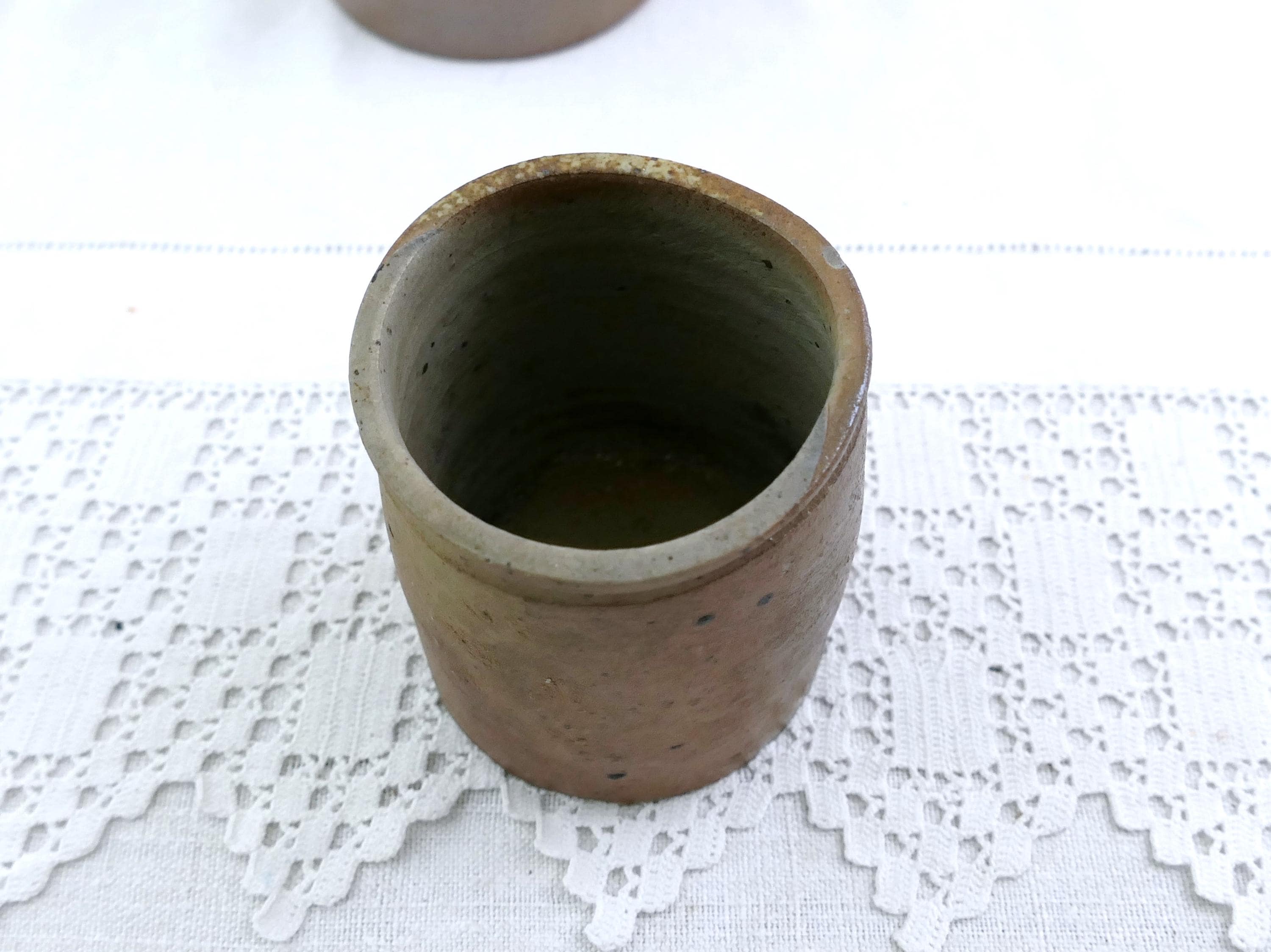 2 Antique French brown pottery rillette jars from western France. Made of salt glazed pottery. Ca late 1800s - early 1900s.