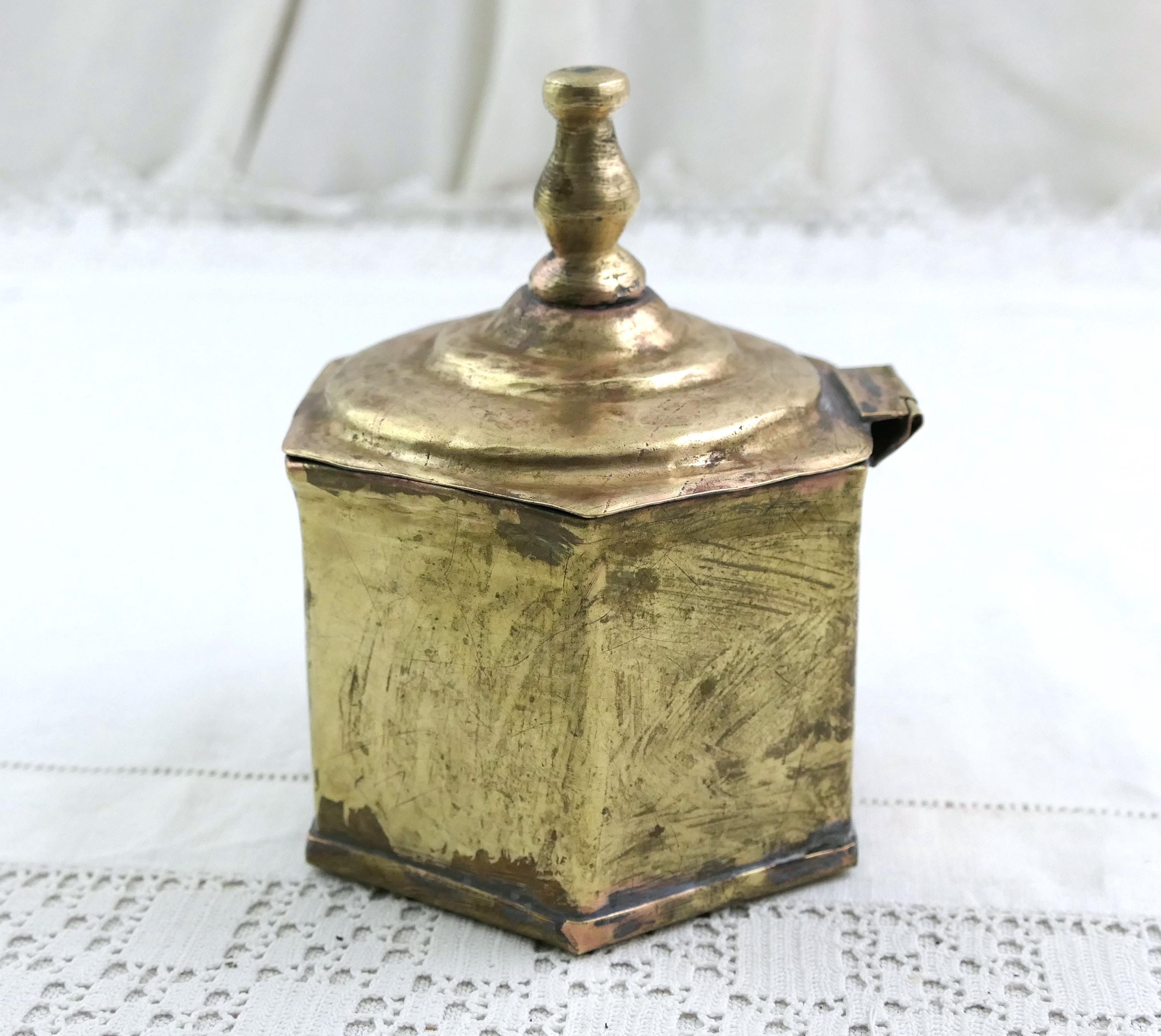 Antique French hexagonal handmade metal box. Made of brass with a hinged lid and a final. Shinny battered patina from years of use and polish. Traces of white metal polish. Handmade in Normandy, probably in Villedieu les Peole, renown copper and brass metal working town. Circa 1700s. Found at a French flea market in Normandy.