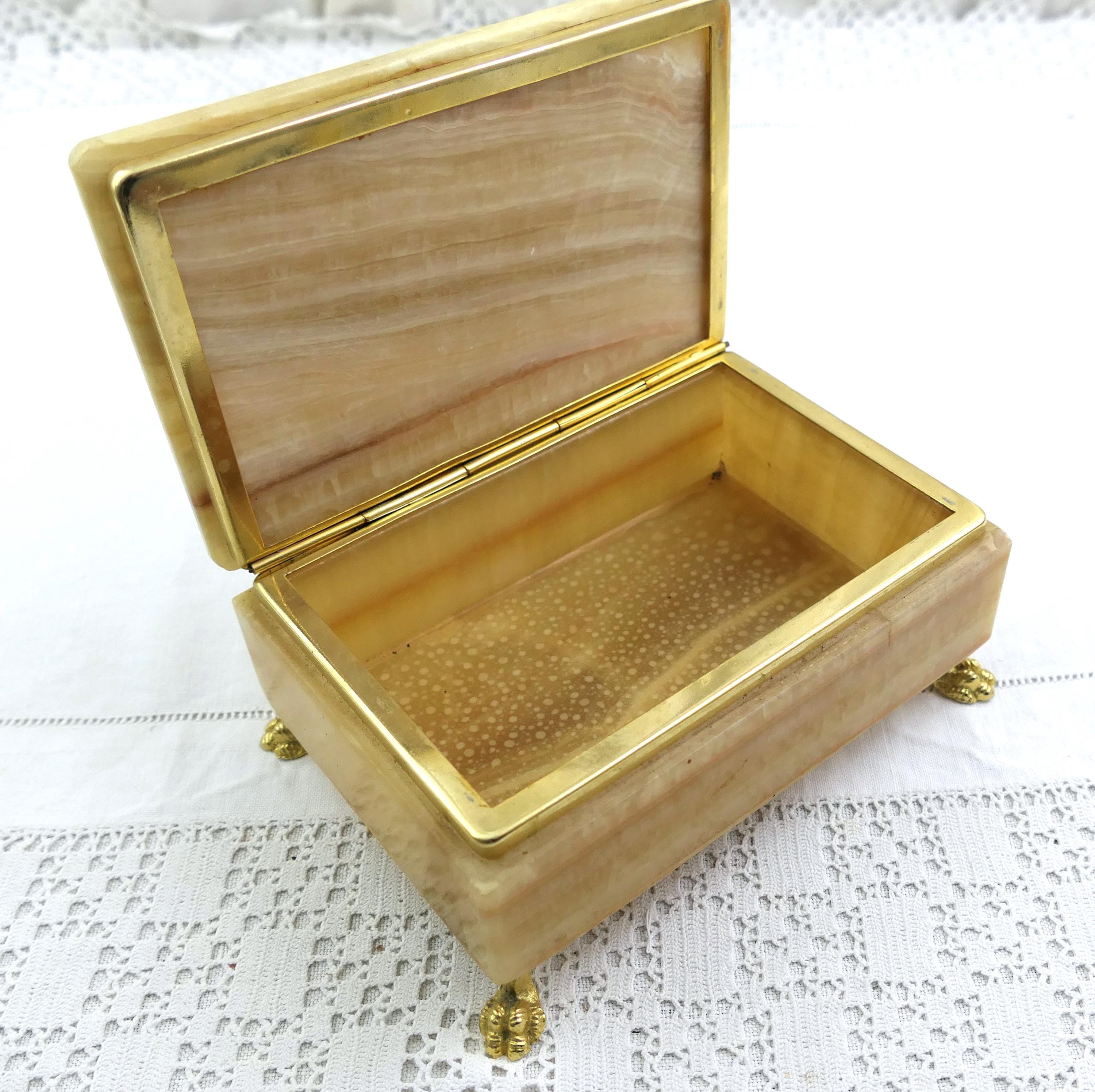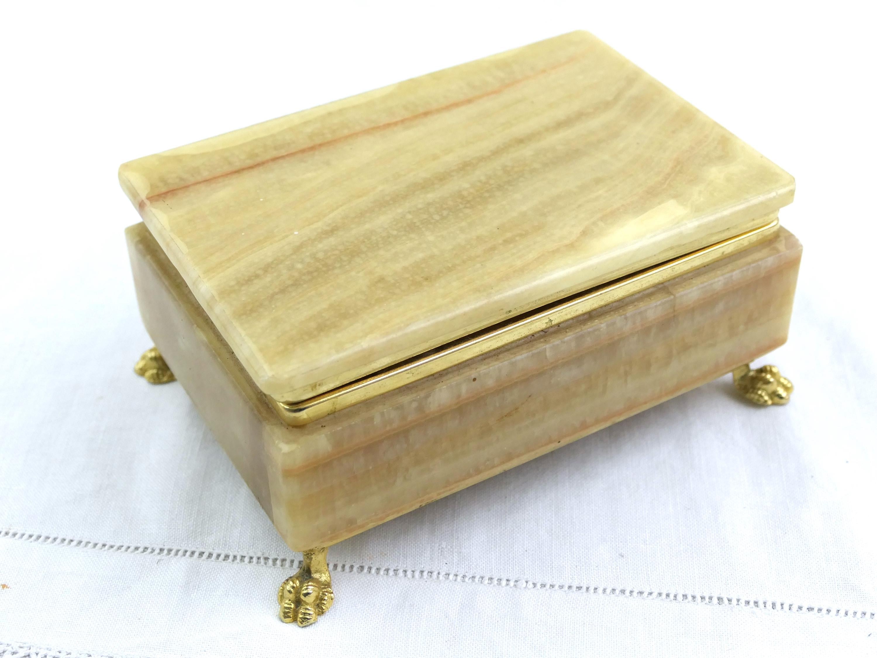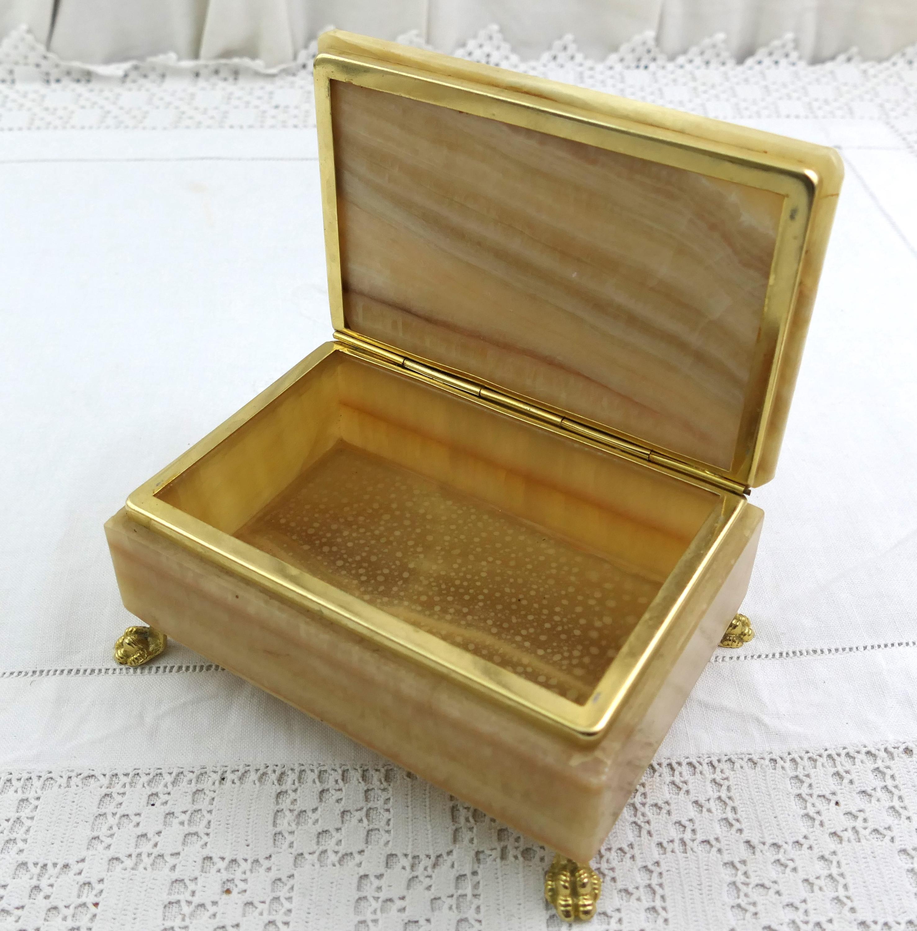 Vintage Italian veined green and brown agate stone trinket box with 4 feet and rounded lid. Made in Italy. Ca 1970s.